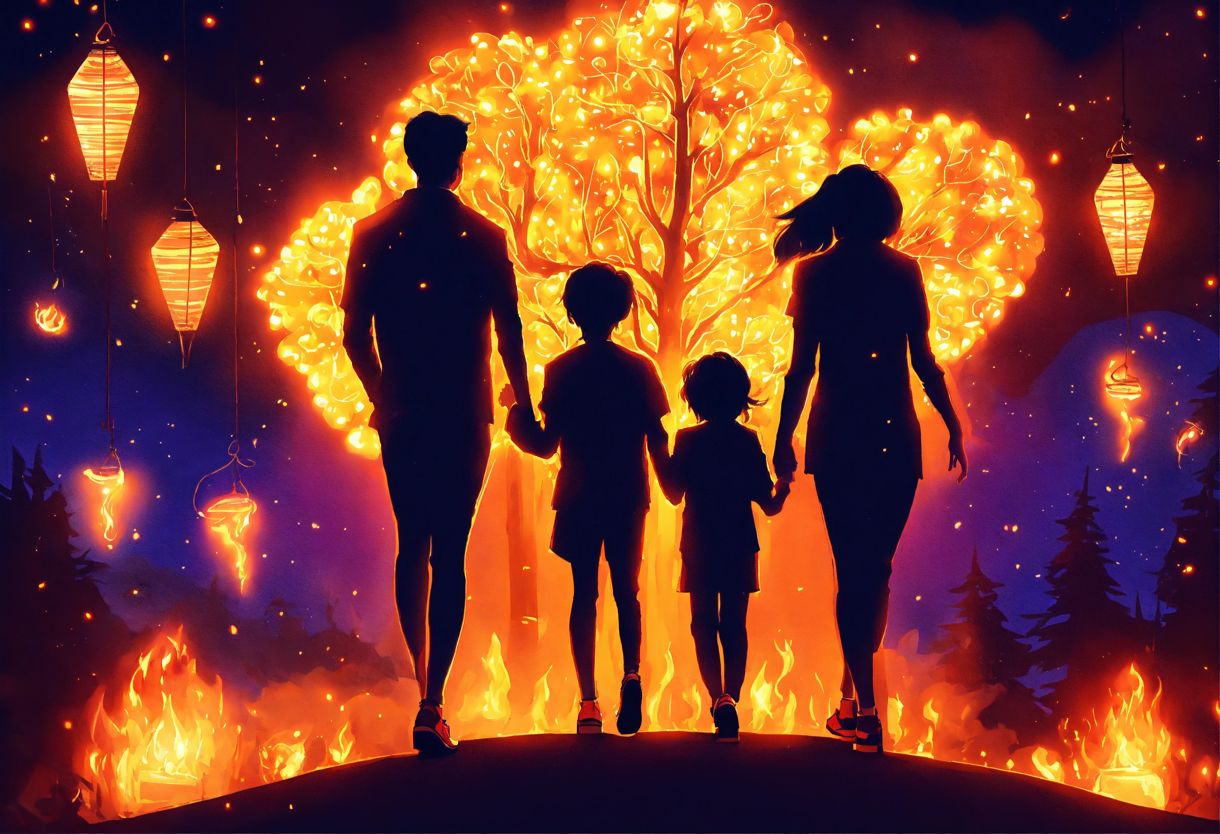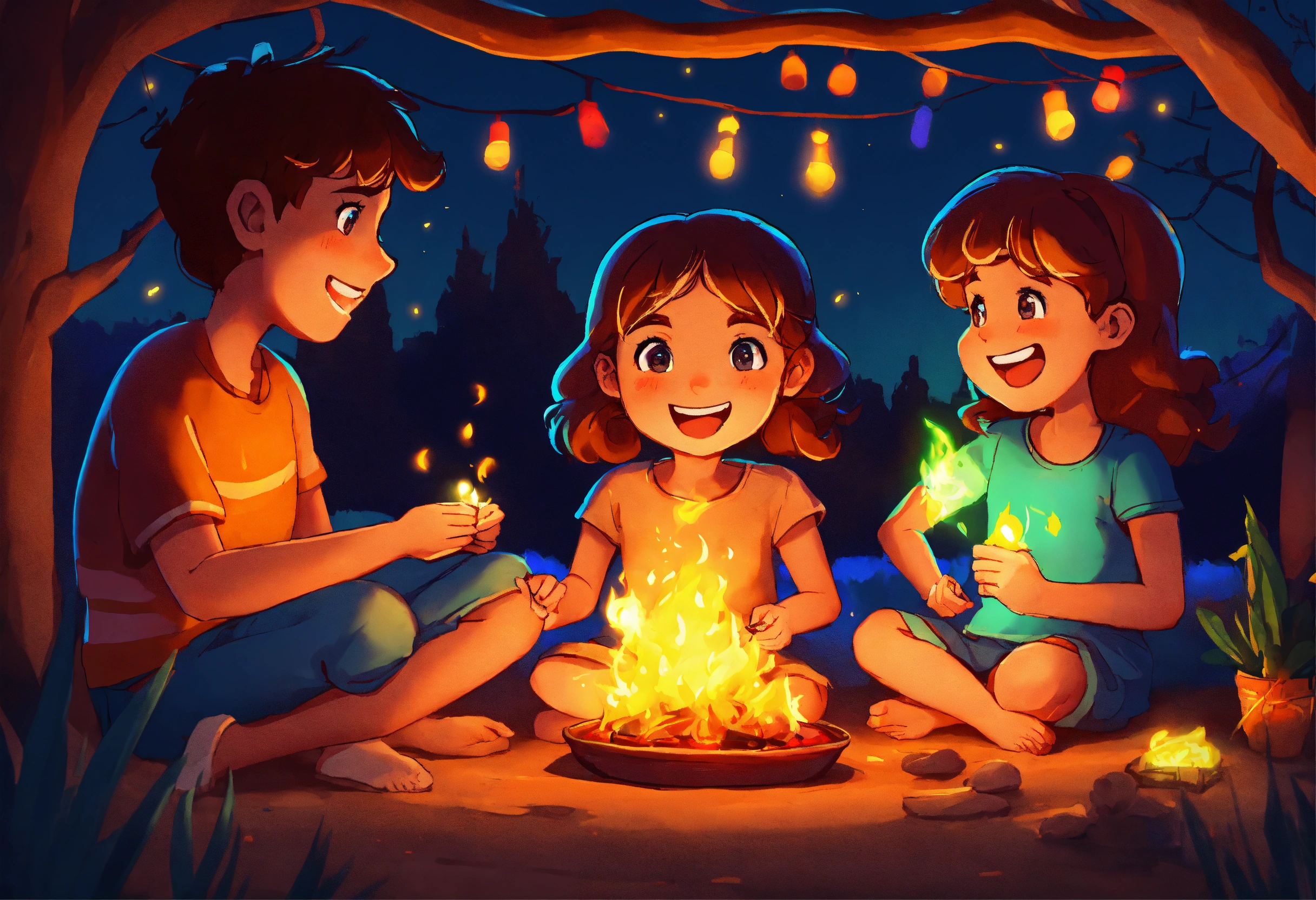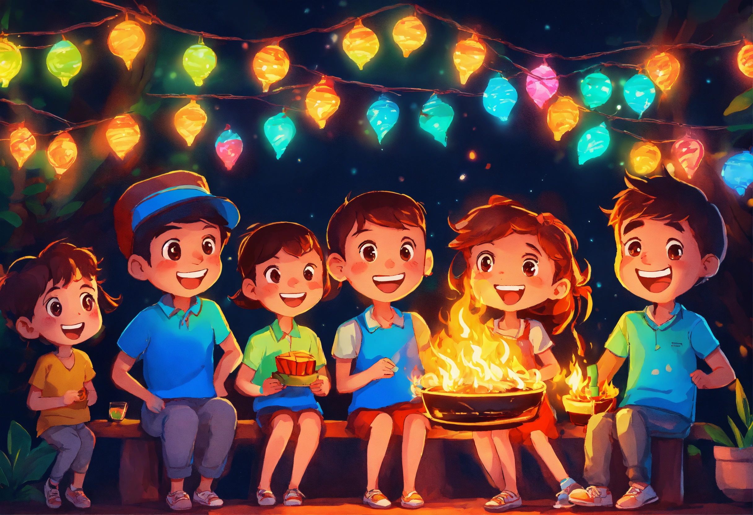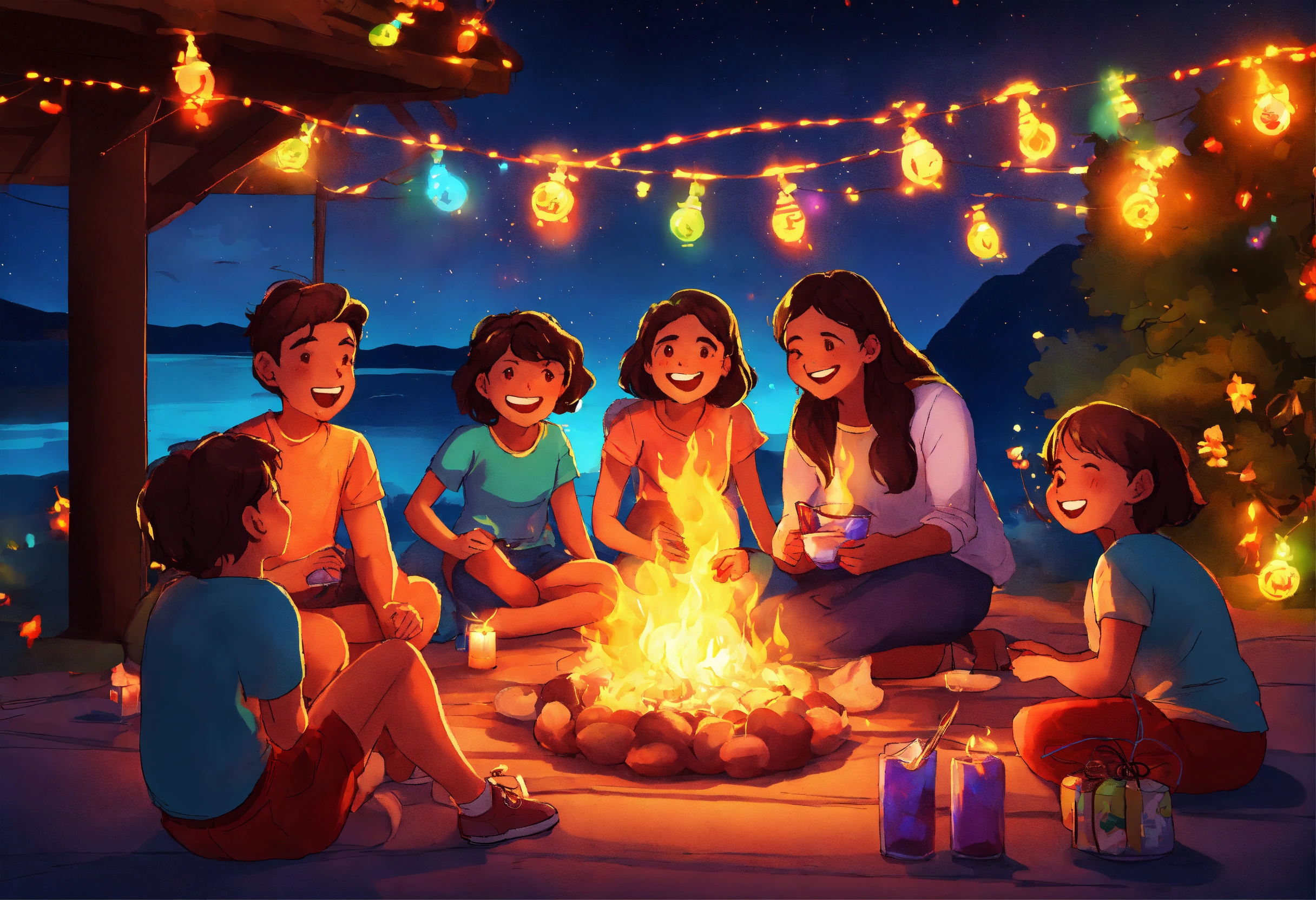 Familia feliz en noche de fiesta con fuego de luces, fogata, luces neón, dibujo animado juvenil. imágenes nítidas, rostros precisos.