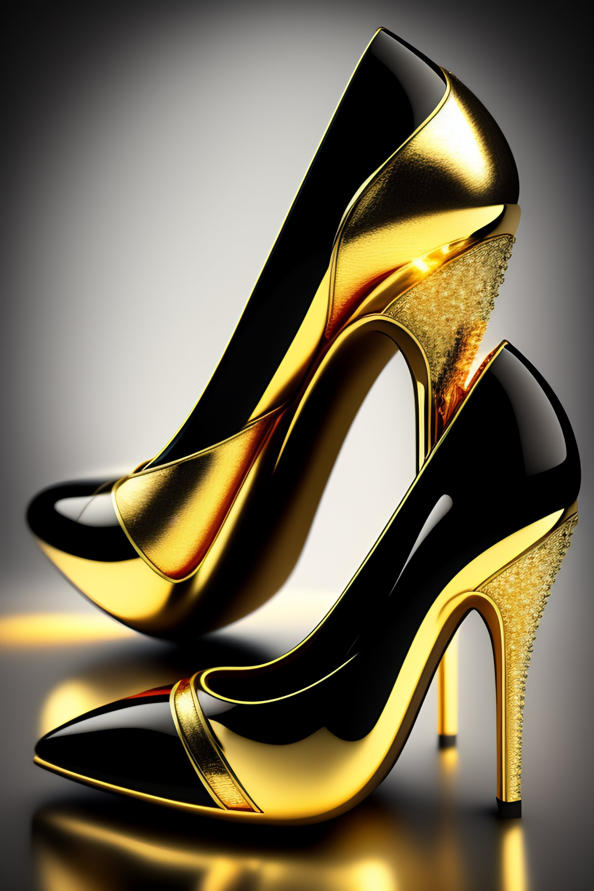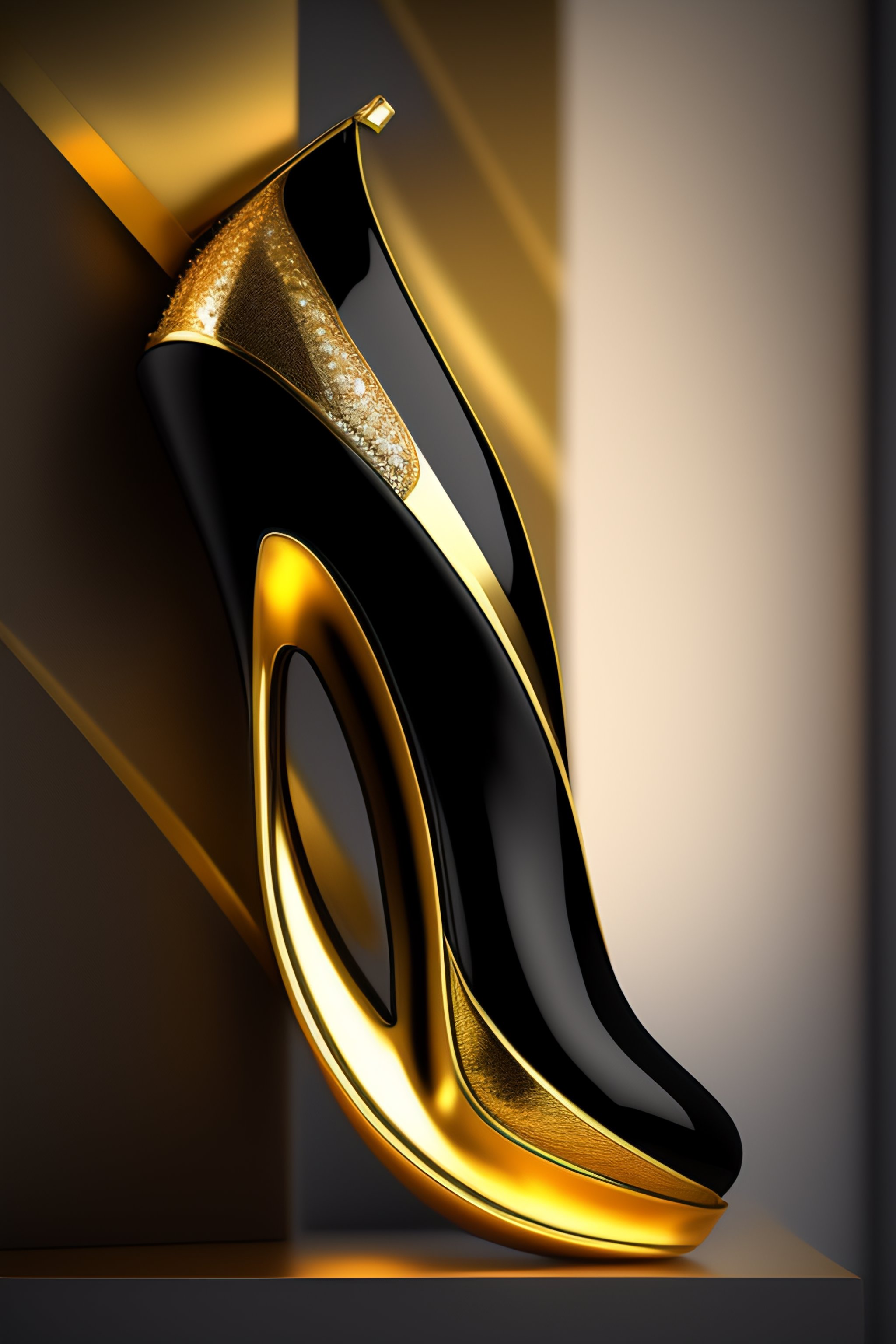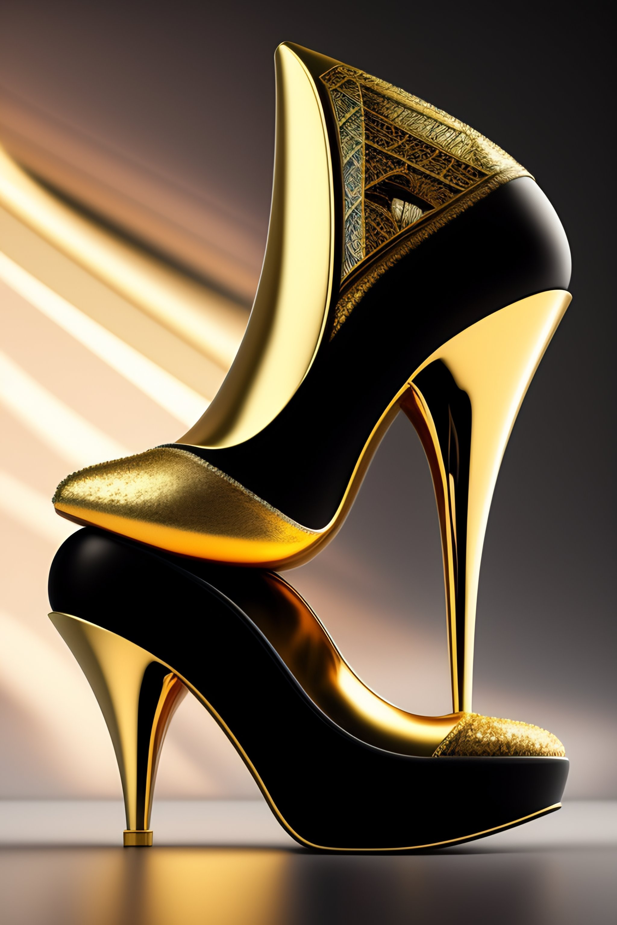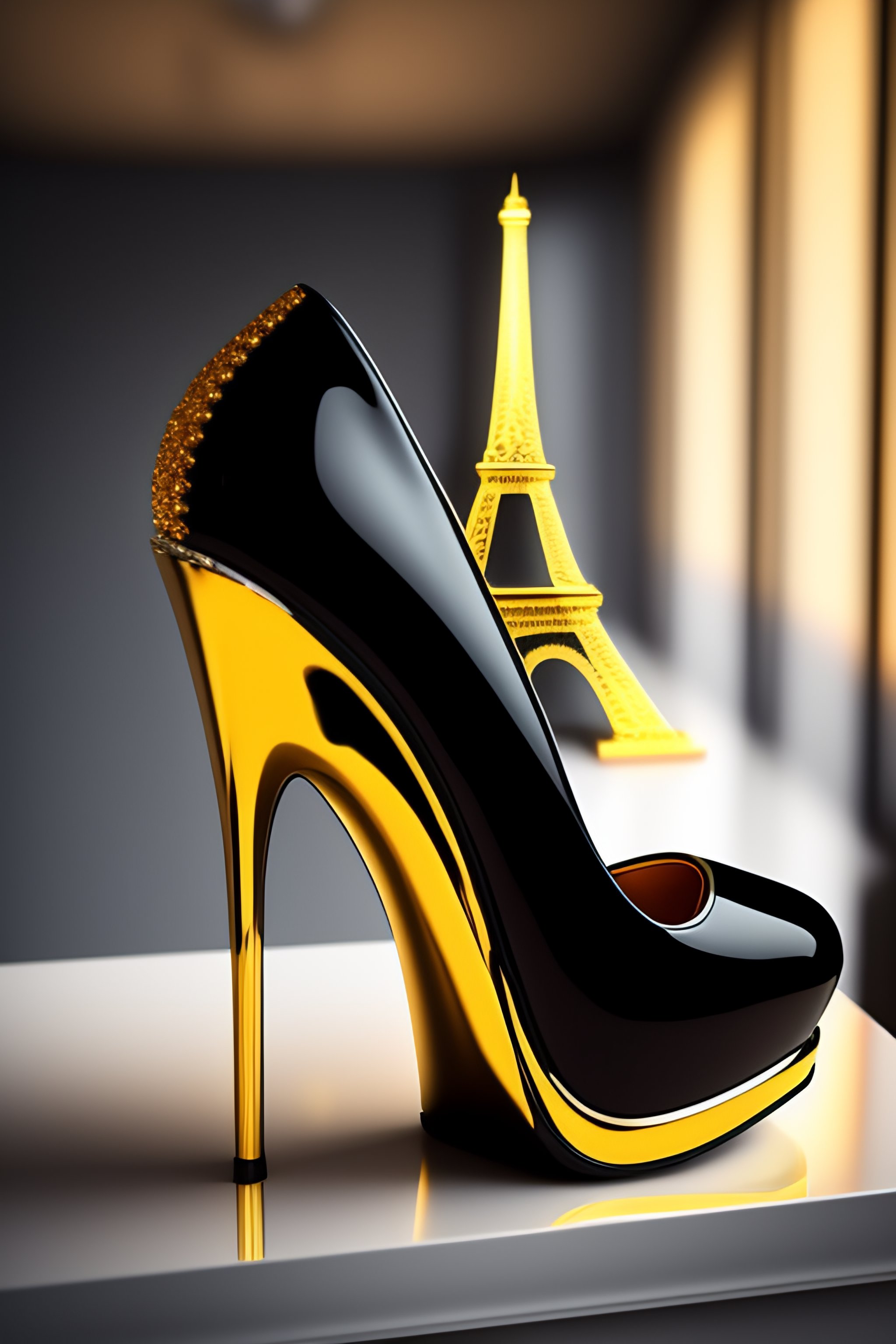 High heels inspiration eiffel tower, futuristic, two color black and gold soles, curved, with diamond logo on top, realistic, showcased on a shelf, high detail, photorealistic, shining