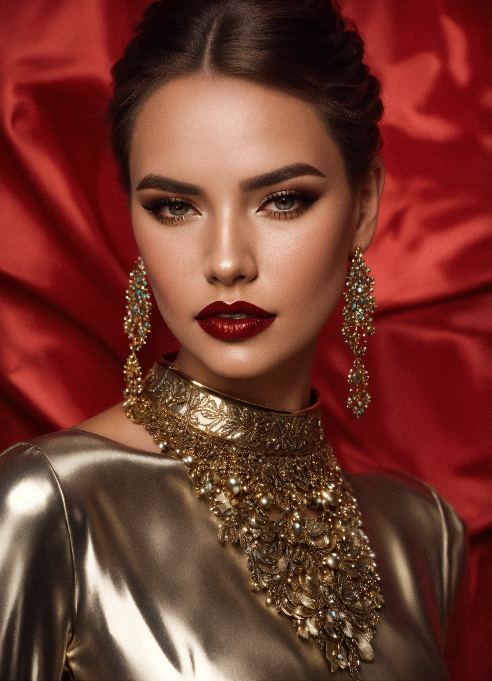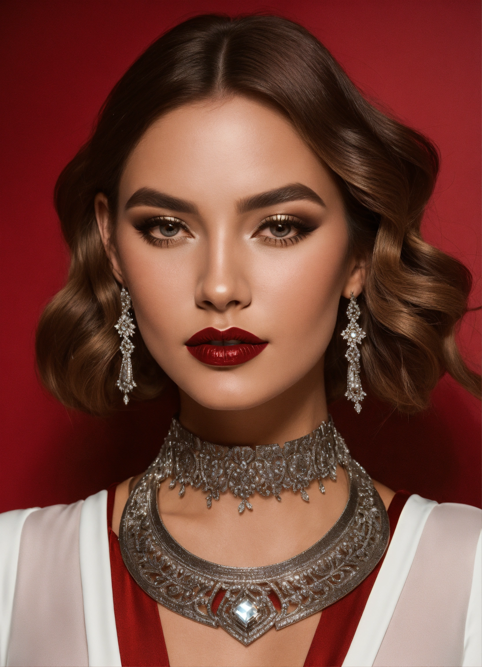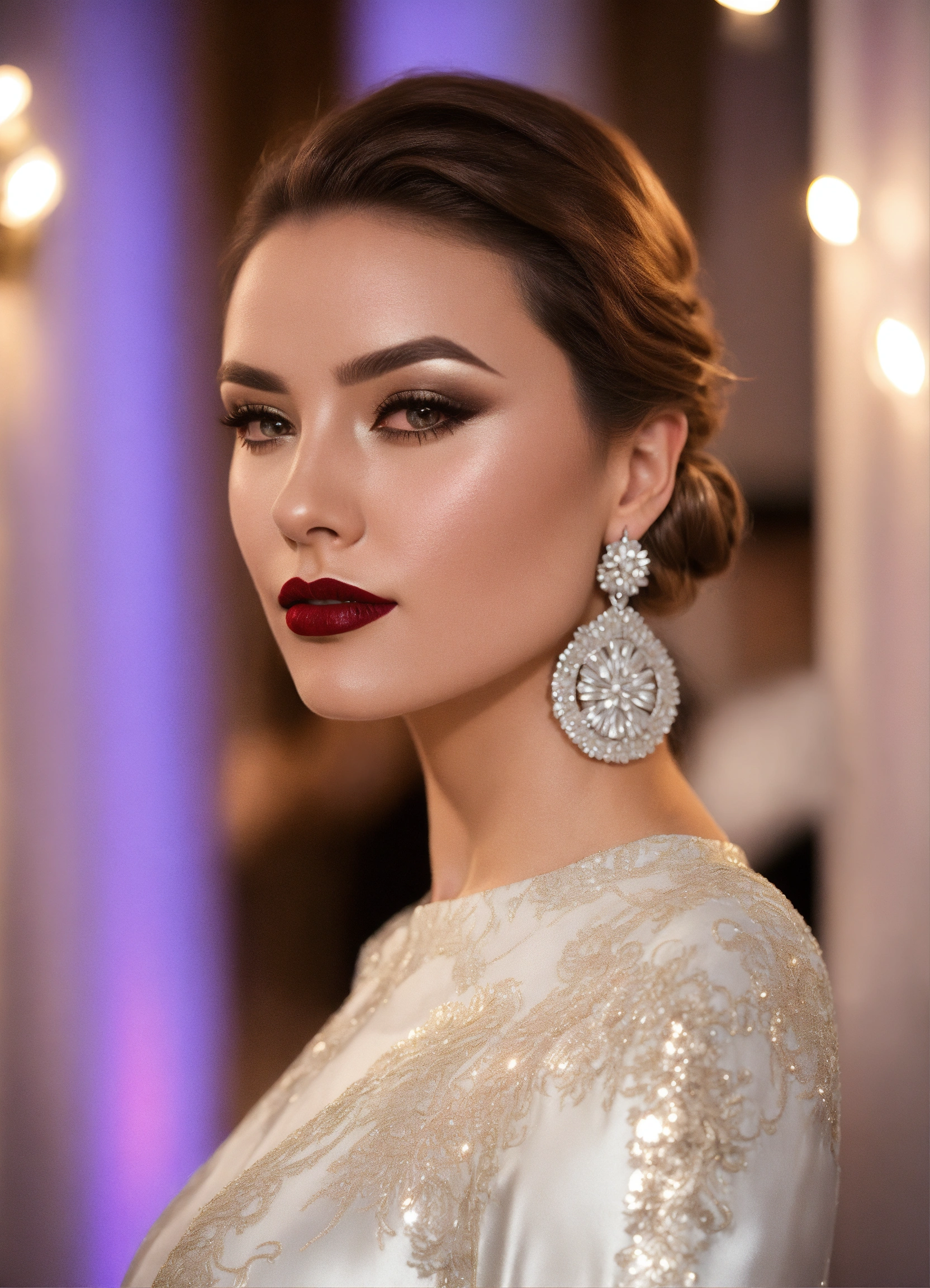 A tall woman with light brown wavy hair styled in a sleek low bun. she wears a white, fitted, floor-length gala dress with a narrow skirt, and metallic silver accents and an ornate metallic collar around her neck. her arms are adorned with a single metallic cuff. she is in high, metallic silver stilettos, and her makeup is bold, featuring smoky eyes and deep red lipstick.
