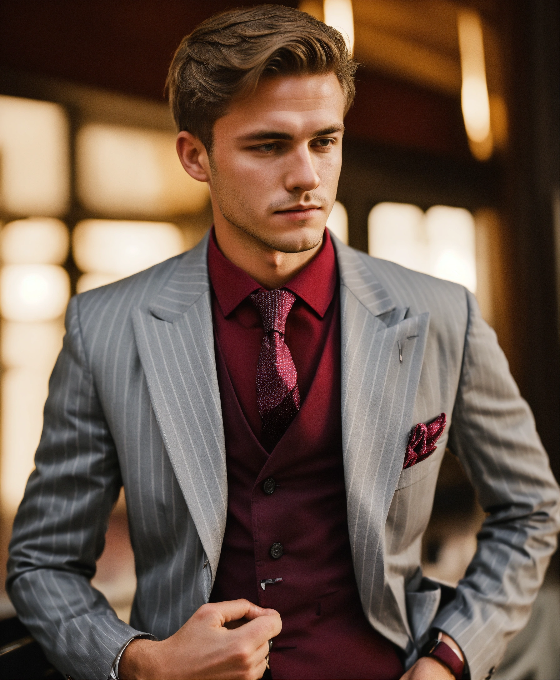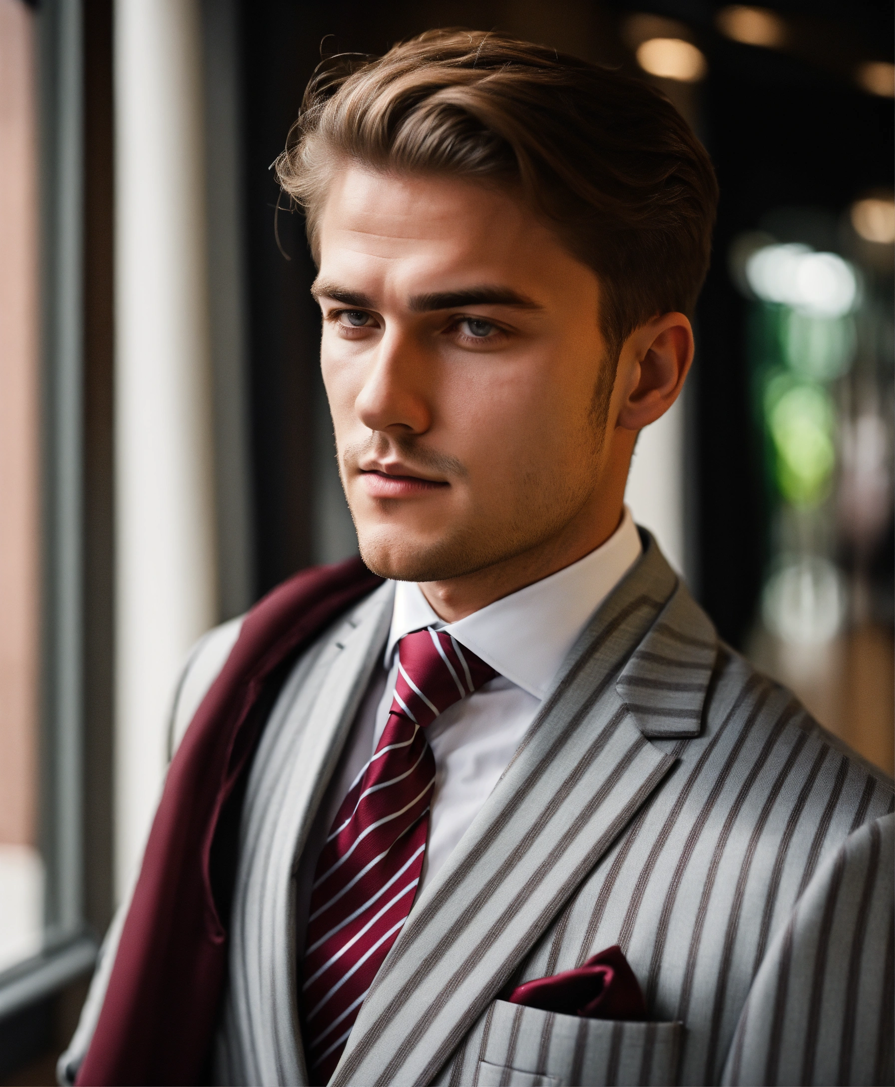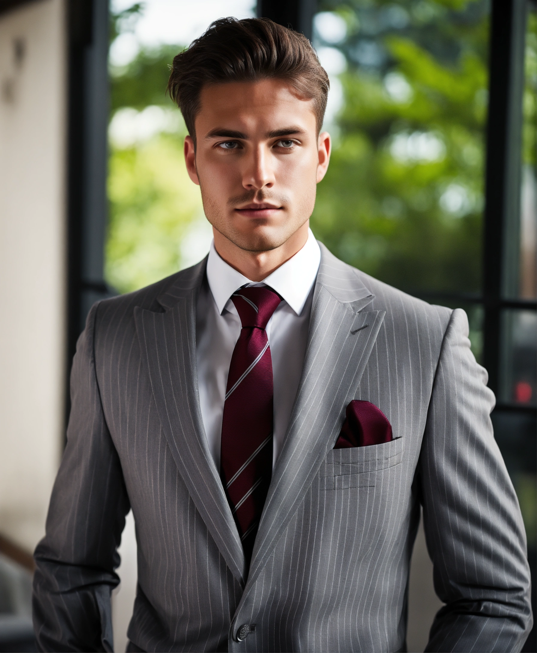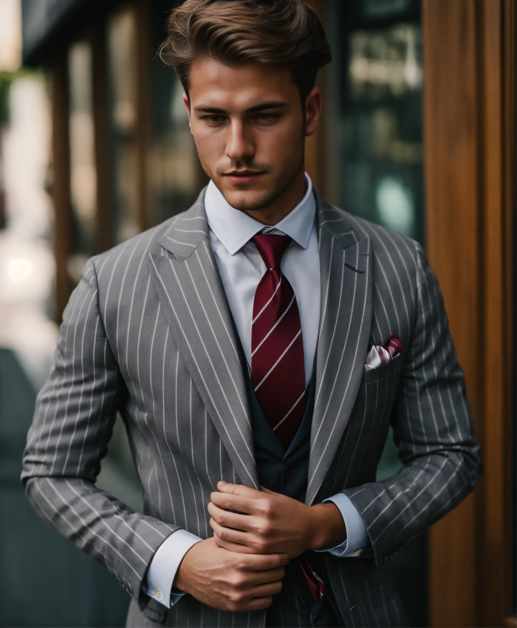 A young german businessman in light grey pinstripe suit, burgundy striped tie, unbuttoning his jackett