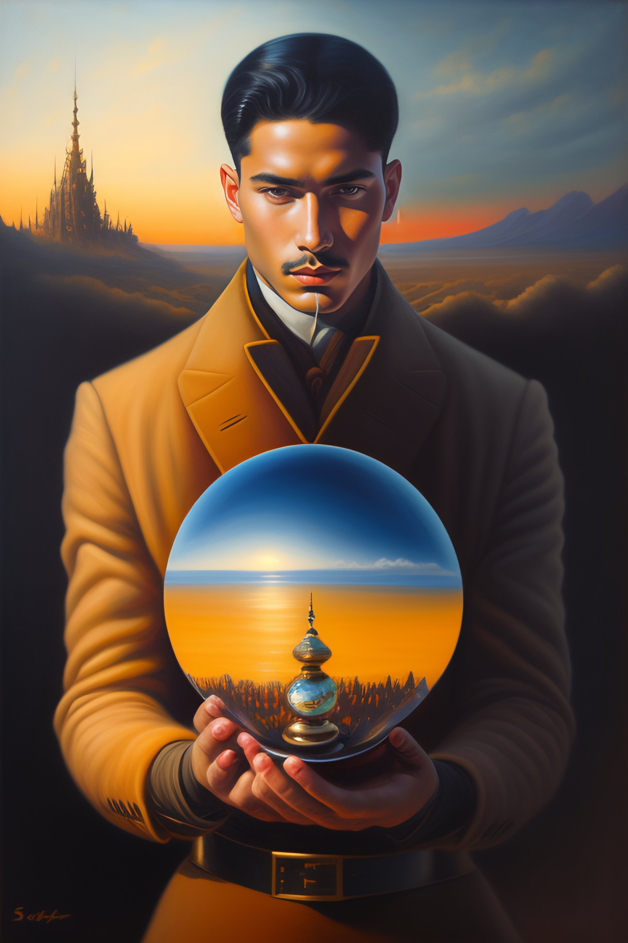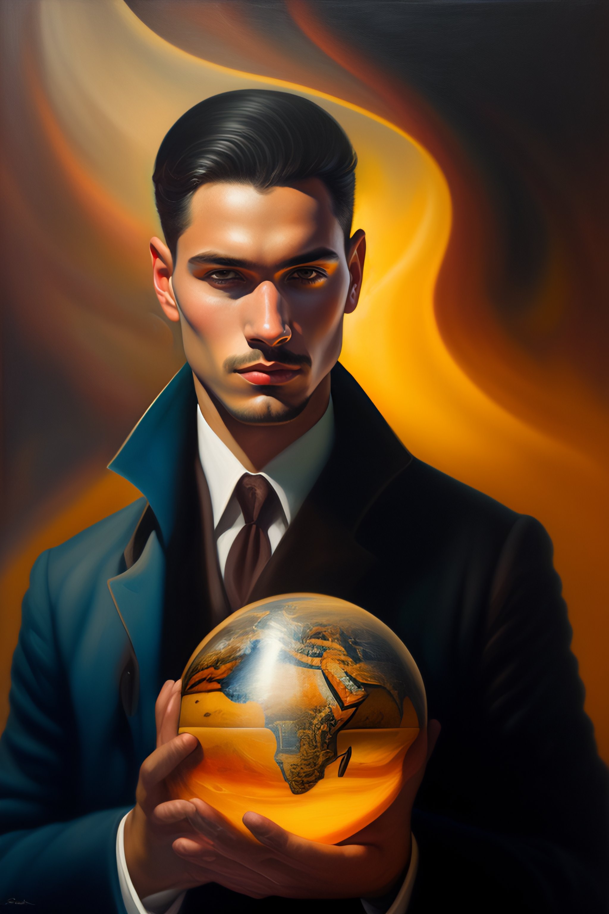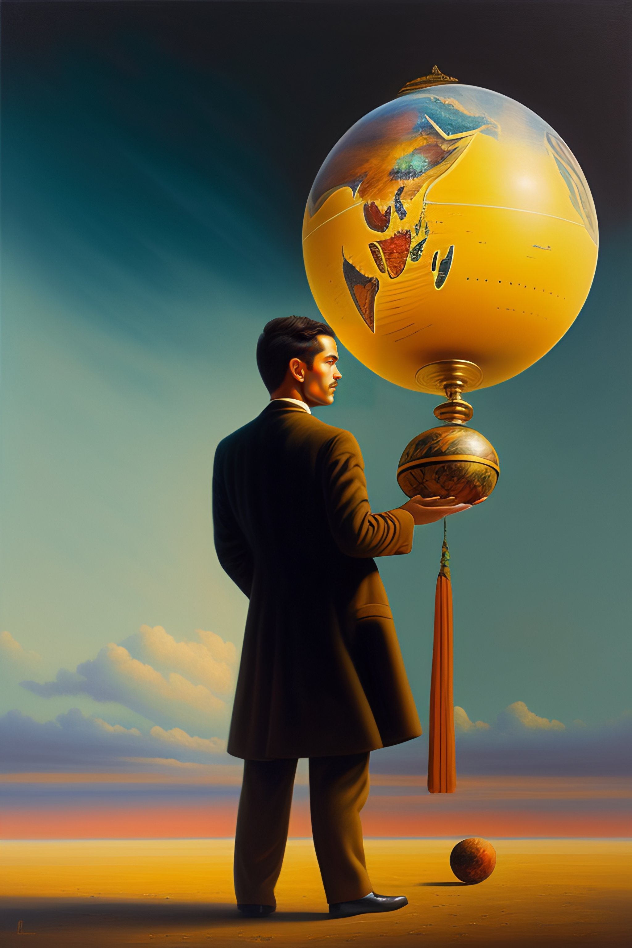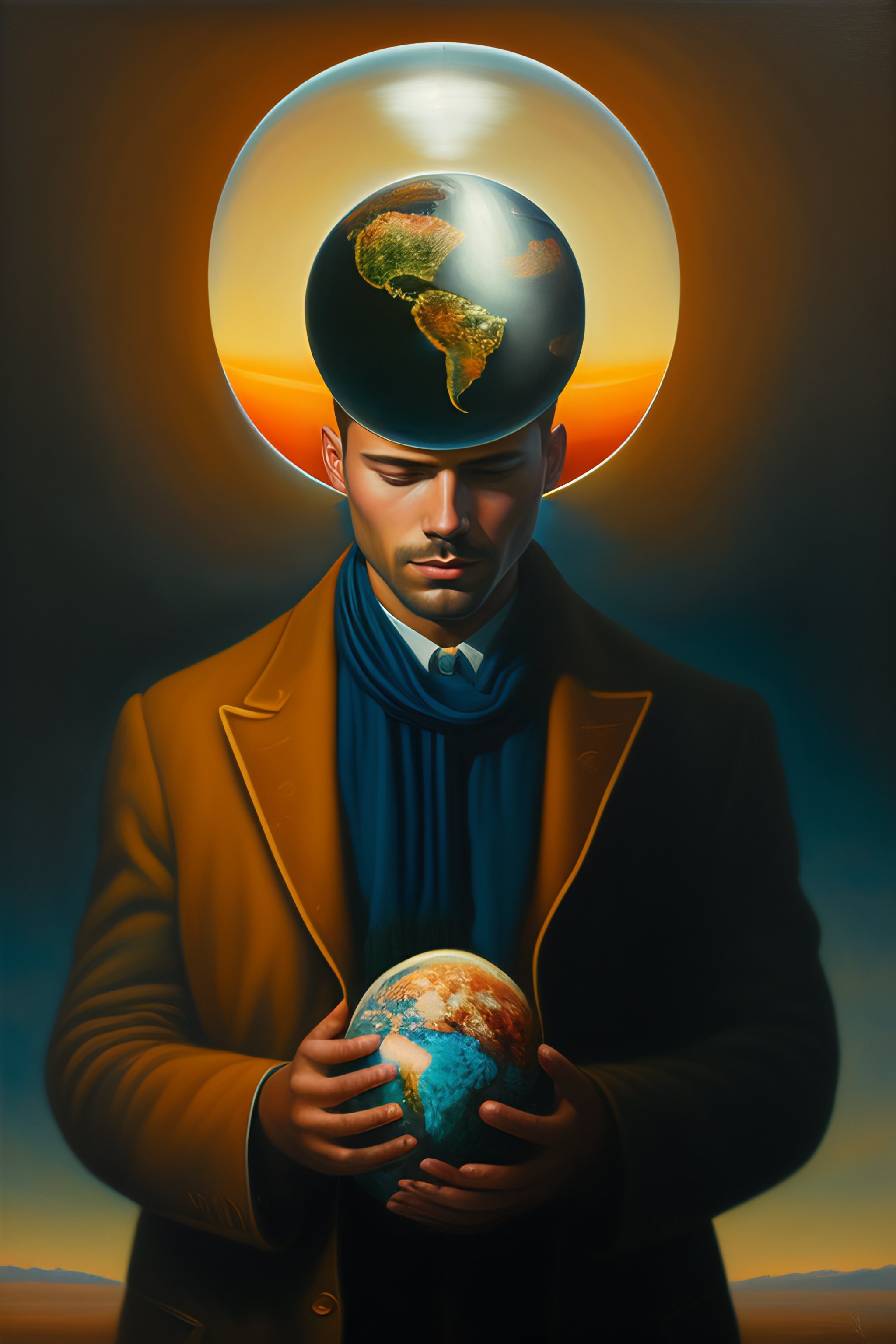 A painting of a man holding a globe in his hands, a surrealist painting by szymon kot, deviantart, metaphysical painting, oil on canvas, surrealist, dystopian art