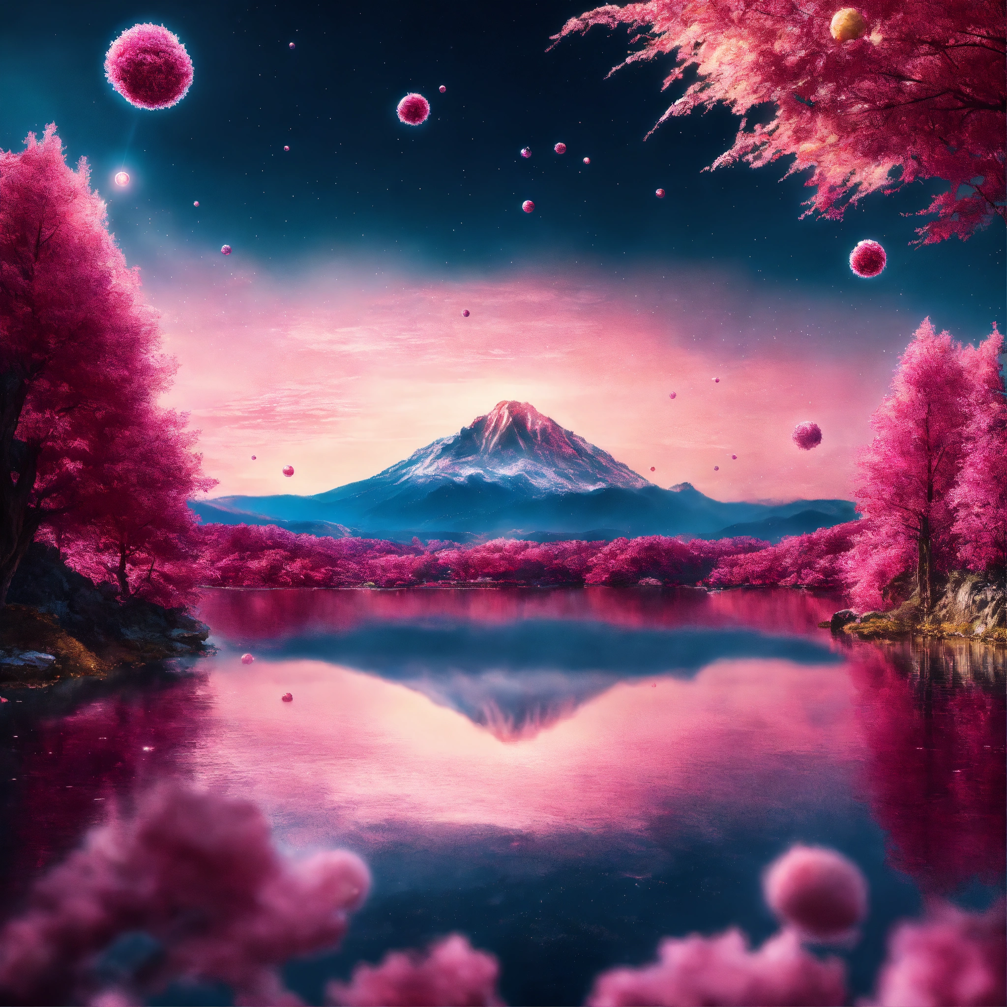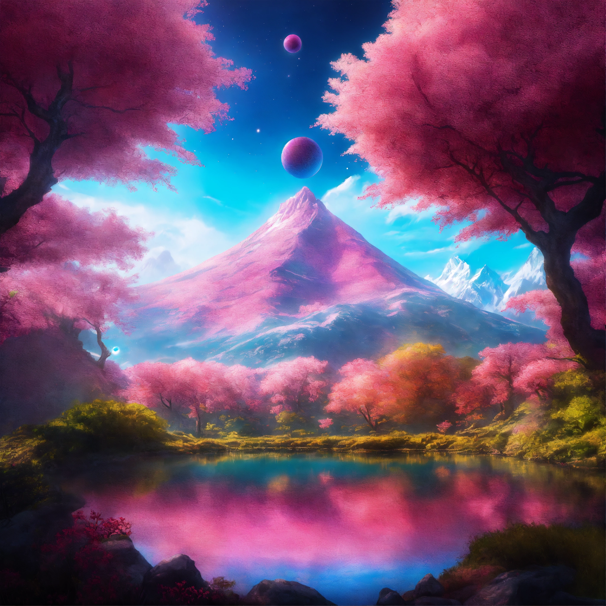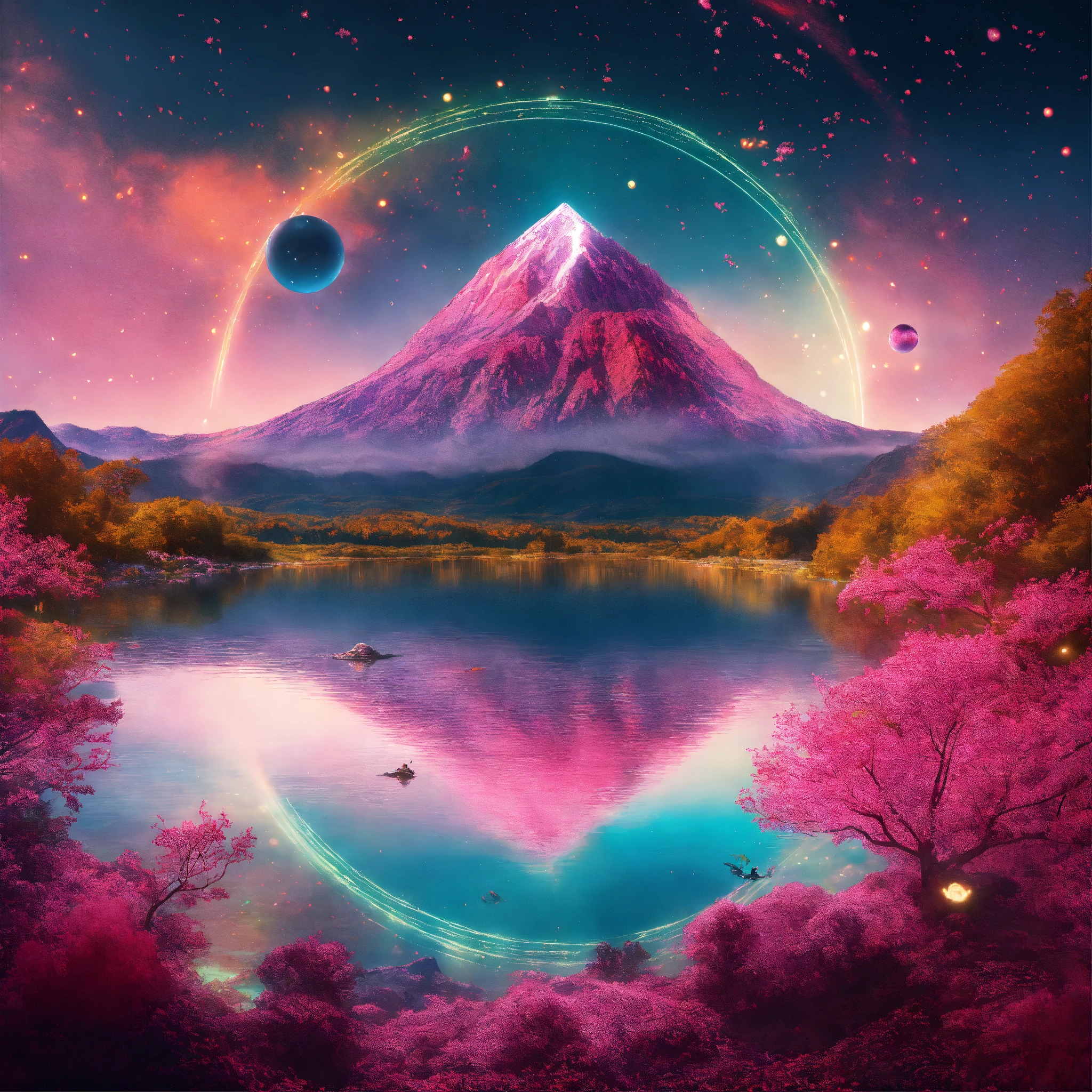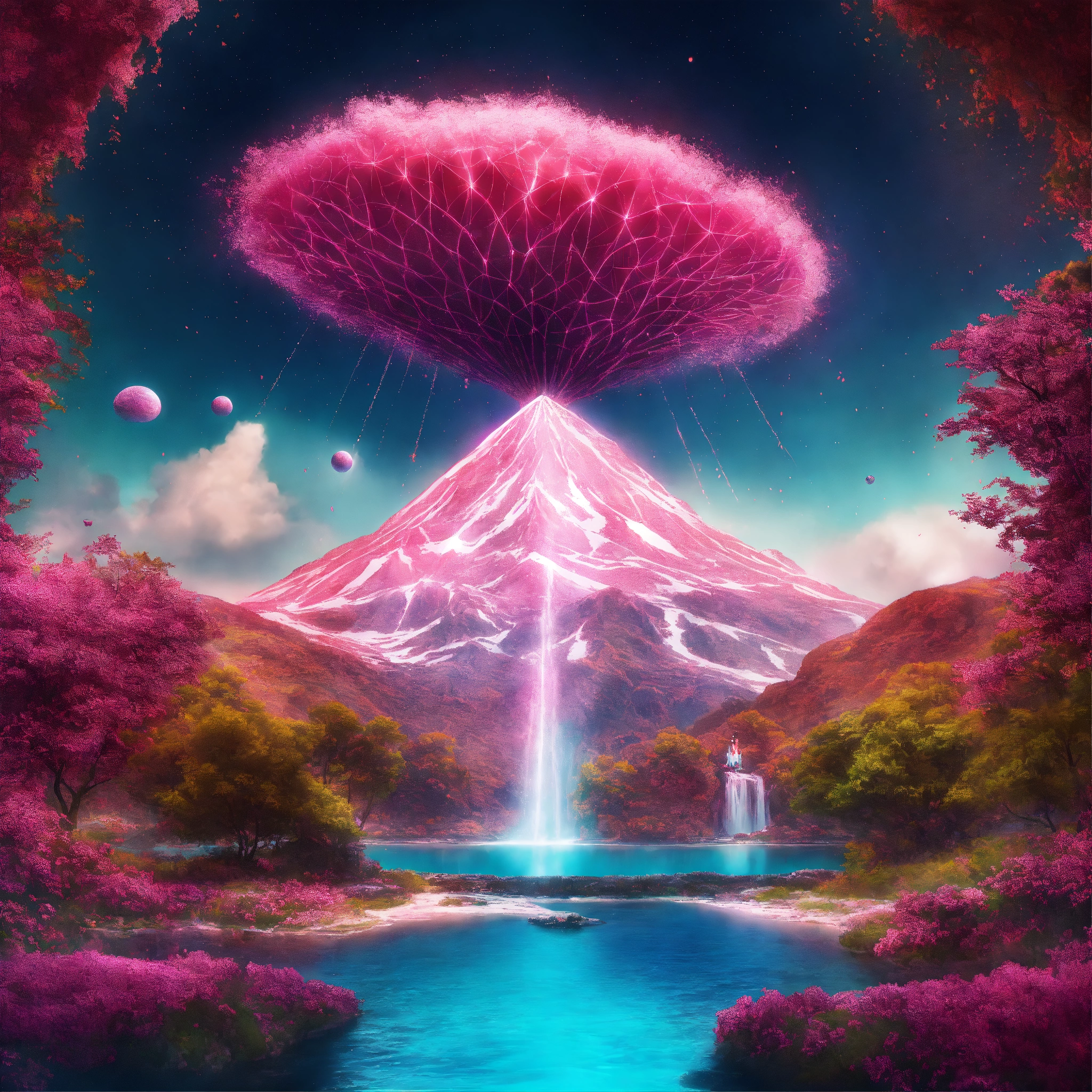 Underwater long exposure photography, a giant pink mountain flying in the cosmos with orbs and portals, x-ray style, in the style of tim burton, lion king, the chronicles of narnia, beauty and the beast, and peter pan. with sacred geometric patterns on the body. enchanting aura. the chronicles of narnia, wizard of oz, and alice in wonderland background with snow mountains, and trees with pink leaves.