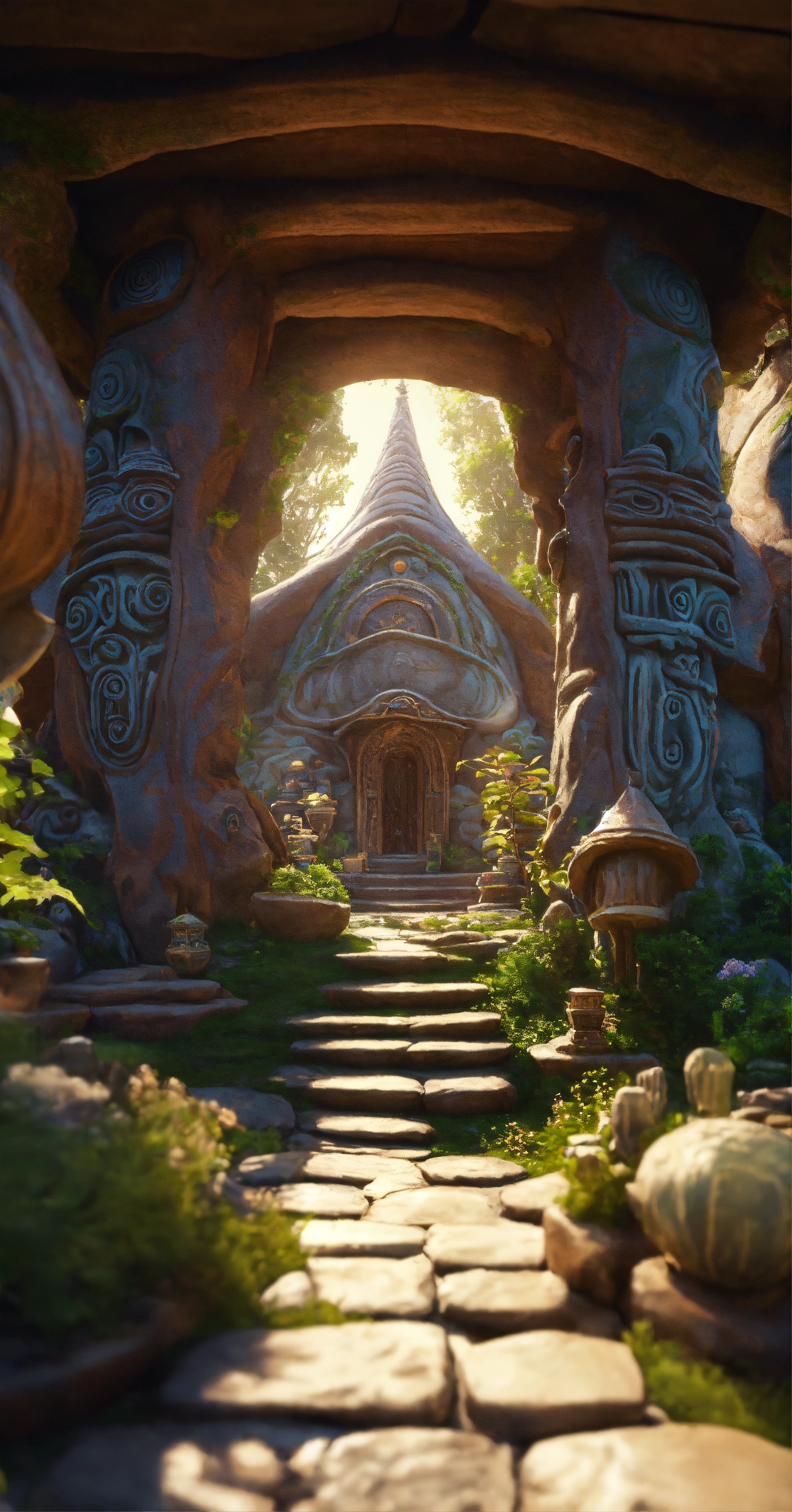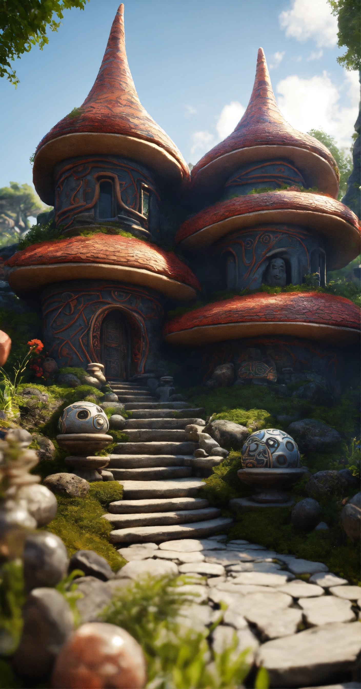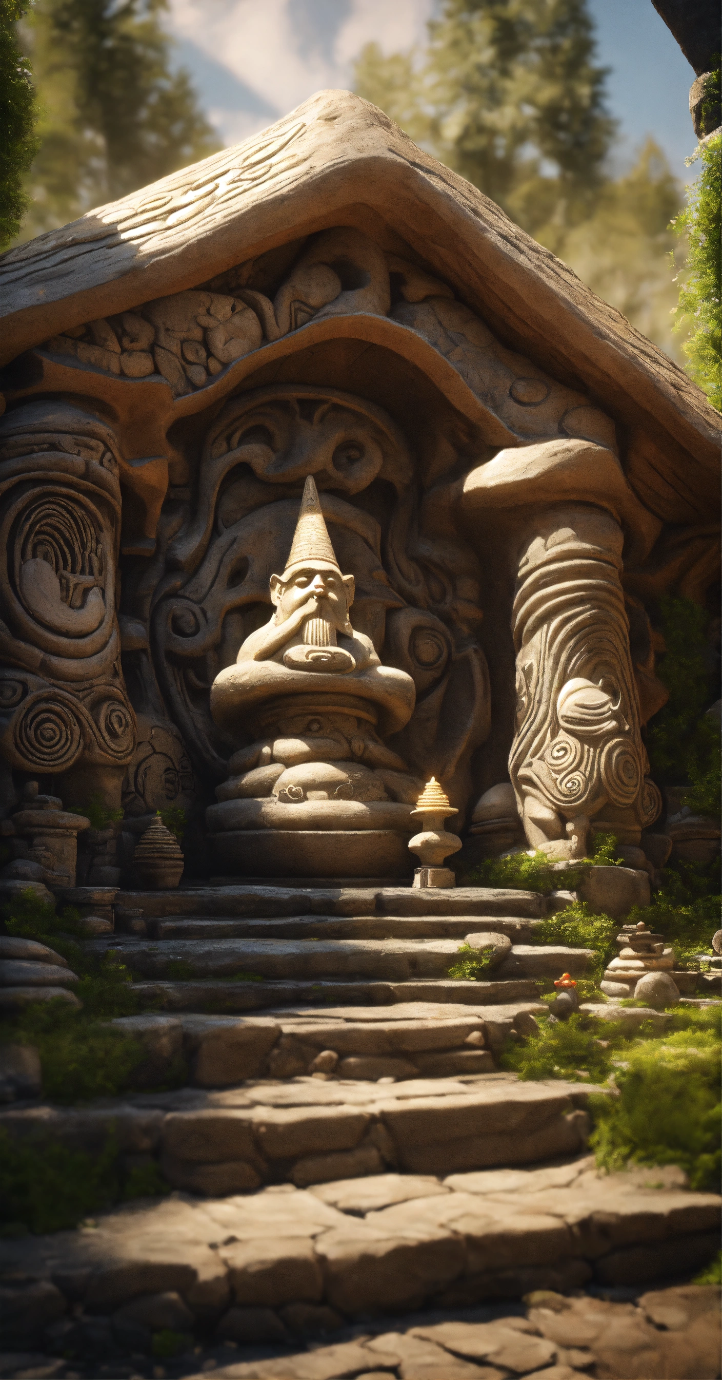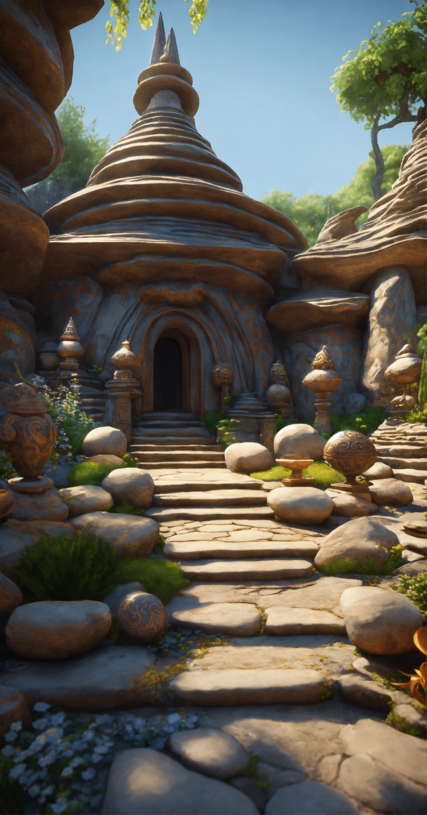 An ancient spiritual gnome inspired house and rock garden.sculptured . style of alex grey. a hint of giger. totem sculptures. patterned stone winding pathway, labyrinth.courtyard.meditative.unreal engine 4k hd