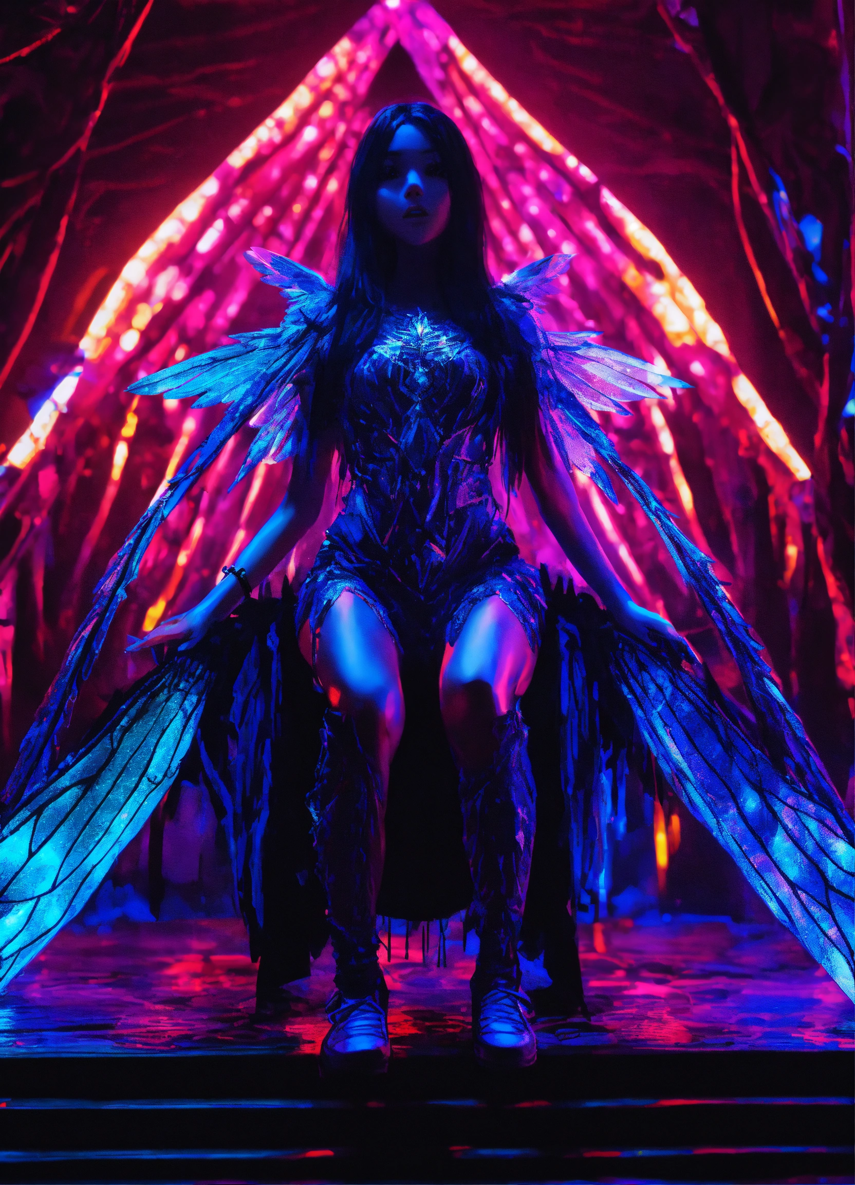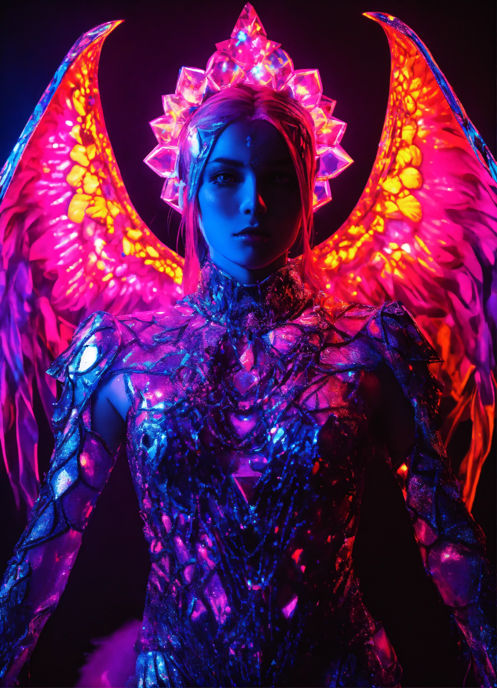 Full body the grudge in a diamond angel suit in a blacklight dmt demon psytrance rave