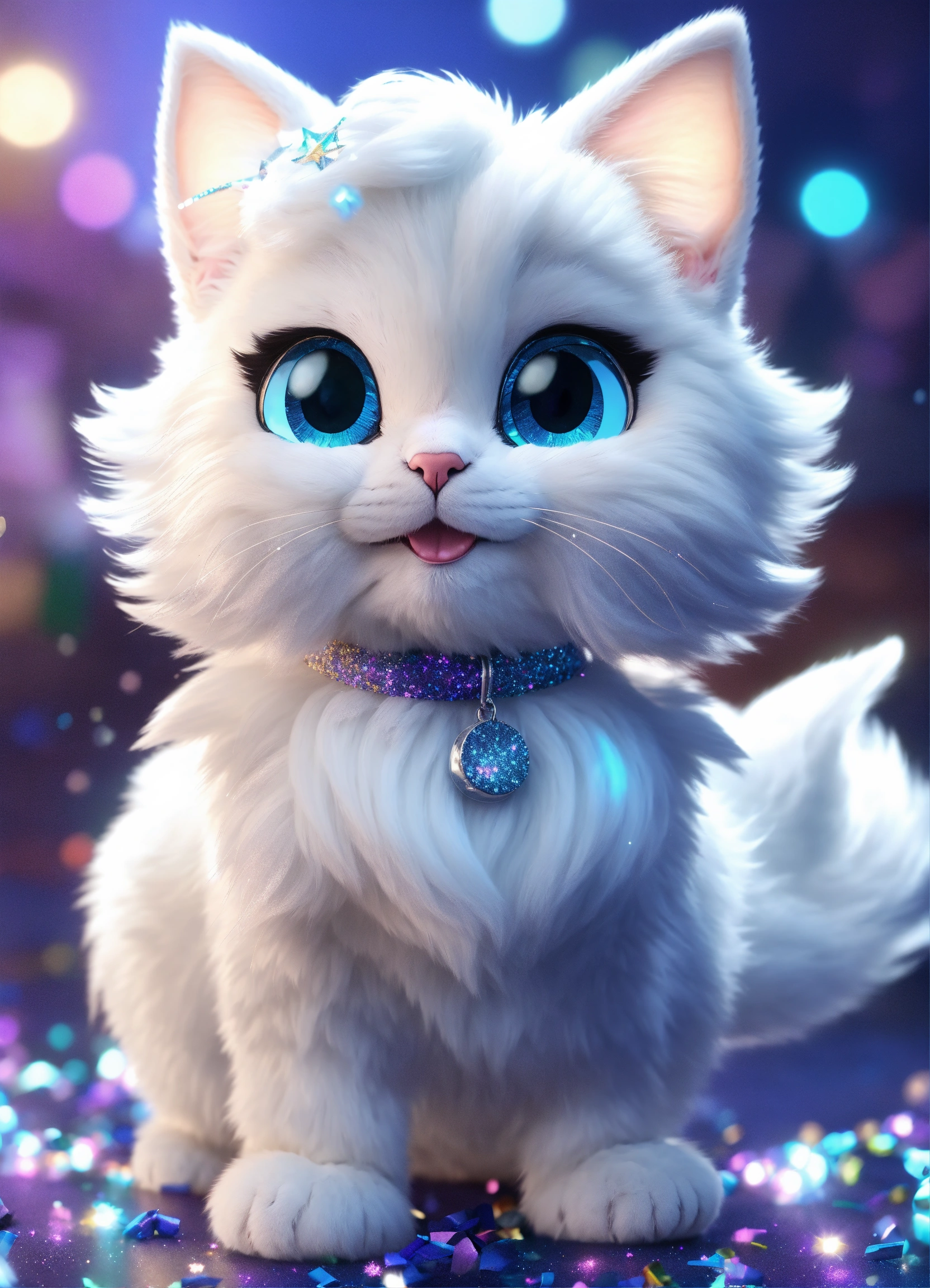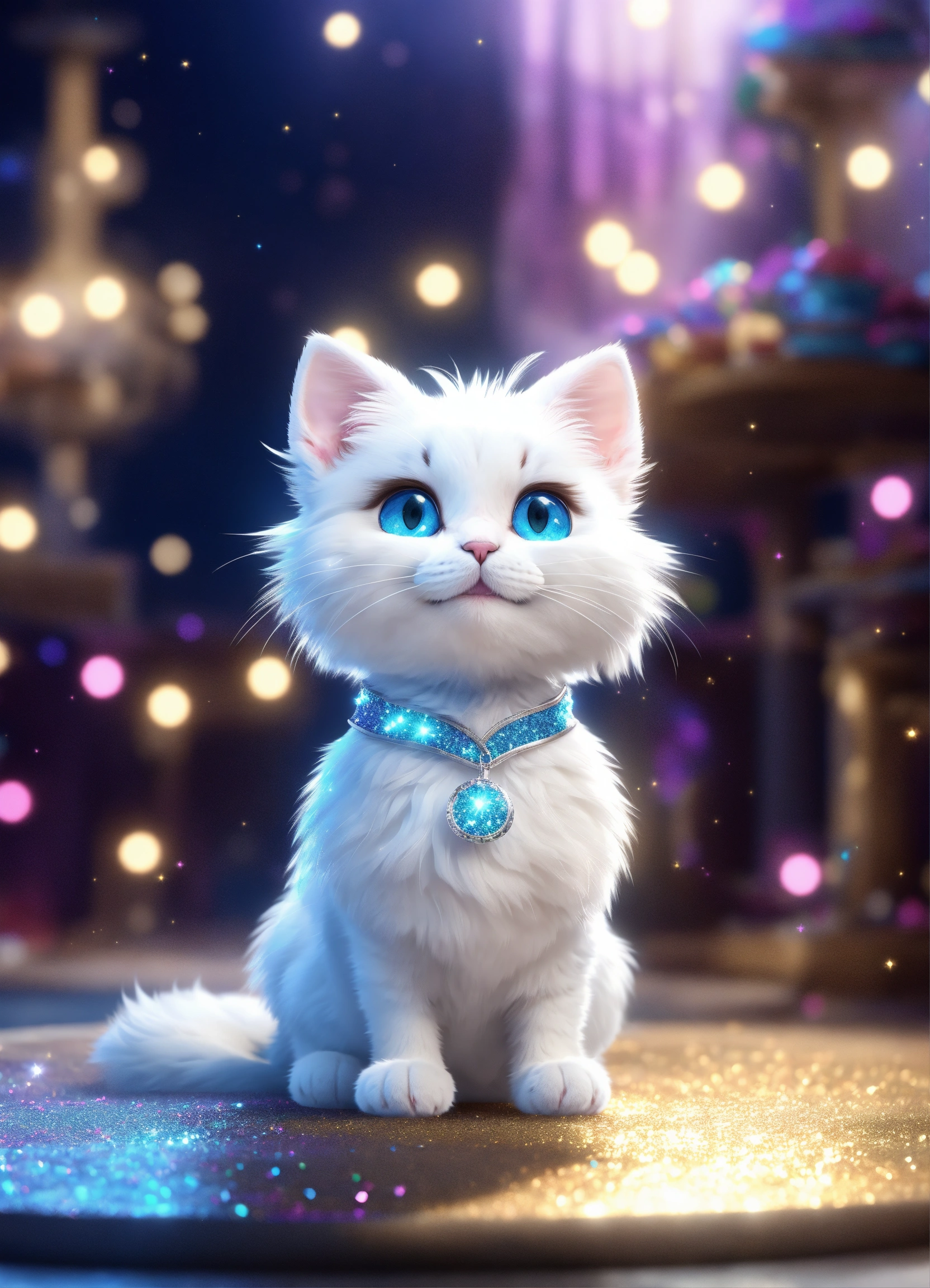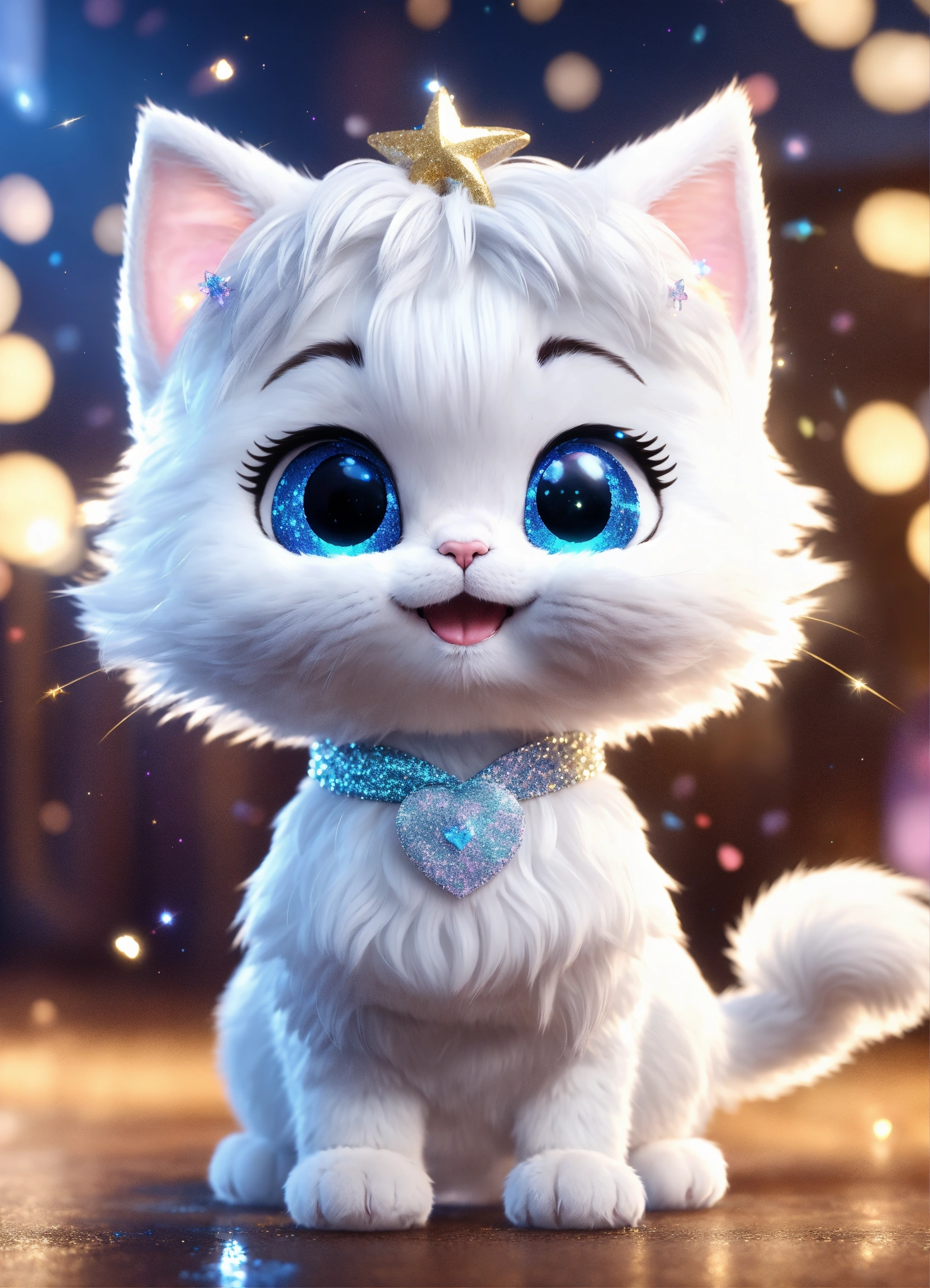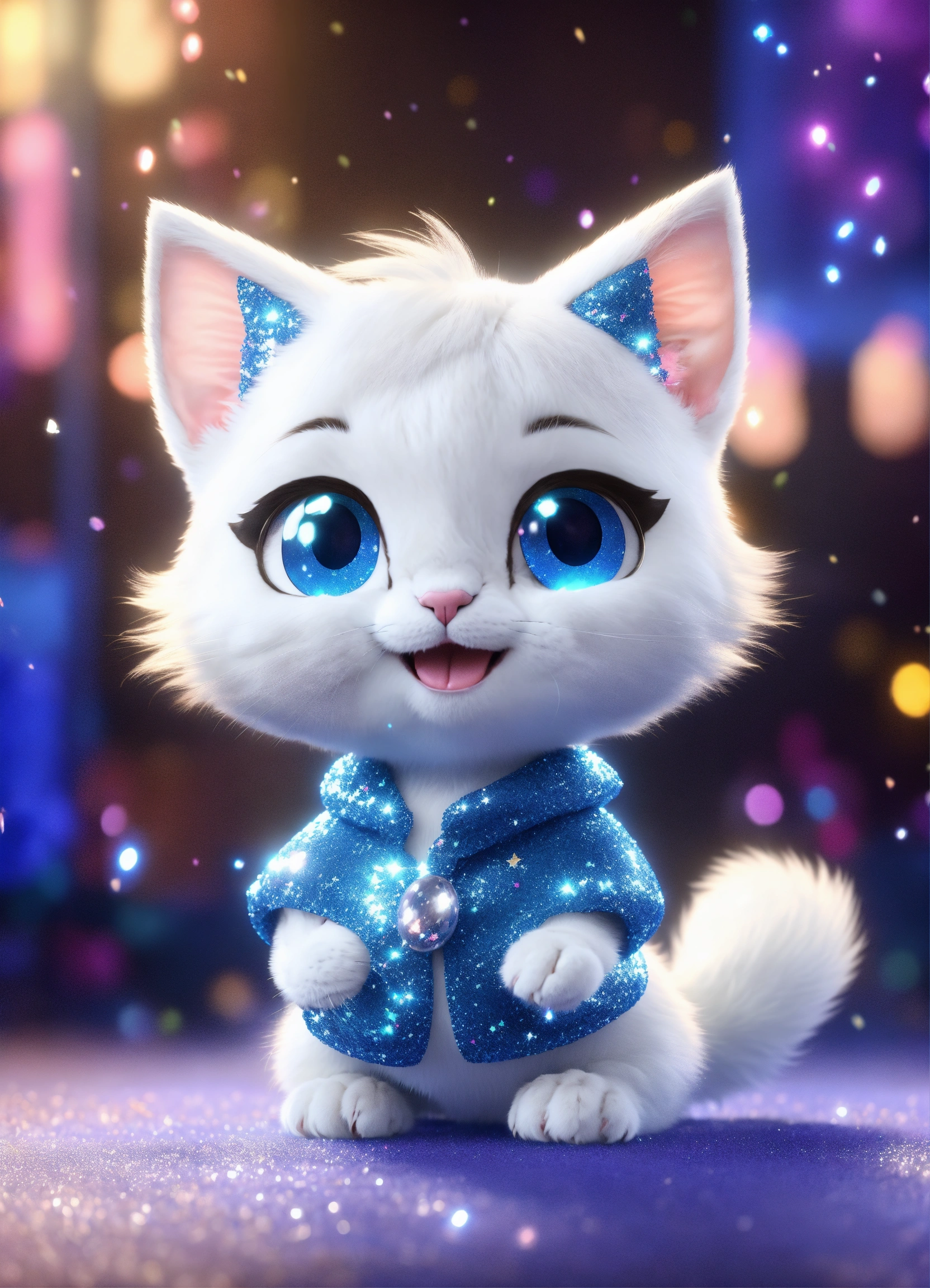 Disney cartoon character, chibi, kind fluffy white cat with shiny silver hair in glitter and blue eyes and smile, hair sprinkled with glitter dust, magic glitter, full length, unreal engine render, 8k