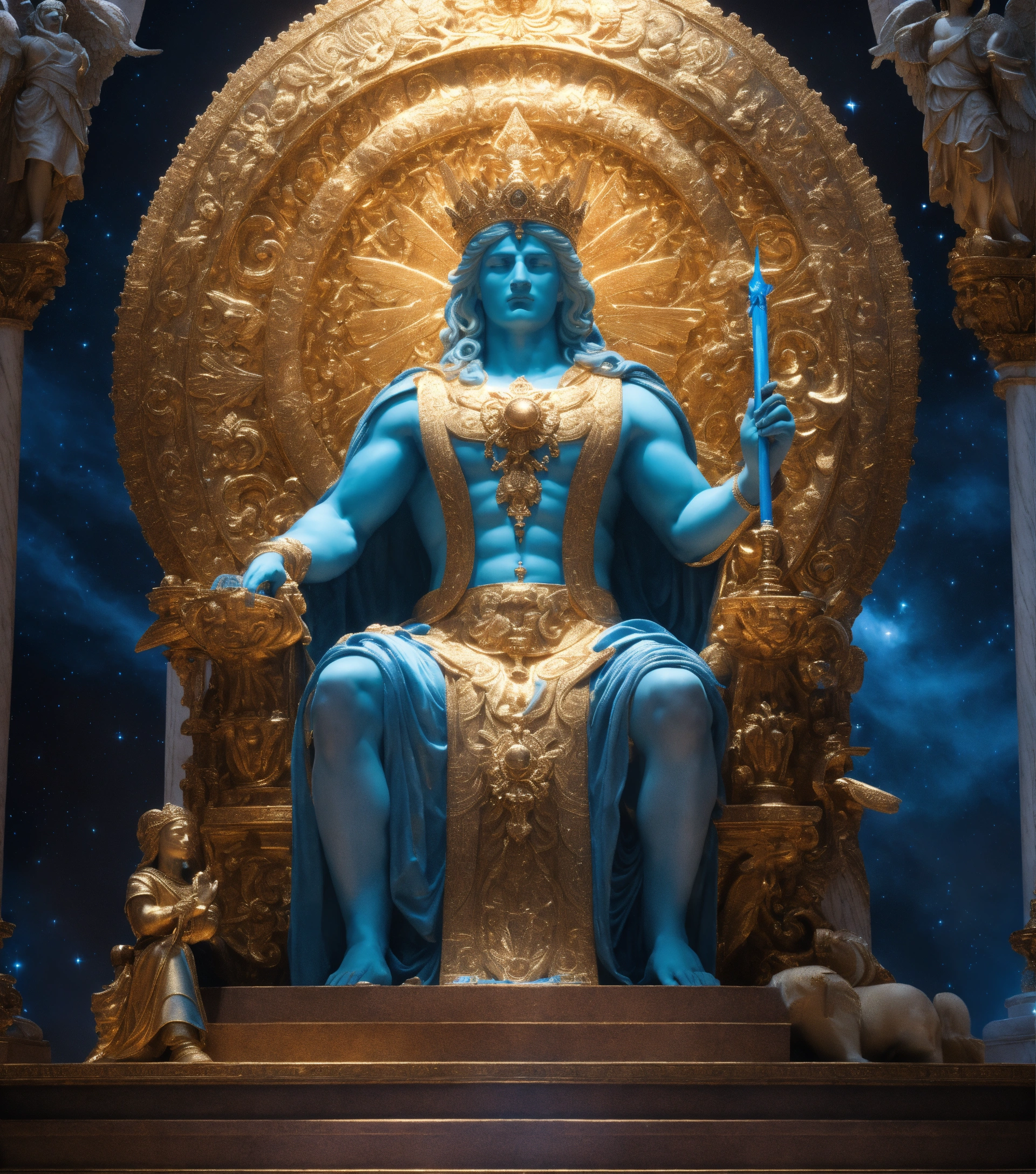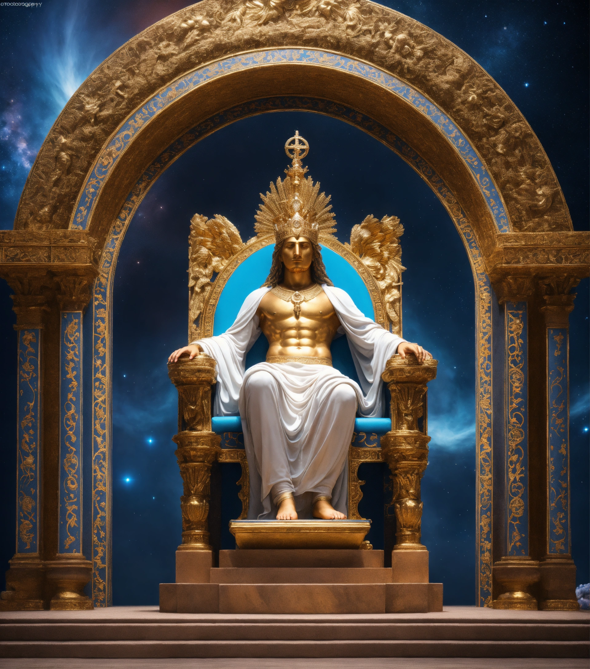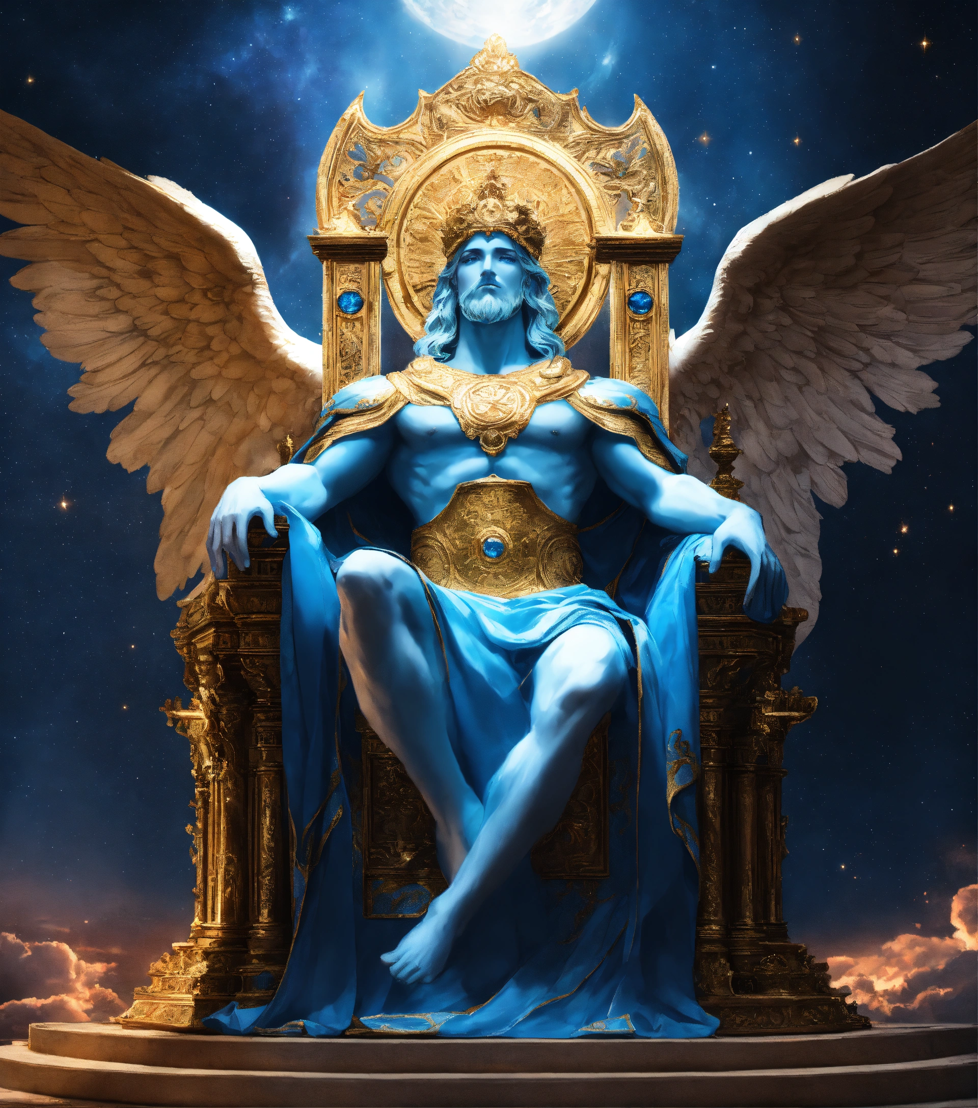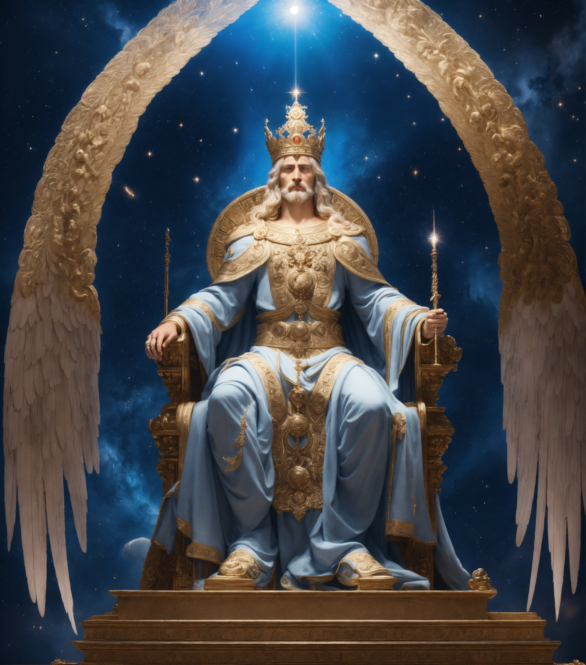 Celestial god, most high, imposing, sovereign, powerful, seated on his throne, majestic, with power surrounding him, displaying his infinite power, countenance with gentle, calm, and kind emotion, blue eyes, real image, angels worshiping around him, ultra-realistic, photography, 8k, ultra definition
