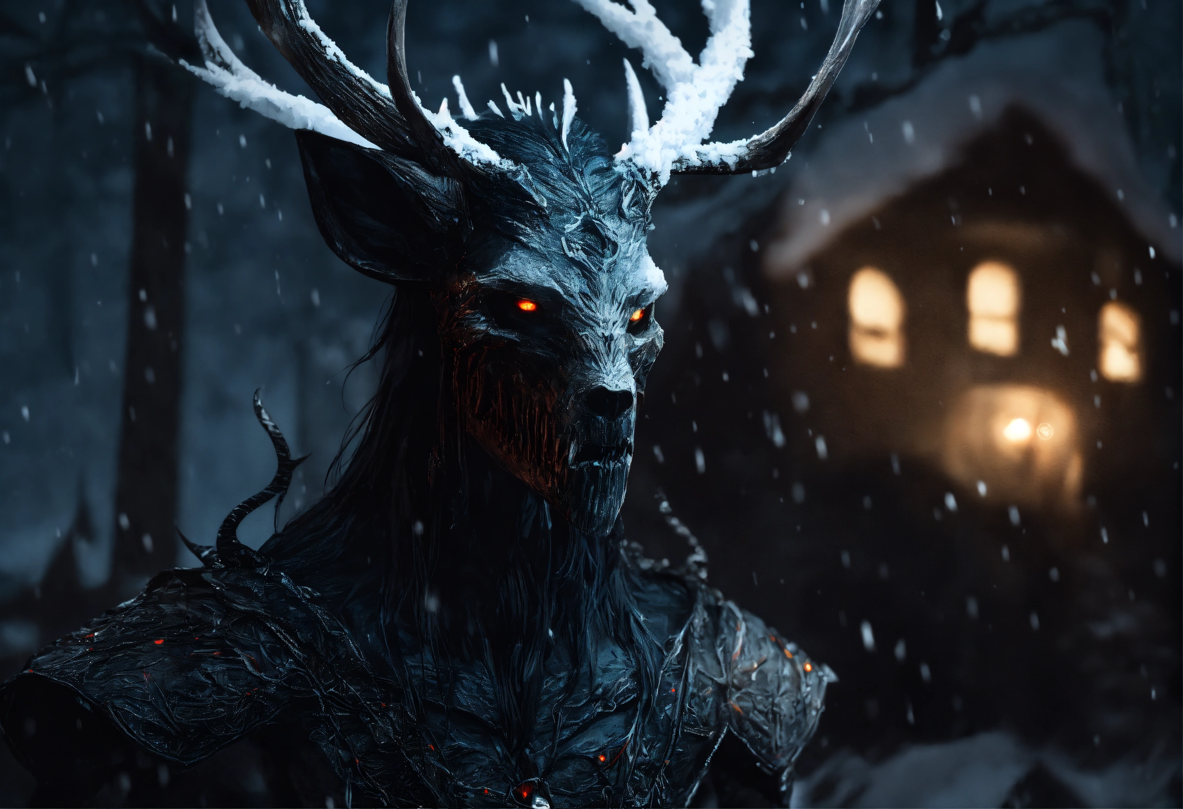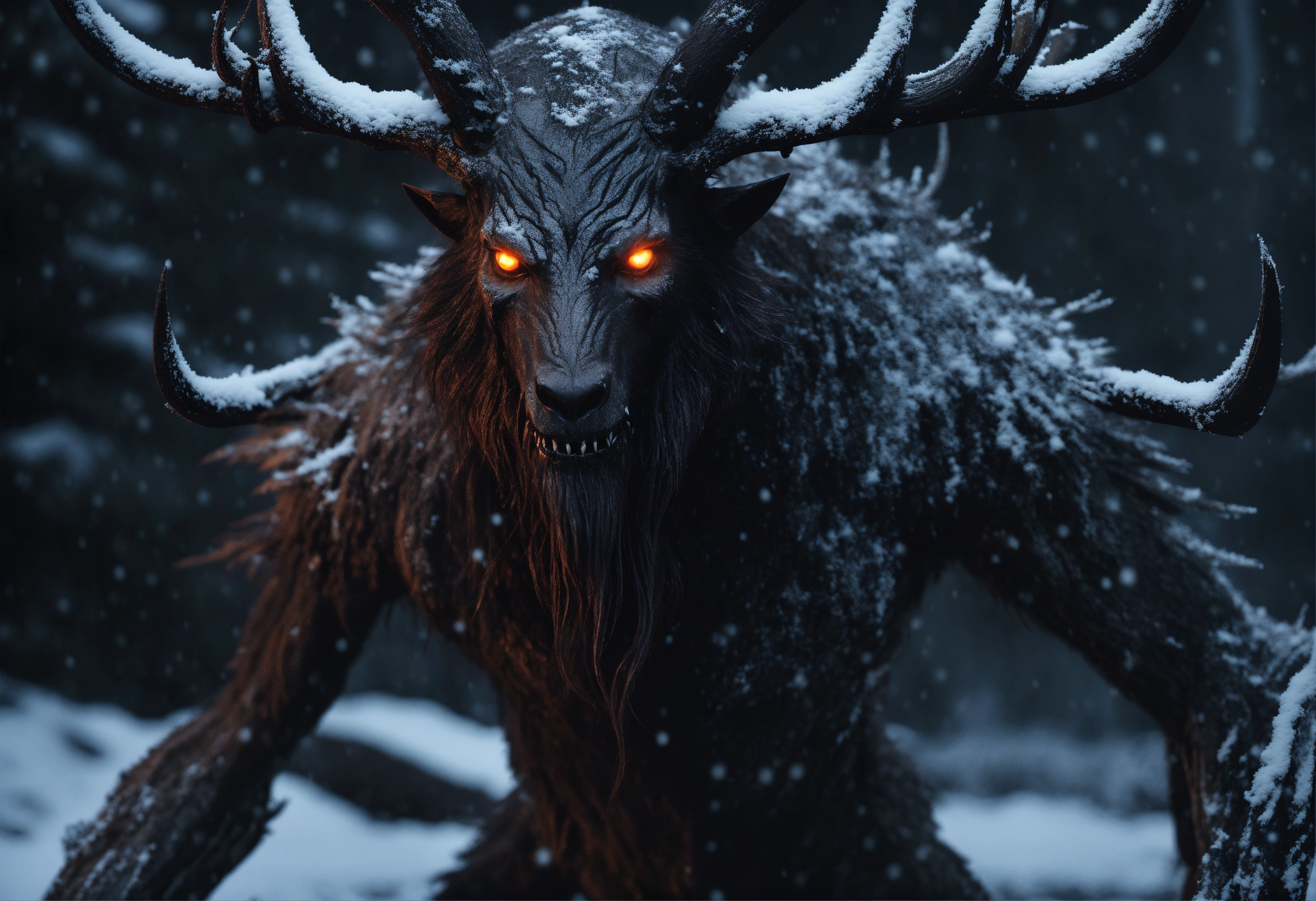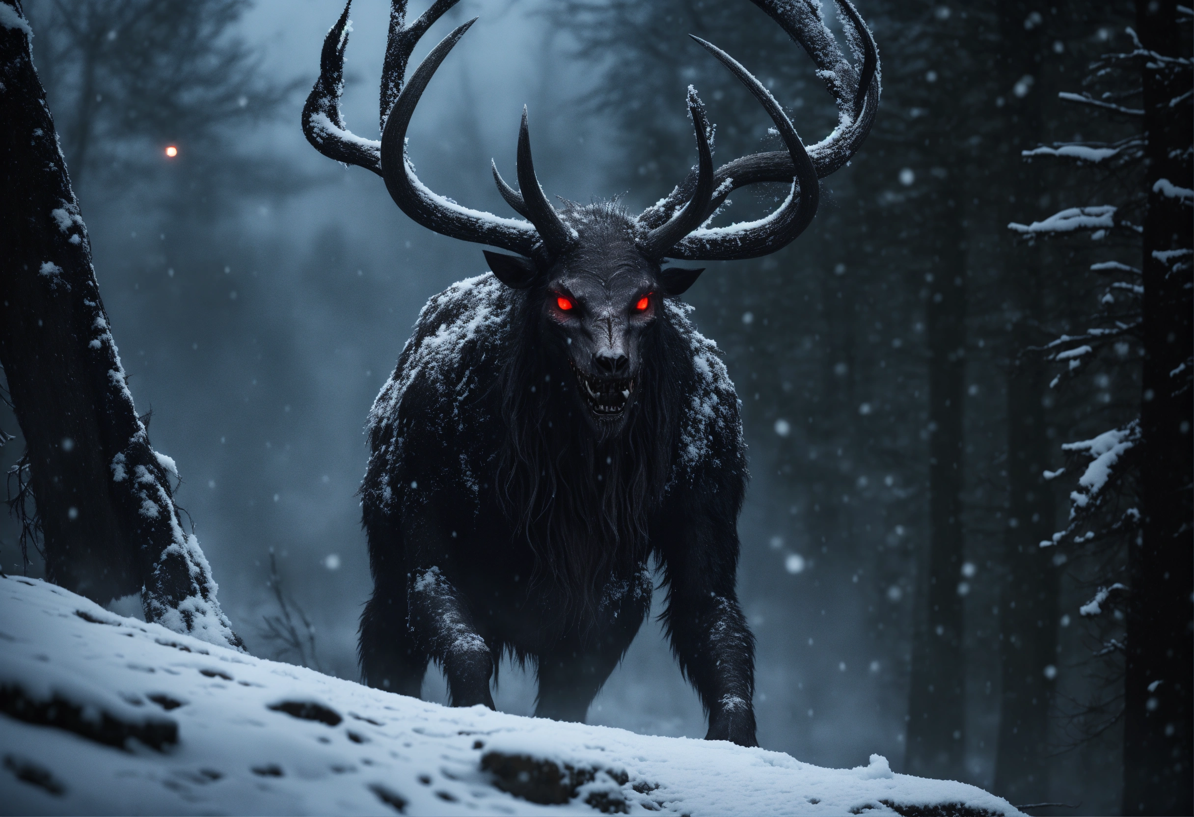 eyes glow and snow is falling on an all black background