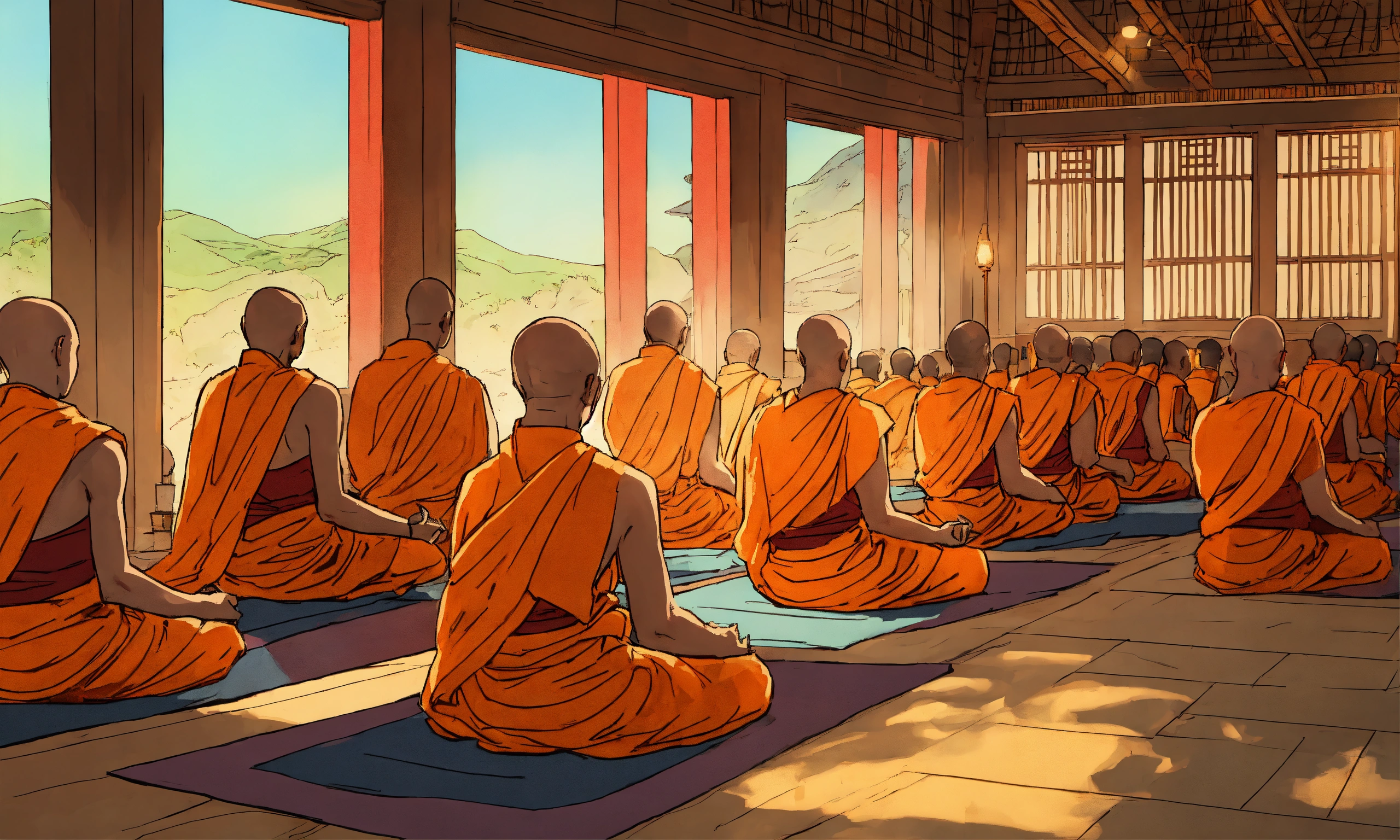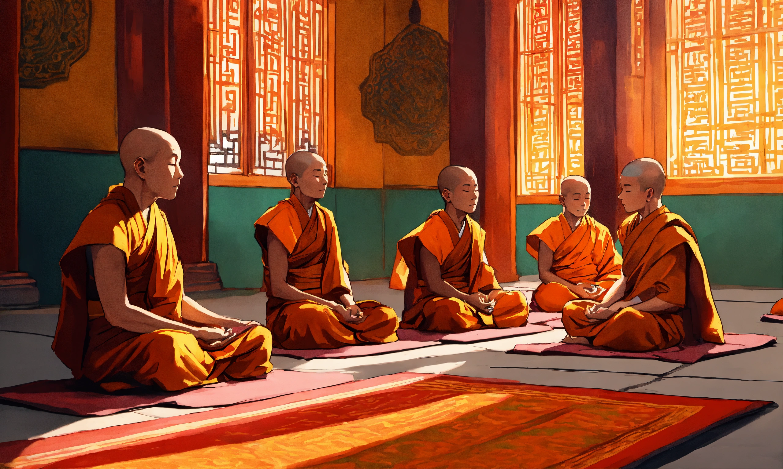 A hand drawn painting of buddhist monks engrossed in meditation in monastery, 4k, sharp, vibrant, lively