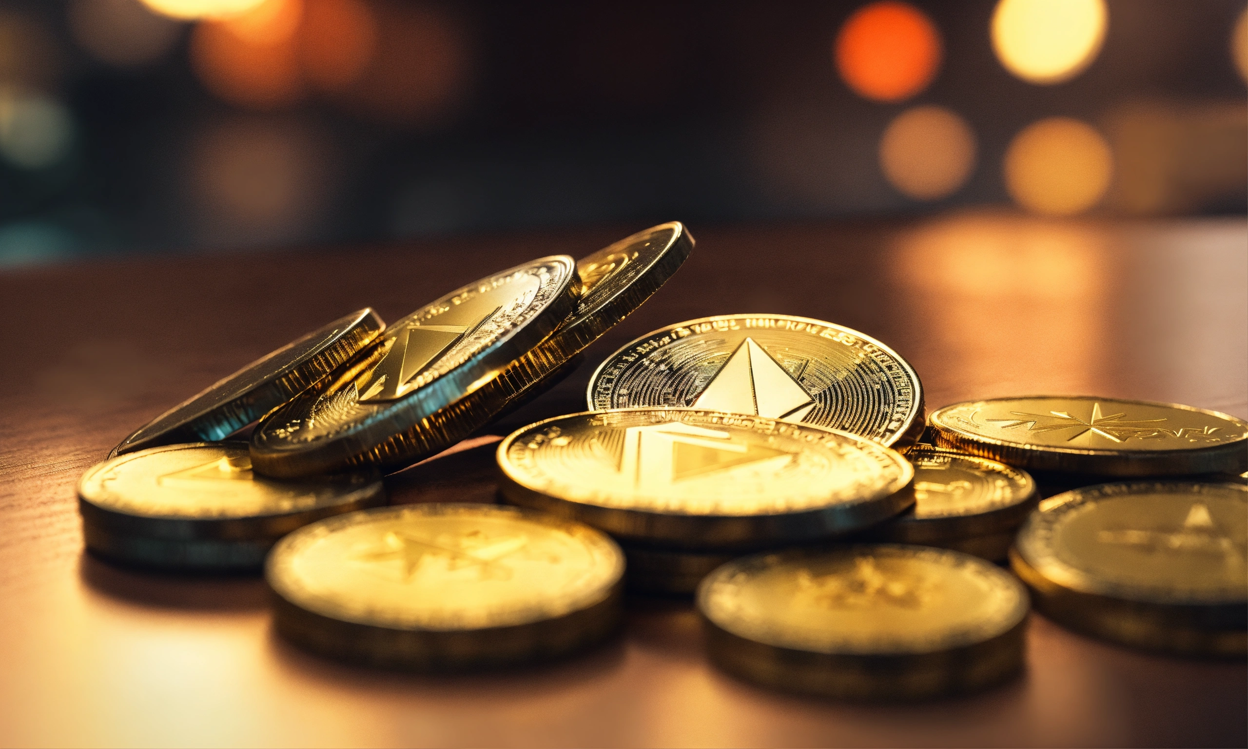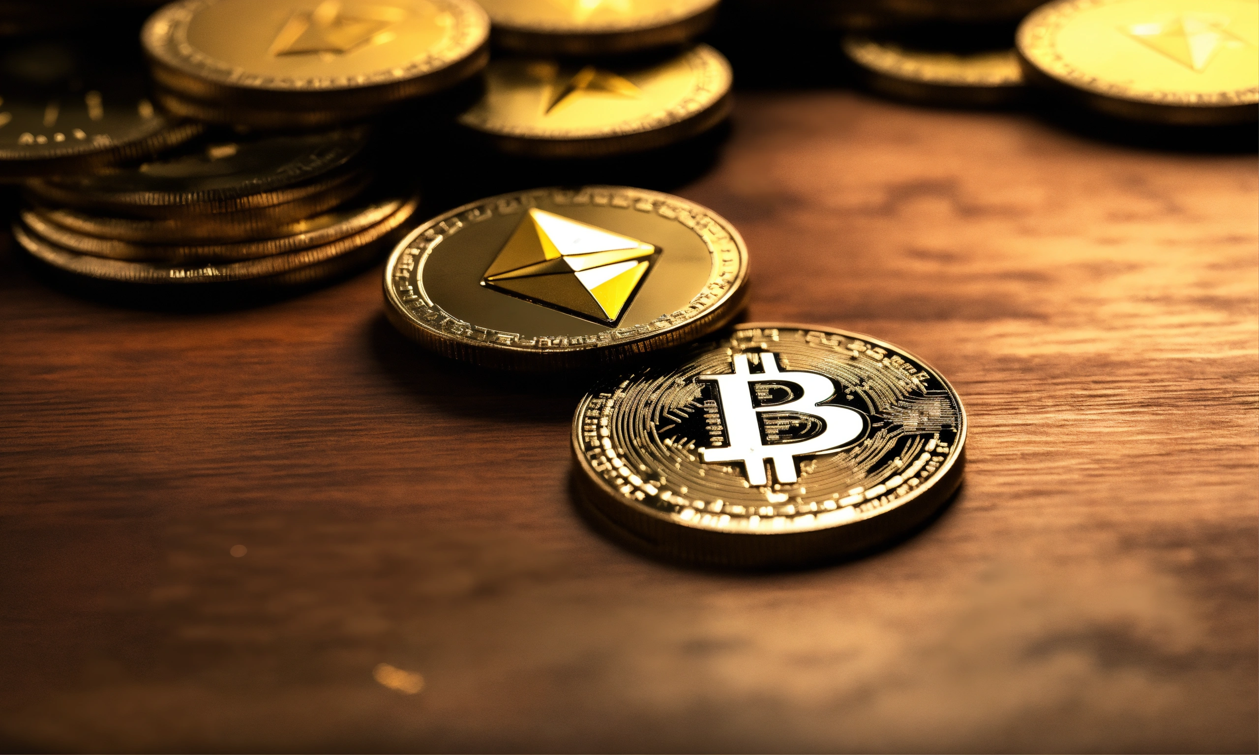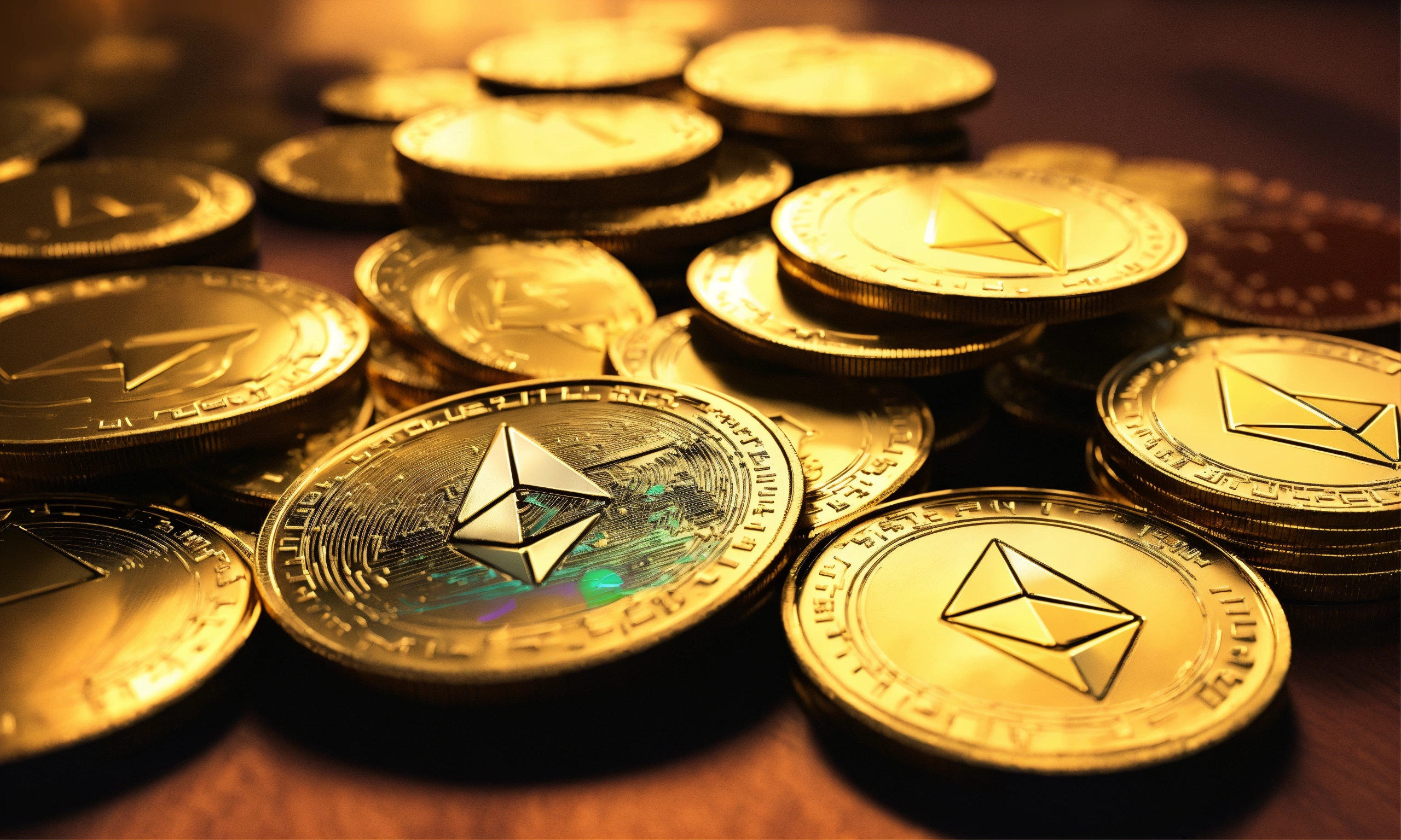 In the front are some ethereum coins on the table, 4k, high resolution, realistic image/photo, modern style