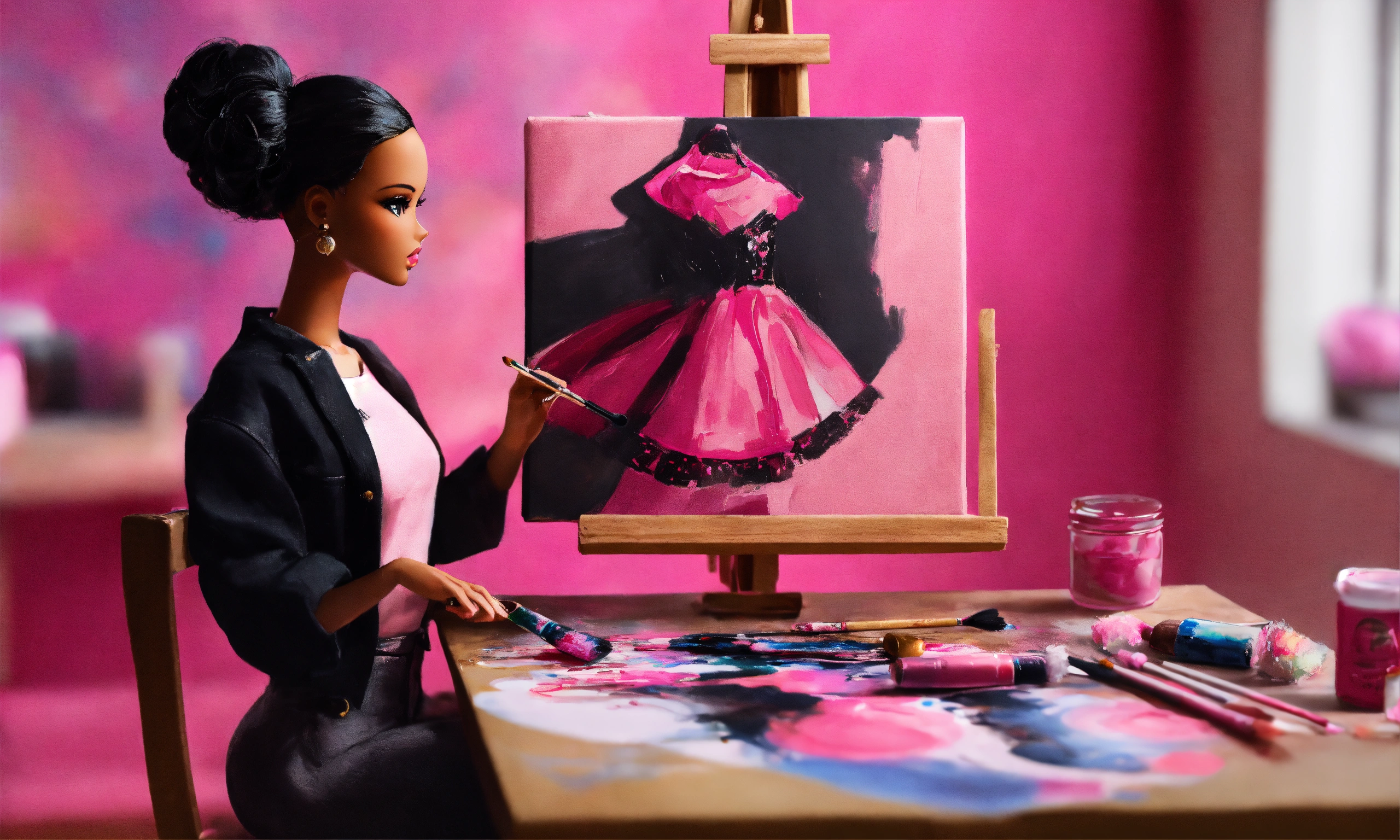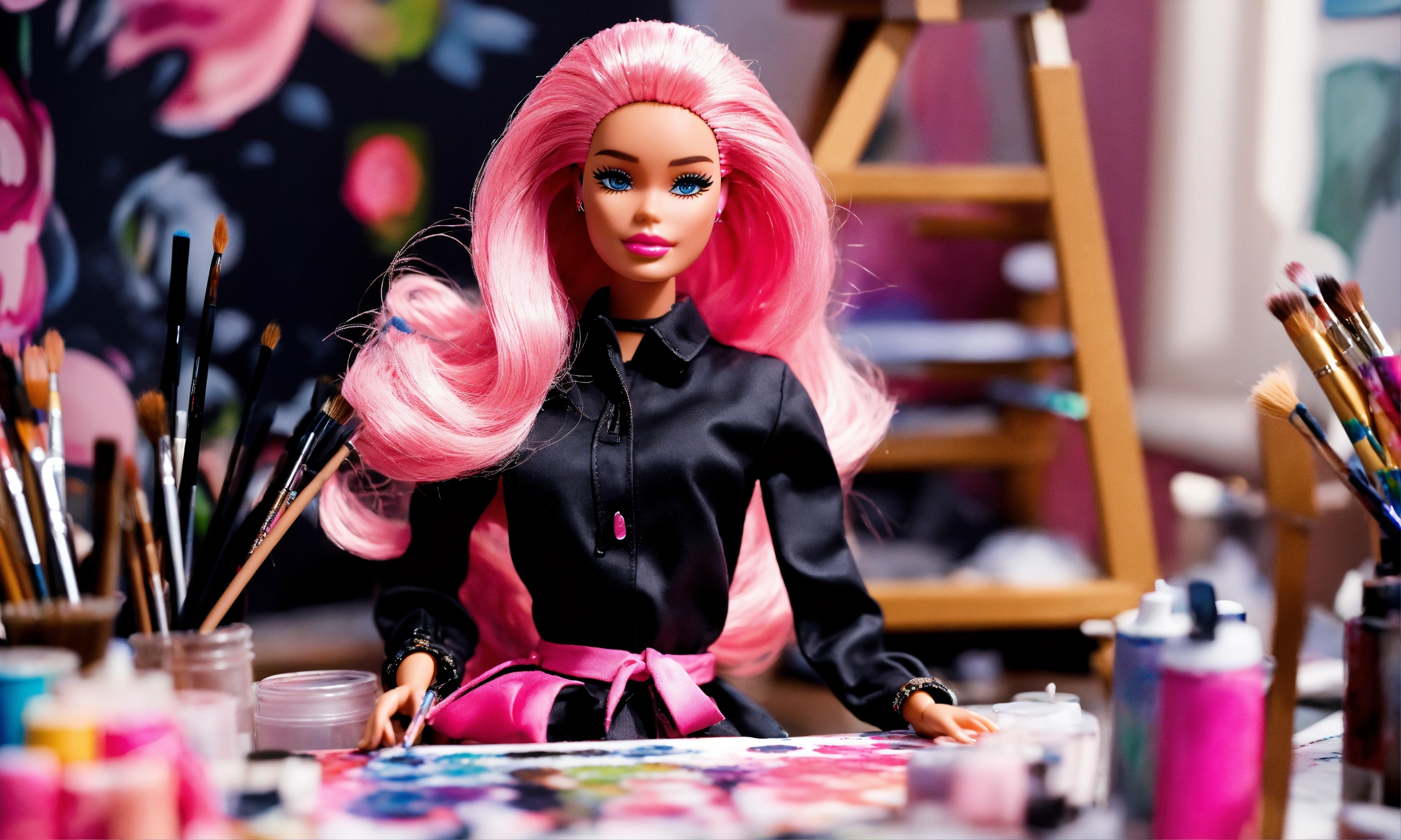 Barbie dolls, career as a artist, pink, and black fashionable, gorgeous, working in a art studio, painting on canvas, drawing in her sketchbook