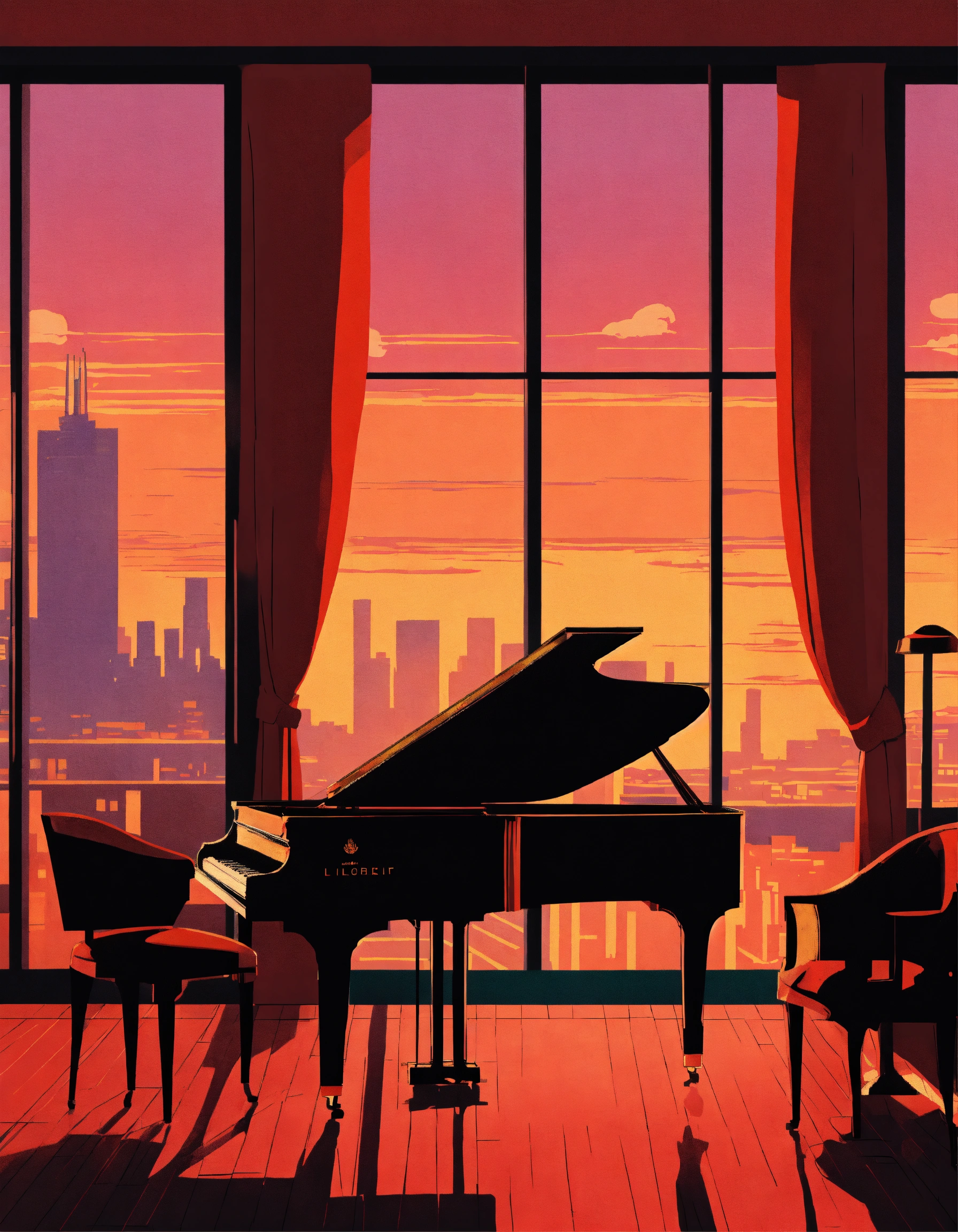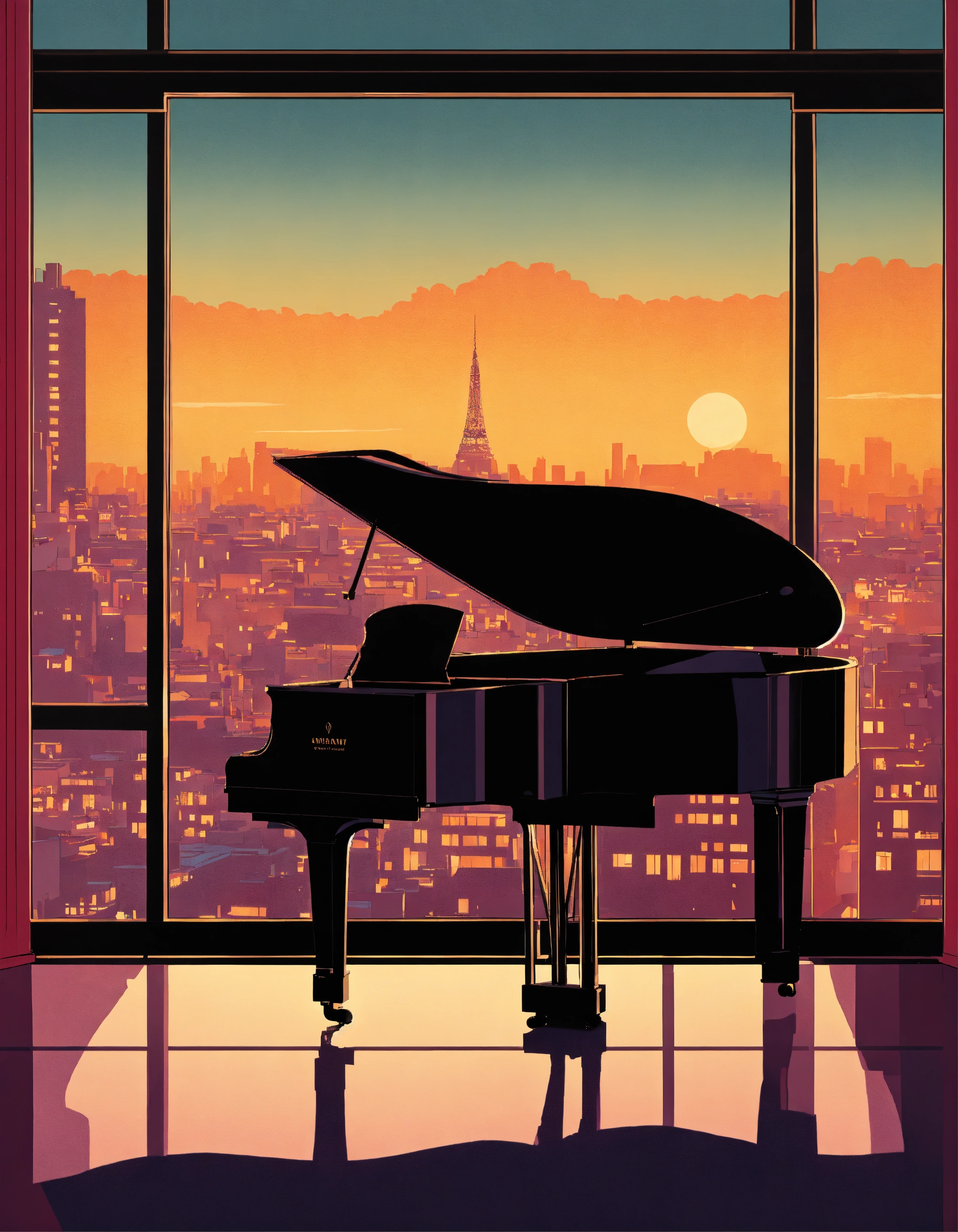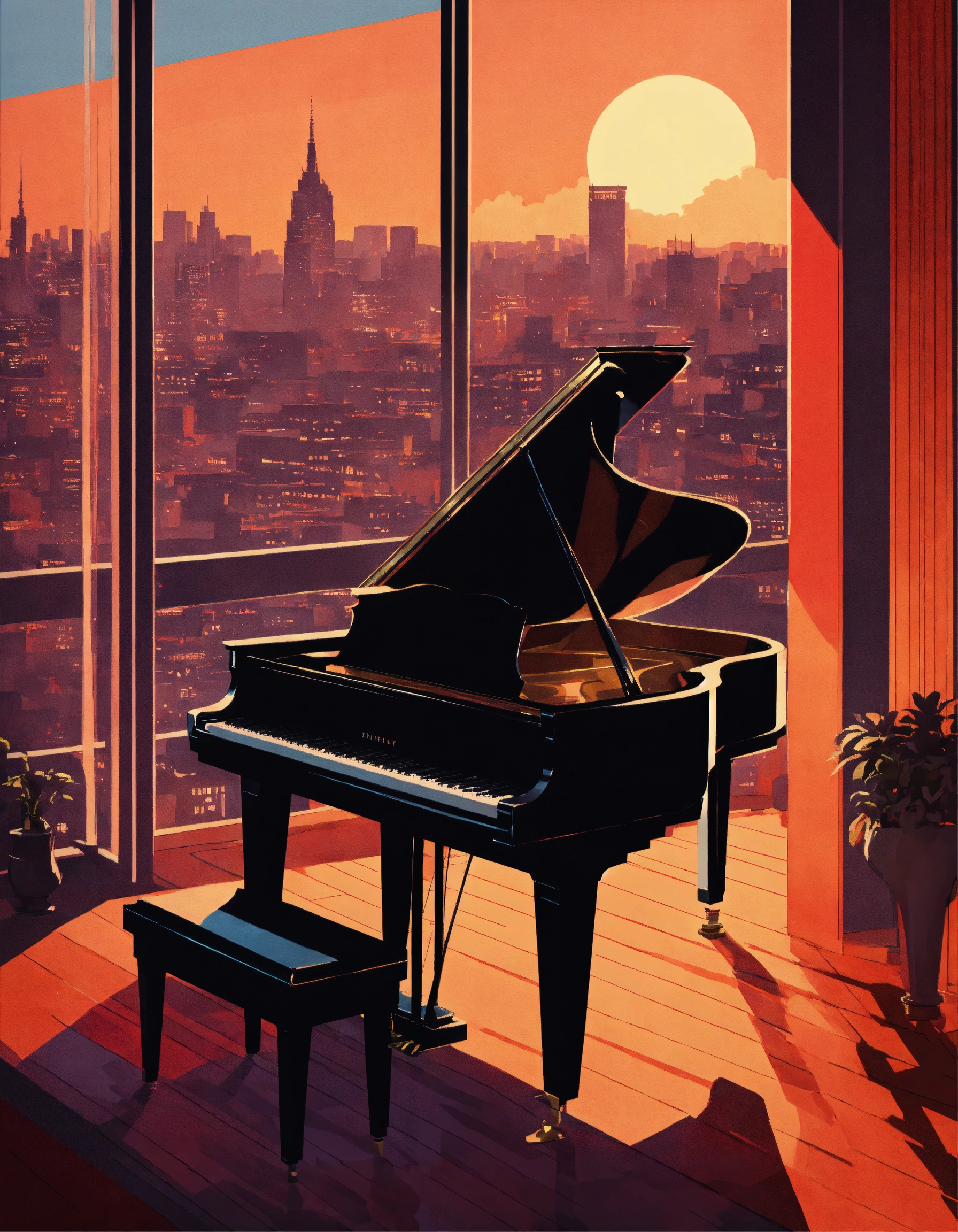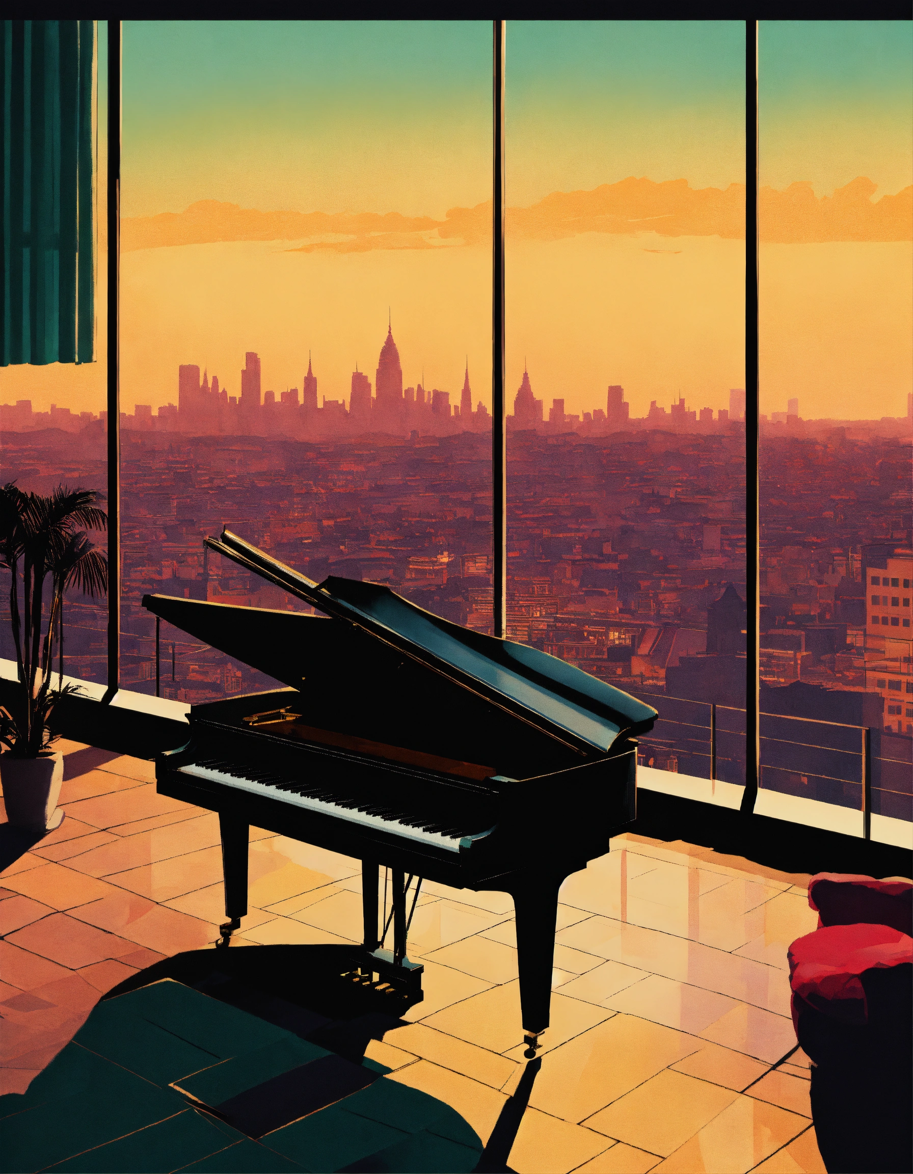 A silhouette of a grand piano overlooking a dusky cityscape viewed from a top-floor penthouse, rendered in the bold and vivid style of a vintage travel poster