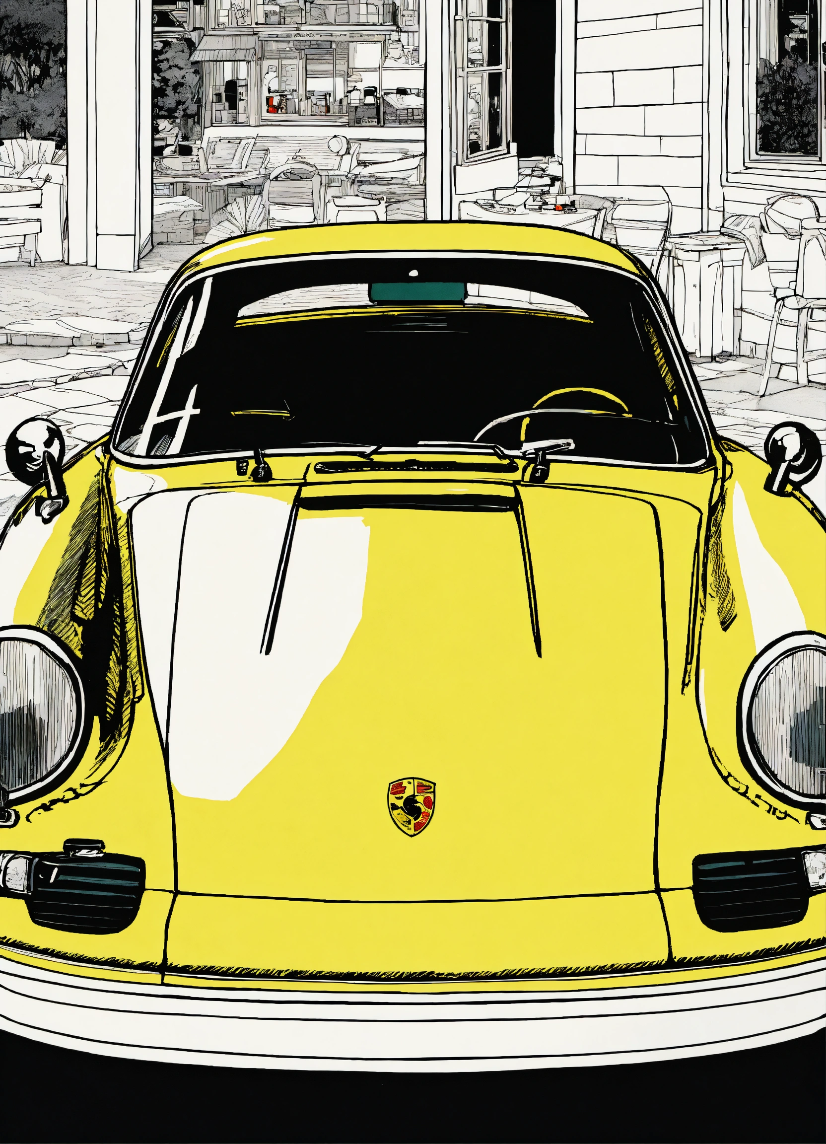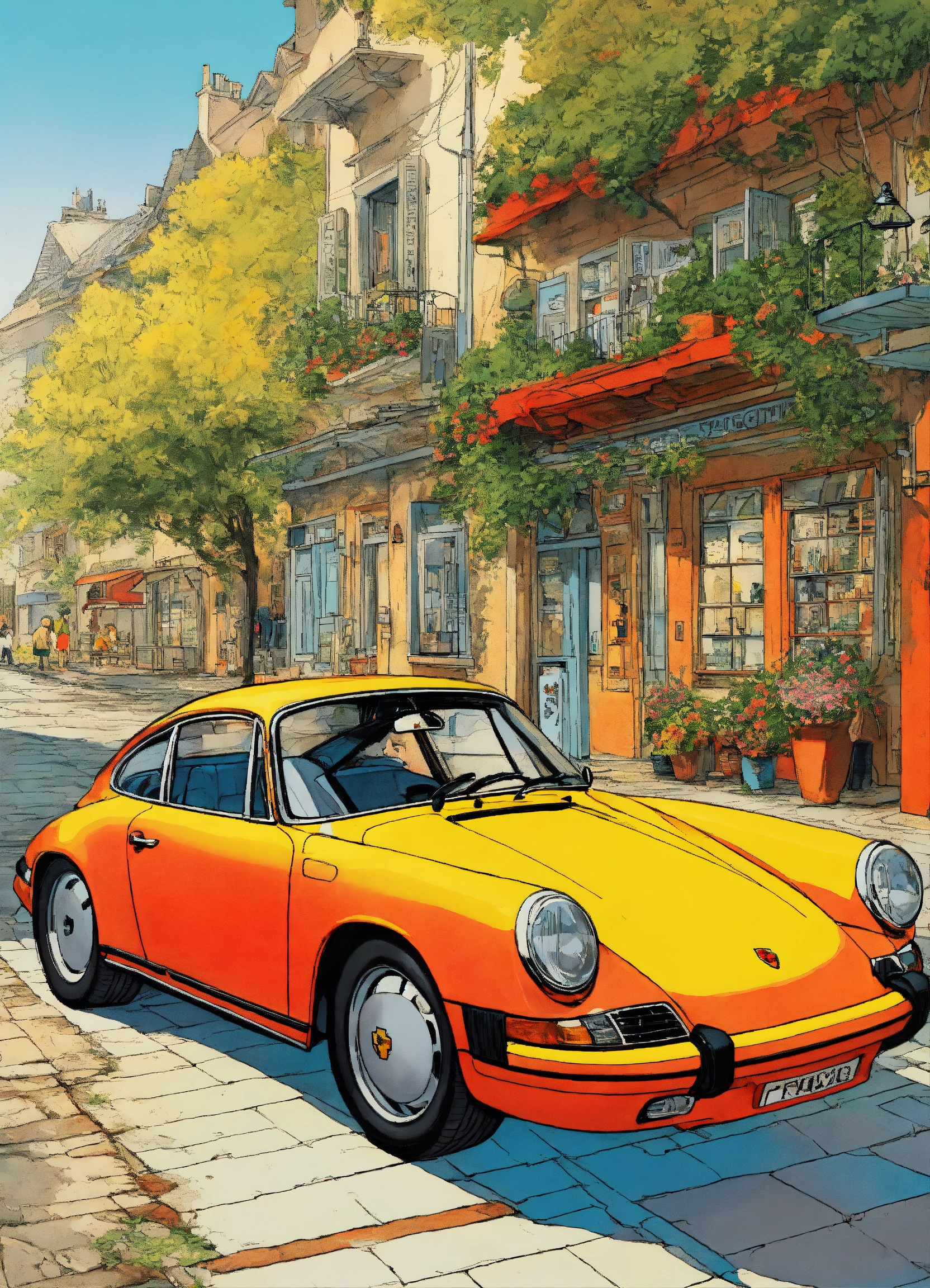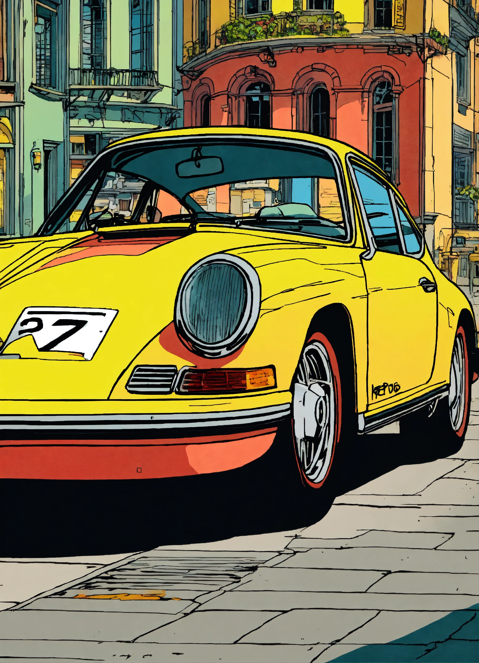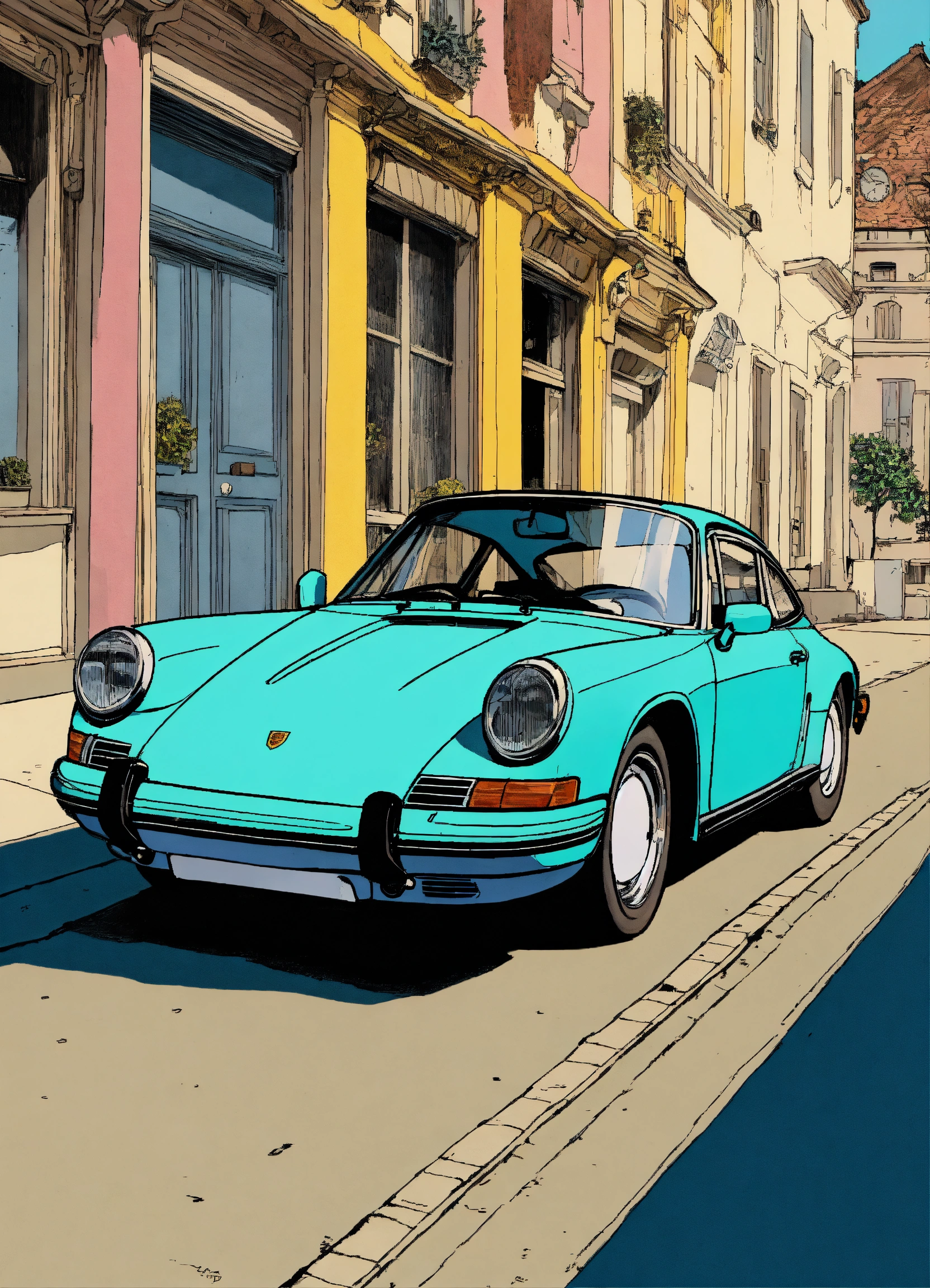 Detailed pen and ink illustration of porsche, bright color of the car, by herge, in the style of tin-tin comics, colorful, detailed, high quality, minimalism, aesthetic