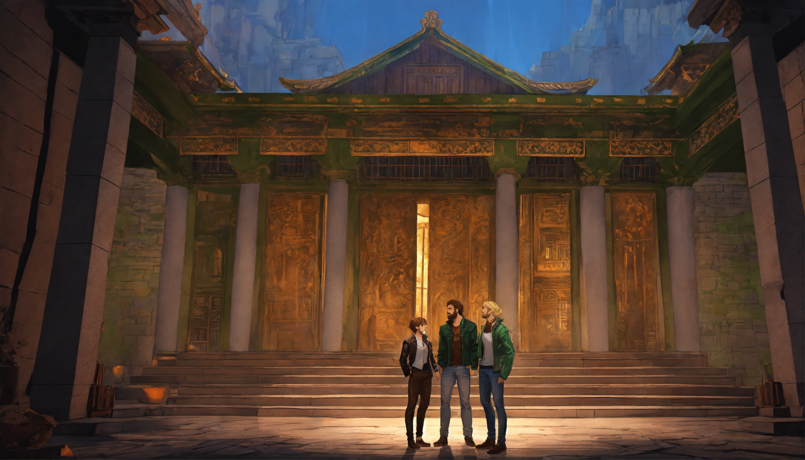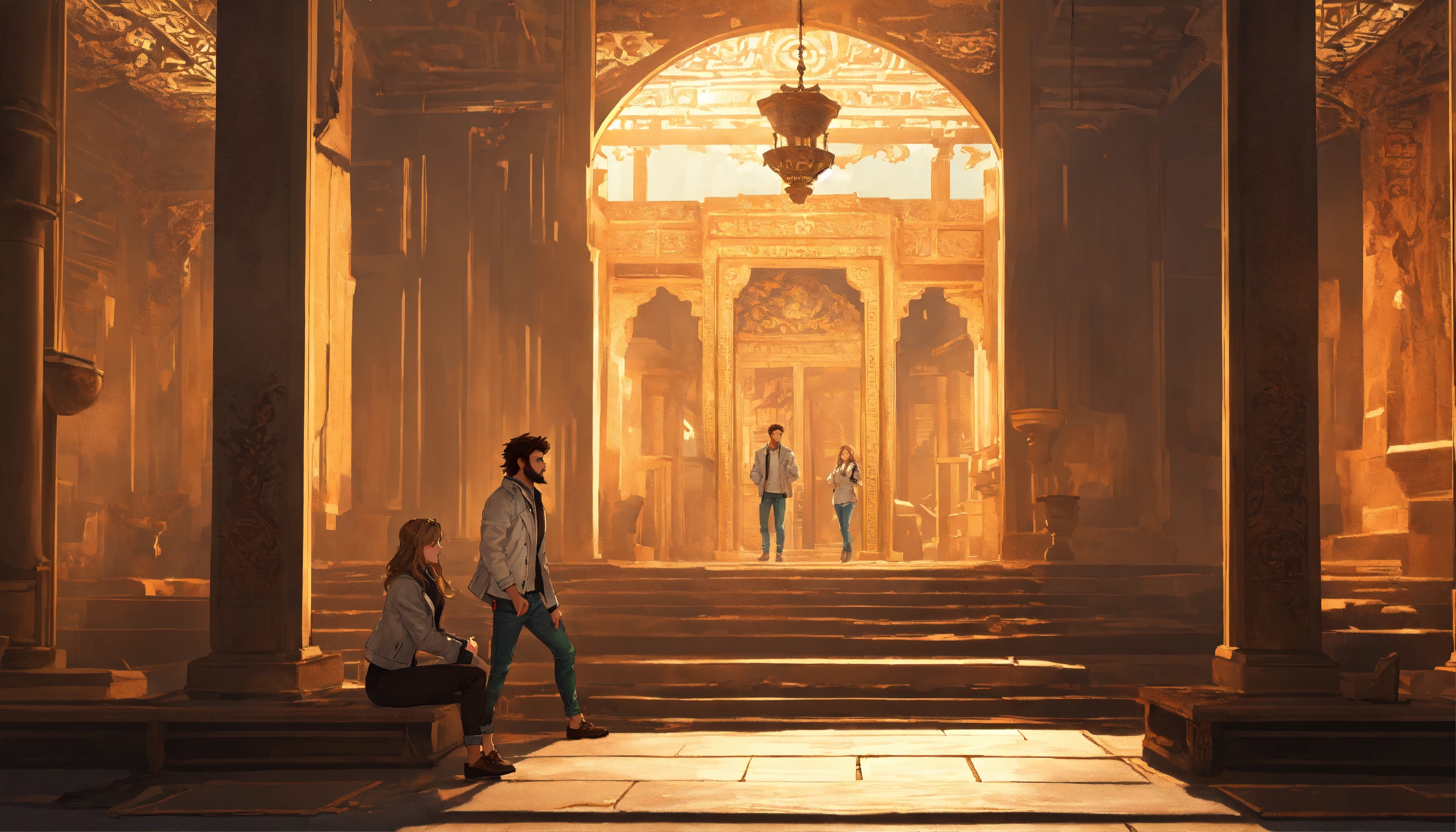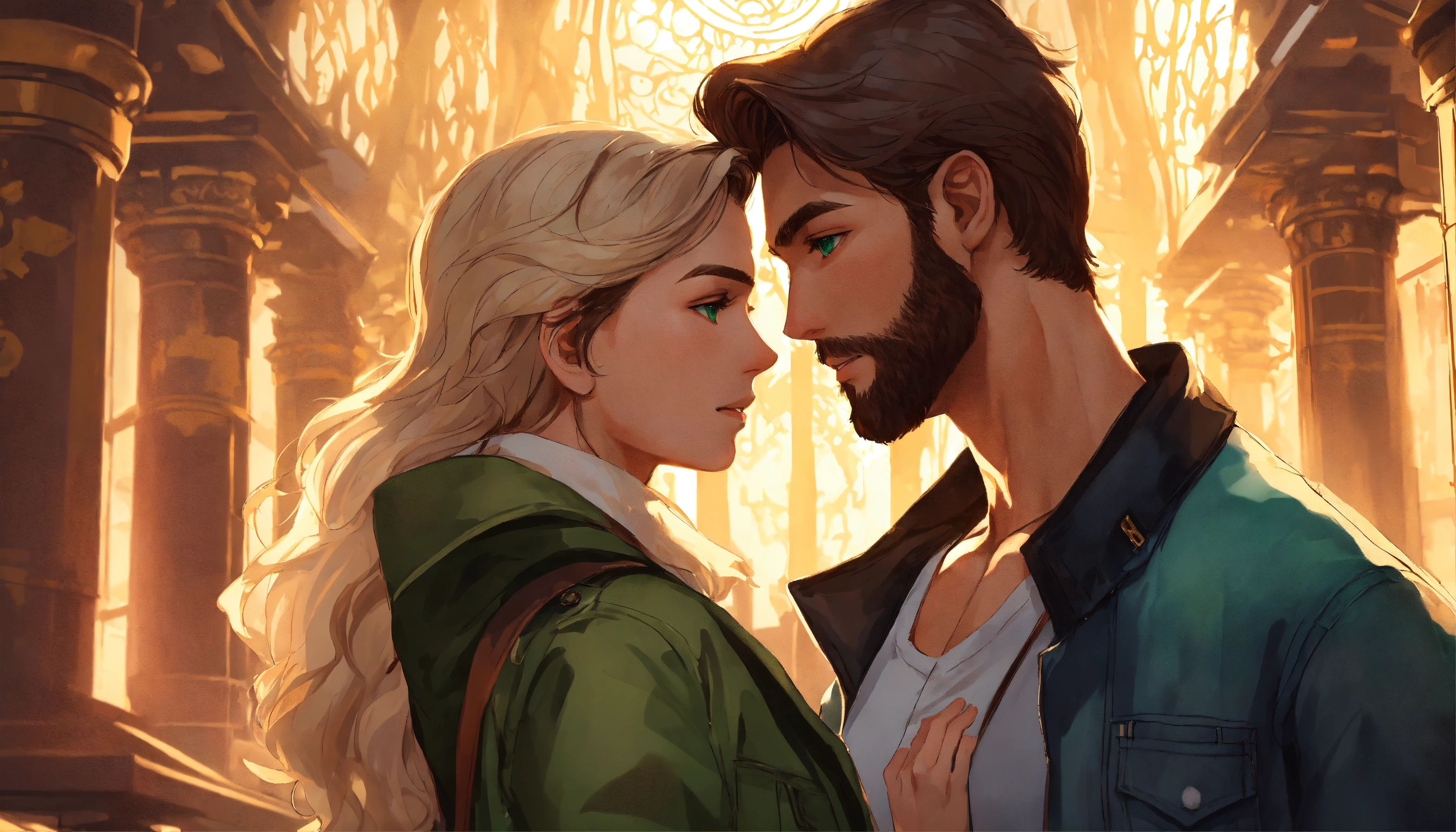 In this particular illustration style, a young man with brown hair, a light thin brown beard, and green eyes with white jacket and jeans and a white woman with blonde hair, blue eyes, and a v-shaped face with black jacket and jeans are inside old broken temple and this entire temple is filled with several types of traps to test their romantic connection