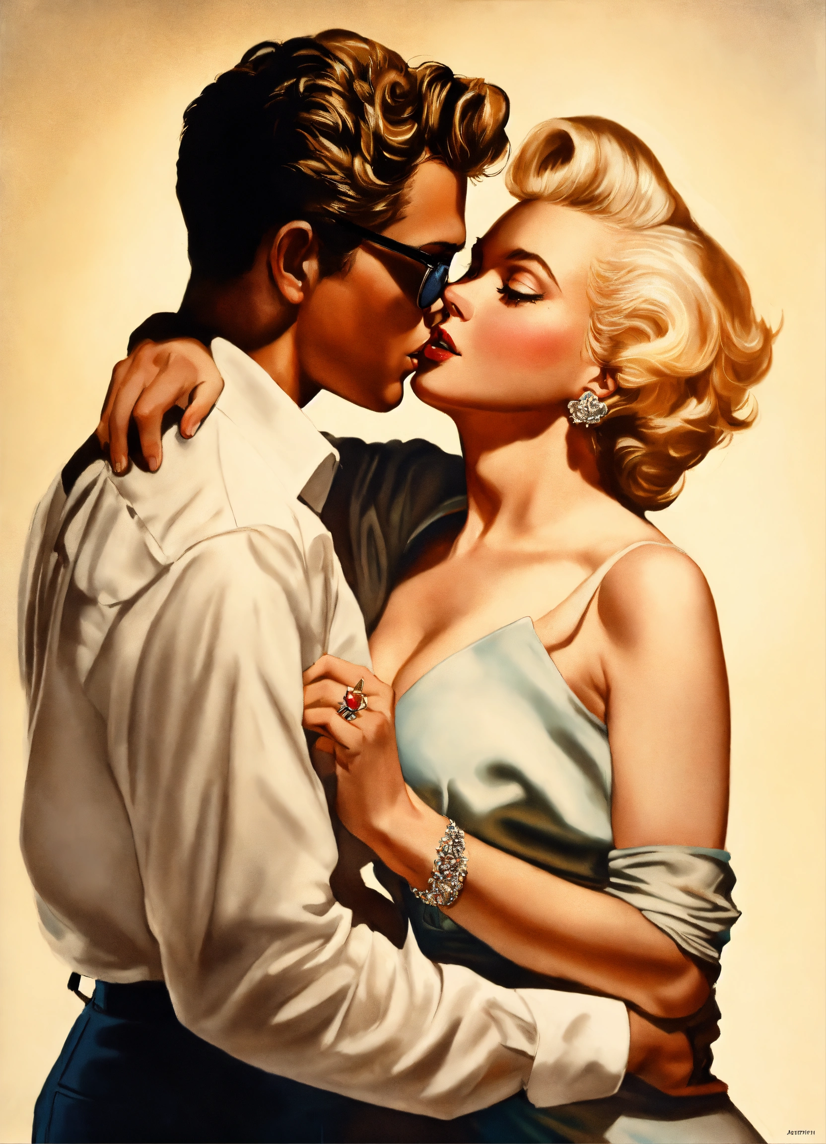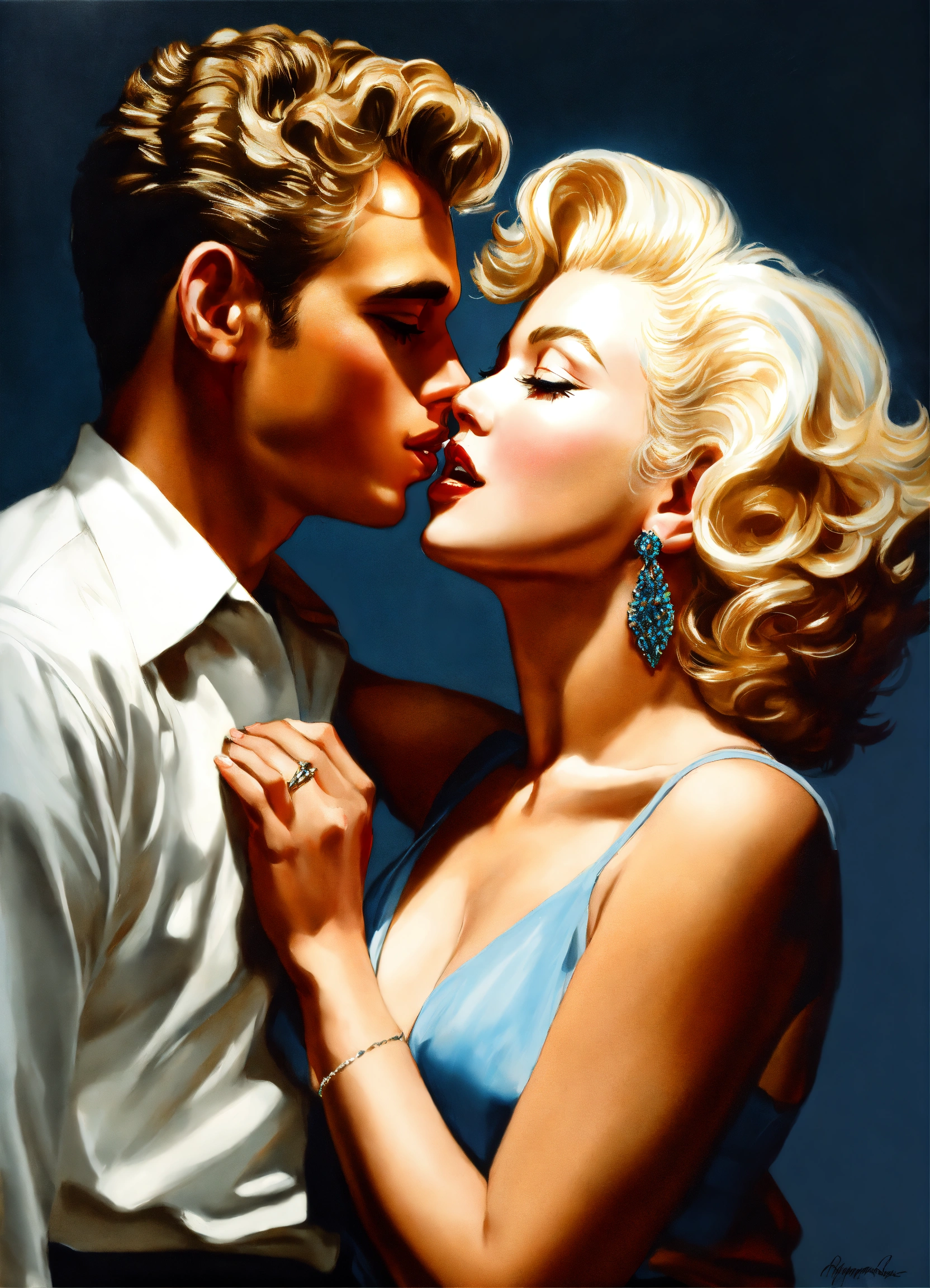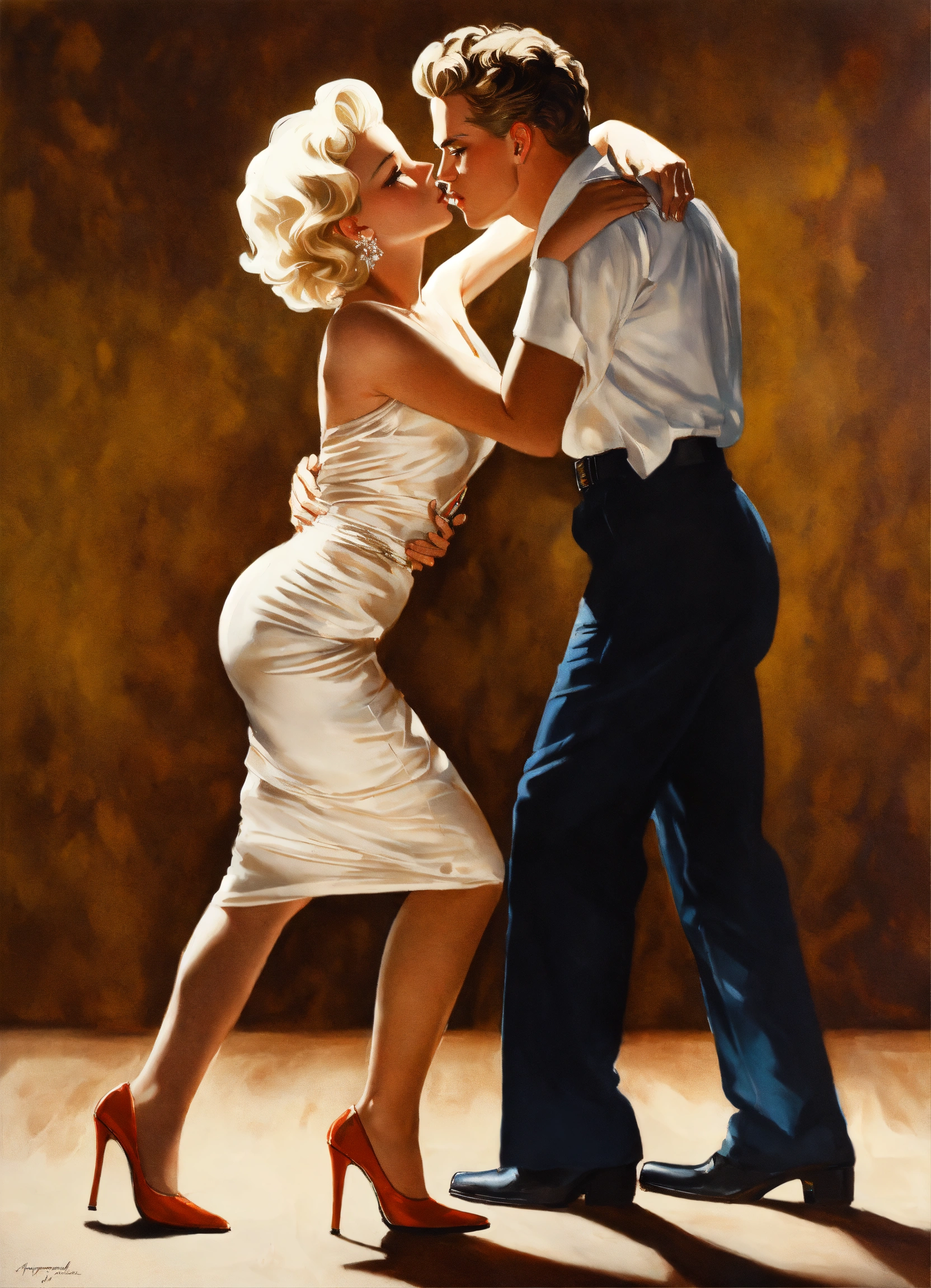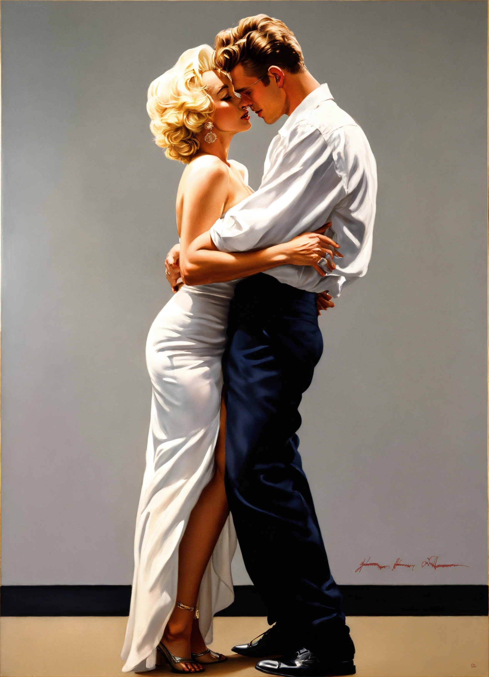 "white background, the first kiss dancing cheek to cheek, perfect, accurate representation of marilyn monroe and james dean" "art by normanr rockwell, hyperrealistic, concept art, full body shot, intricately detailed, color depth, dramatic, side light, plain white solid background"