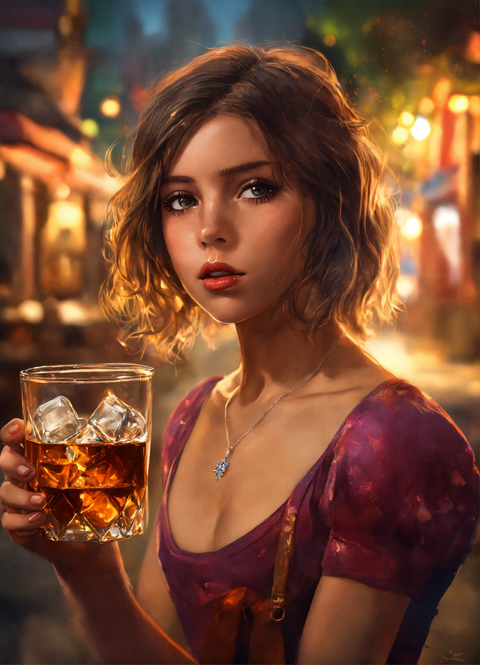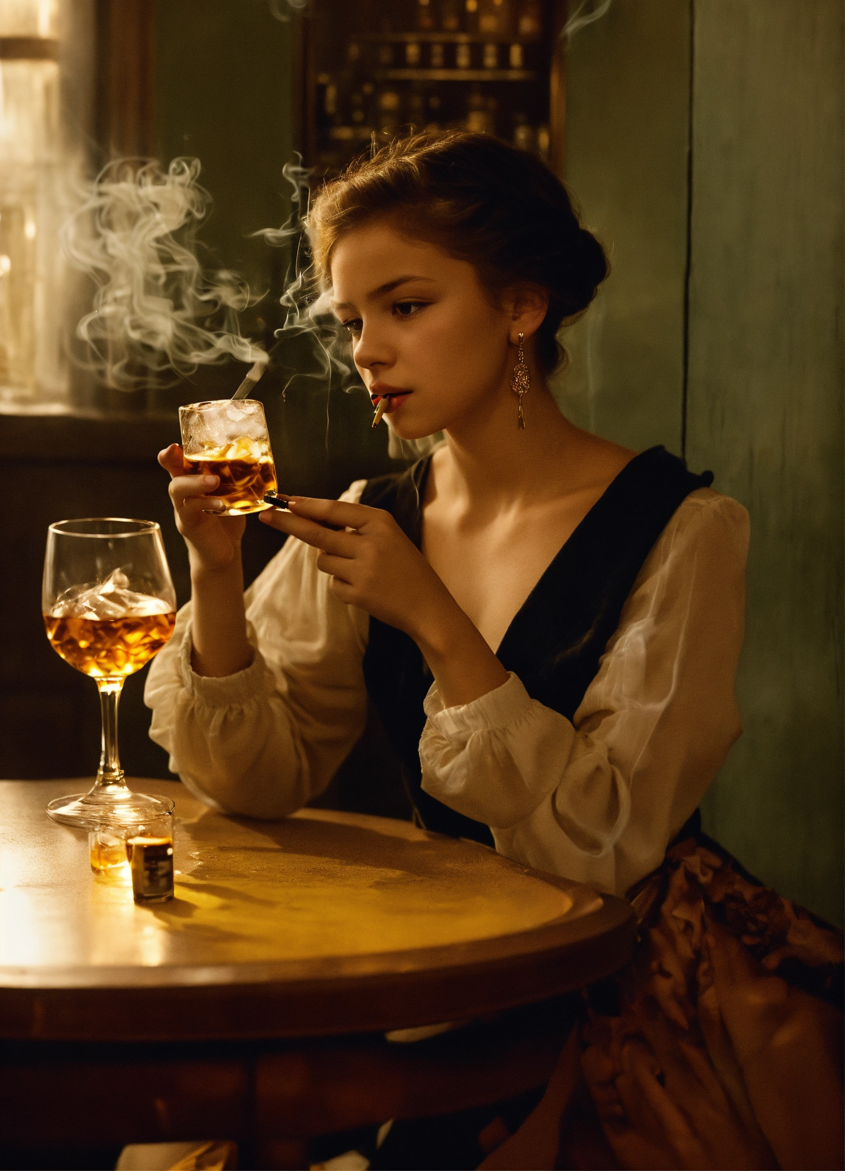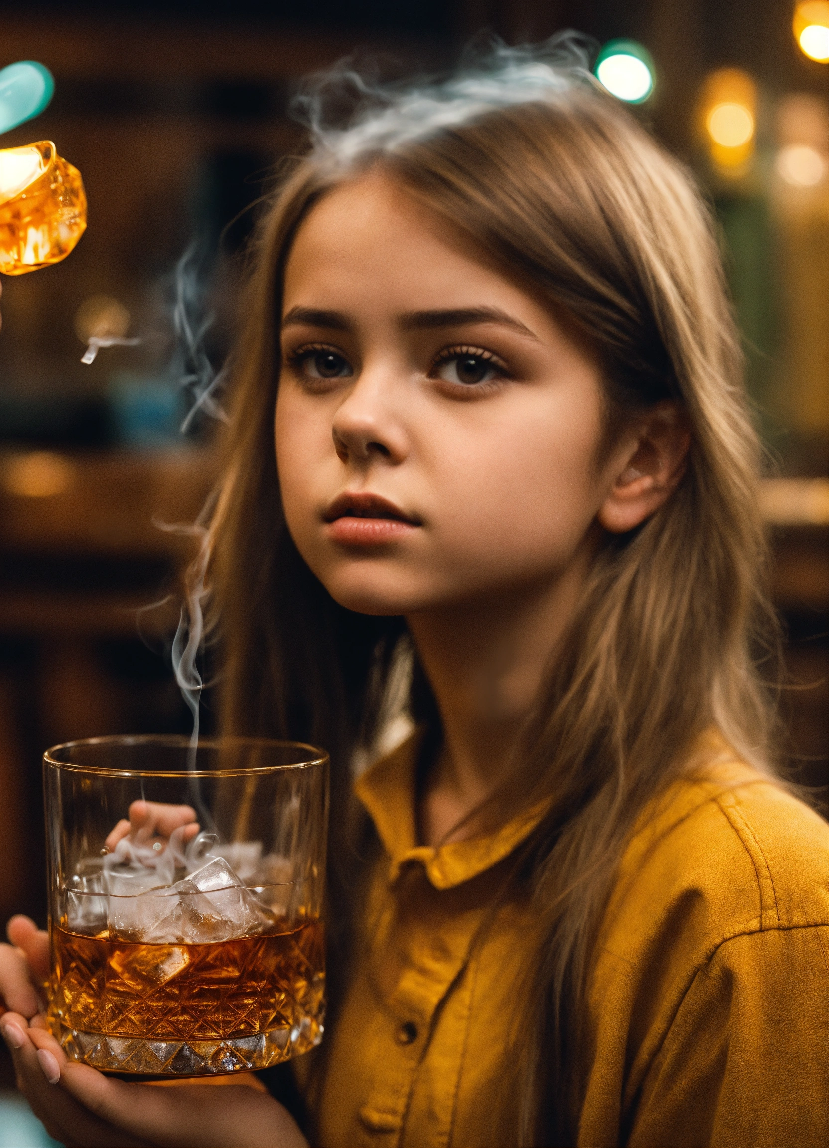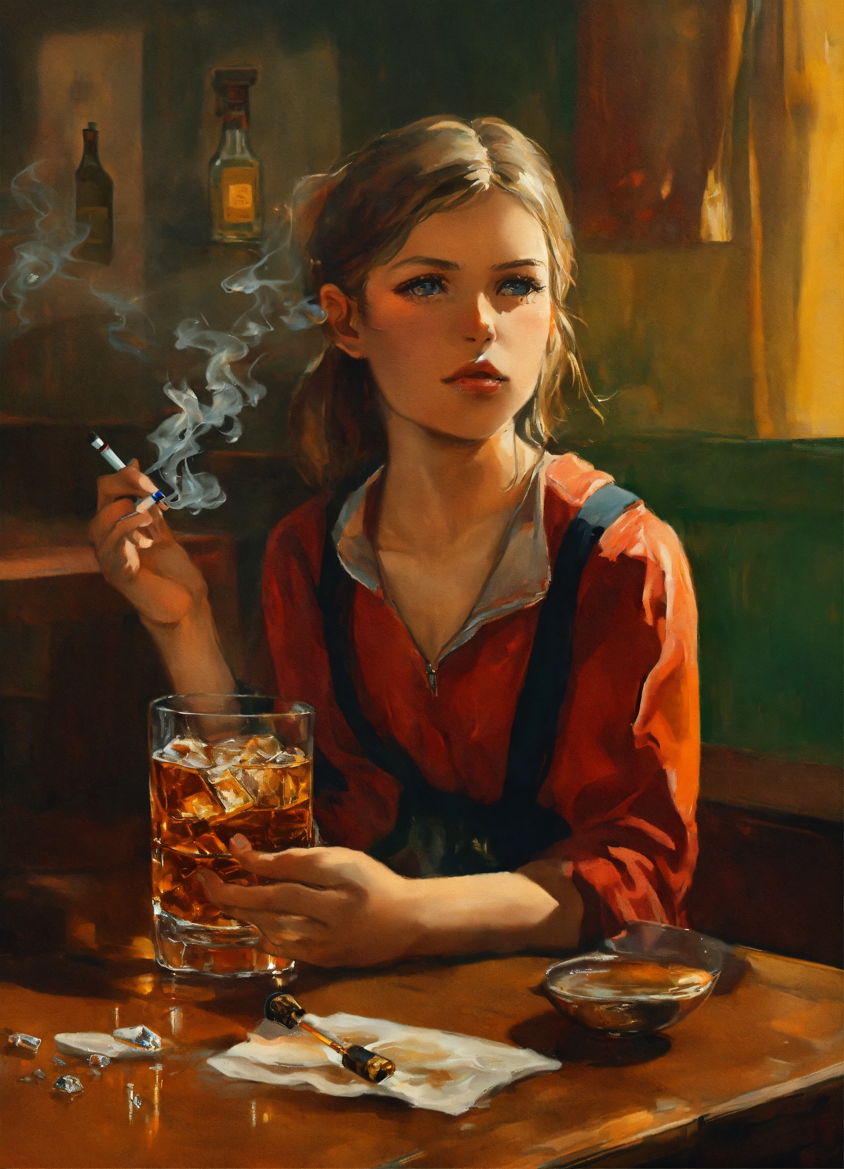 A young girl with a cheeky look of disdain on her face. in one hand the girl has a smoking cigarette. in her other hand, a glass of whiskey with ice.