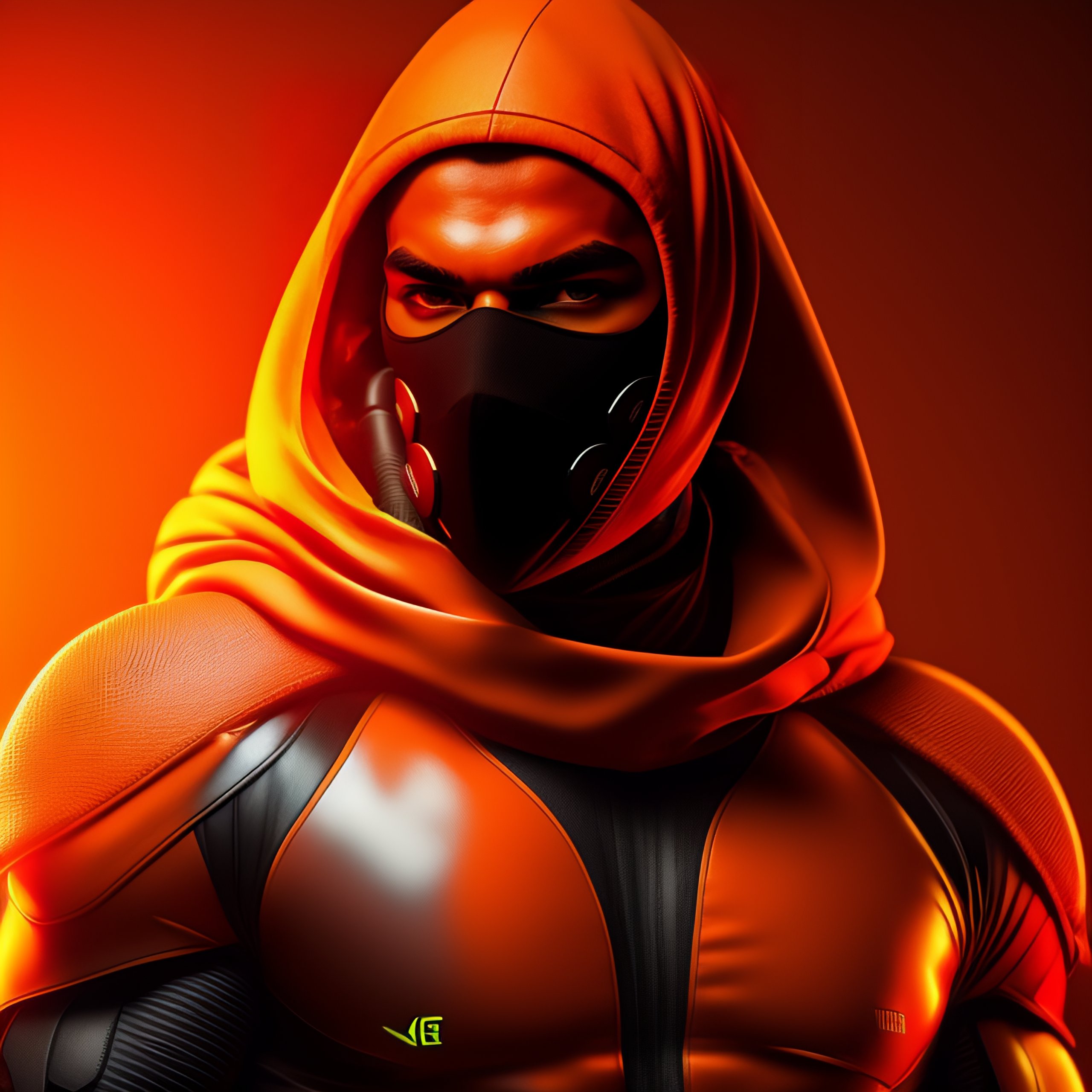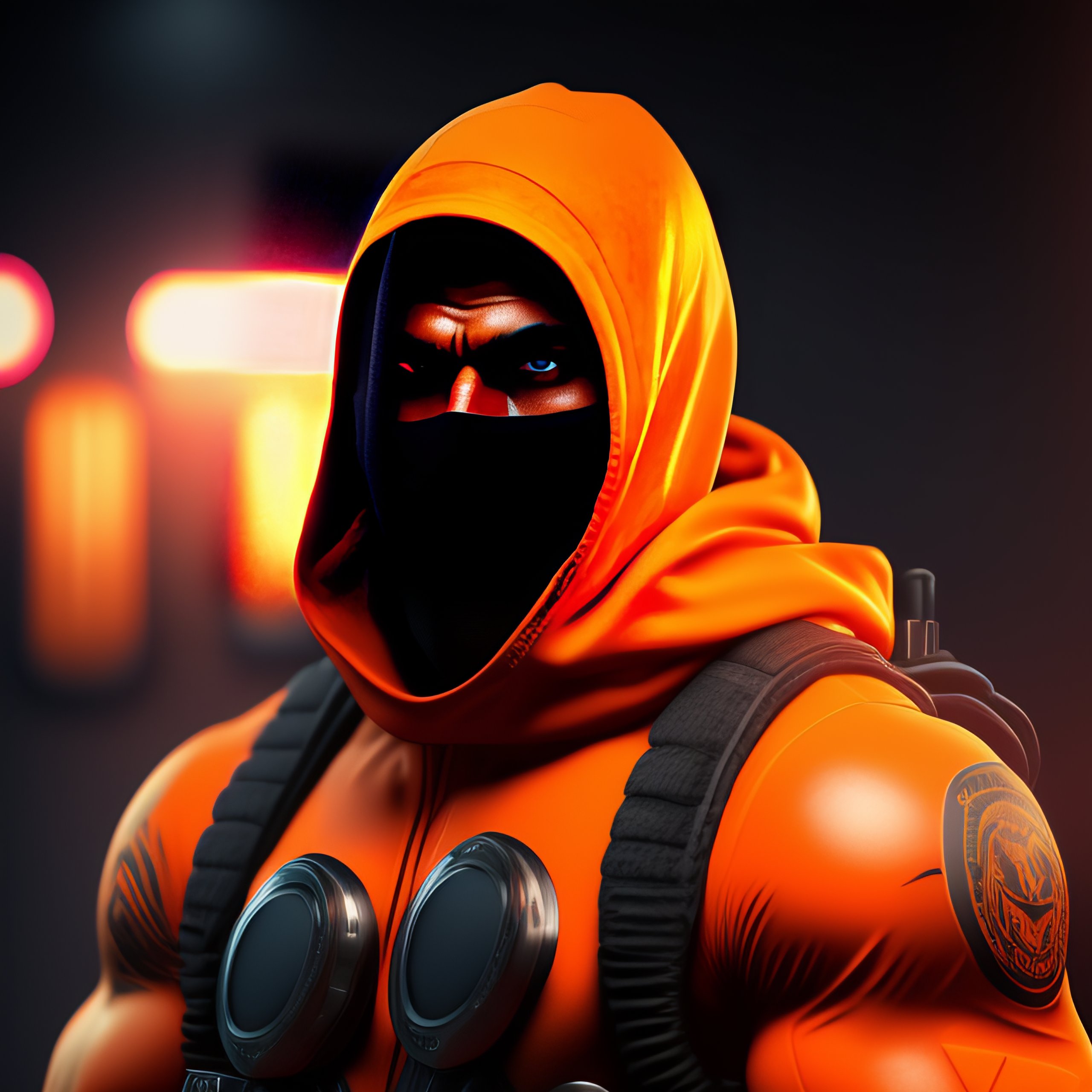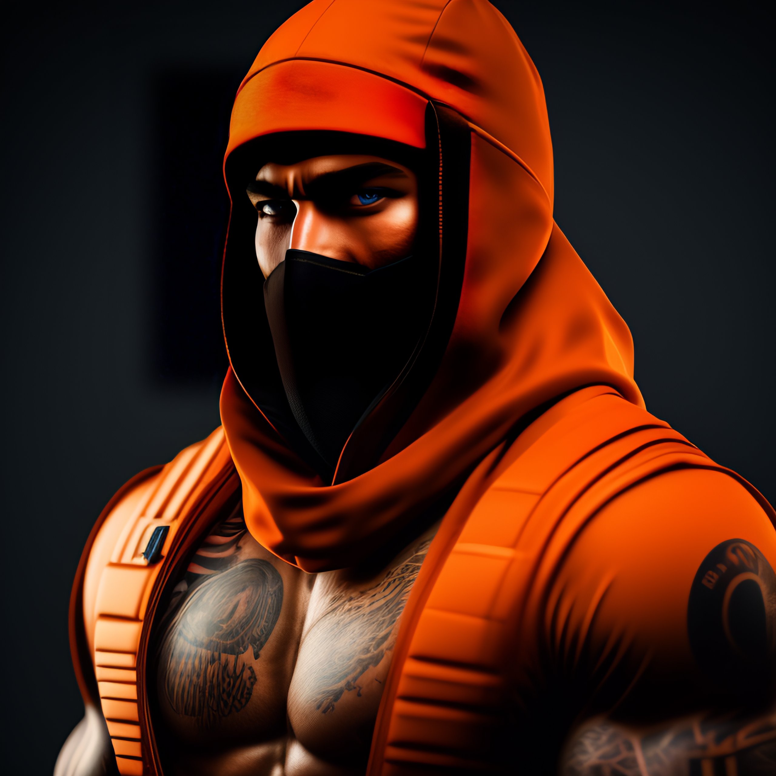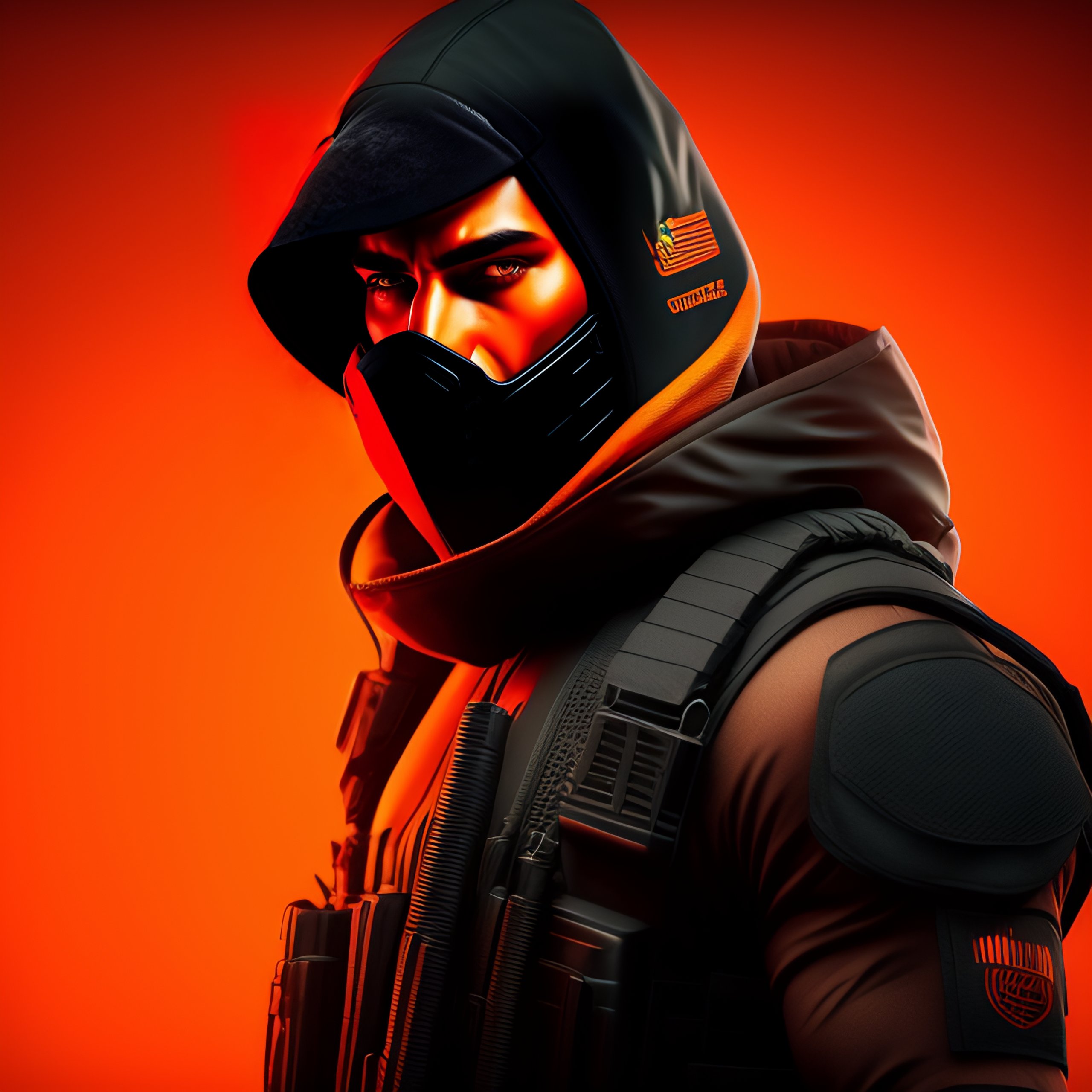 Cs-go muscular terrorist man, using balaclava, tattoos in the body, hollographic orange details color, knolling layout, highly detailed, depth, lumen render, 8k