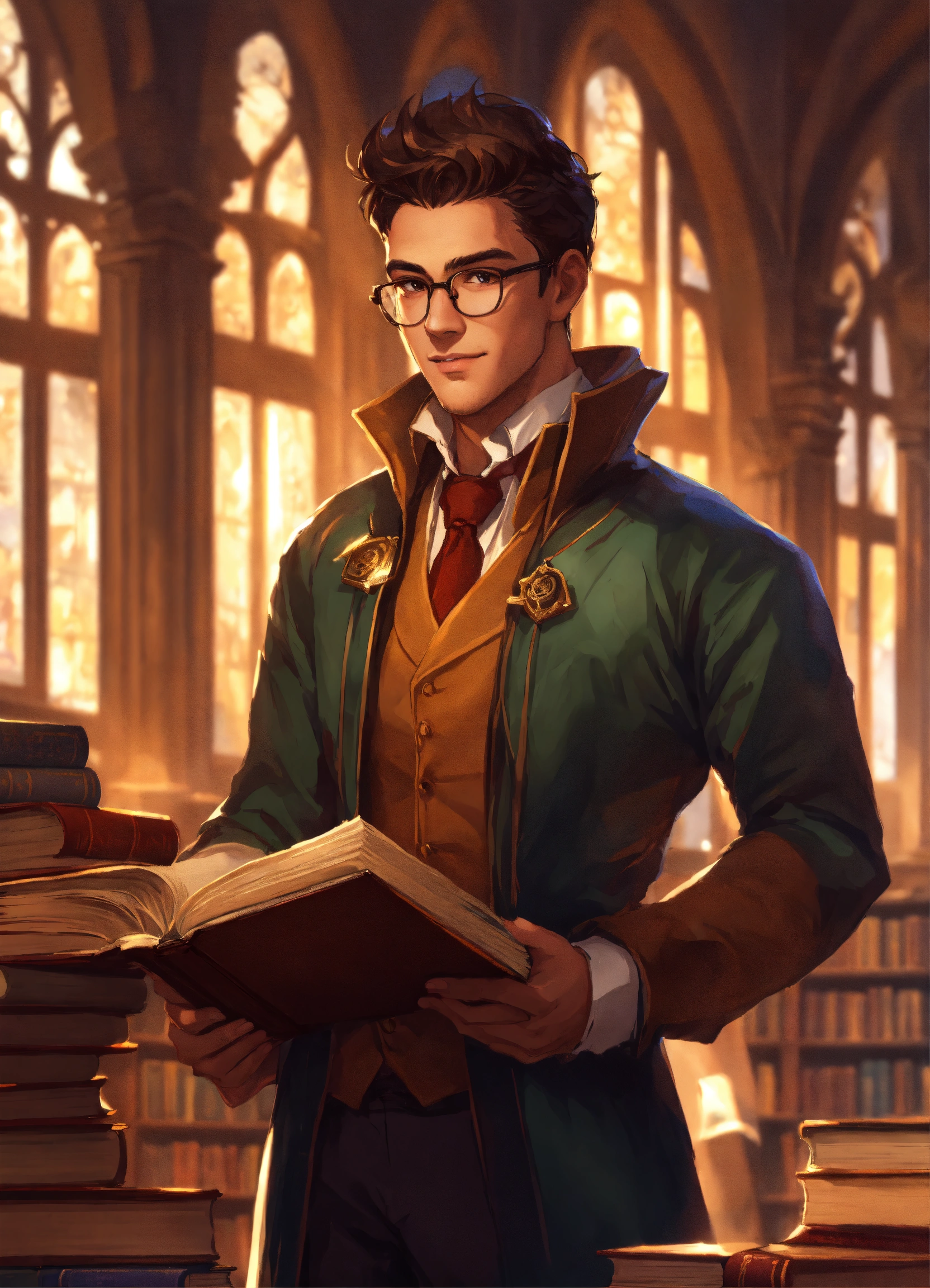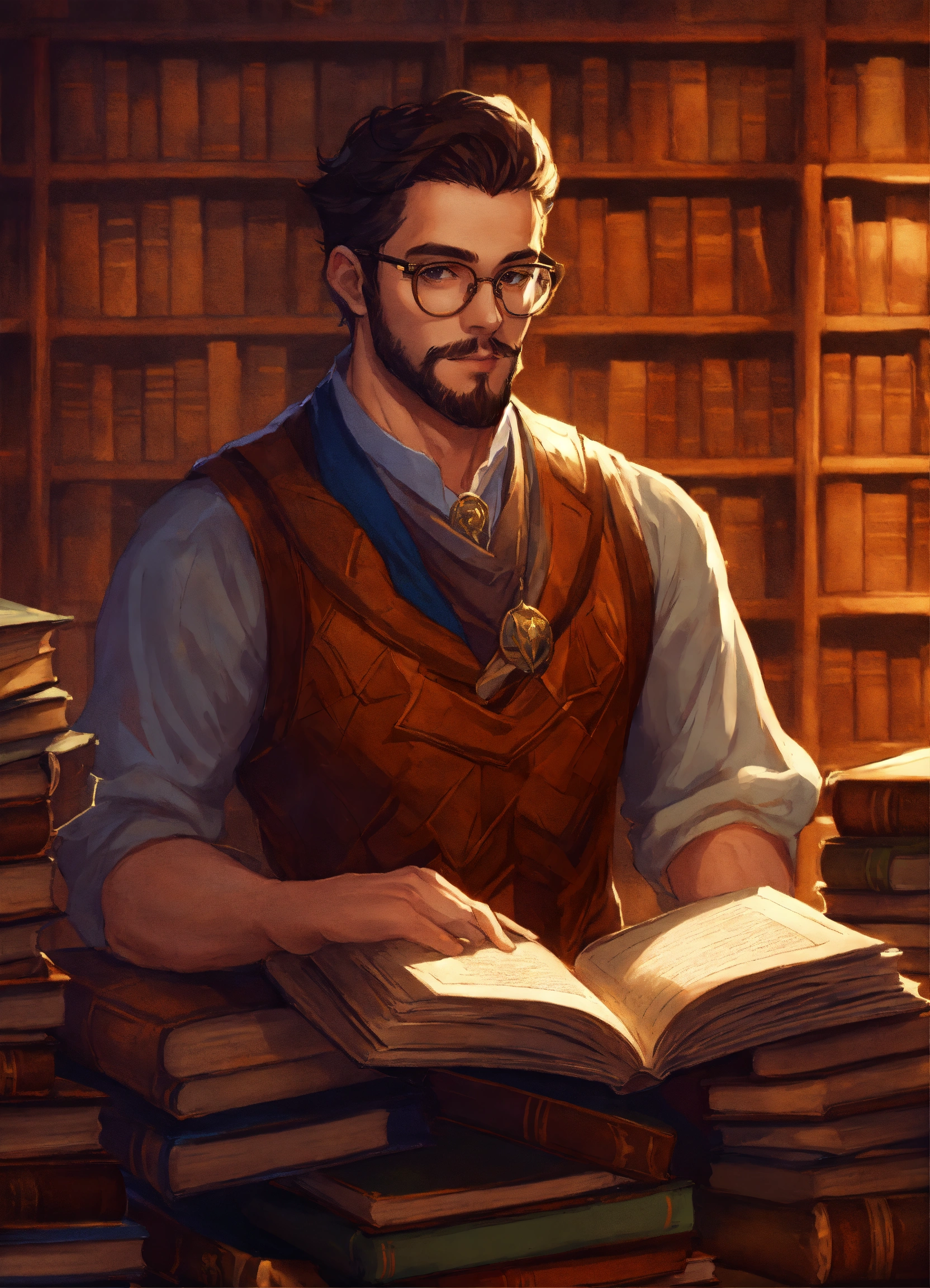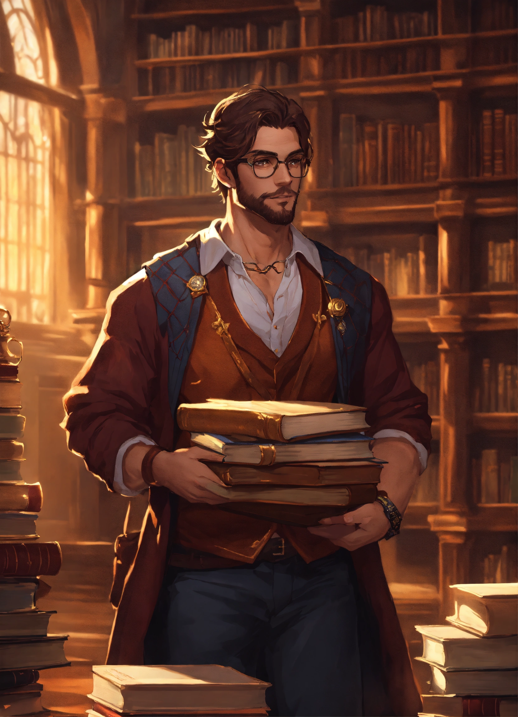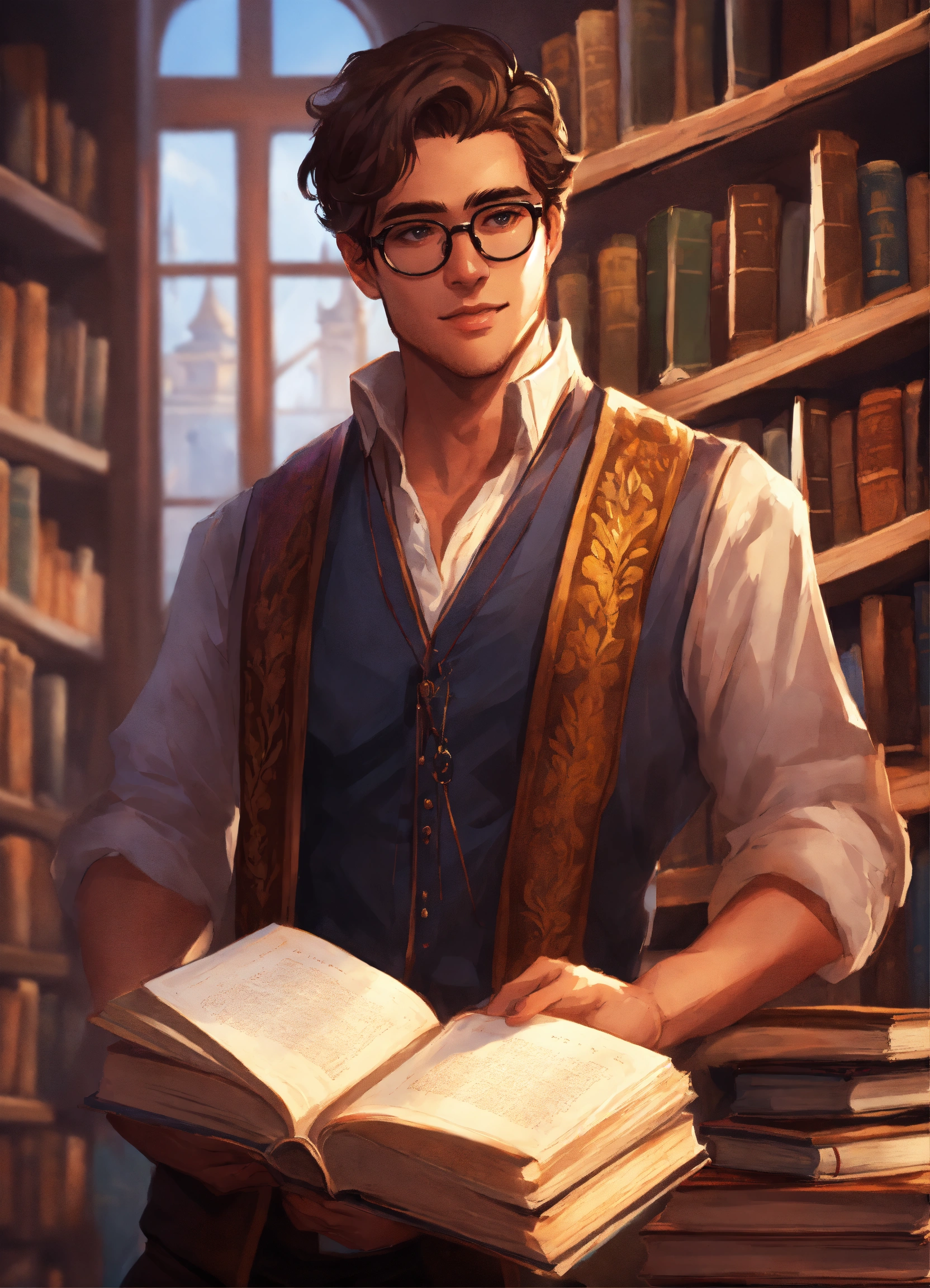 A handsome scholar with glasses holding a stack of books in a library dnd character art