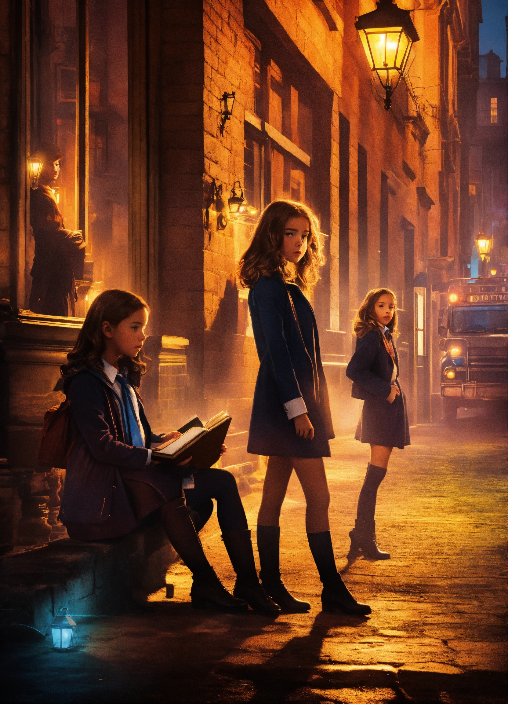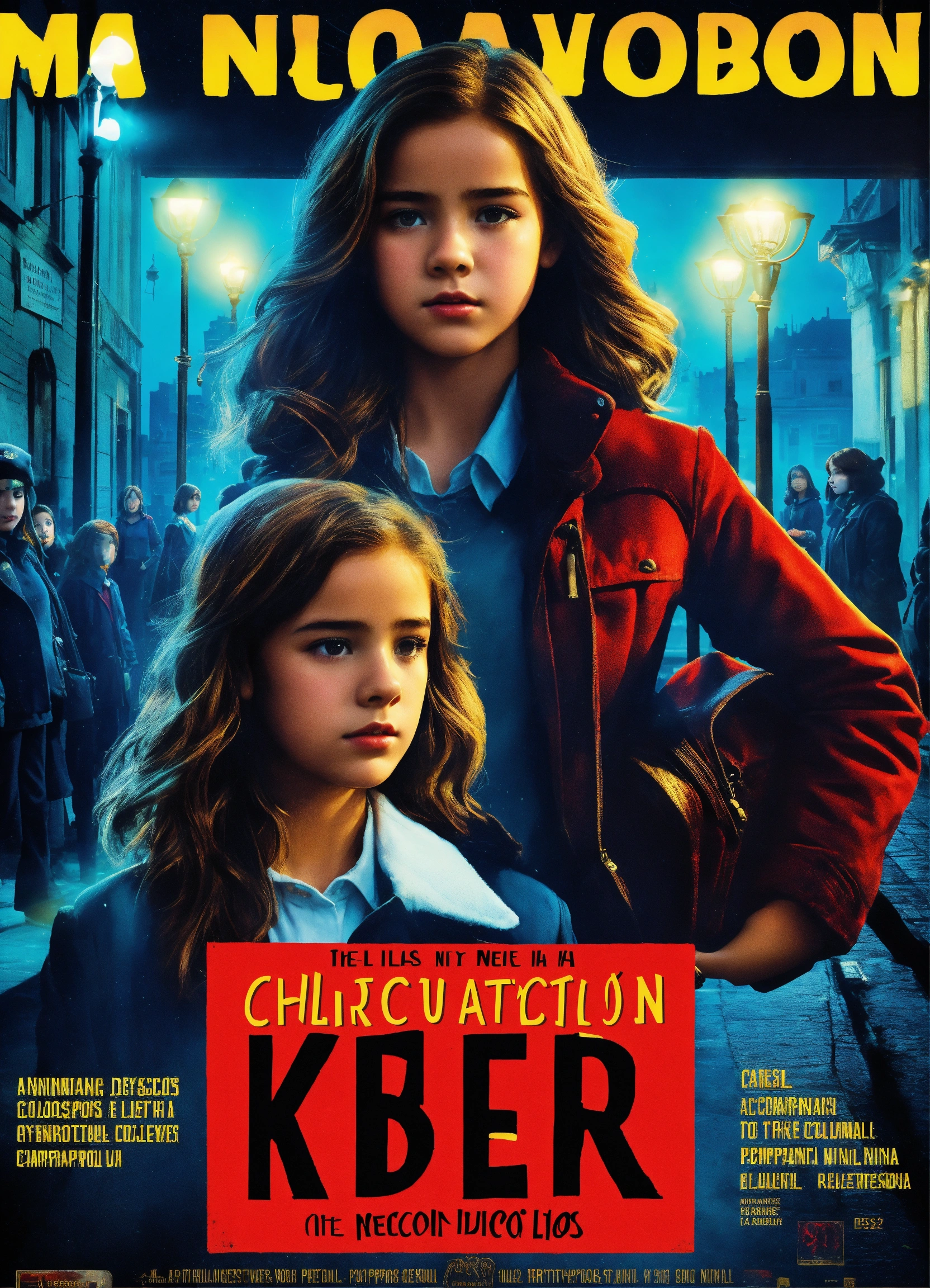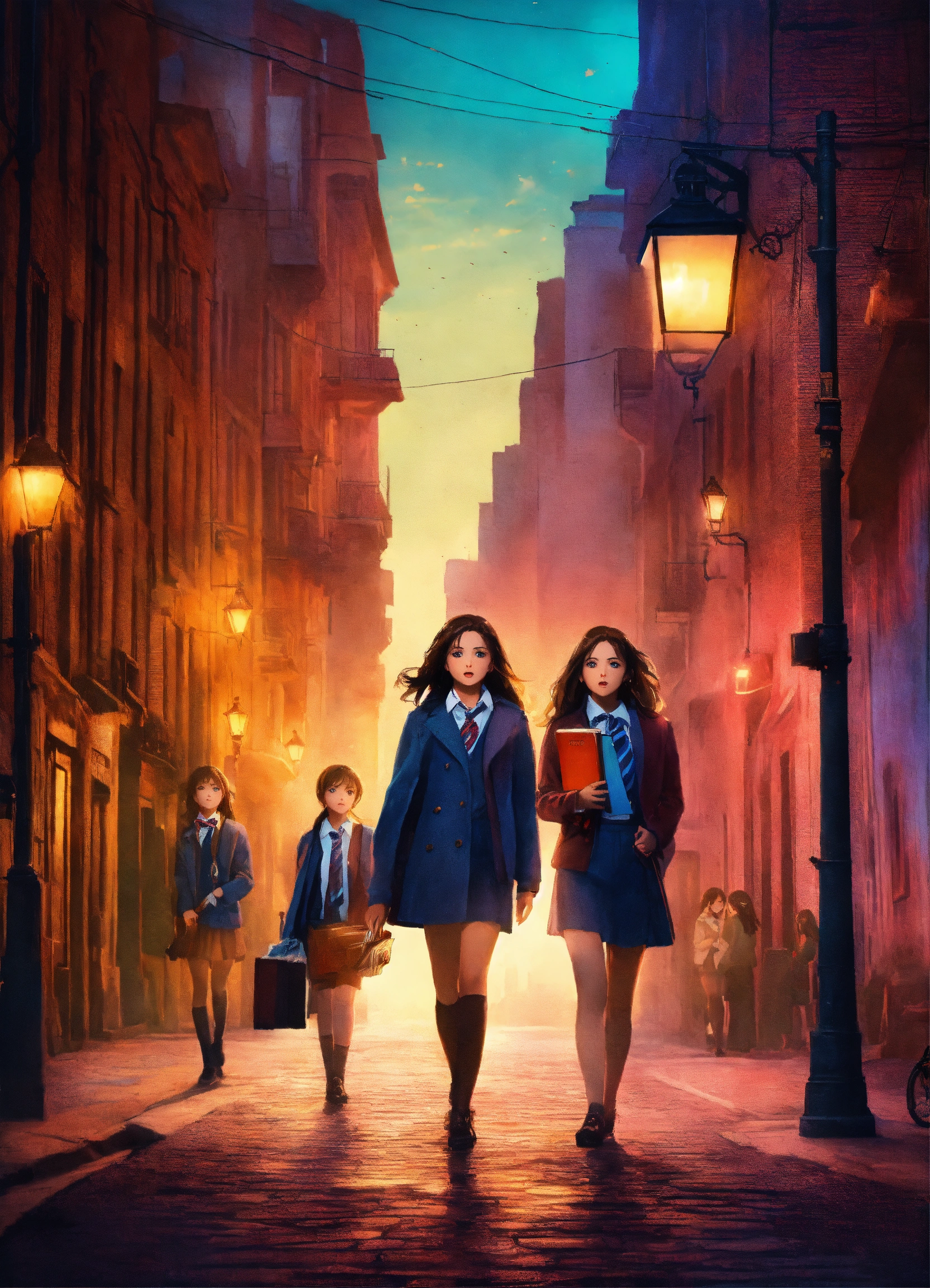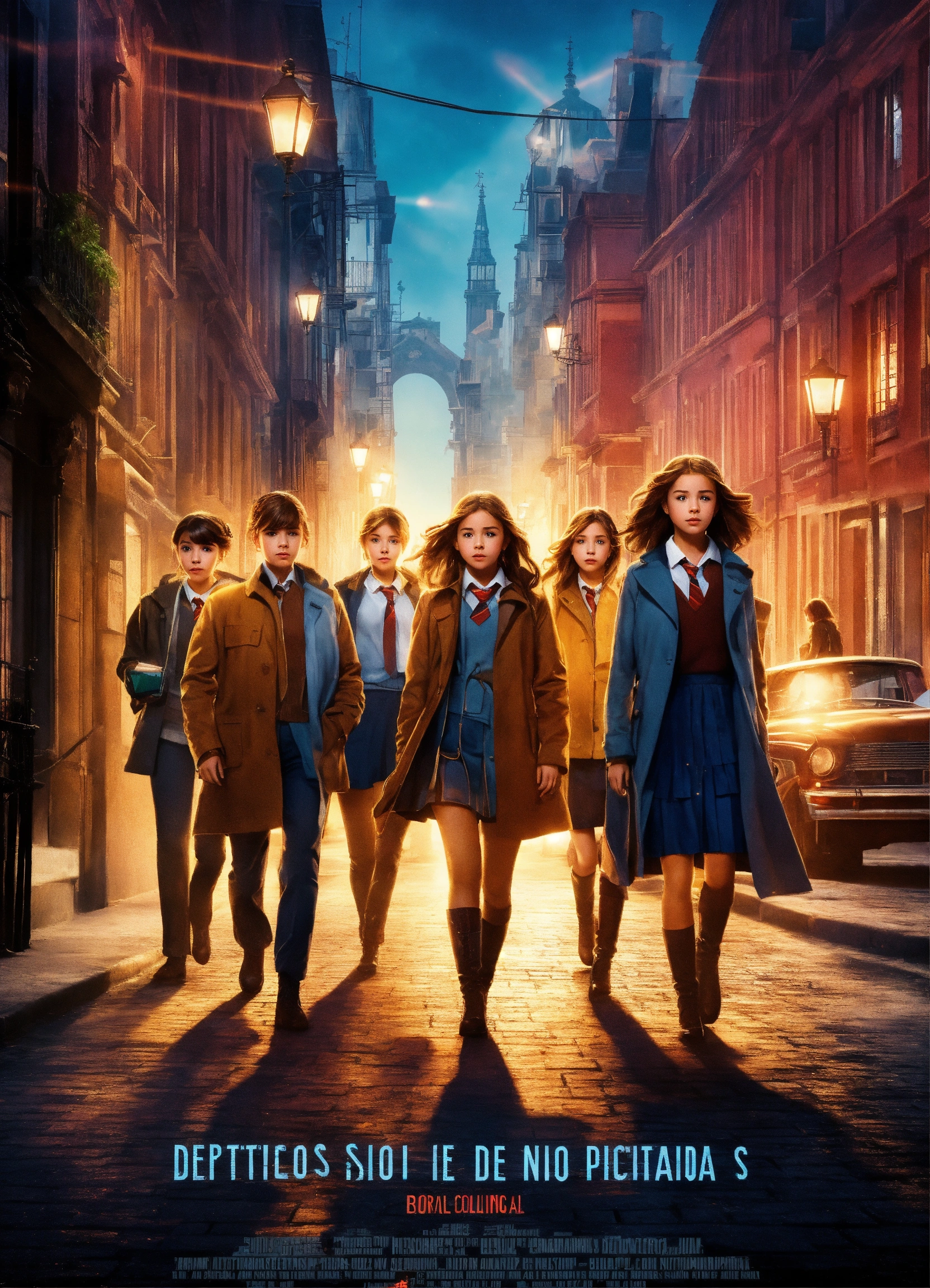 Estilo portada de película de detectives, cuatro estudiantes de colegio acompañada de una niña, caminan en la ciudad, luces neón, tres son chicas y dos son chicos, para portada de libro de detectives y espionaje. rostros nítidos y precisos.