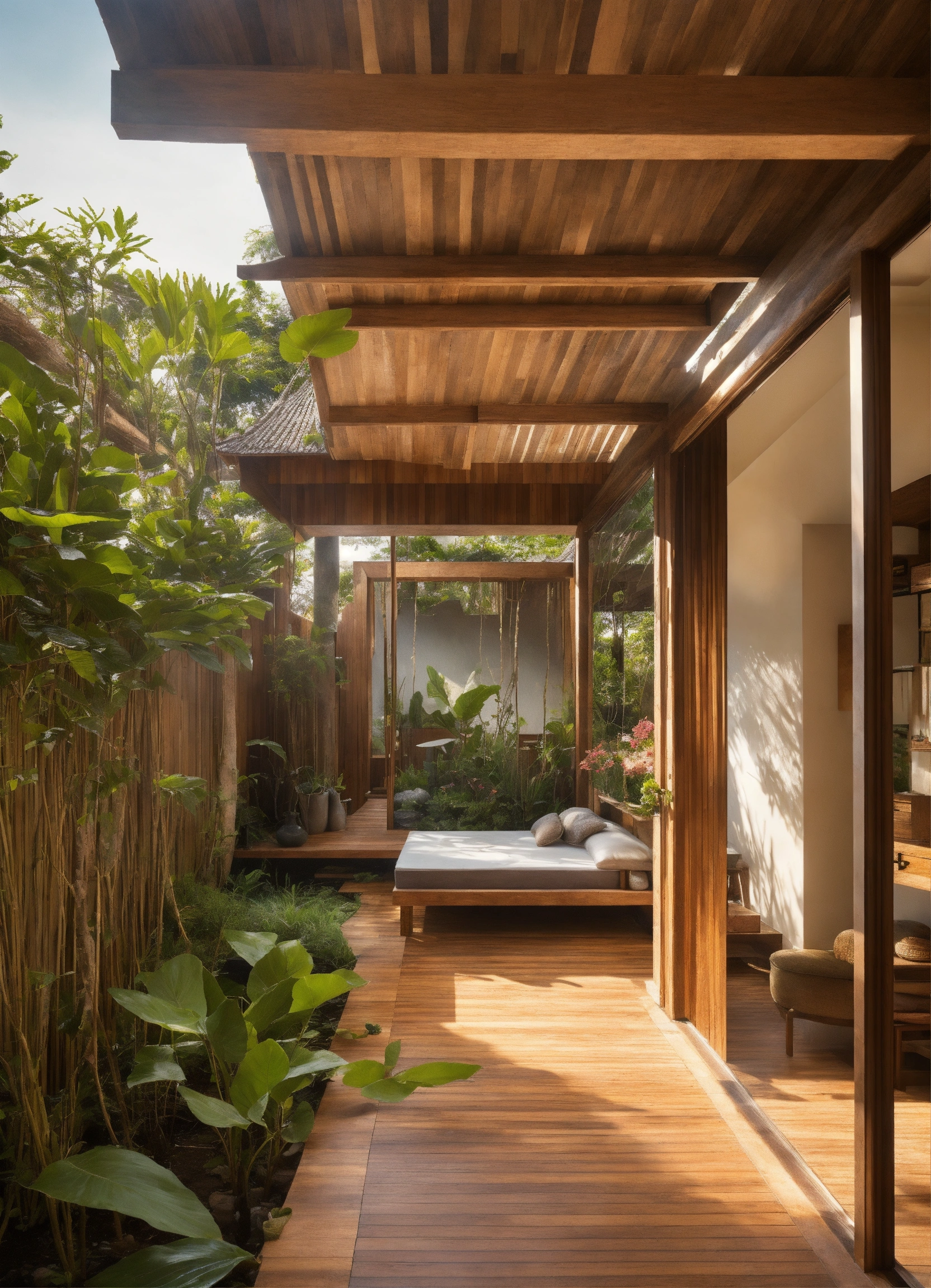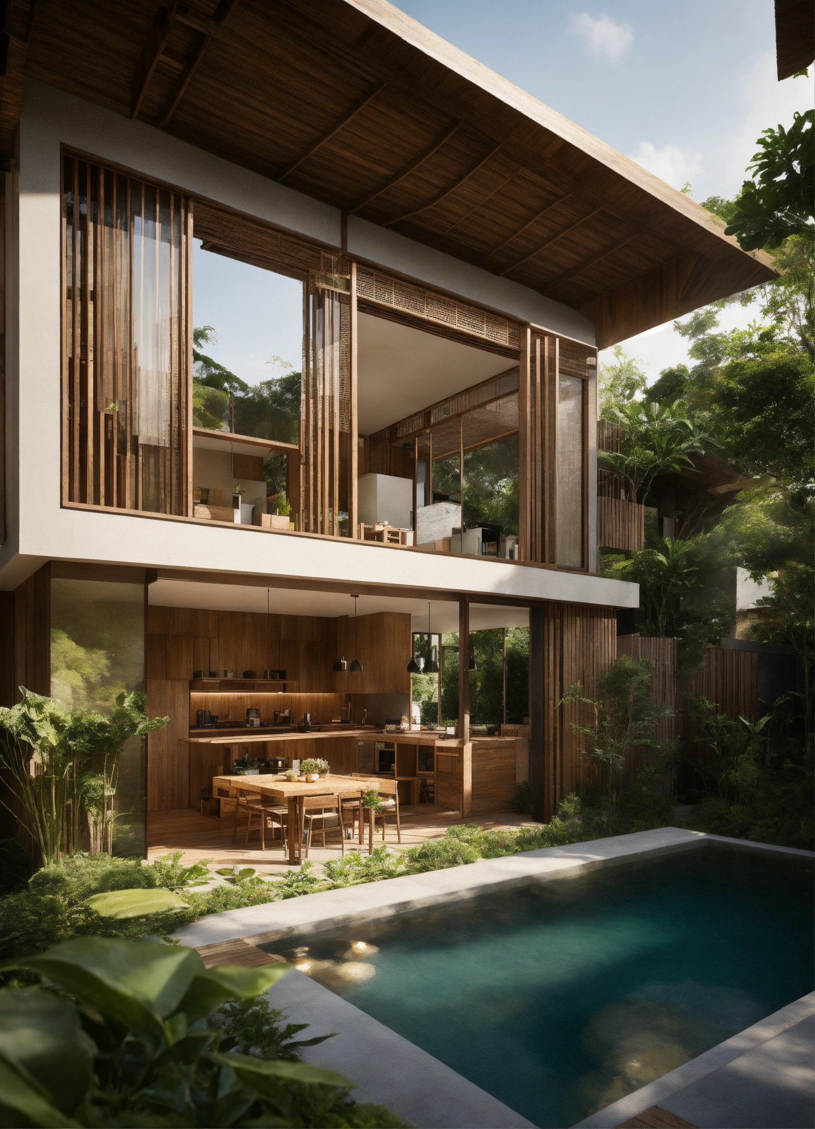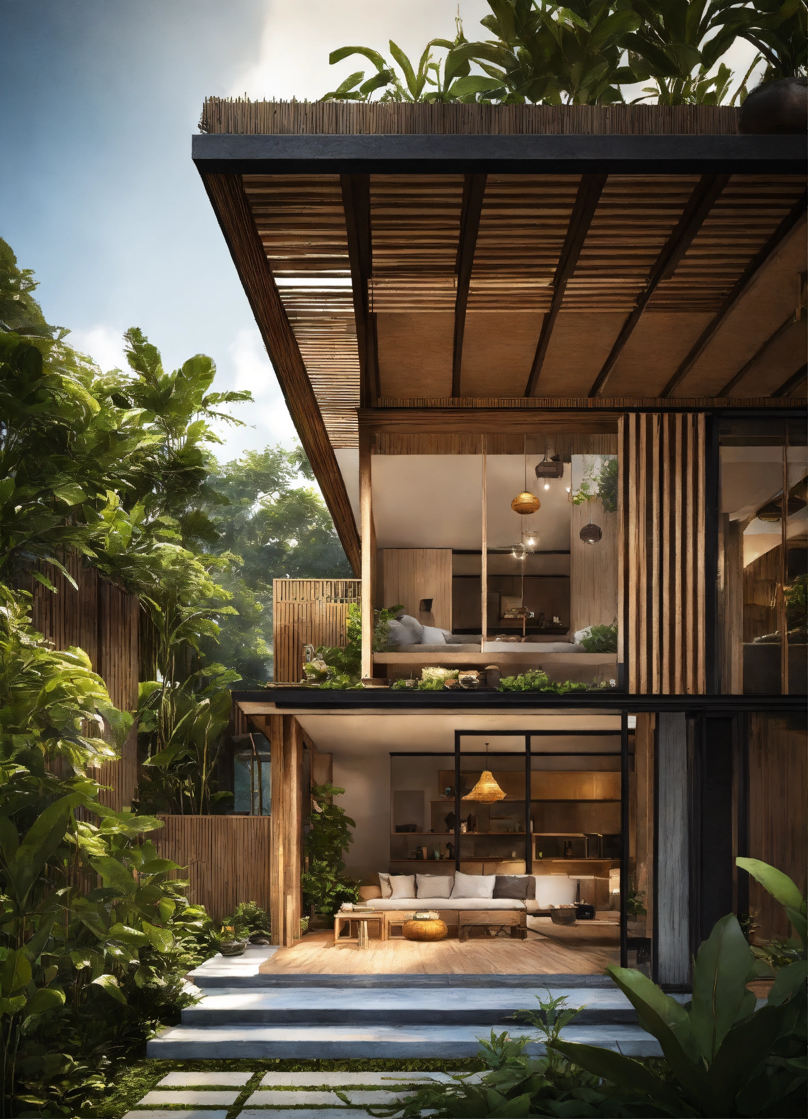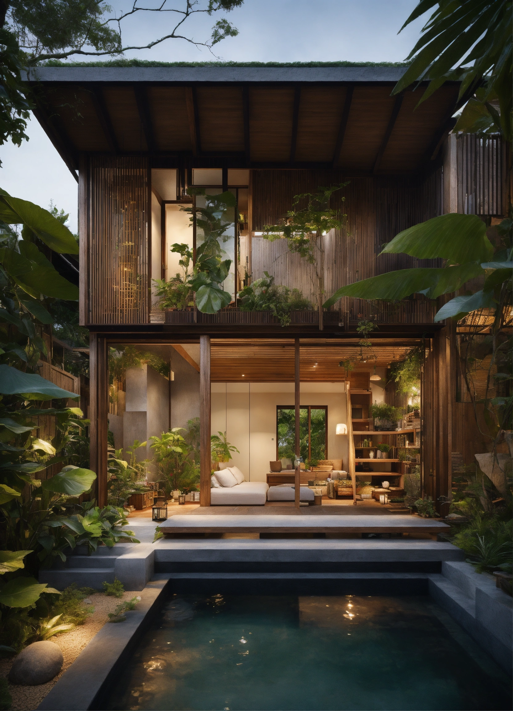 An image of a serene and sustainable small urban architectural project. in the middle of a coty. it should feature elements of balinese architecture style, such as natural materials, open spaces, glass, lots of vegettion and a connection with nature. small home. show neighbours