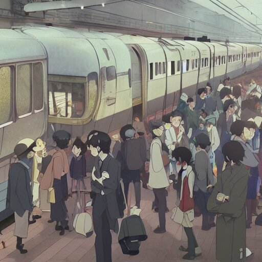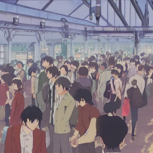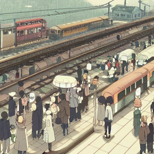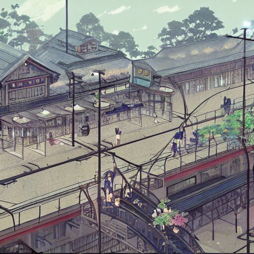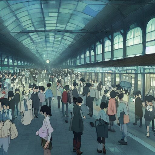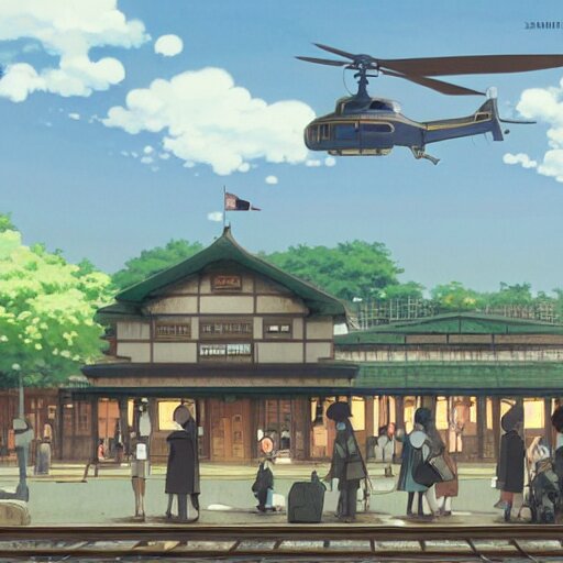 A crowded old train station, in which instead of trains there are helicopters, by dice tsutsumi, makoto shinkai, studio ghibli