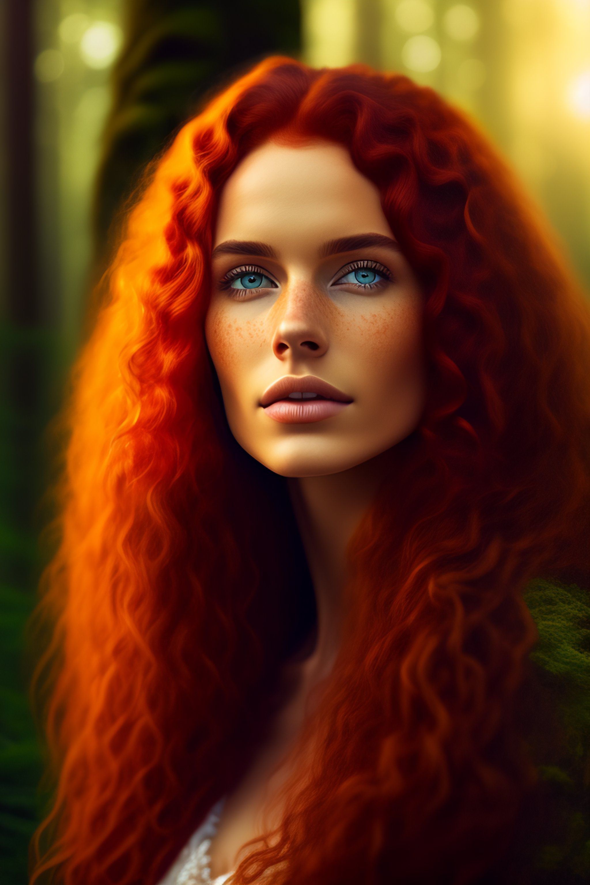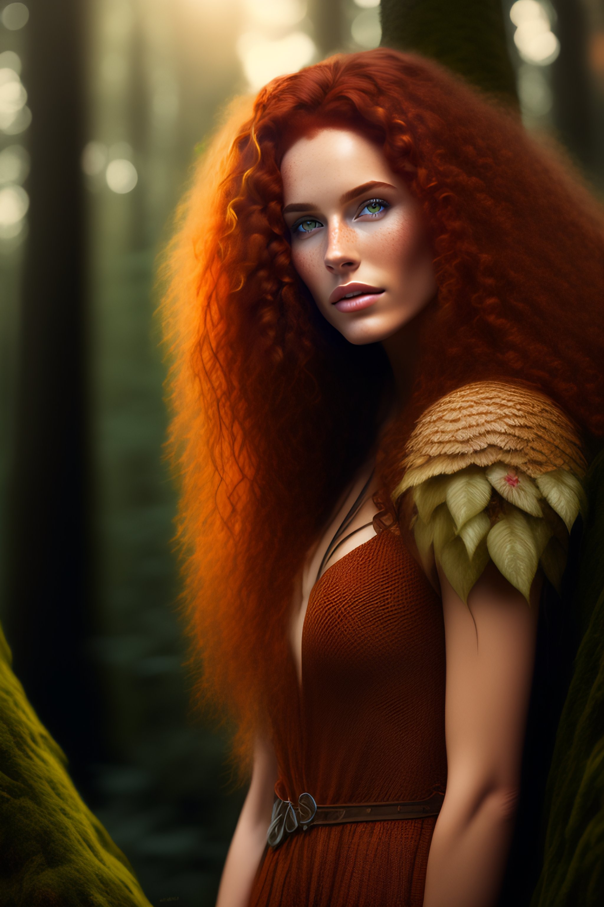 Brunette, wild hair, long curly red hair, ivory fair skinned, exotic, freckles, forest woman, 8k, hyperdetailed, photo realistic, hd, blurry background, intricate, beautiful