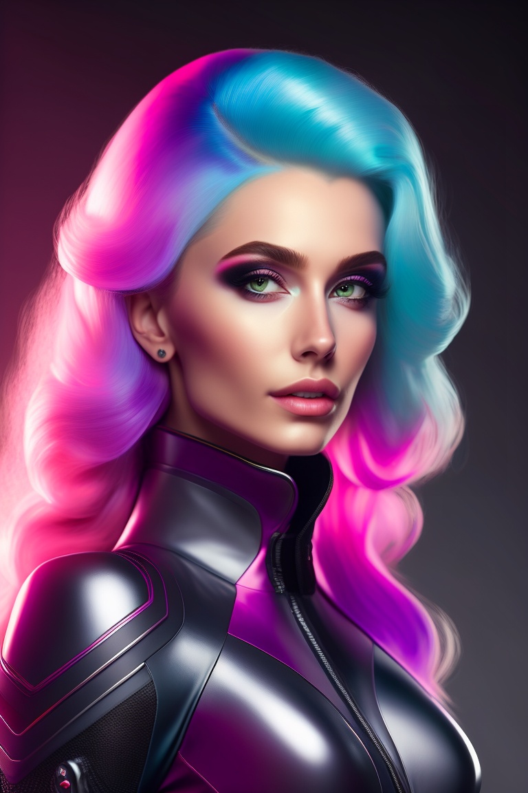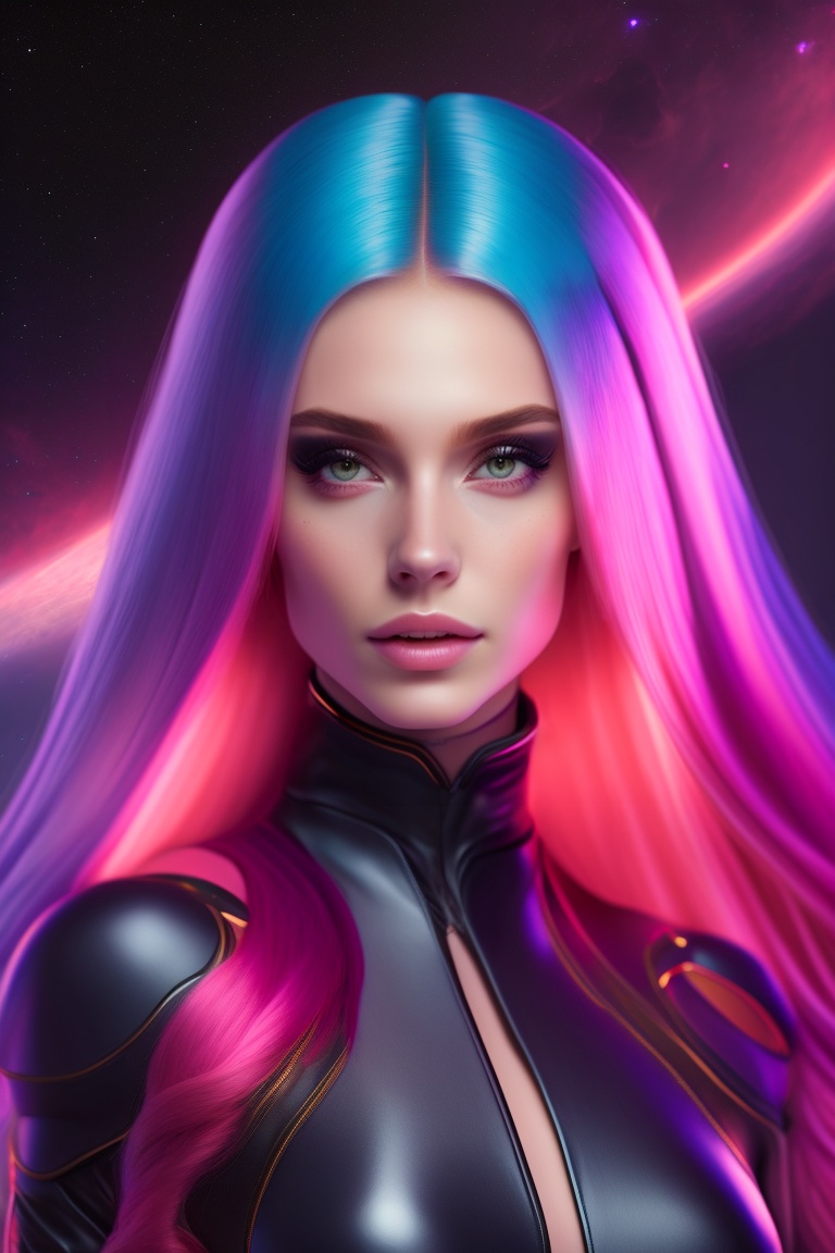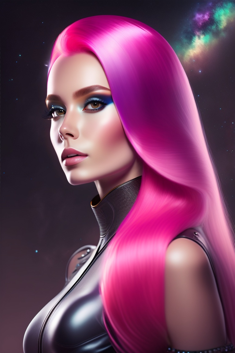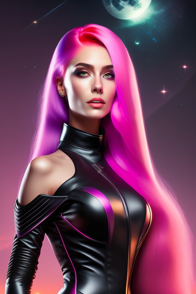 Beautiful alien girl, with long pink hair, in a black latex suit distant portrait, against the backdrop of space