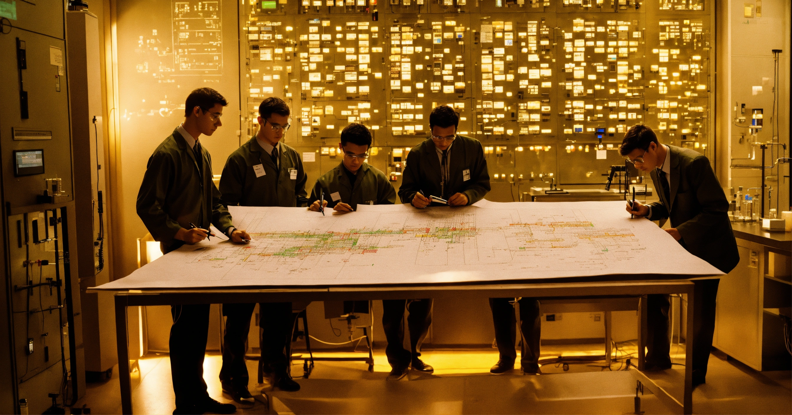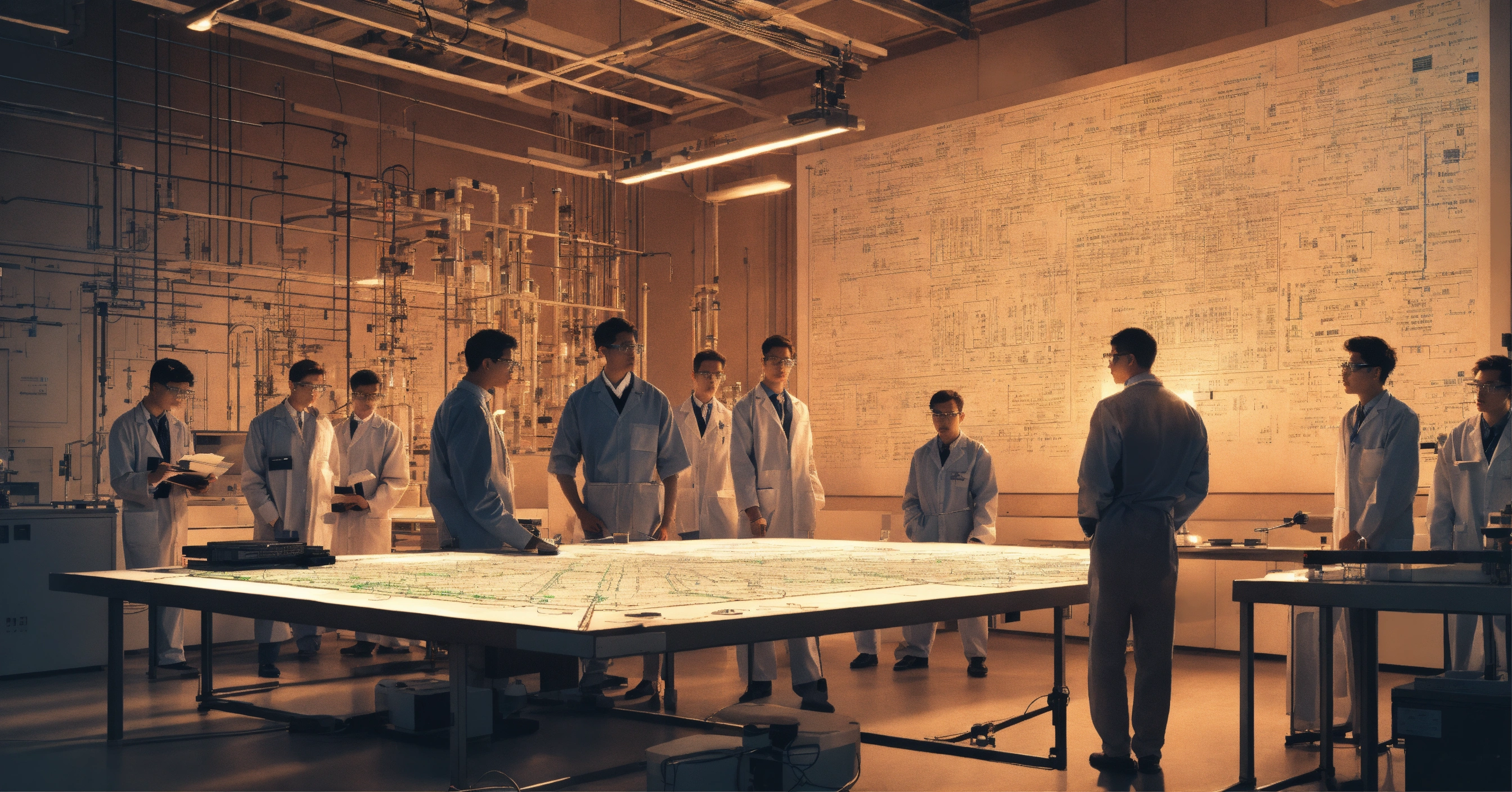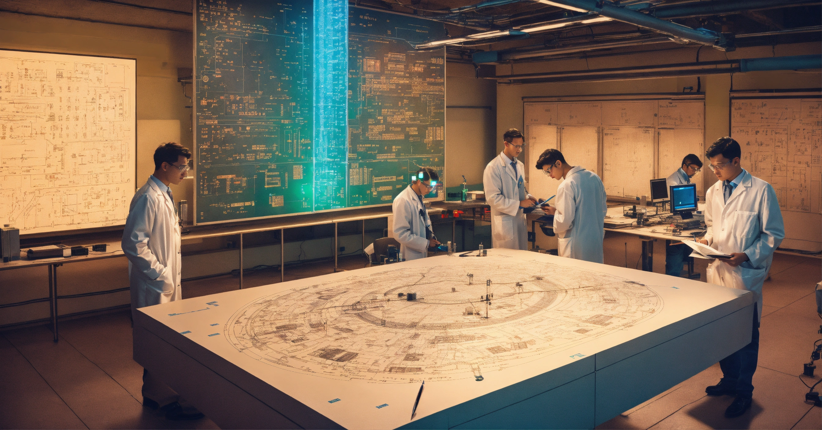 A team of 5 men standing on a paper carrying a huge pen and writing on it, surrounded by a laboratory, formulas, computer code symbols and circuits