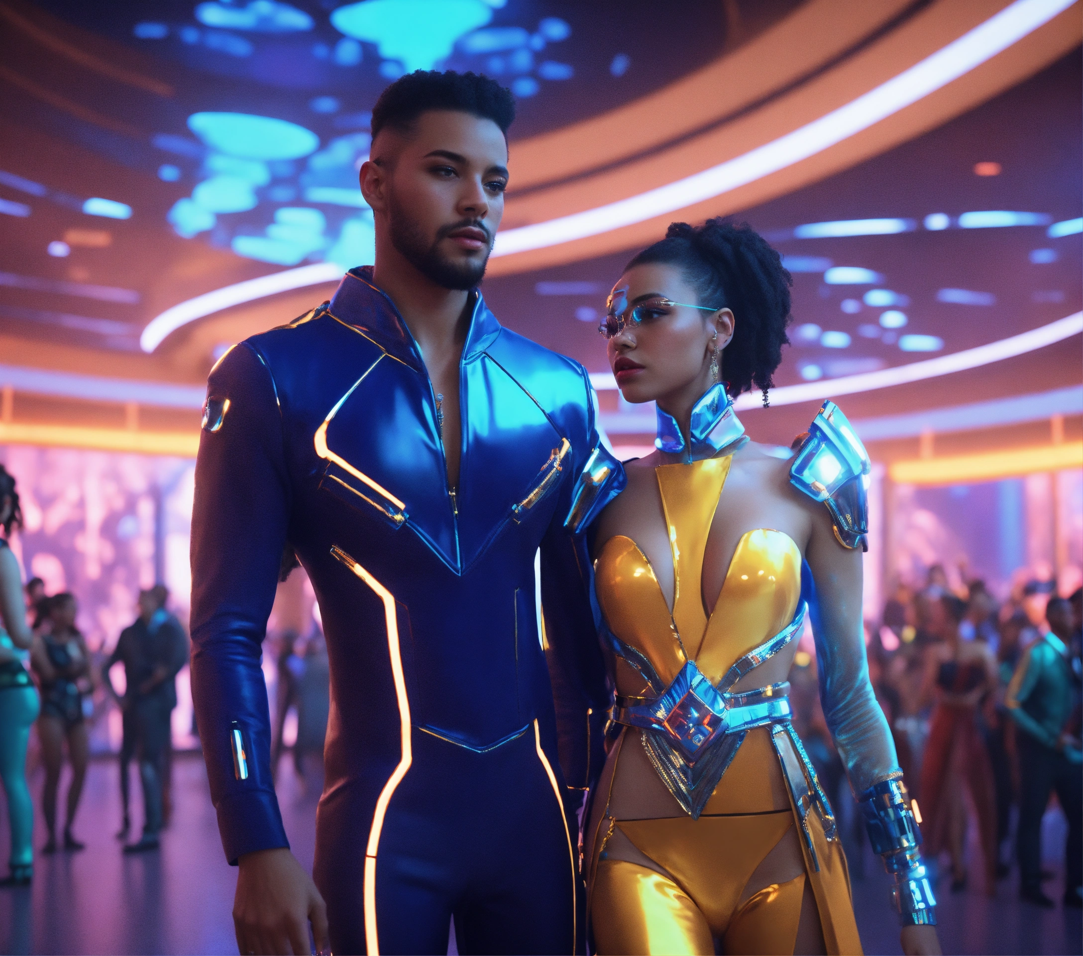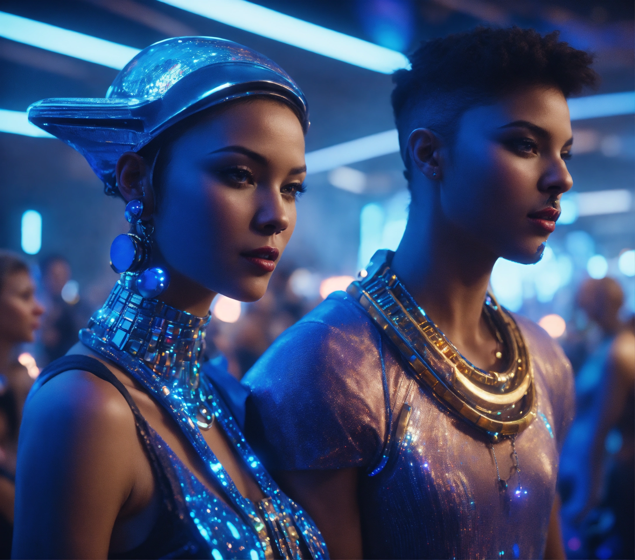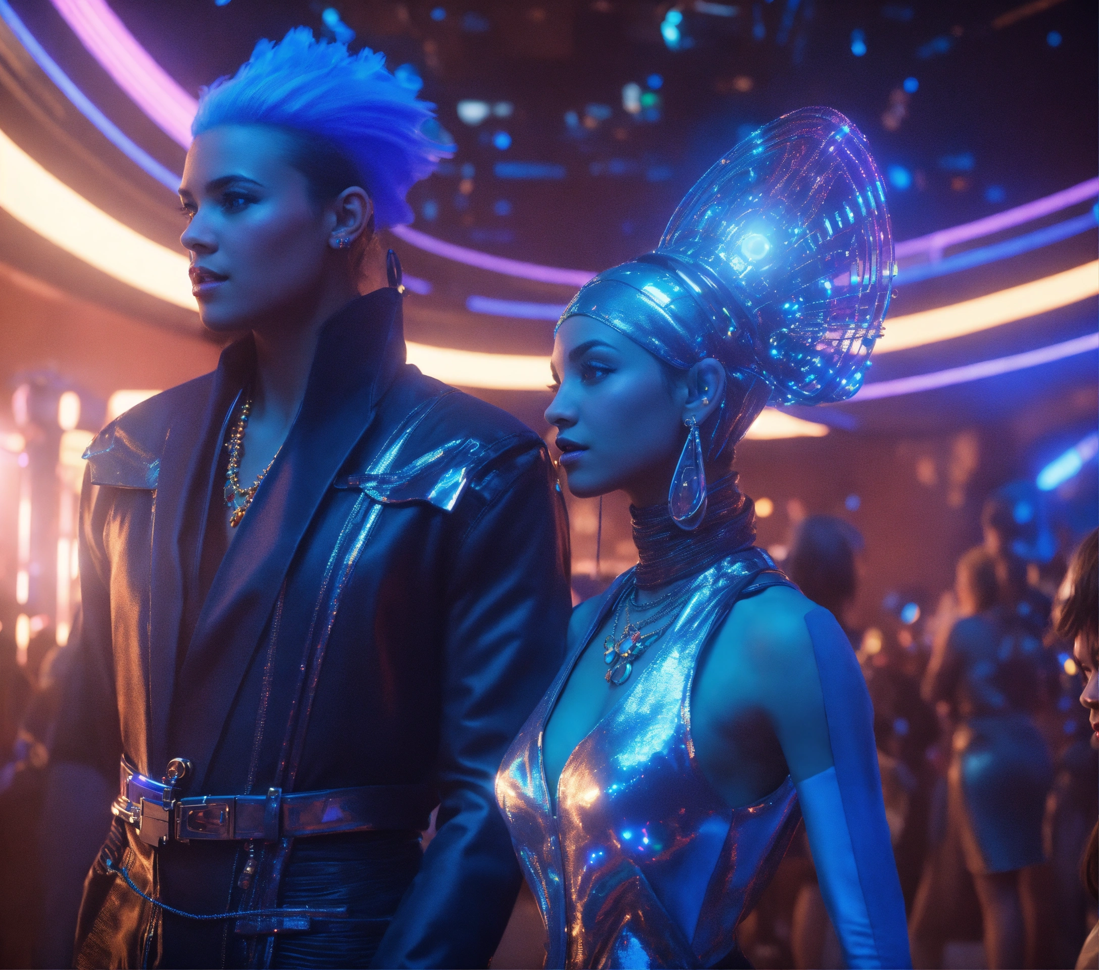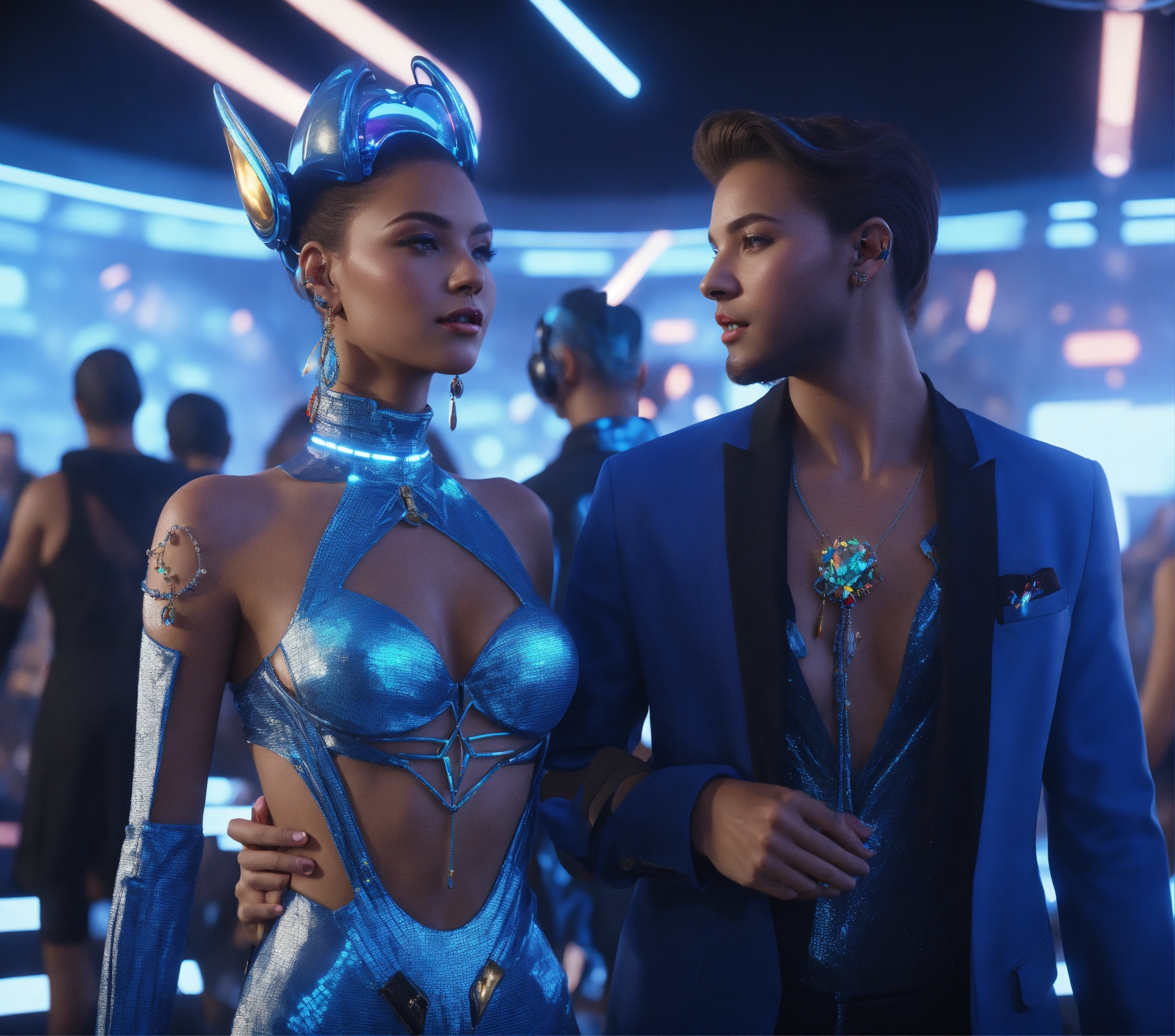 Zoom out from a beautiful blue alien girl and handsome guy wearing space fashion with alot of jewelry with beautiful women in funky futuristic royal attire dance and socialize at a packed jazz concert on a spaceport, realistic, futuristic, sci fi, 8k, unreal engine, pixar