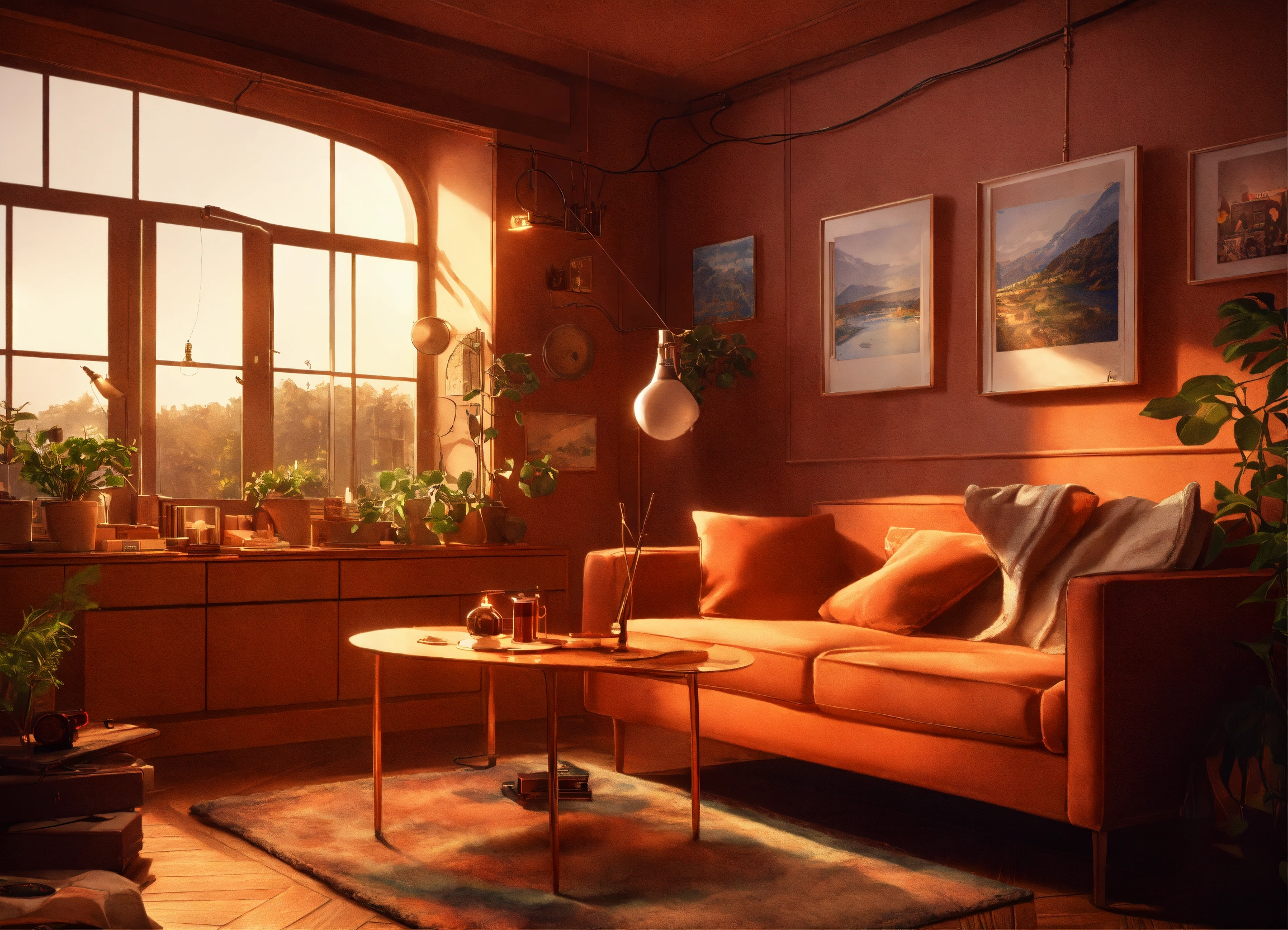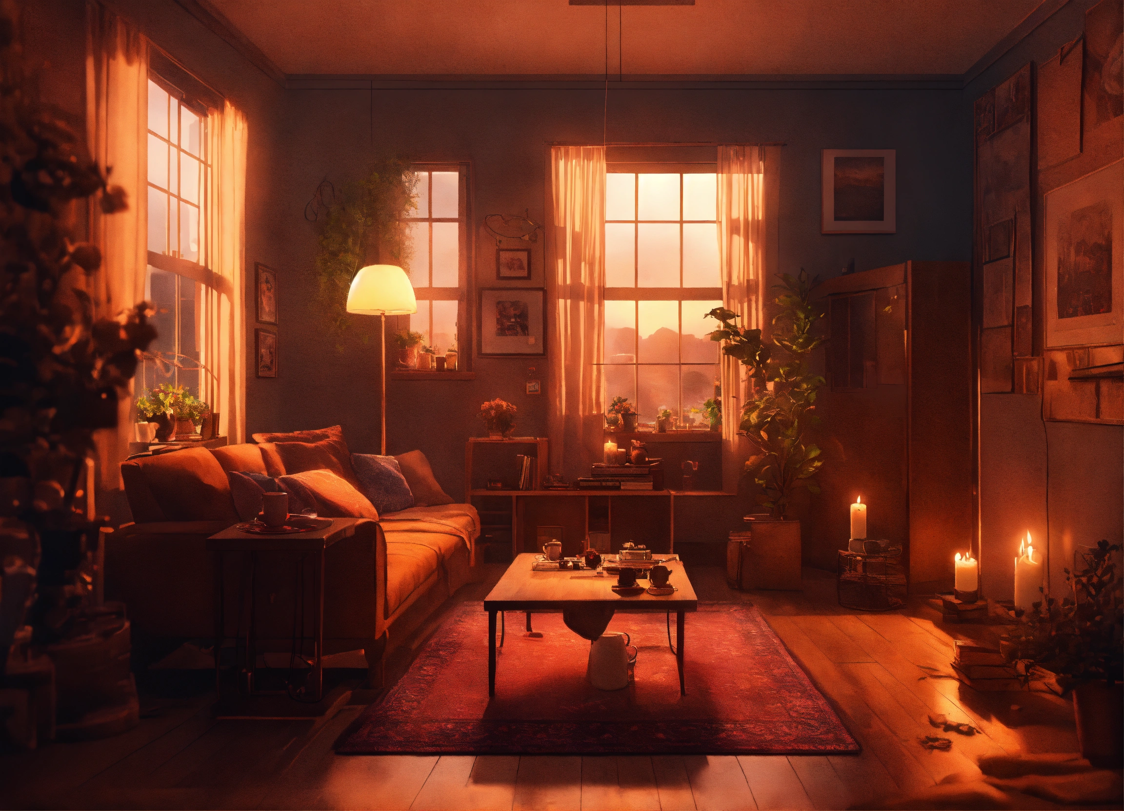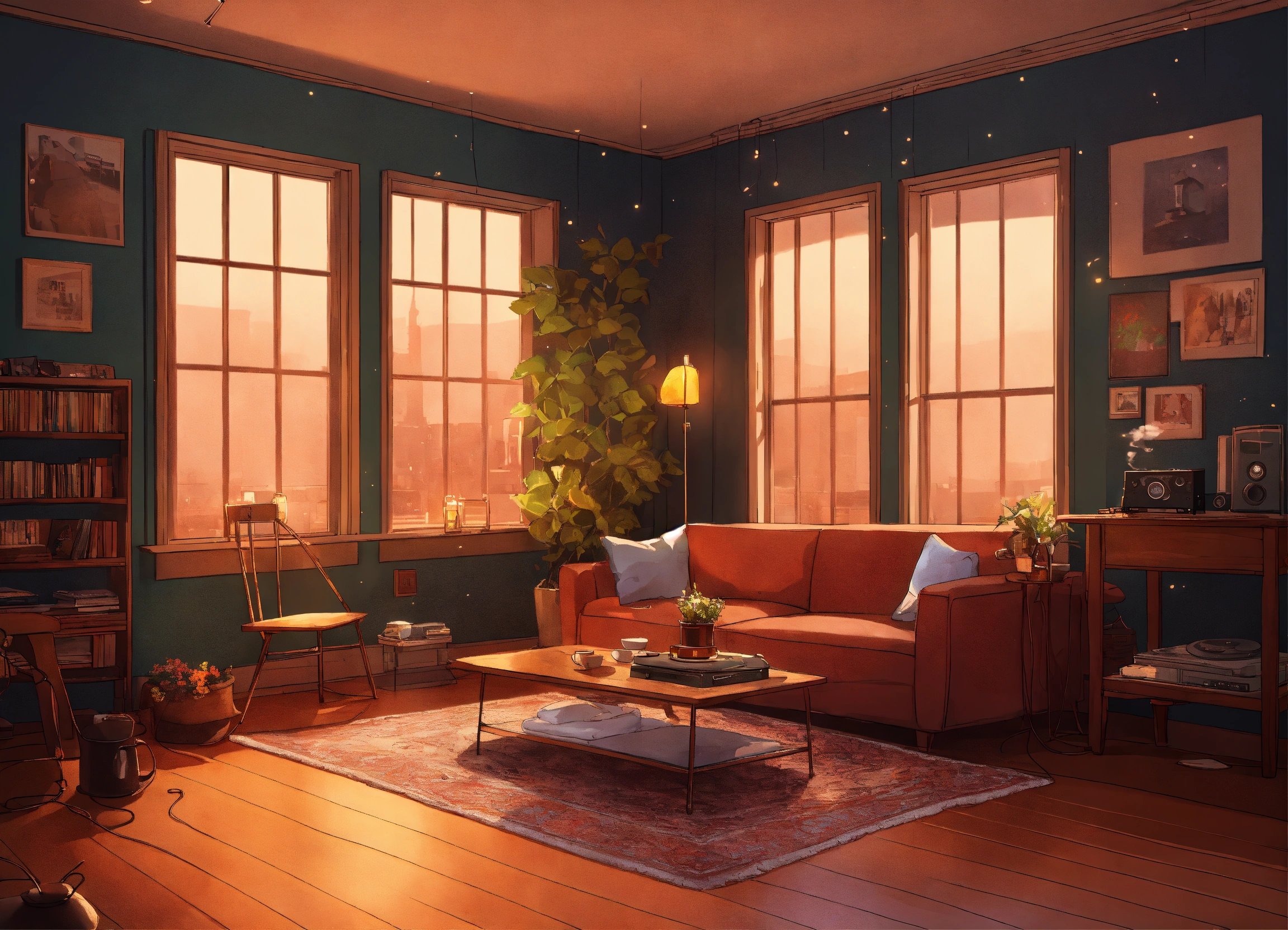 "generate a highly detailed image of a moody and incredibly cozy room that sets the perfect atmosphere for a viral lofi music video. the room should be dimly lit, with soft, warm lighting coming from string lights or candles, creating a captivating ambiance. there should be comfortable seating like plush cushions and blankets, and perhaps a window with rain gently falling outside. in the room, you can include elements like a record player, vintage posters on the walls, and a steaming cup of tea or coffee on a table. this image should capture the essence of relaxation, perfect for a lofi music video that viewers will want to share and immerse themselves in."