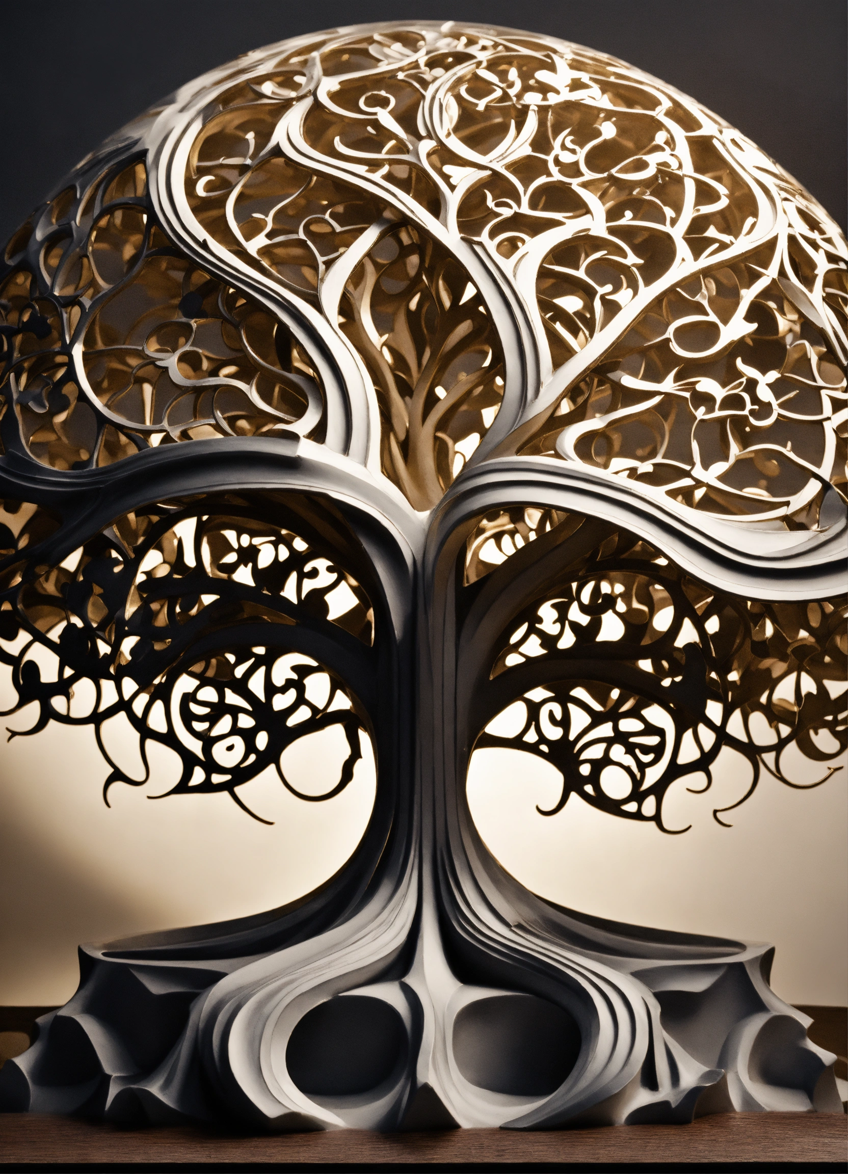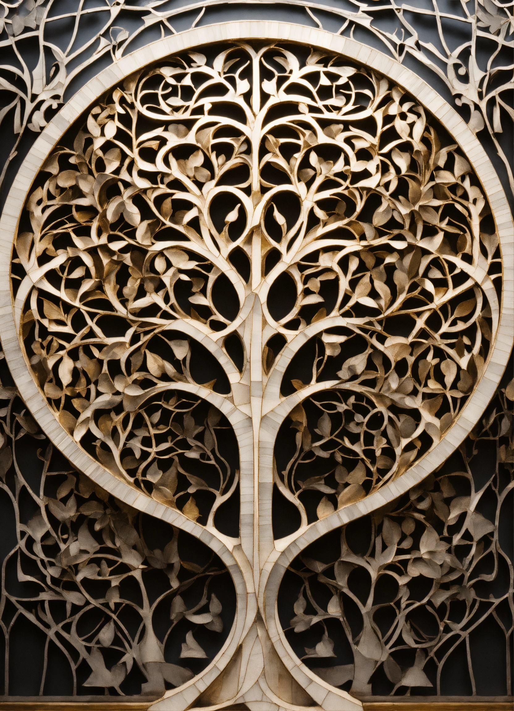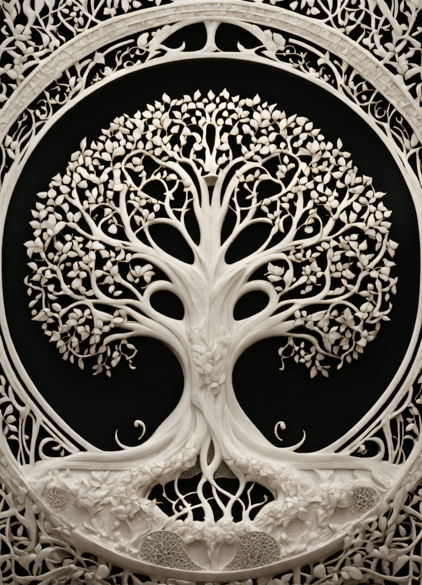 Highly detailed beautiful organic tree of life, art nouveau, sharp focus, dynamic lighting, elegant harmony, beauty, masterpiece, white, black, voronoi, arabic, no symmetry geometry, pattern