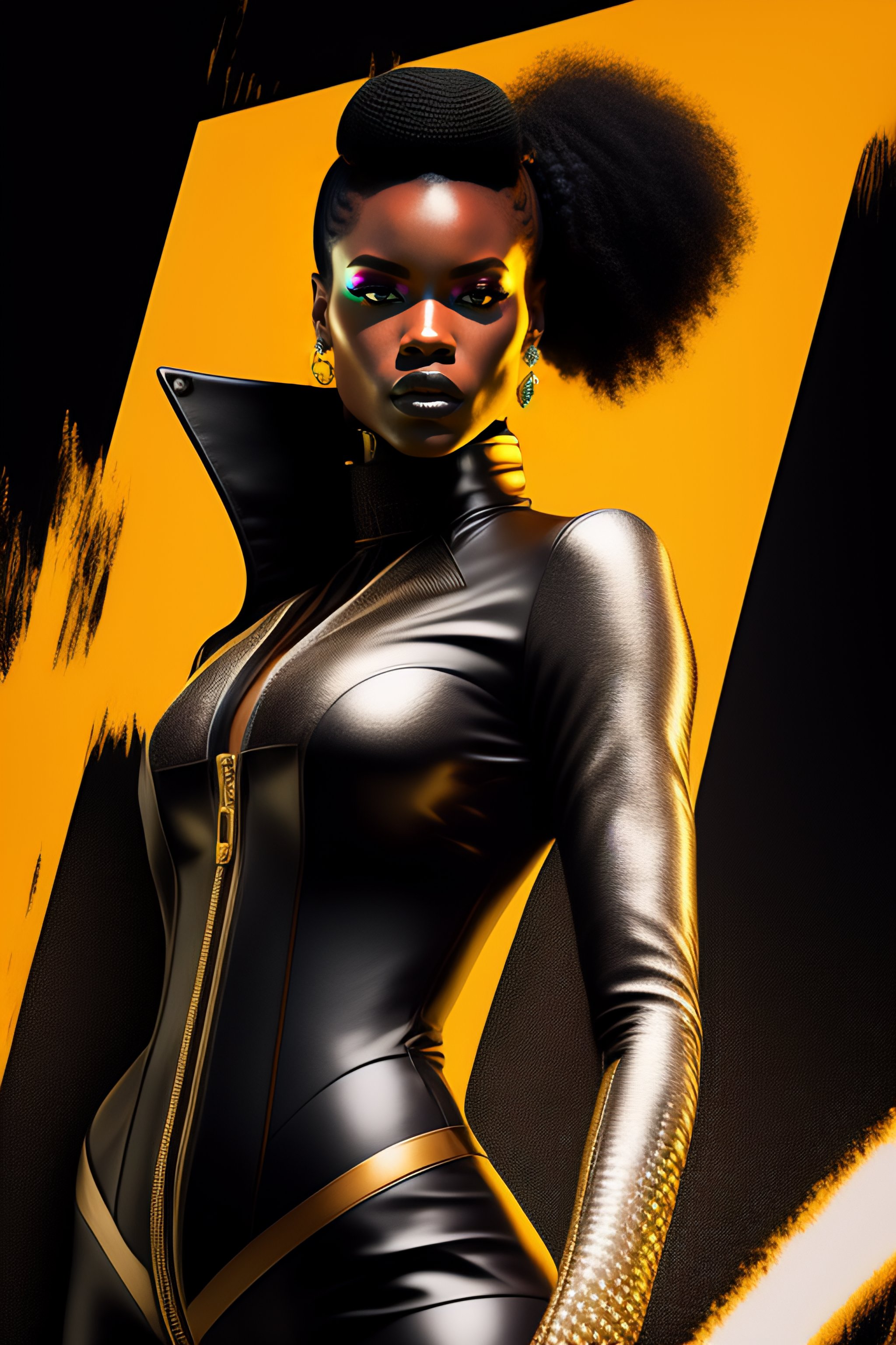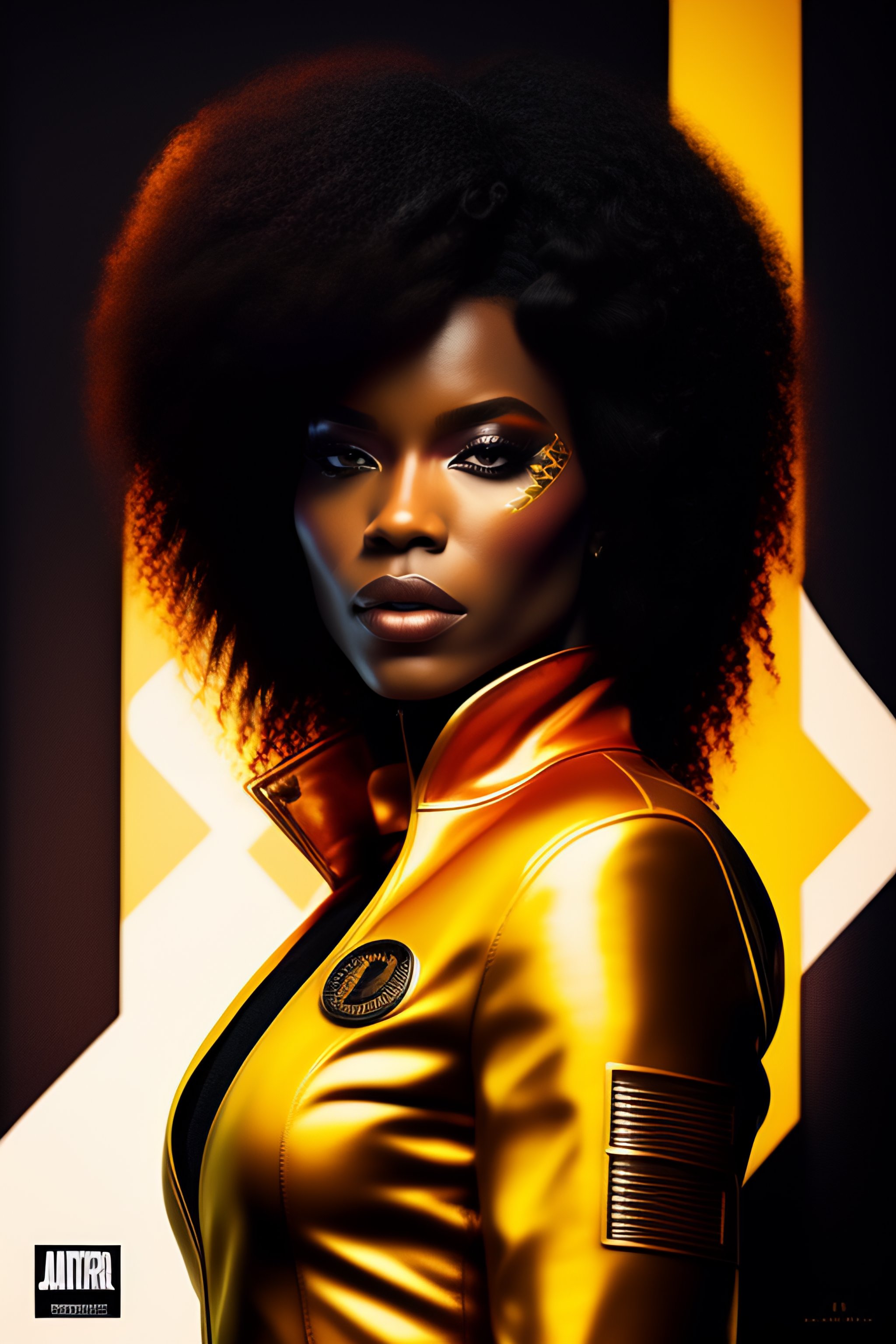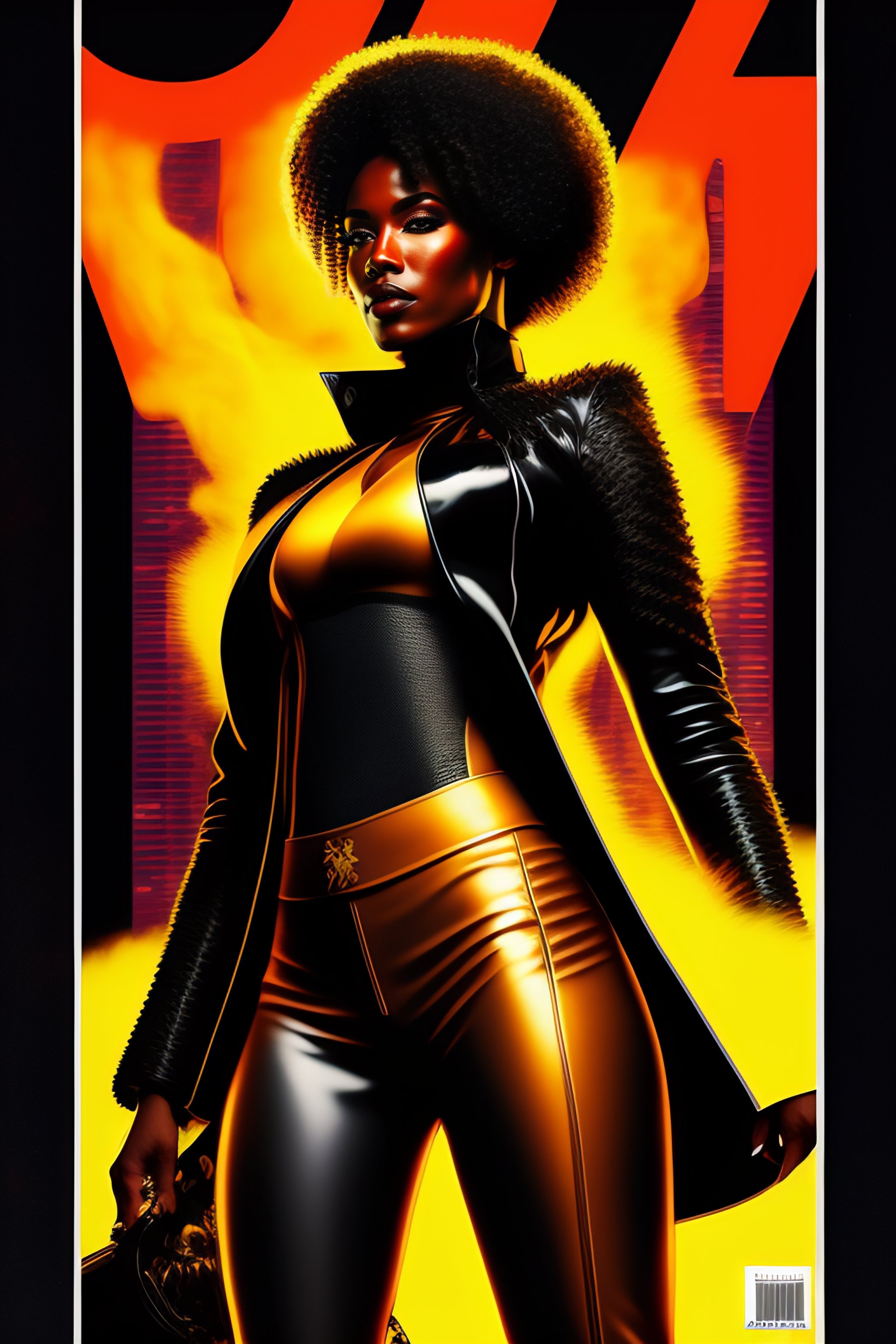 Kill bill inspired, disco club, black woman afro black panther party, leather suit, mercenary, retro cover, high details, intricate details 60s, inking, realistic, photo