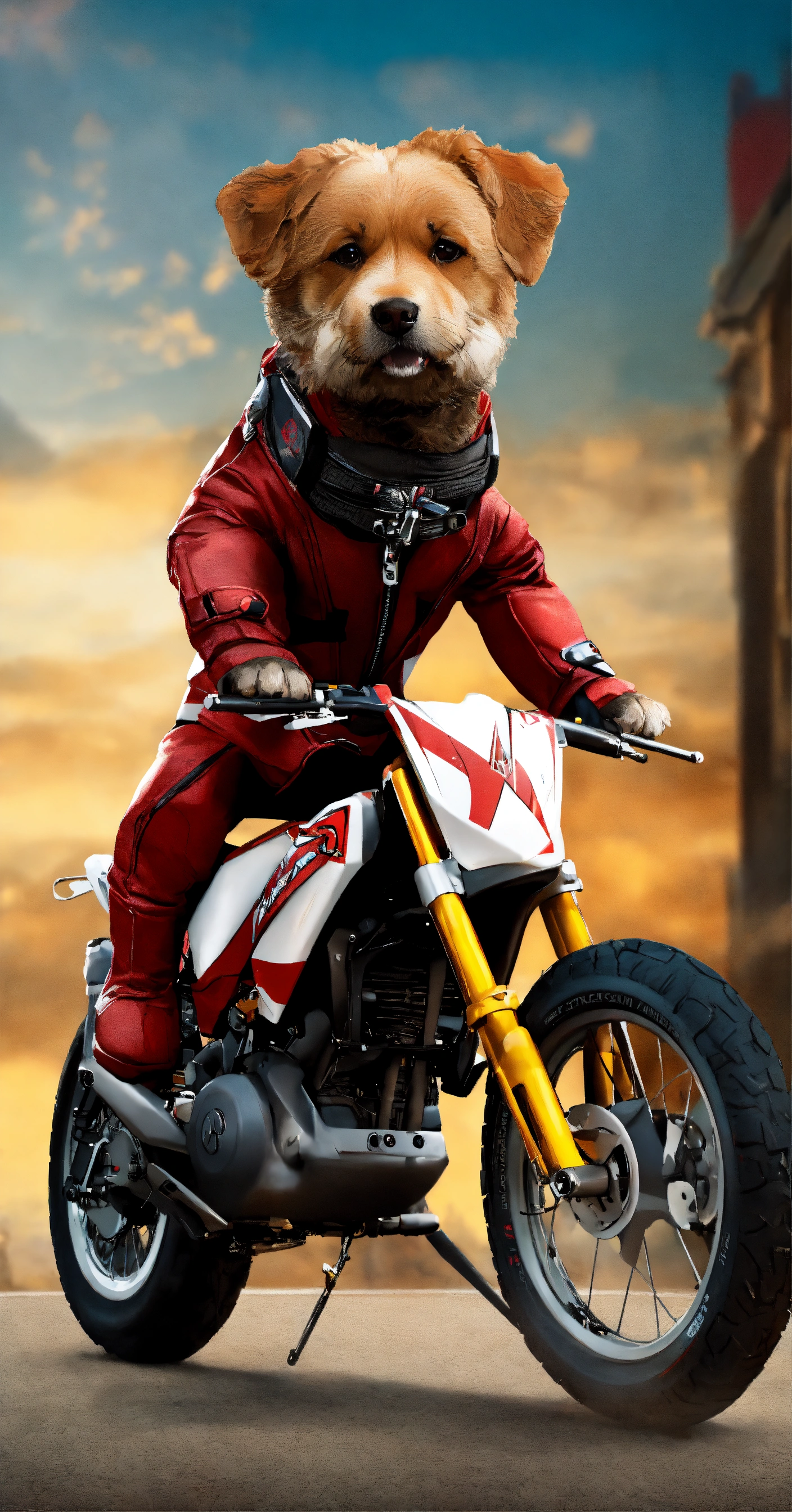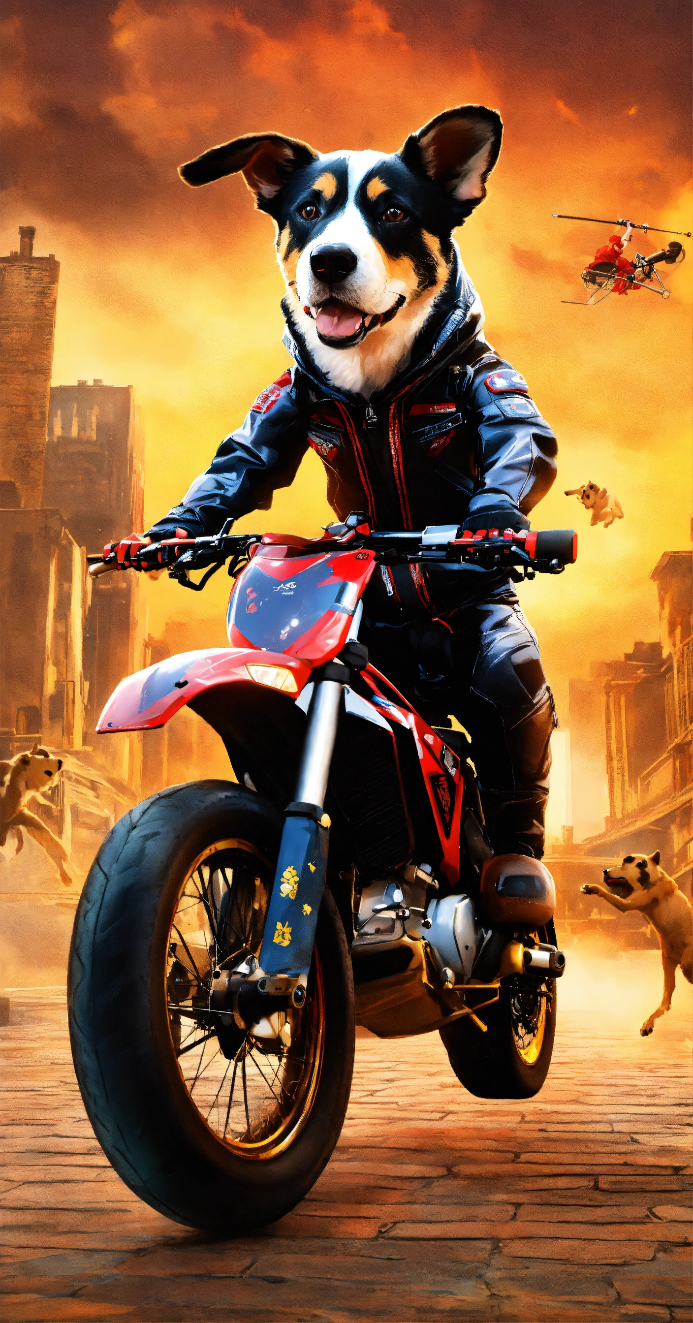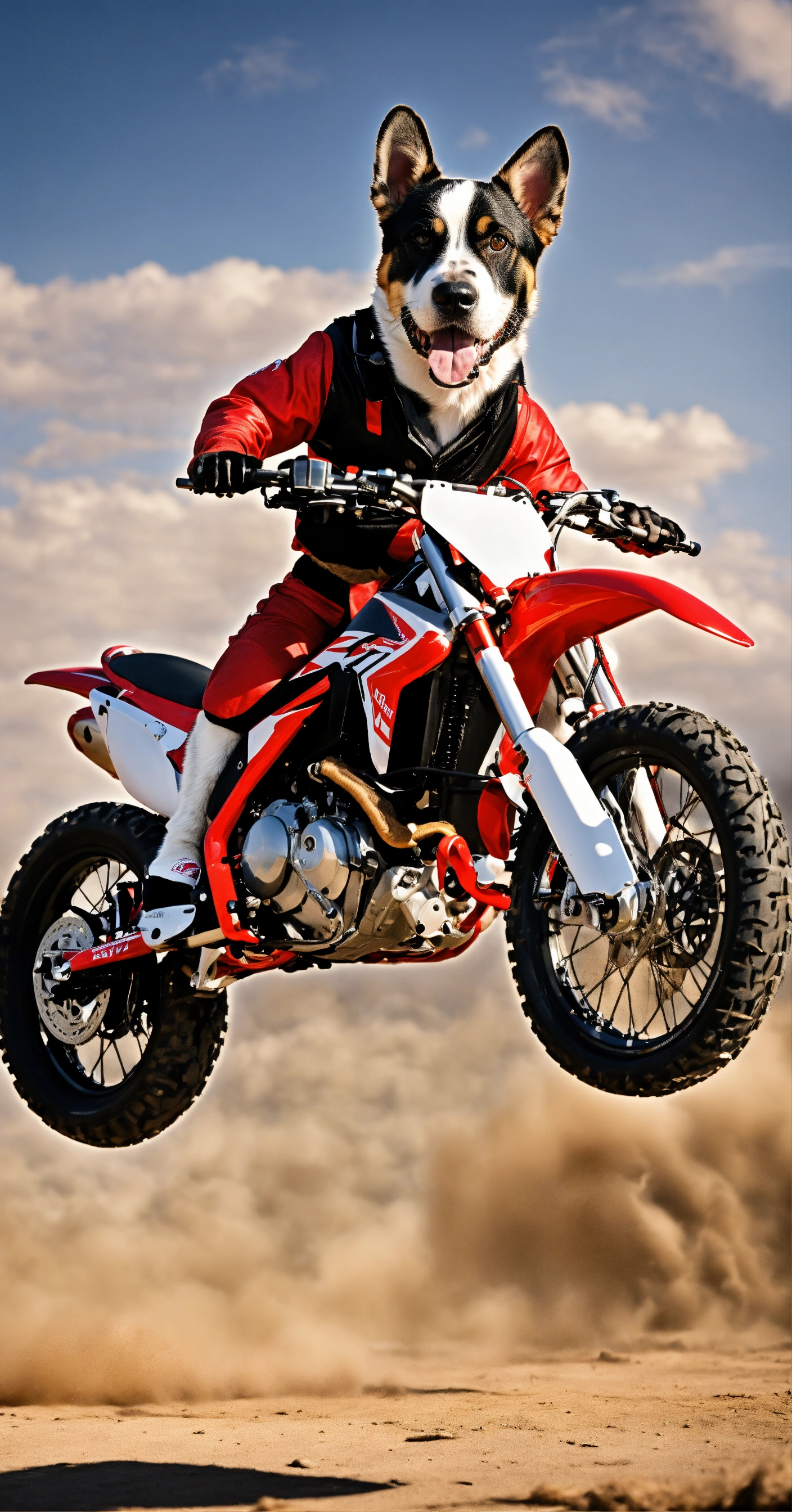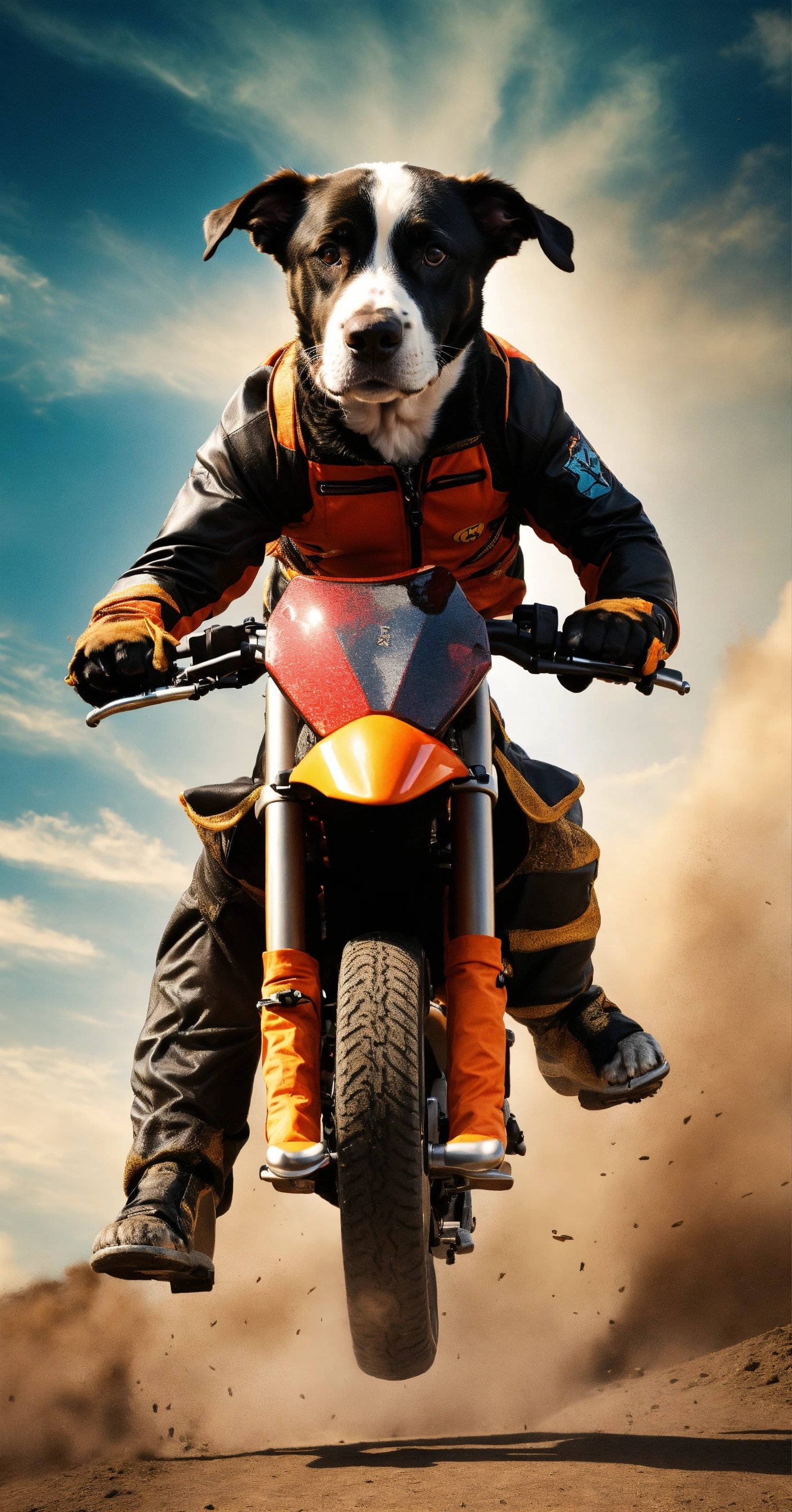 Generate an image of a dog as a fearless stuntman, performing daring bike tricks and jumps dressed in a daredevil outfit.