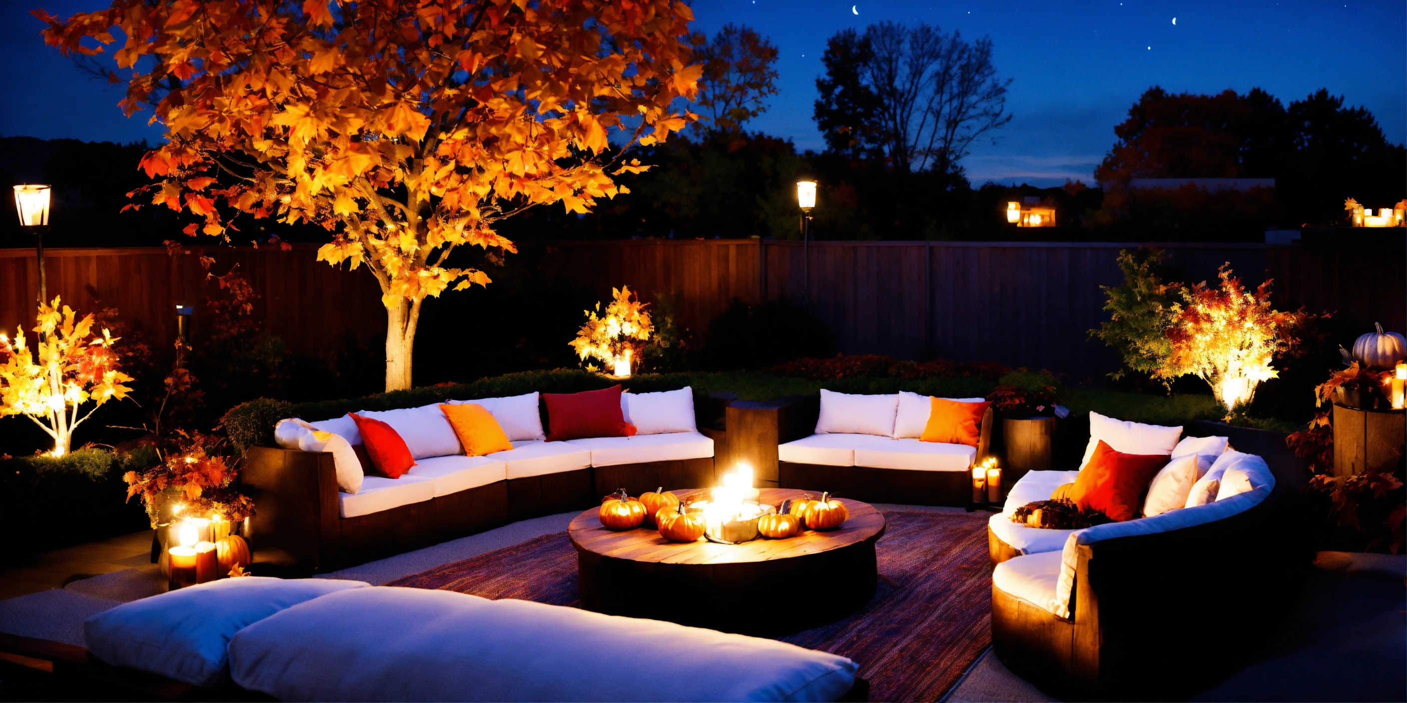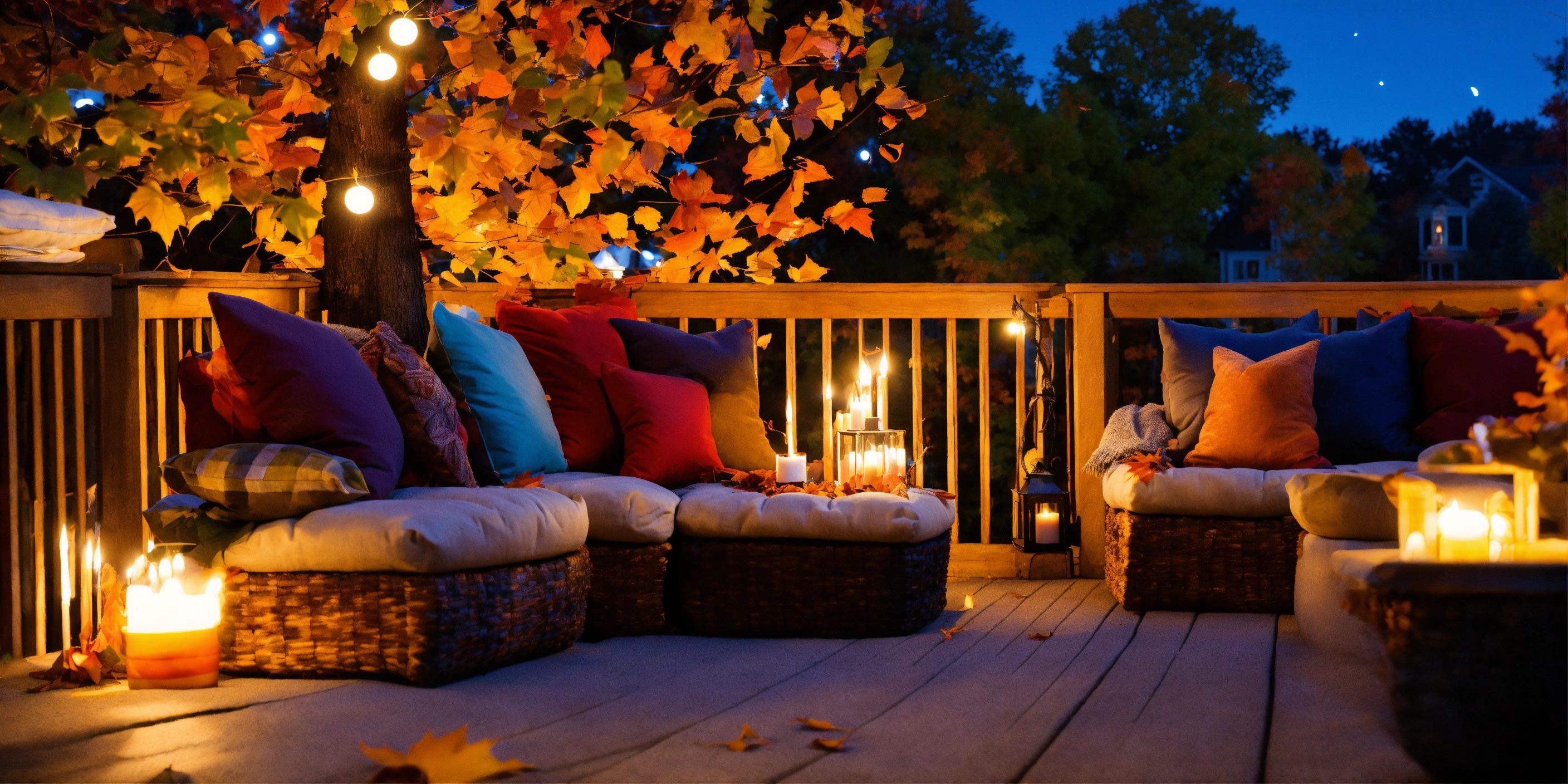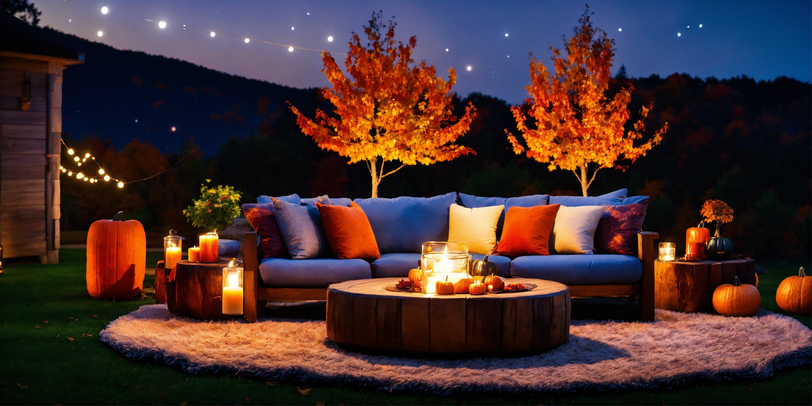 Fall theme patio, big comfy couch, fluffy rug, fall leaves, wood patio, night moon, candles, cute lights, outdoor sky moon, fall trees, falling leaves, fall colorful pillows, bean bag chairs