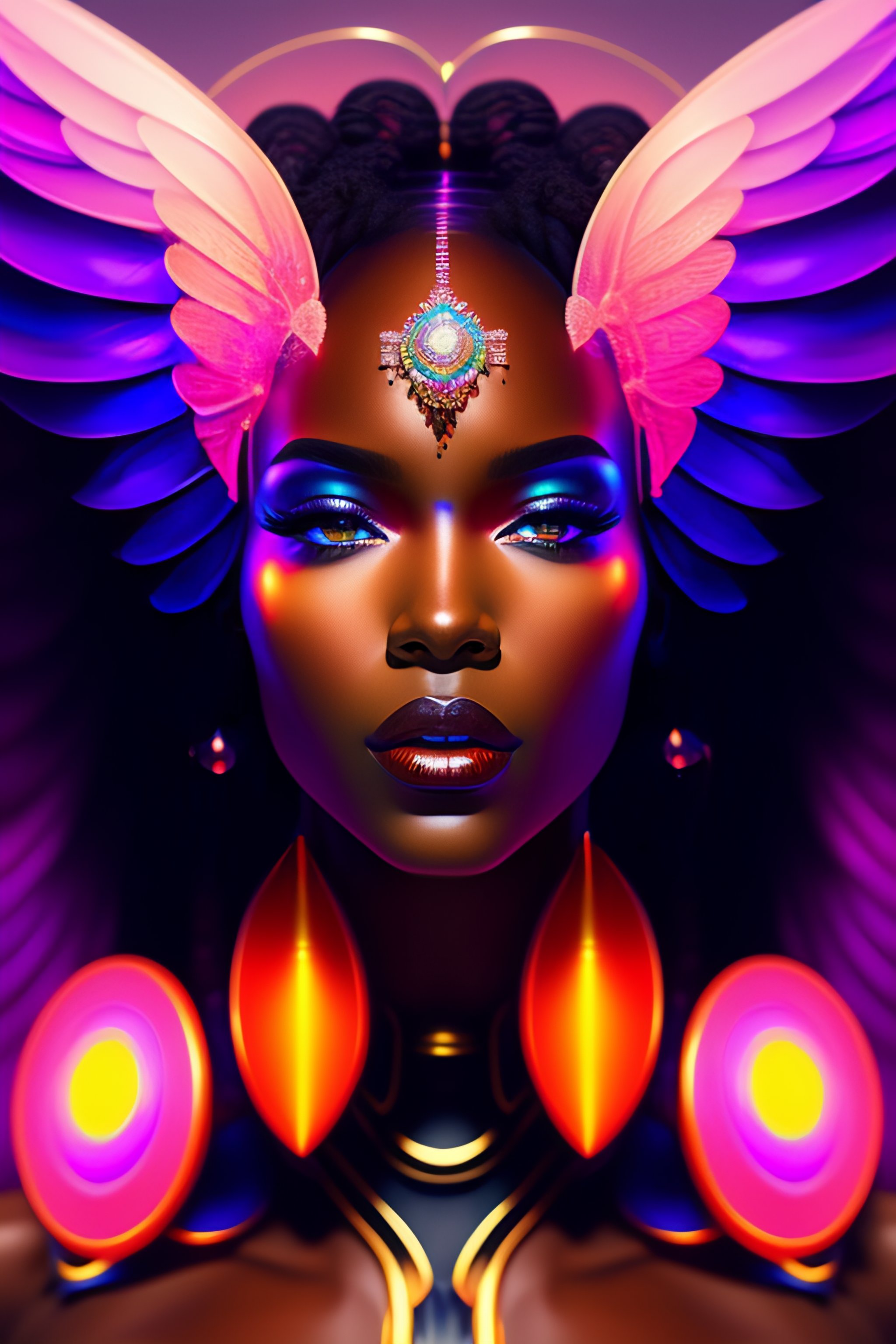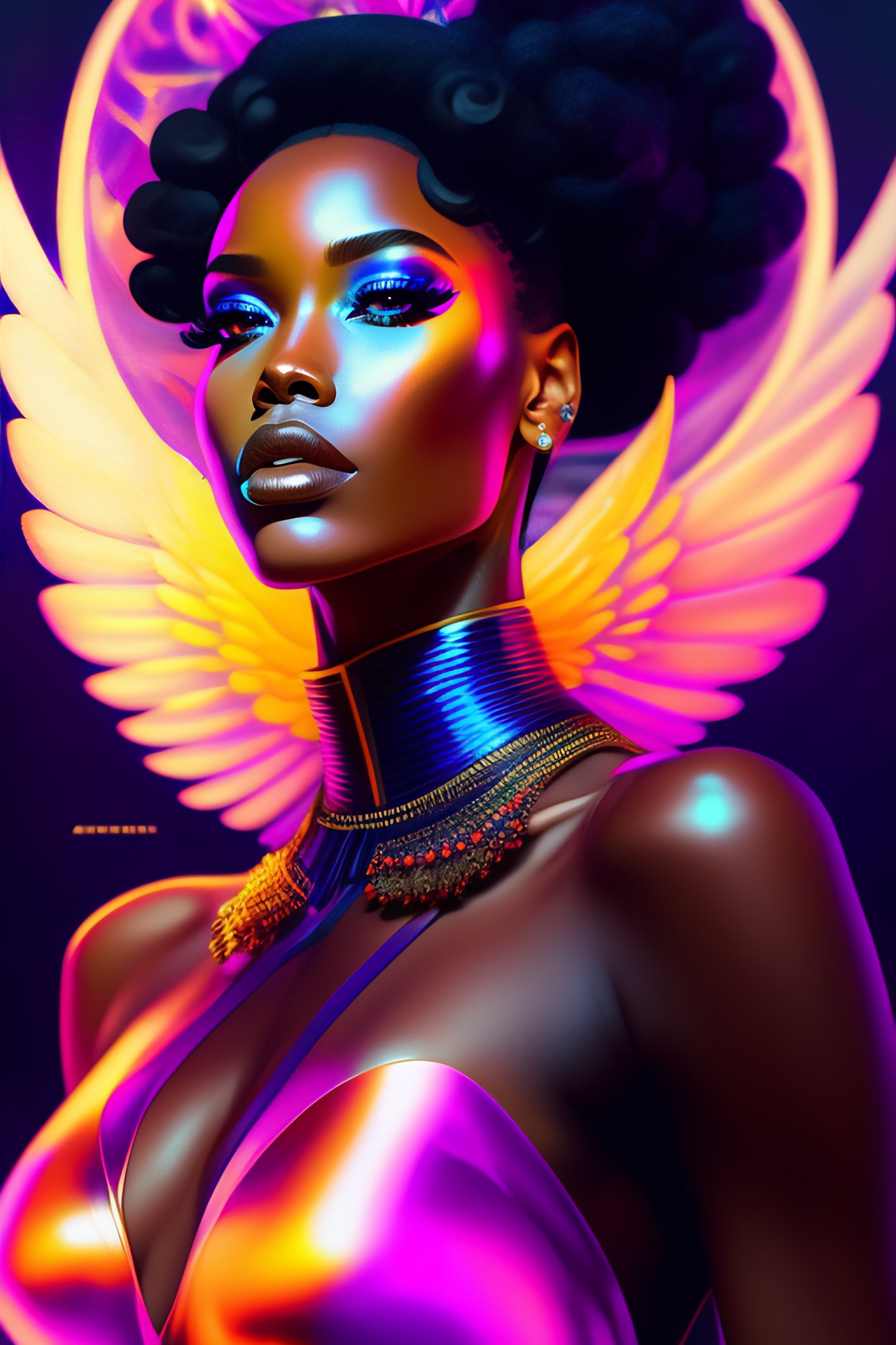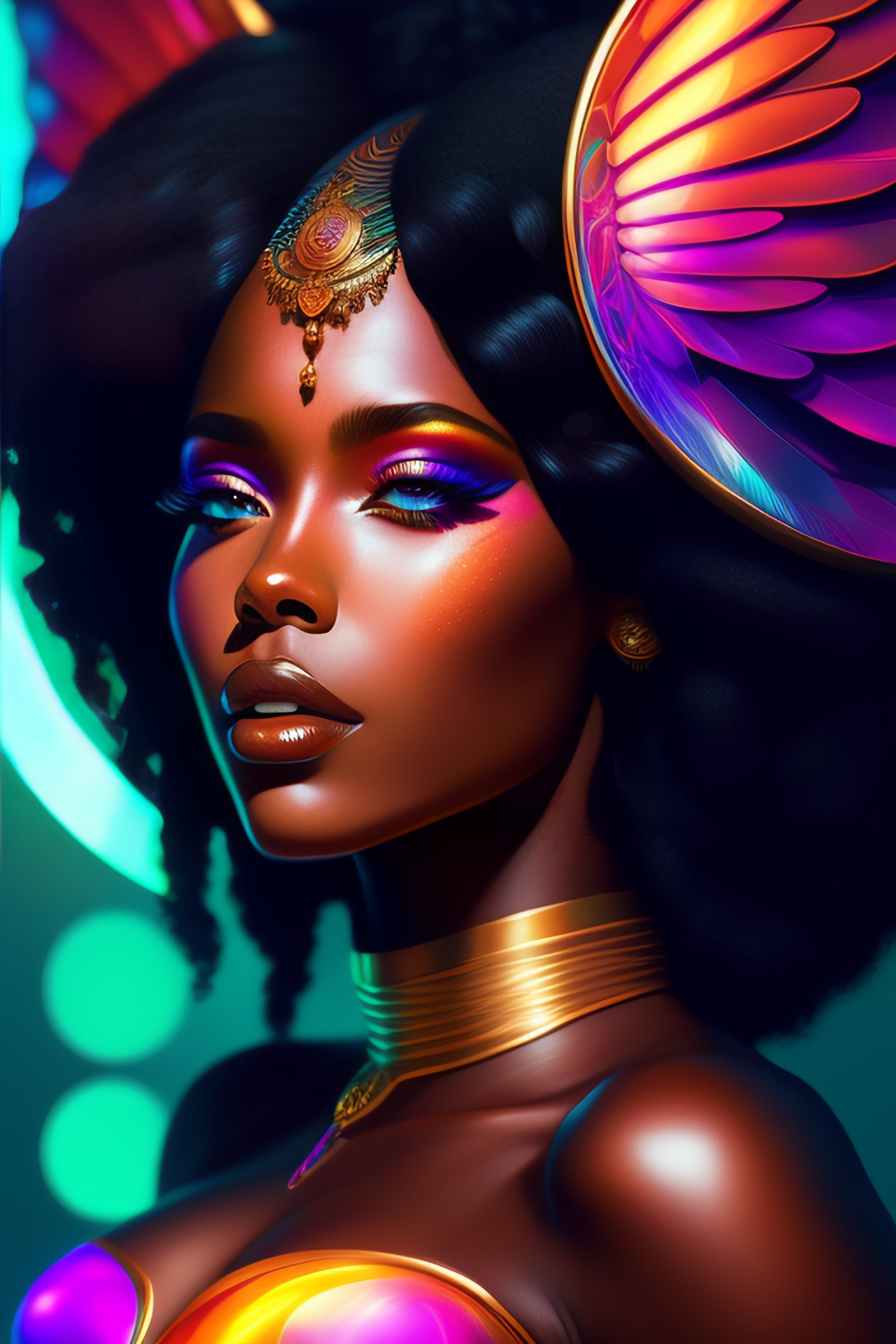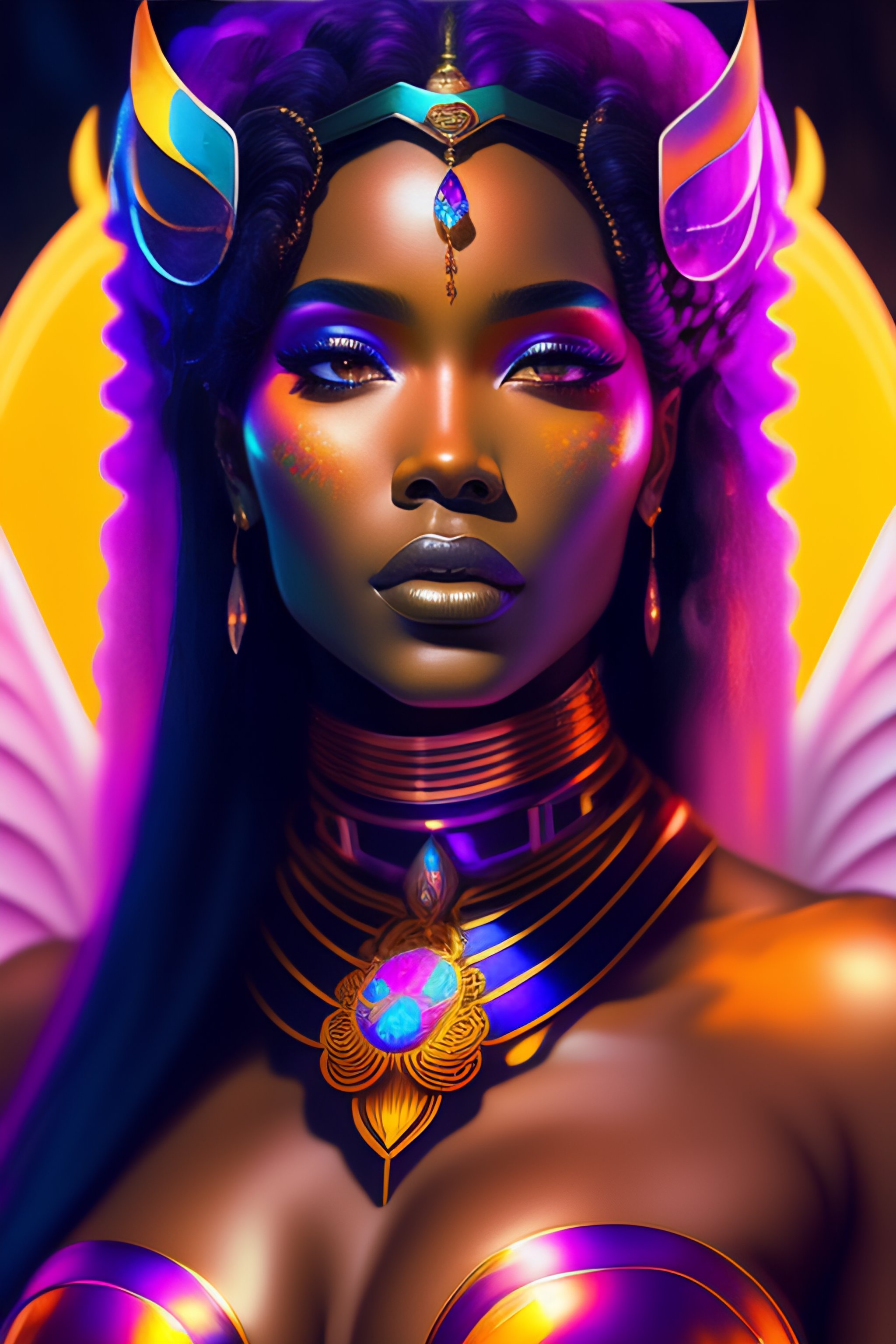 A cybernetic black goddess, vaporwave aesthetic, colorful, psychedelic, digital painting, artstation, concept art, smooth, sharp focus, illustration, art by artgerm and greg rutkowski and alphonse mucha, wide angel shot, nikon 14 mm