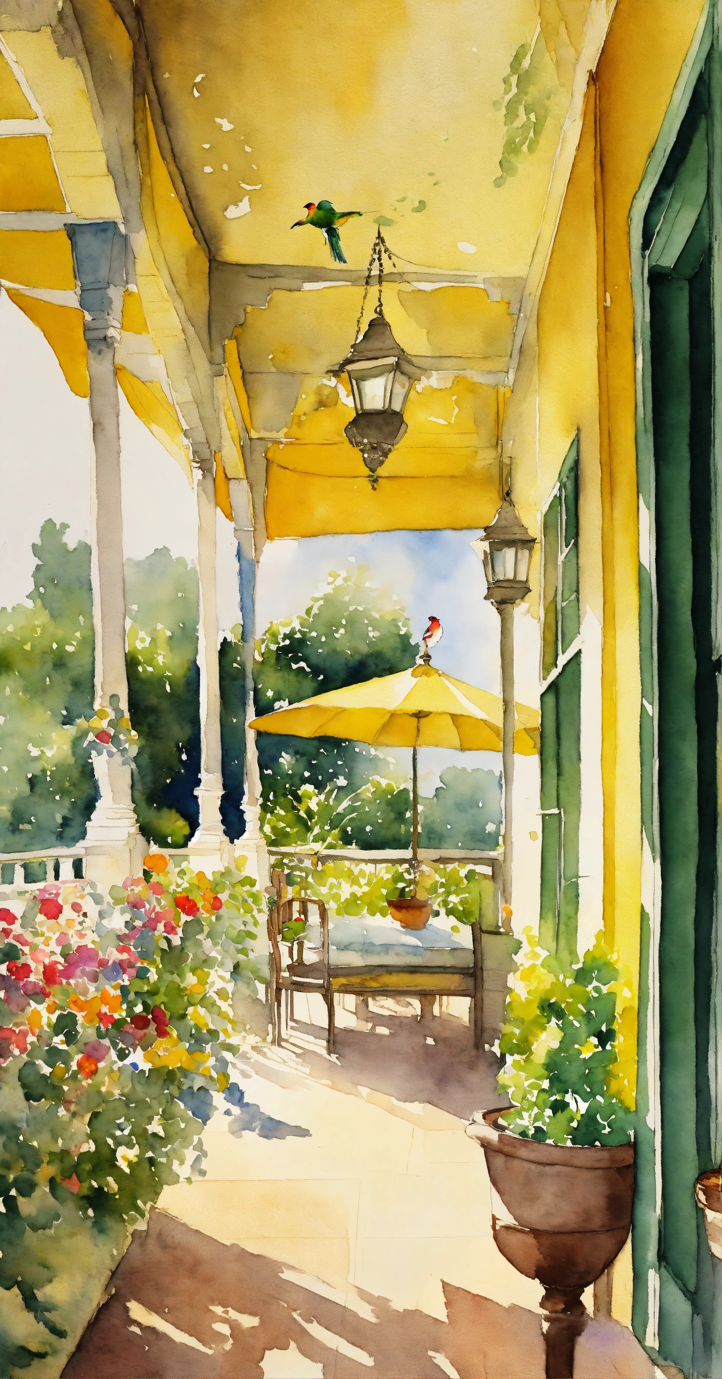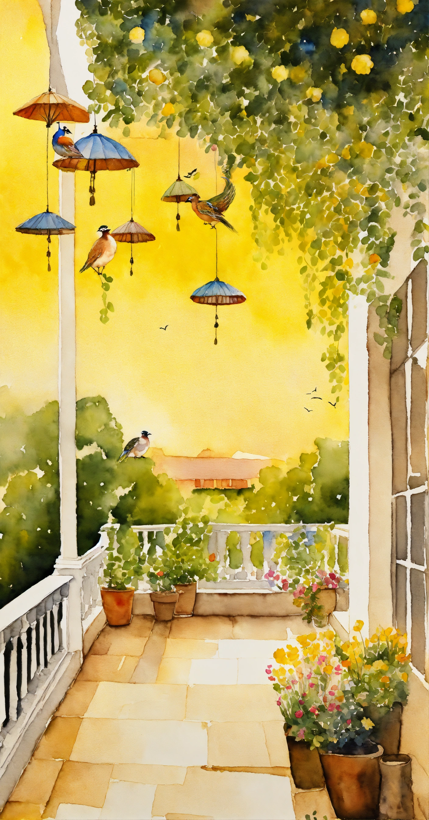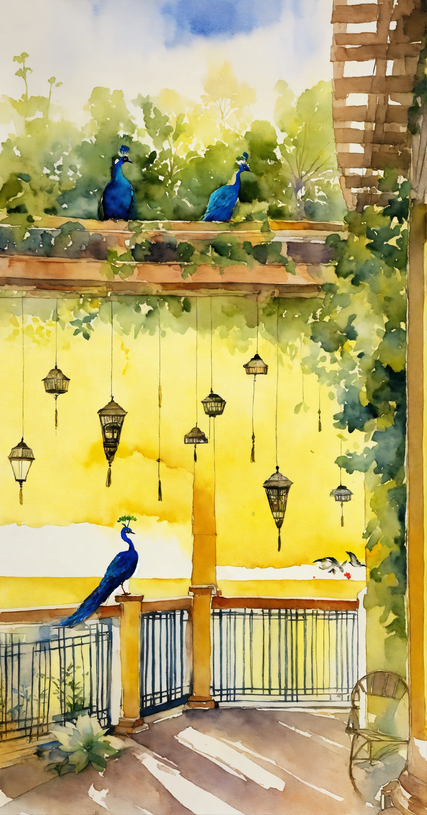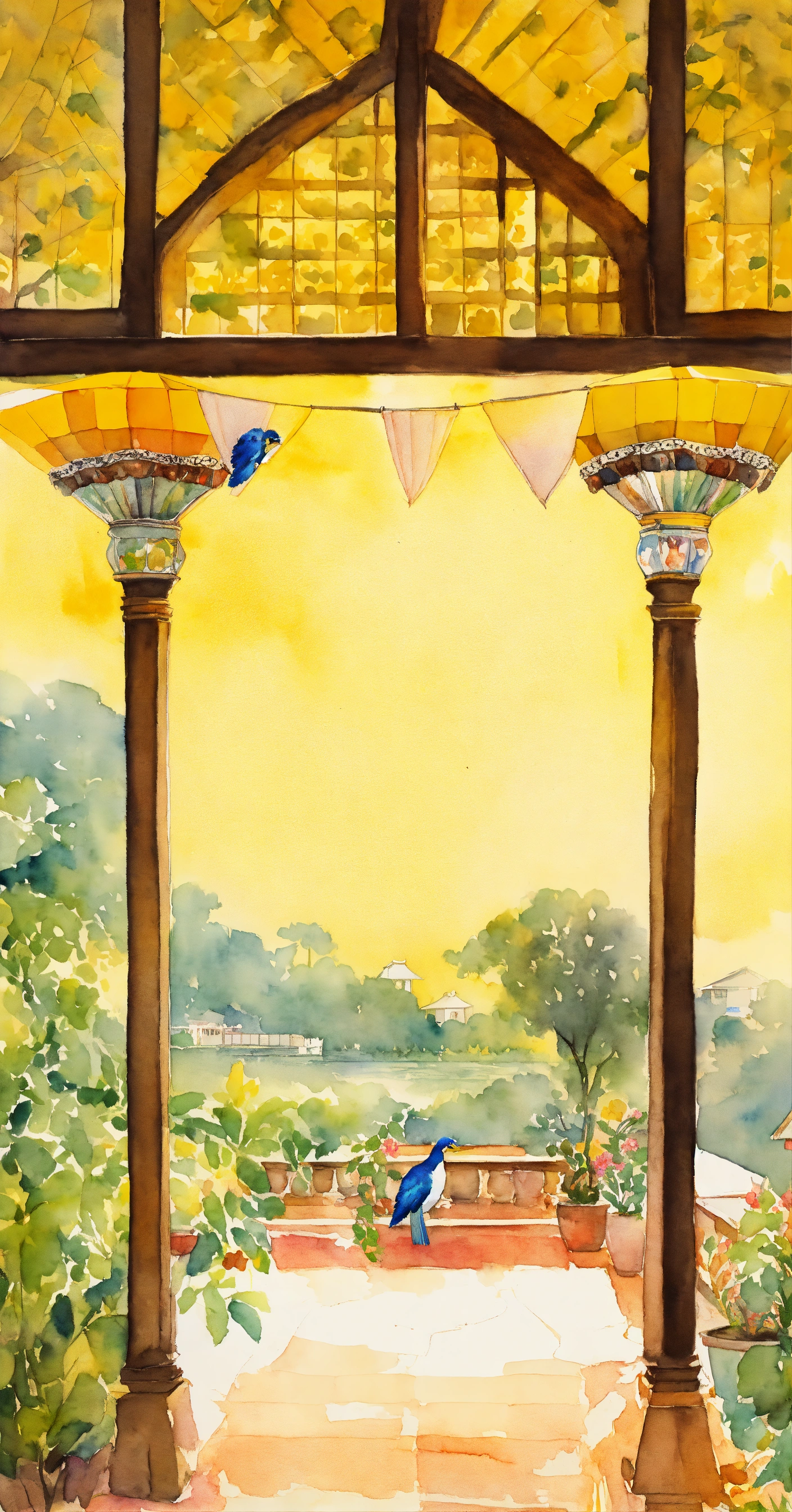 Right aligned, perspective, watercolour, yellow and white sky, birds, veranda, peacock, garden, plants, trees, indian umbrellas, hanging, flower garlands
