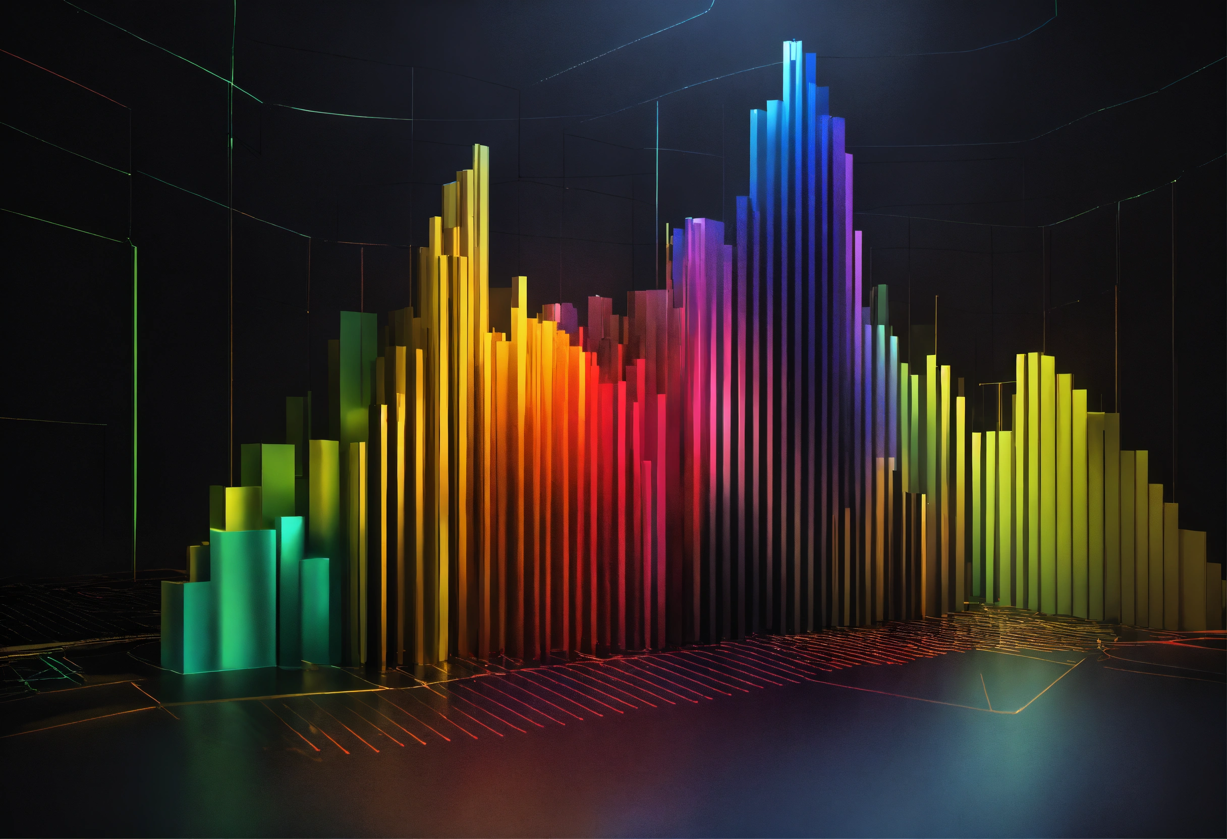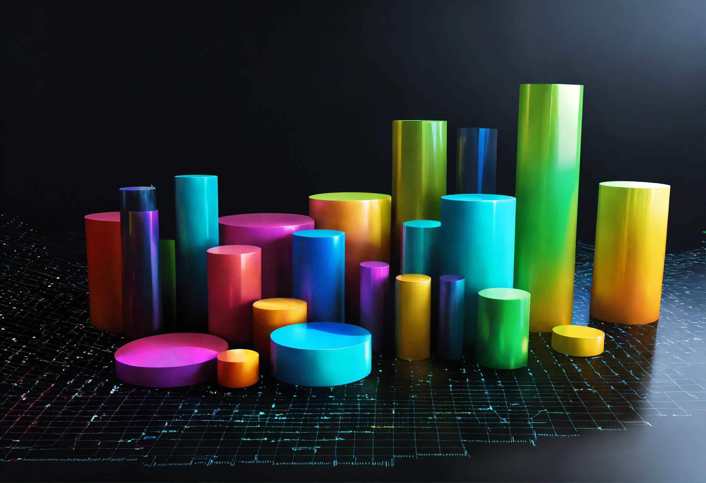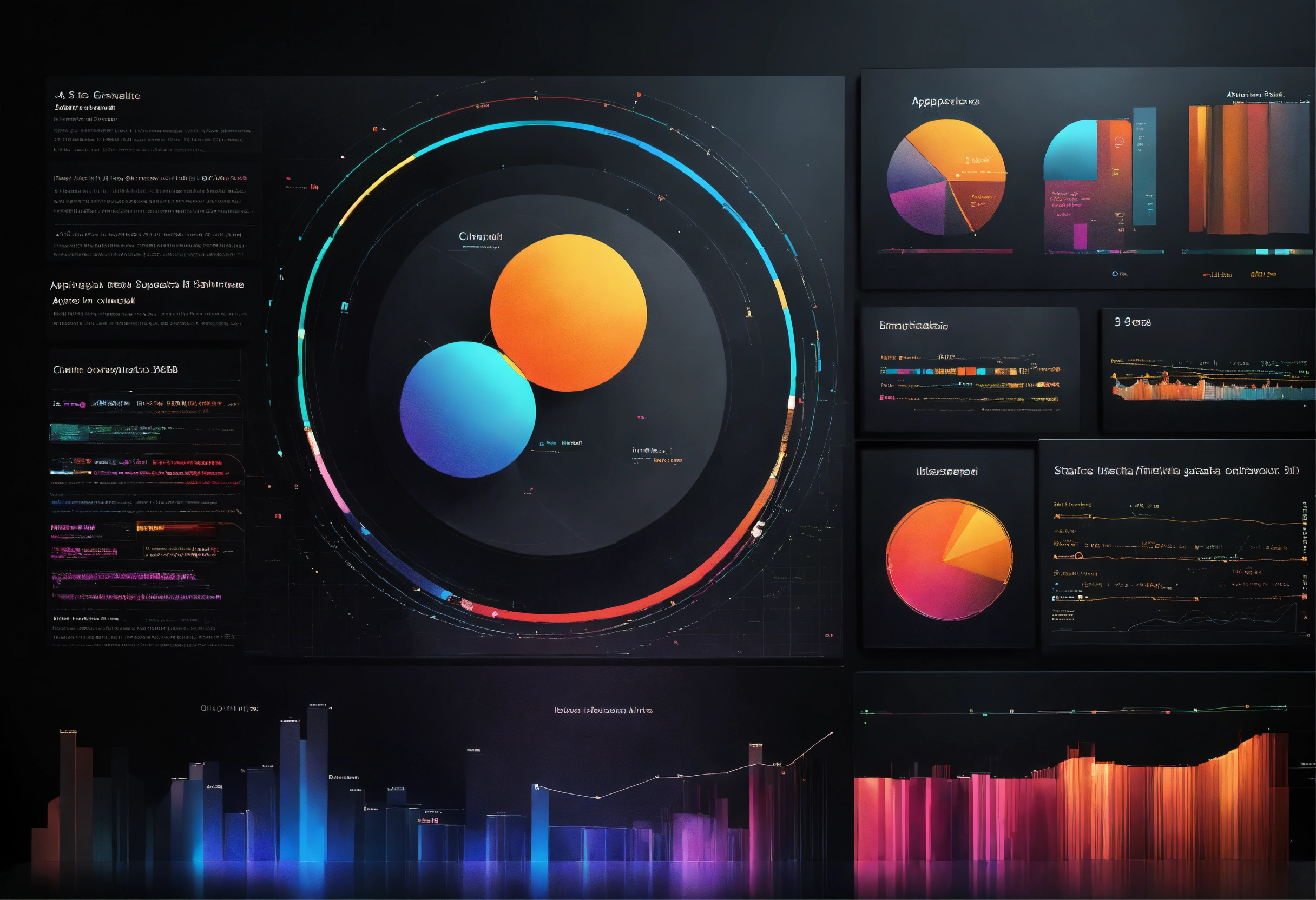 Applications of statistical graphs. black background, shiny texture, gradient from the center. figures with a three-dimensional appearance using shading, light and perspective techniques. colors that contrast with the black background. clean and modern style. the image that is not very loaded. subtle lighting that enhances three-dimensional figures and adds depth to the image