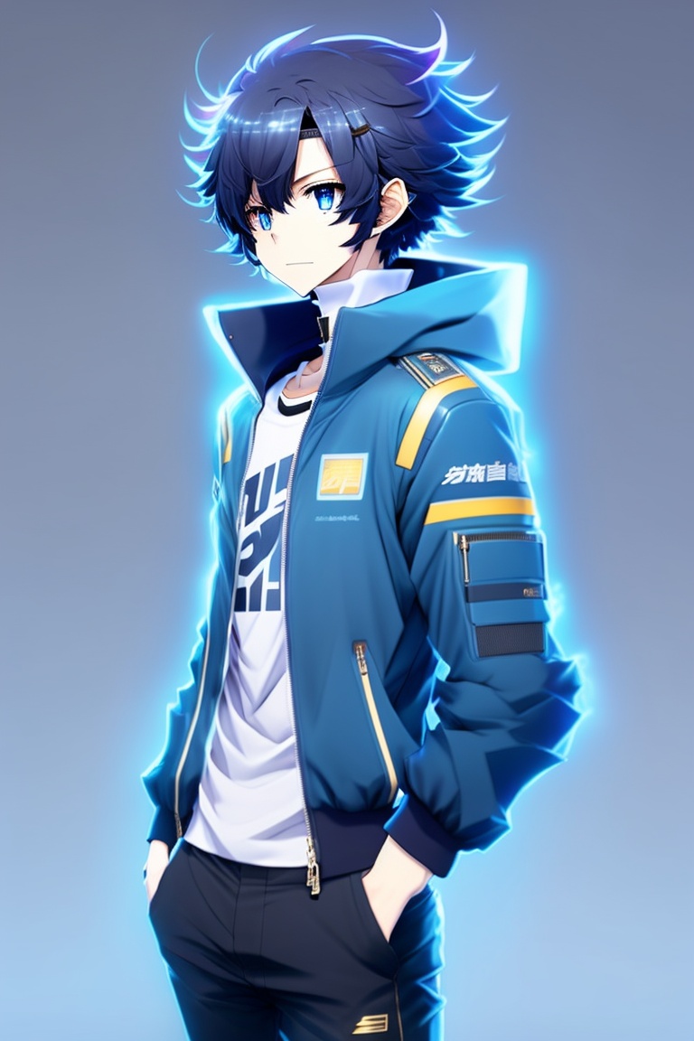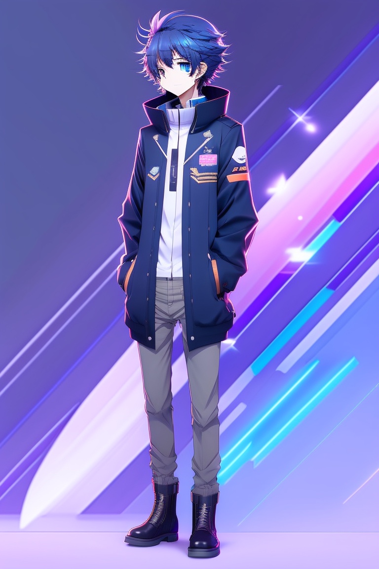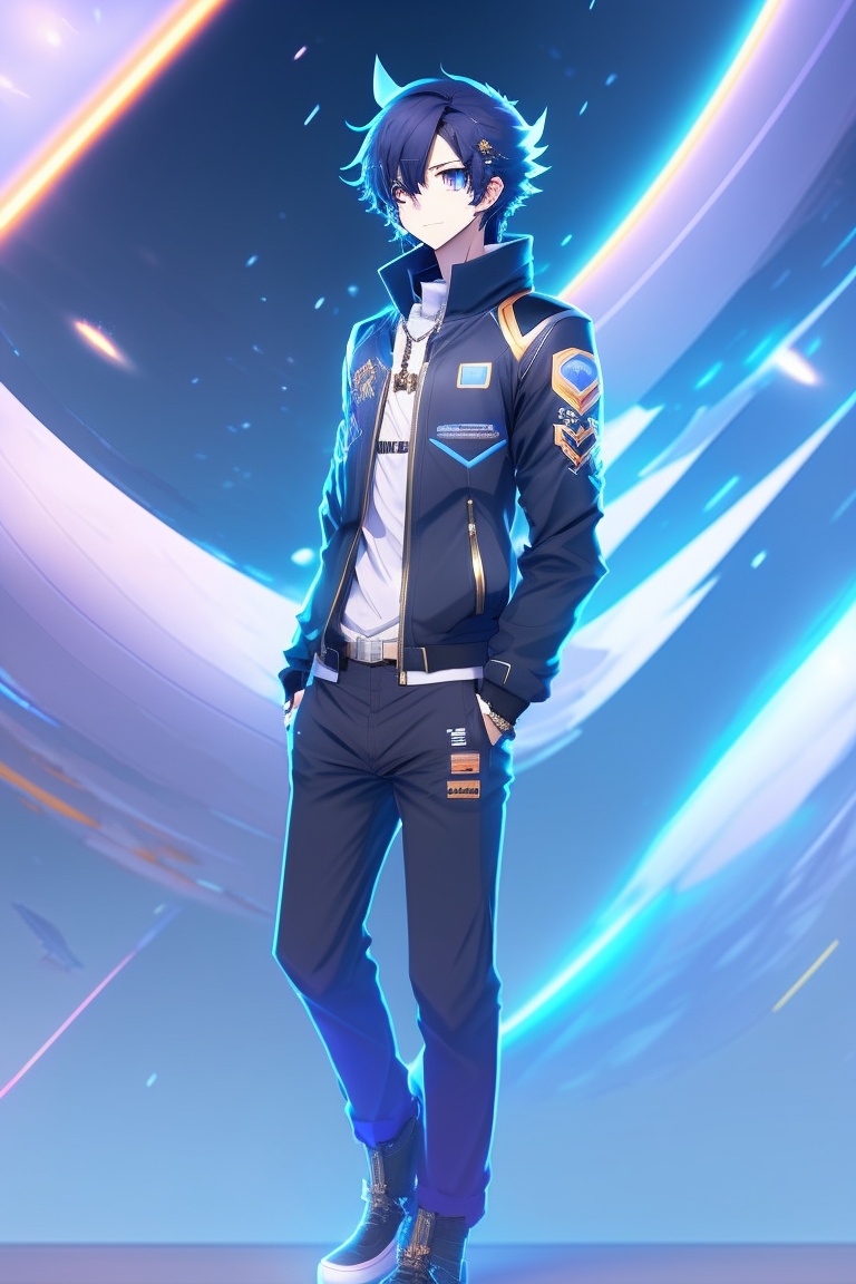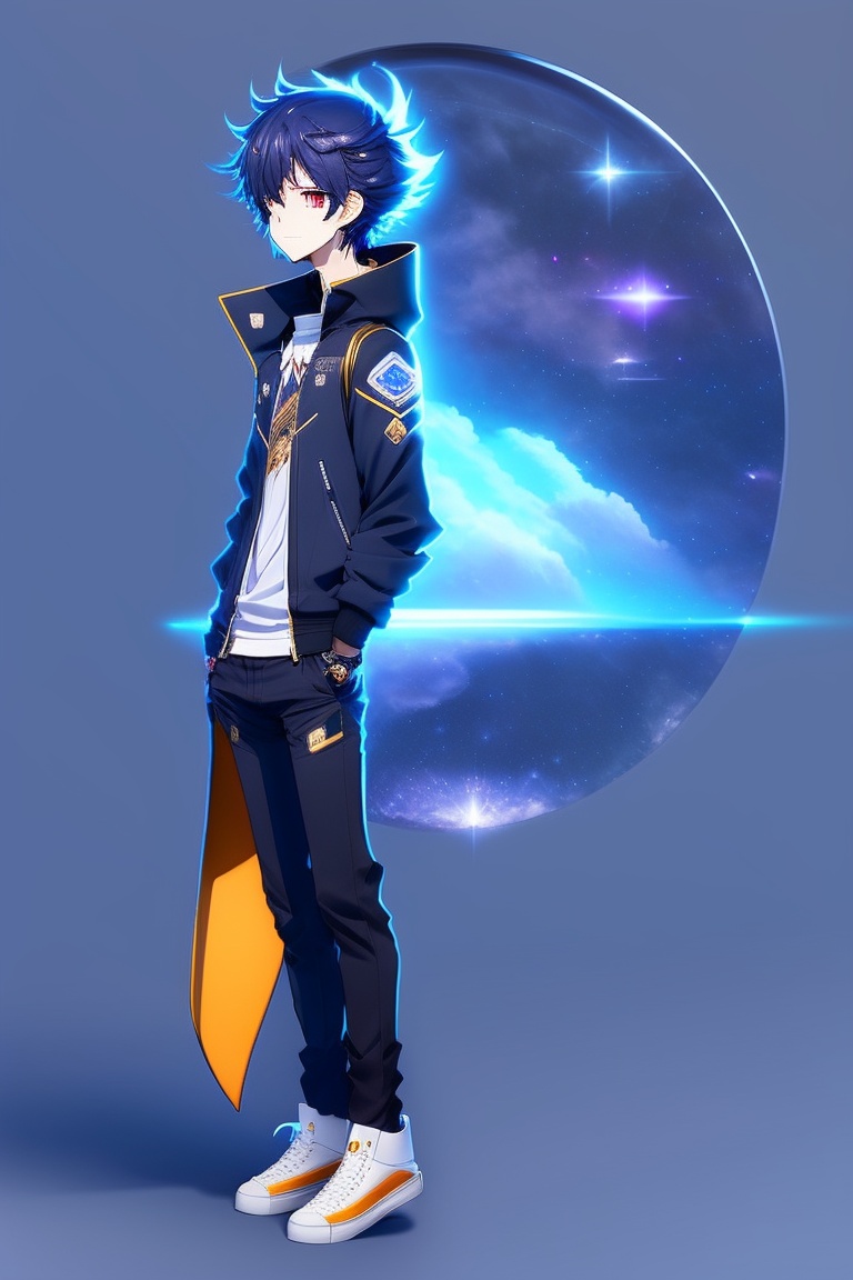 Full body design of male type anime character, space cartoon, curtain hairstyle, black hair mixed with blue, wearing a black jacket whose design is similar to stella from honkai star rail.