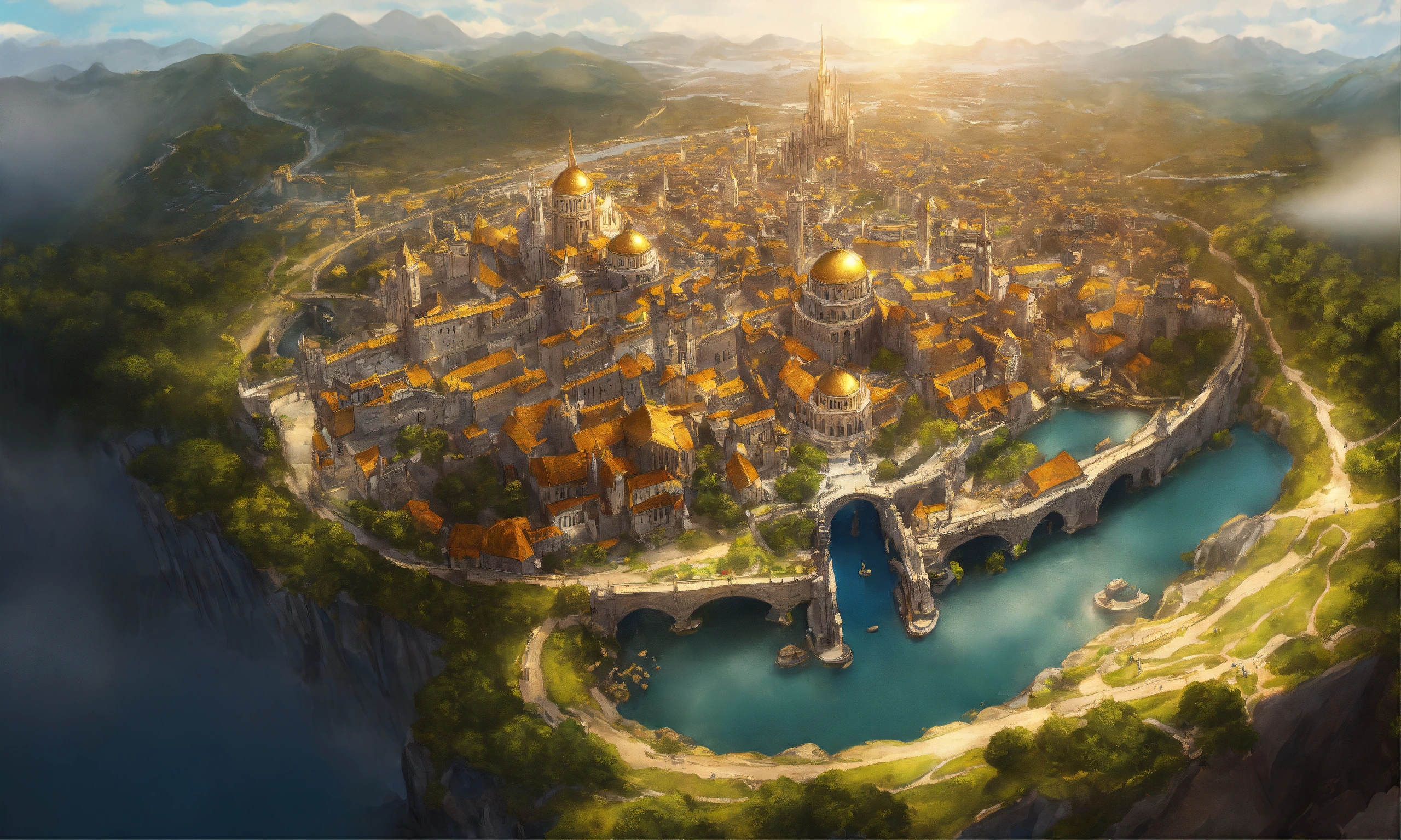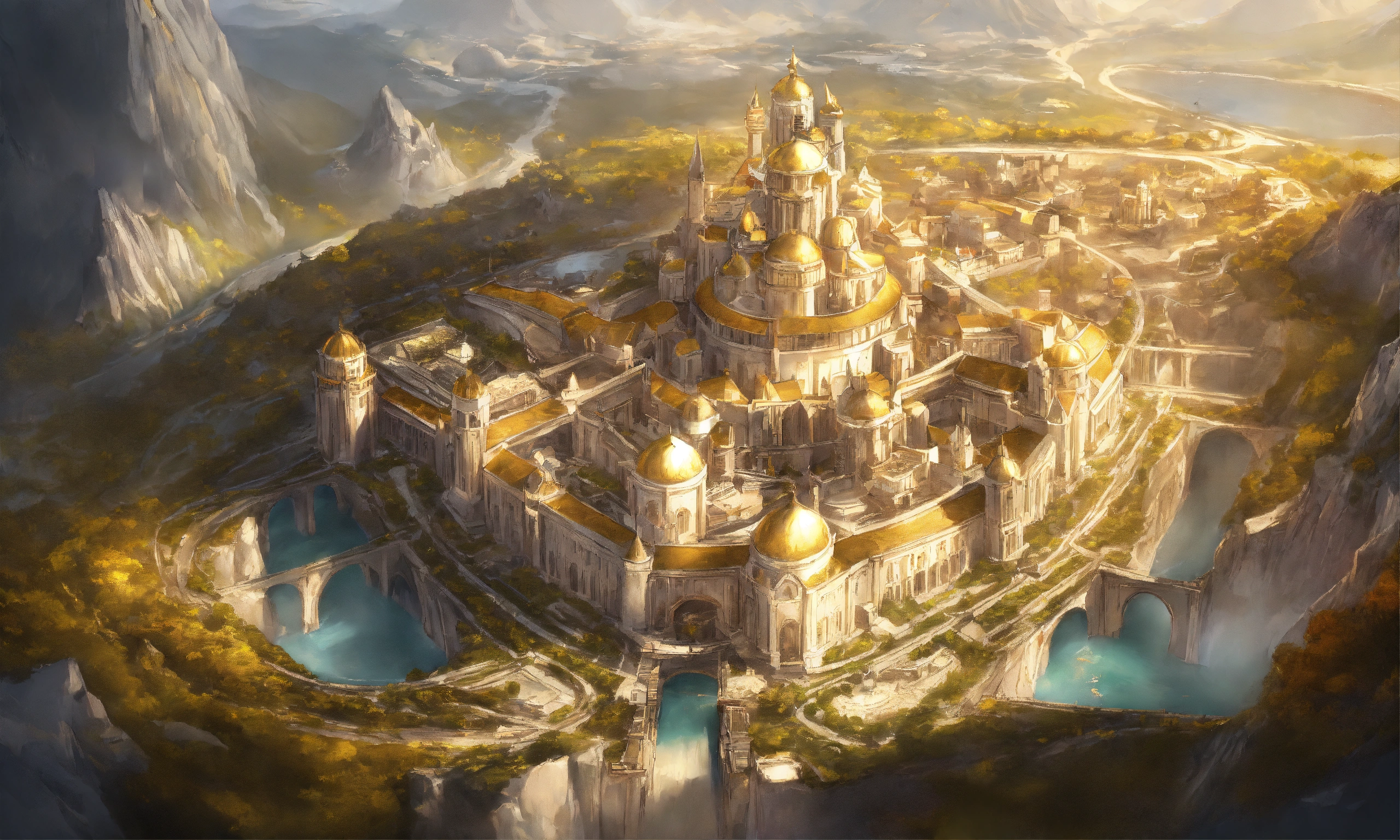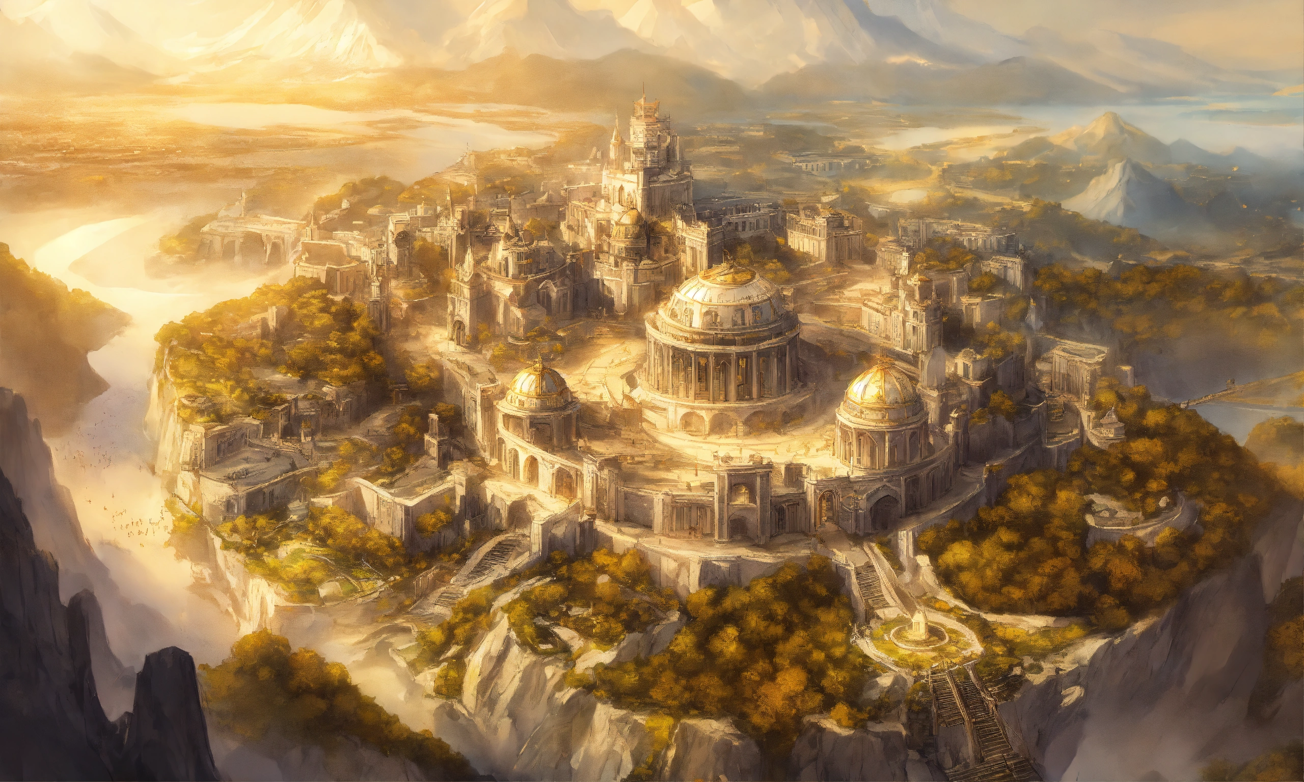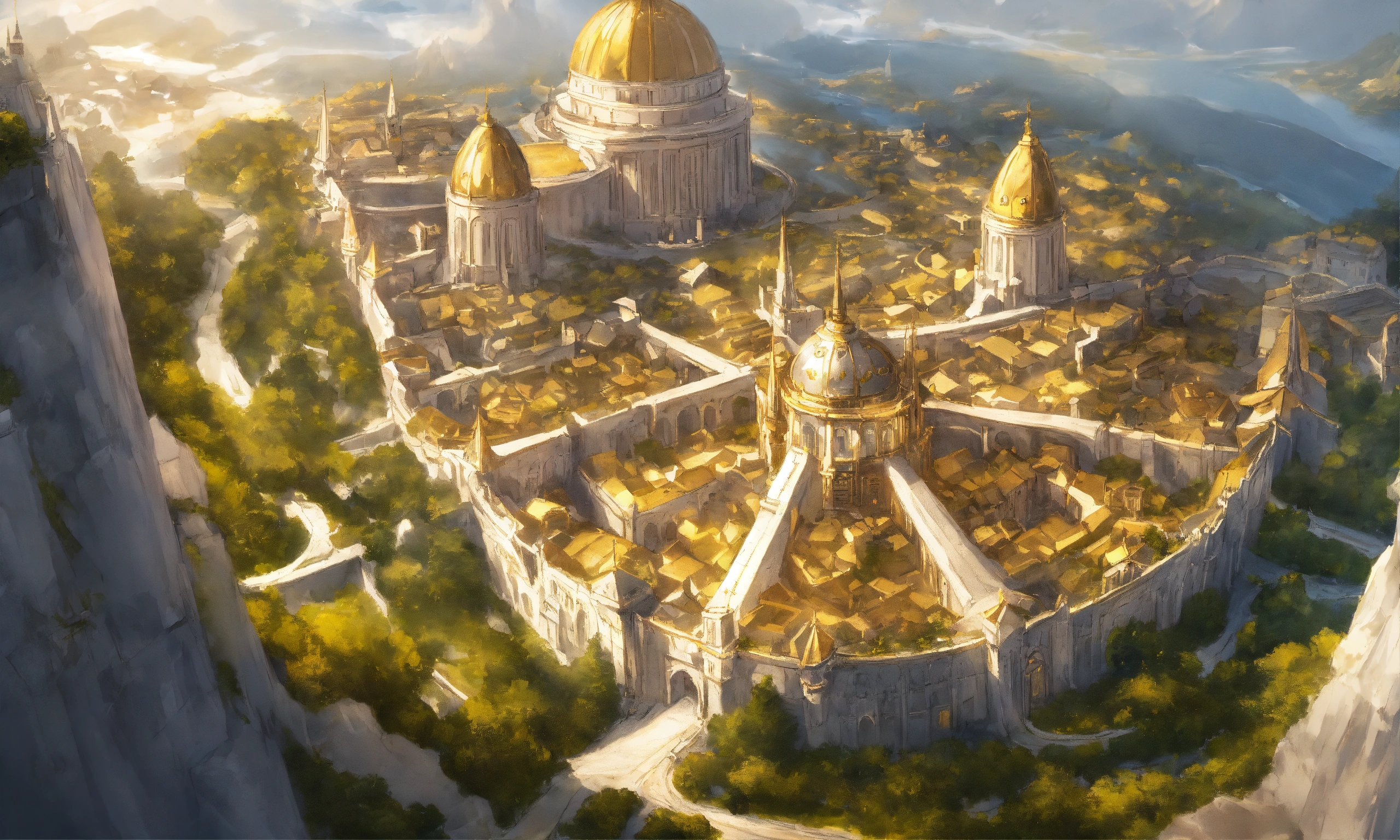 Overhead view of a drawing of a white marble and gold beautiful large high elf fantasy city
