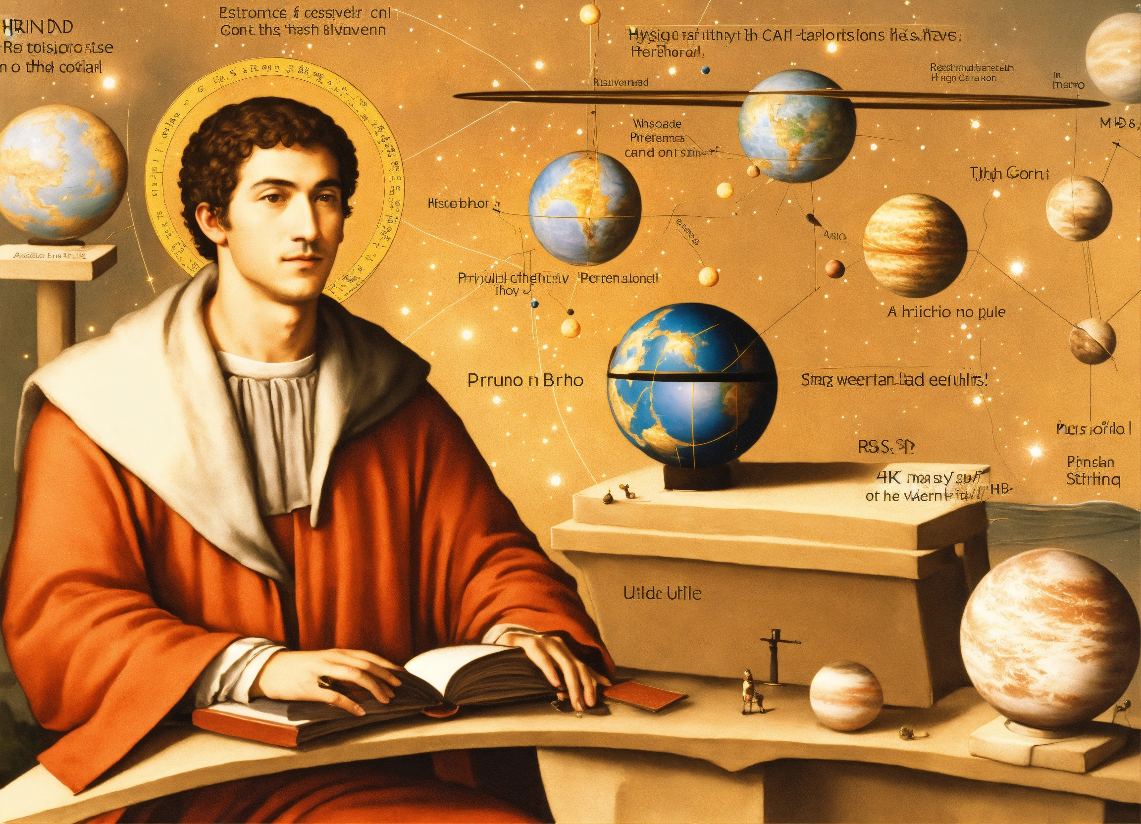 Geordano bruno he questioned the idea that there was only one object at the center of the world structure, which was traditionally explained as paradise. bruno reasoned that the astronomers' findings suggest otherwise - the cosmos is made up of many parts and there are other star systems far away with the same suns as ours and around which other planets orbit, perhaps perfectly suited to support other life forms. in principle, these are things that no one disputes nowadays. but bruno's philosophical revelation went further. he reasoned that if god is everywhere, then god is above all these systems. god is something that cannot be higher in physical form, but is something that is higher in the form of spiritual understanding, thought, energy. high quality, 8k ultra hd, hyper-realistic