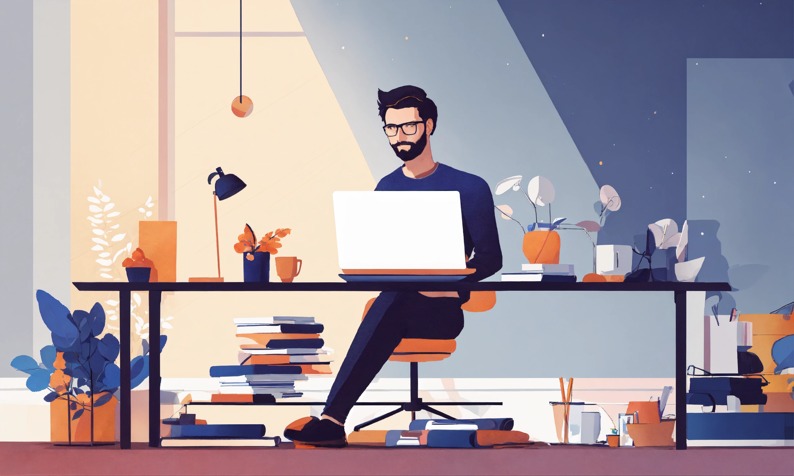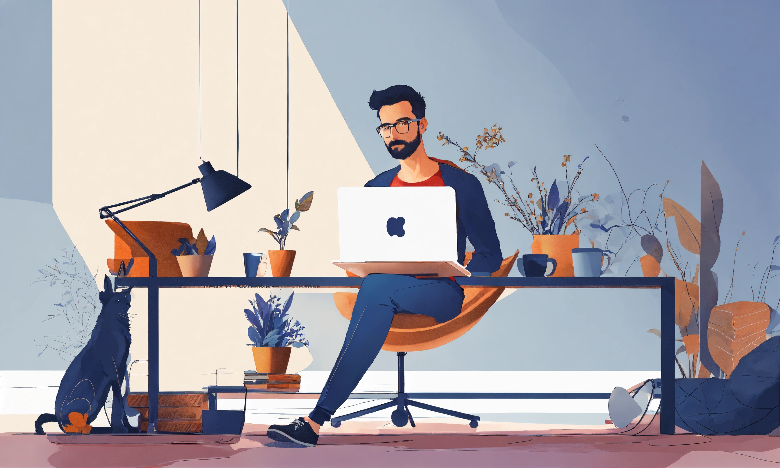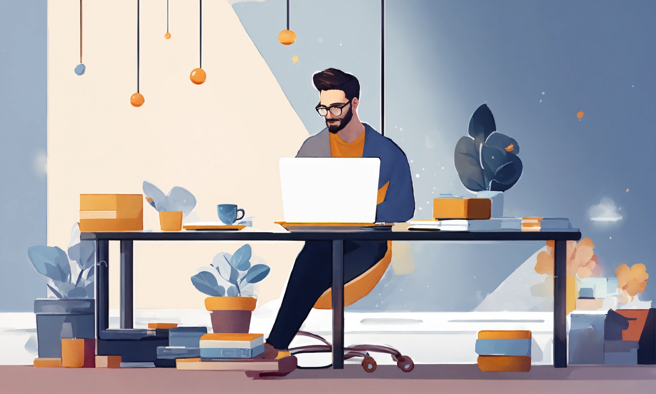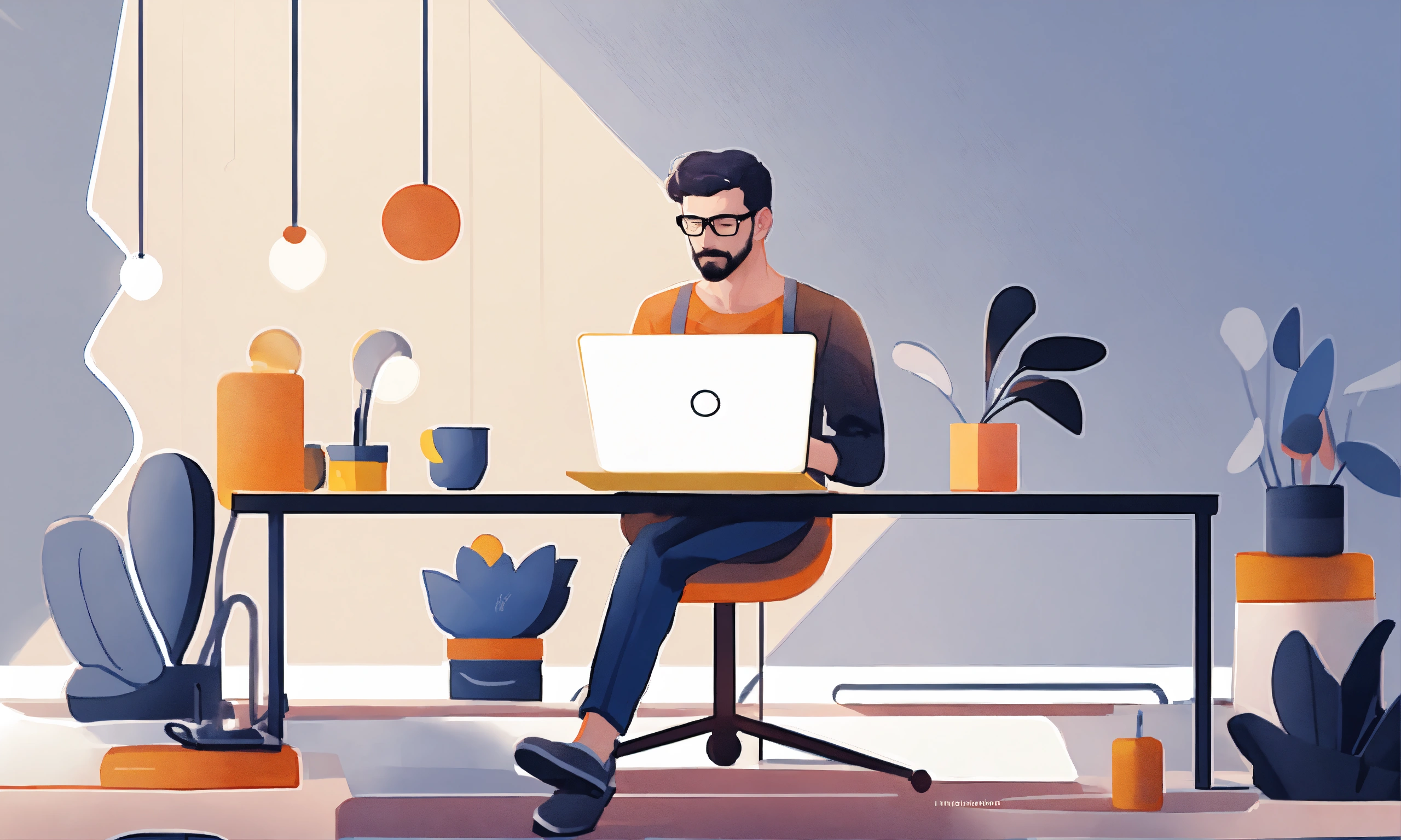 An illustration of an innovative entrepreneur man working on a laptop on a pure white backdrop in minimalism