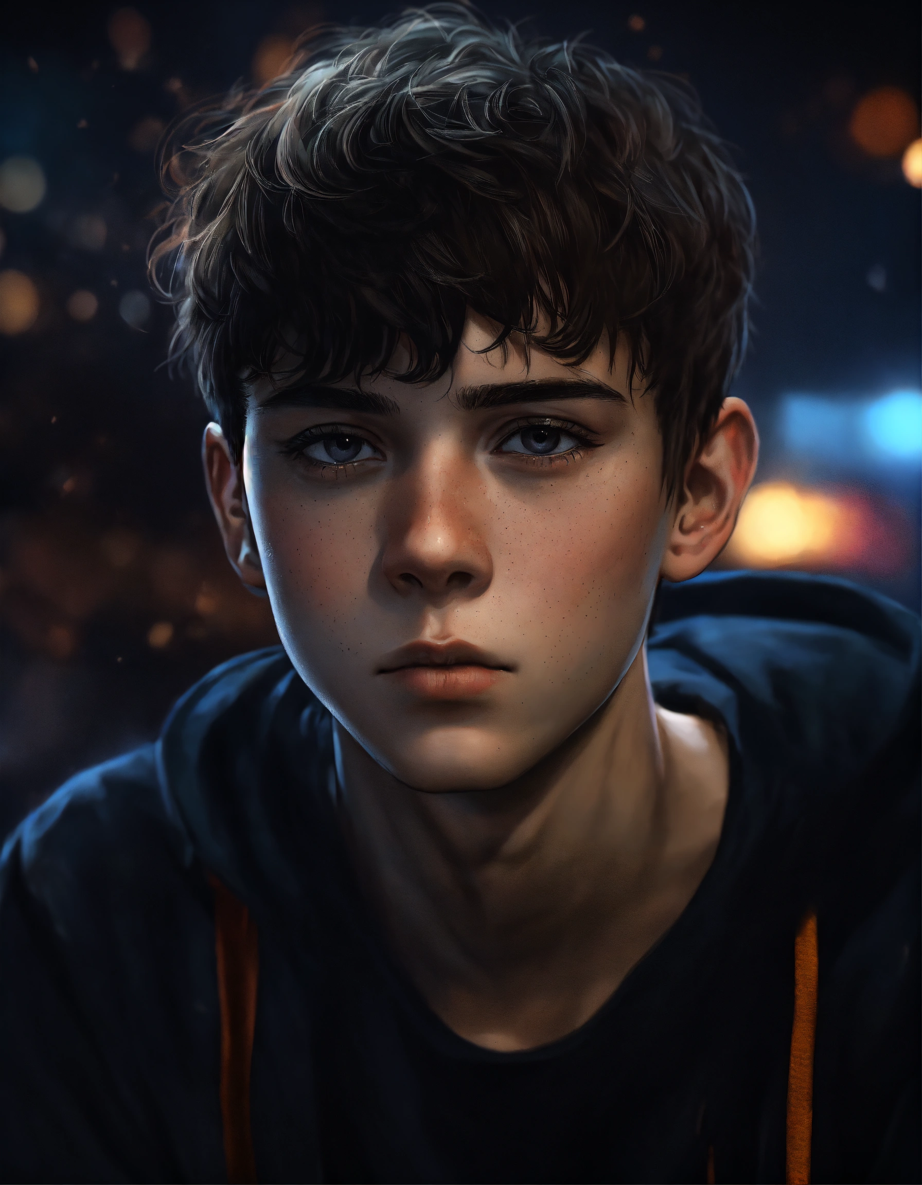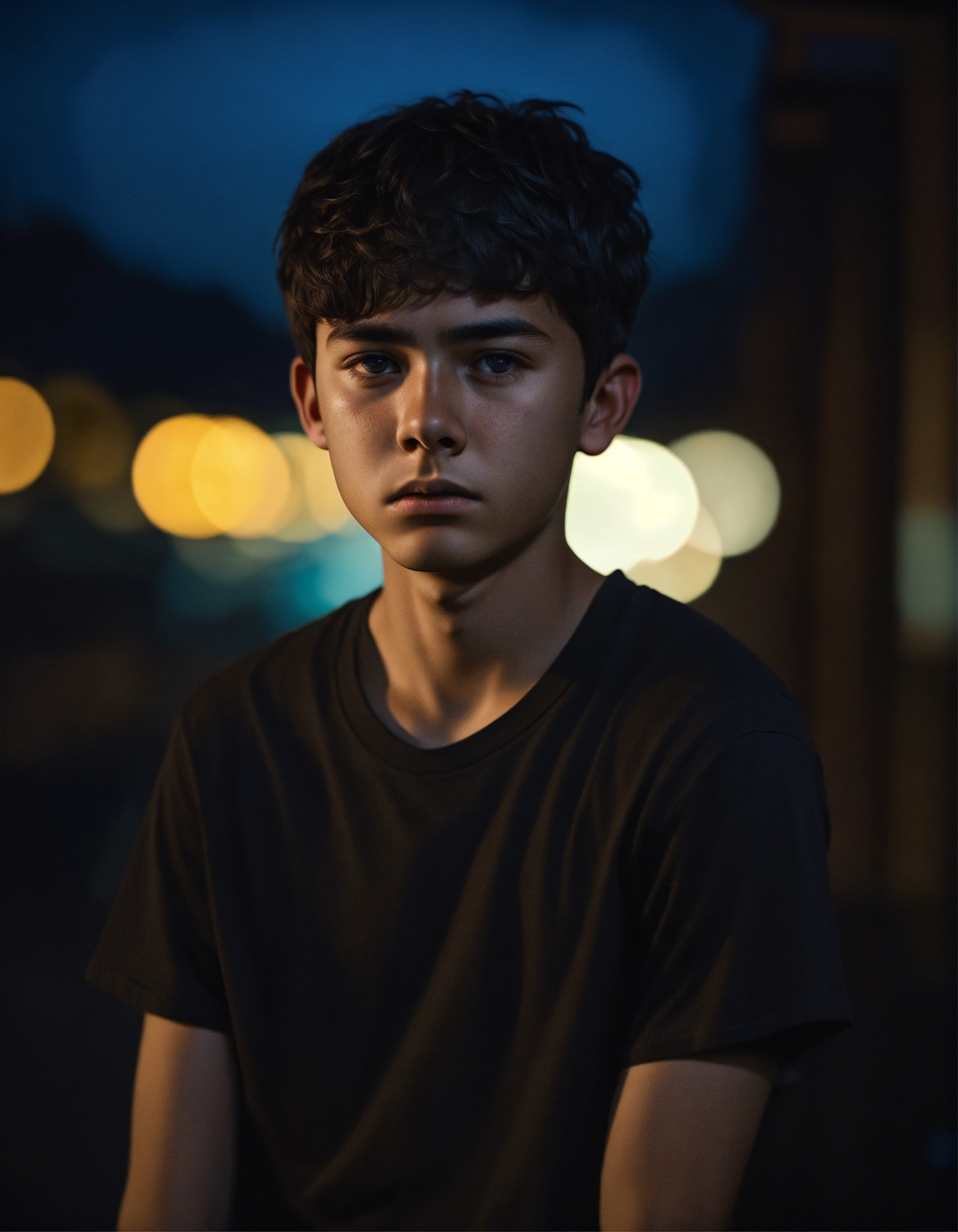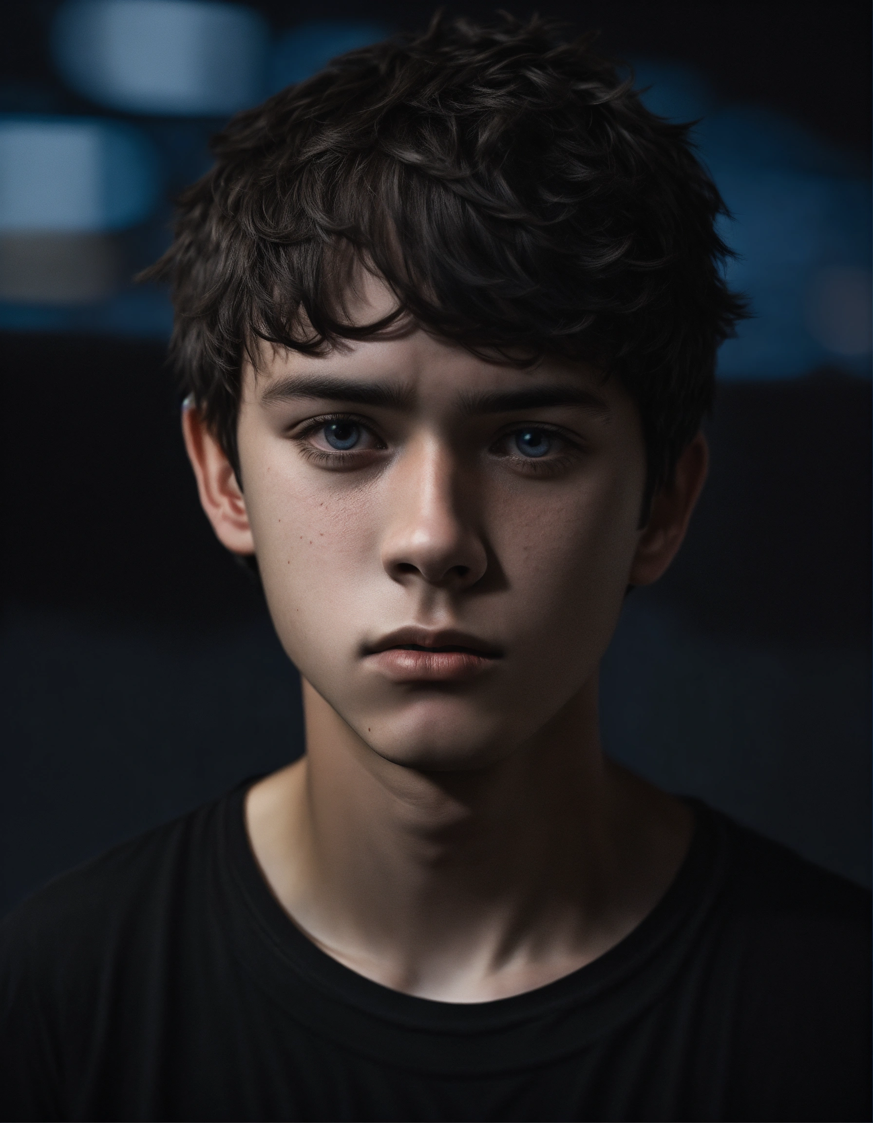 A realistic photograph of a 15-year-old boy, with a sad expression, black messy short hair, dark black eyes, wearing a black t-shirt, with a dark background with leds, dramatic illumination, hyperdetailed, hyperrealistic, 8 k