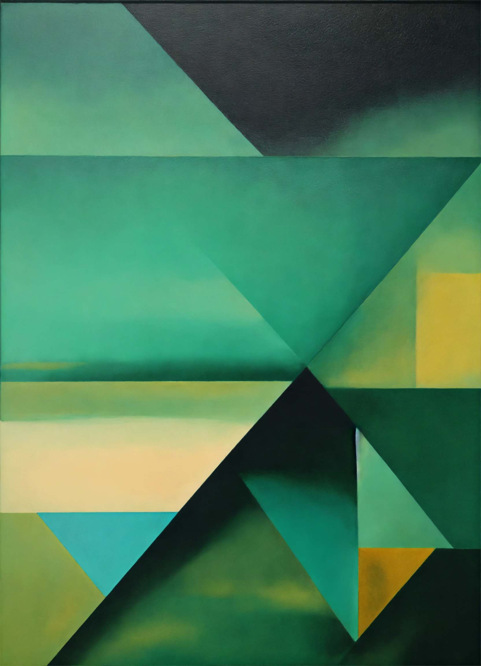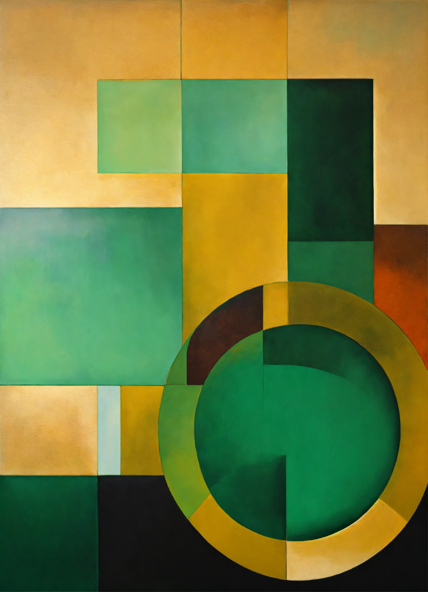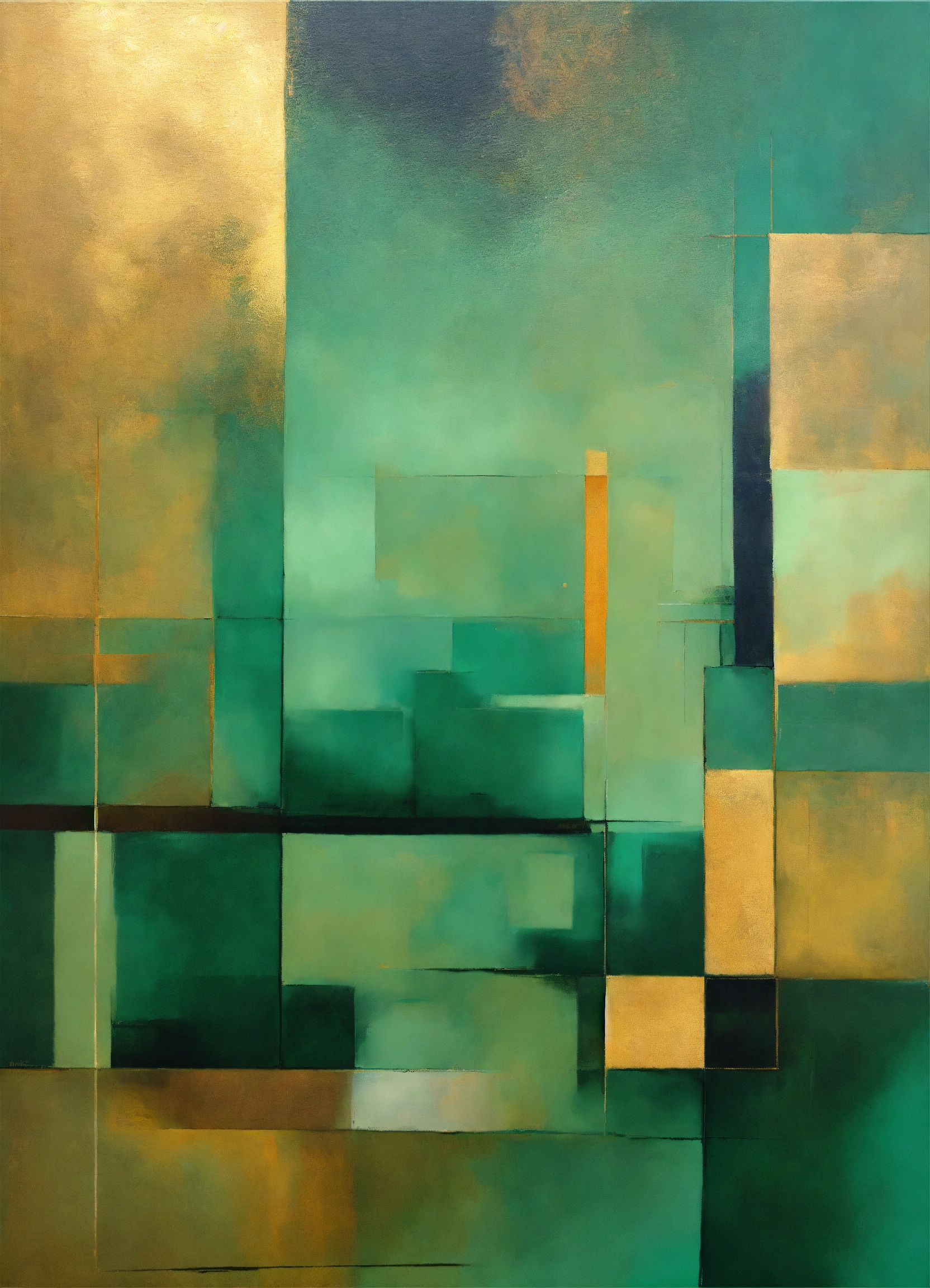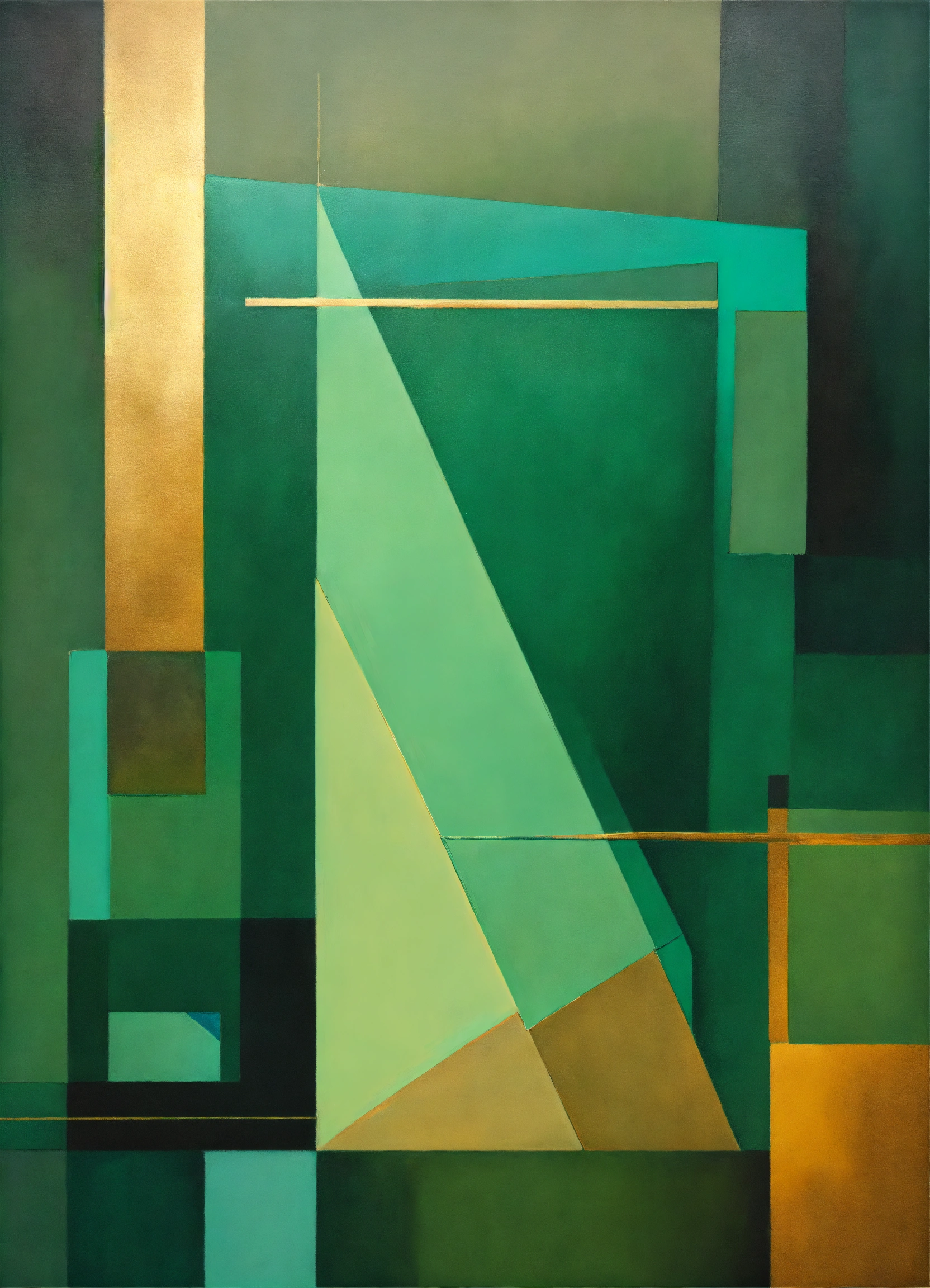 A minimalist, elegant, discreet, abstract, enigmatic, sophisticated, modern, mysterious, and perfect contemporary painting of geometric shapes in emerald.