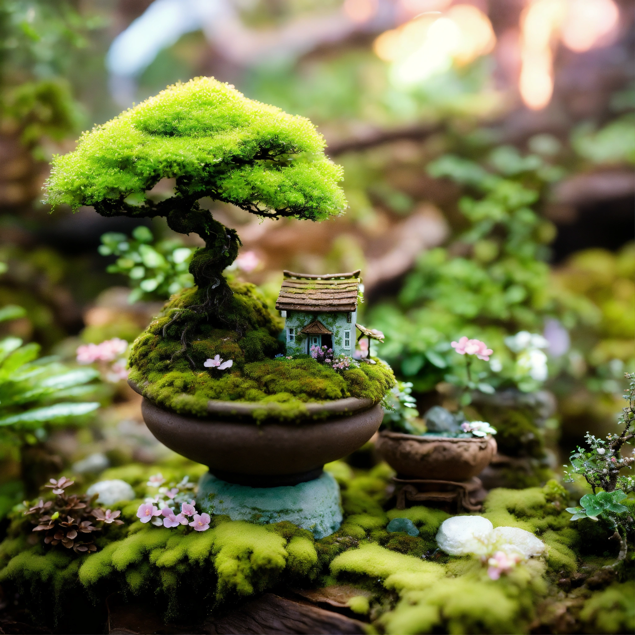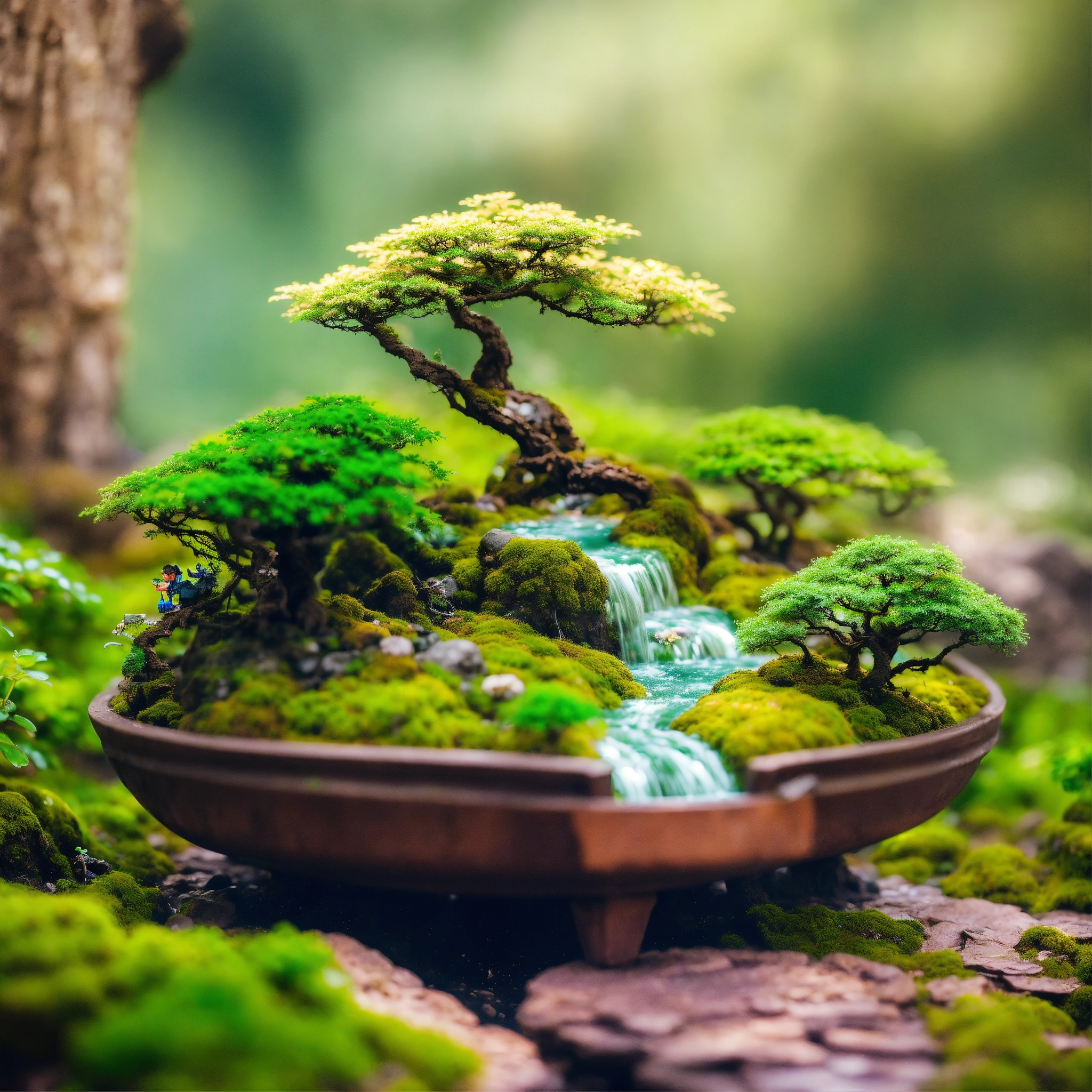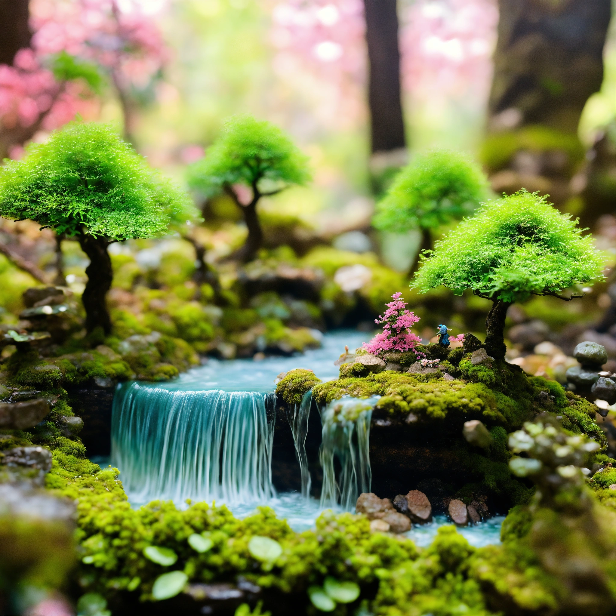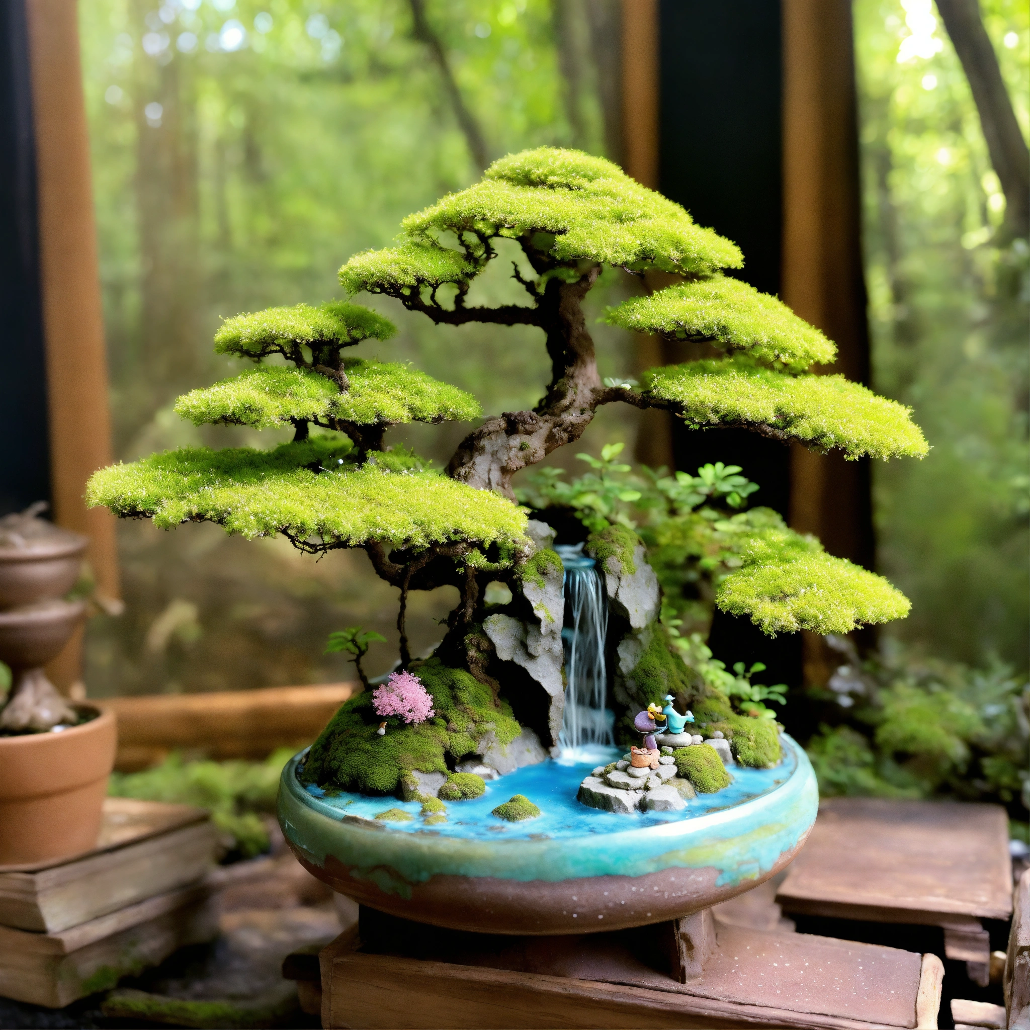 Shabby chic dreamy mist pastel junk journals the bonsai forest retreat imagine a room filled with miniature bonsai trees, each resembling a different landscape or mythical creature. tiny waterfalls, mossy paths, and mystical creatures inhabit this miniature world. swirling magical fairytale abstract art style
