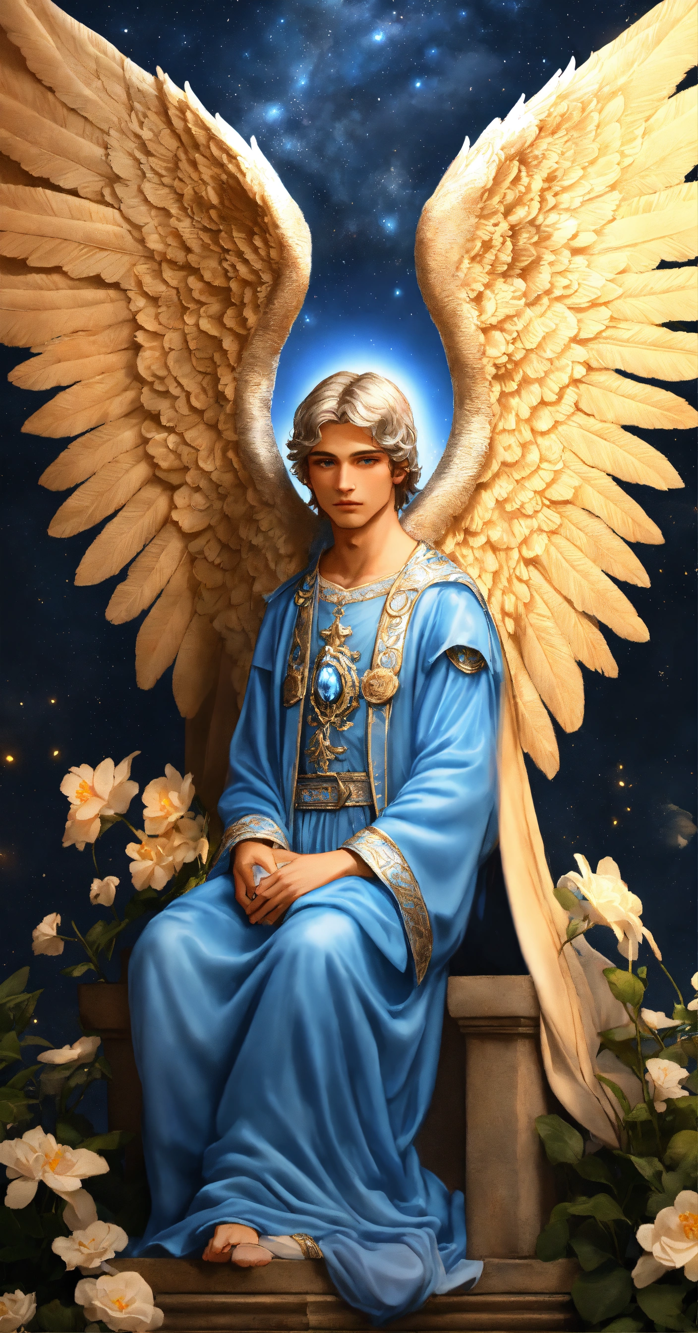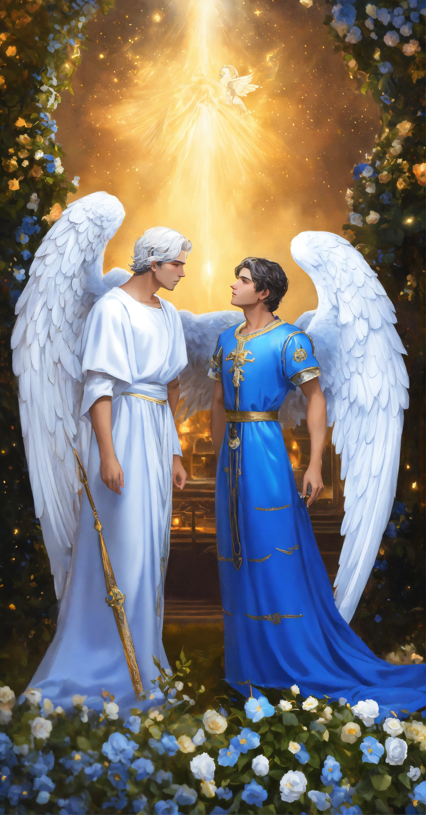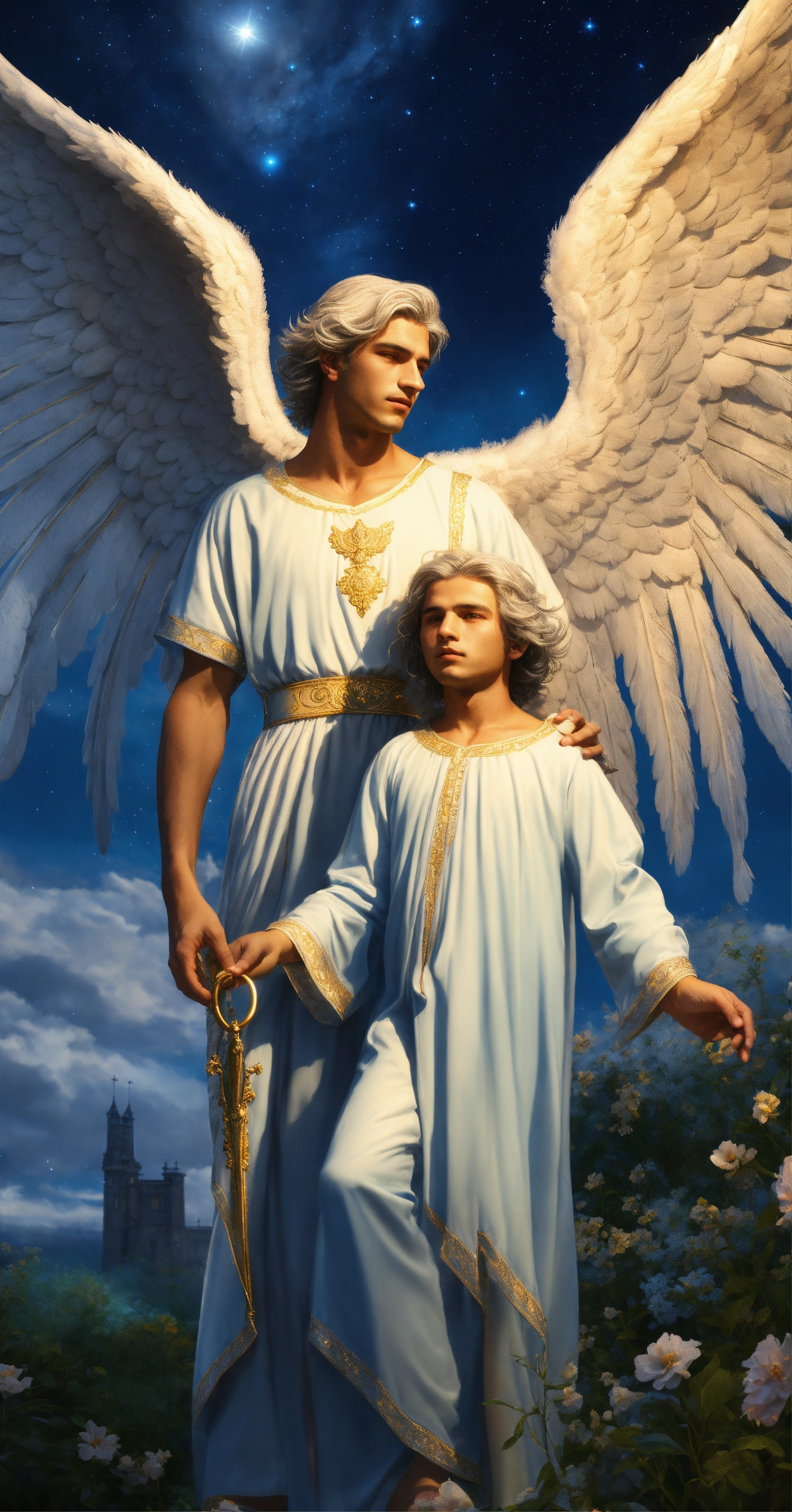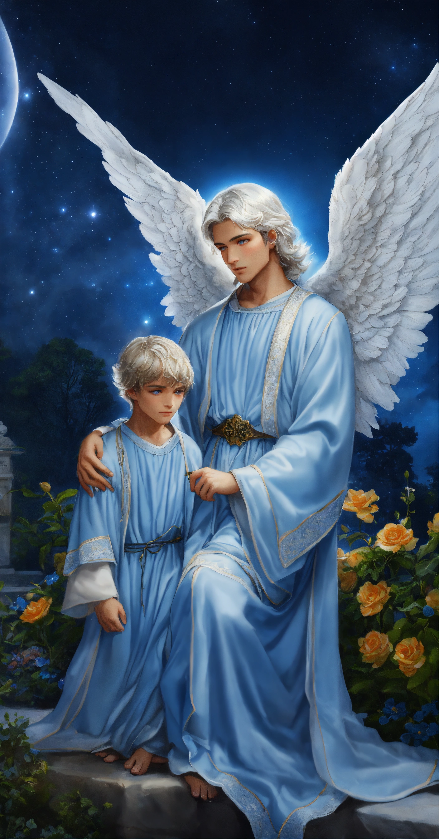 2 male guardian angels with detailed and luminous blue angel wings. 1 30-year-old male angel protecting a 9-year-old male angel child. the 2 male angels have large, uniform luminous blue wings. their faces beautiful and detailed. very clear eyes that open with a deep and penetrating look. detailed and manly short white hair. blue tunic-type dresses with many silver details. they are in a beautiful, detailed garden with a night sky. hyper-detailed, hyper-realistic illustration. realism. masterpiece. digital art, hd, high quality. high definition, high definition. 8k.