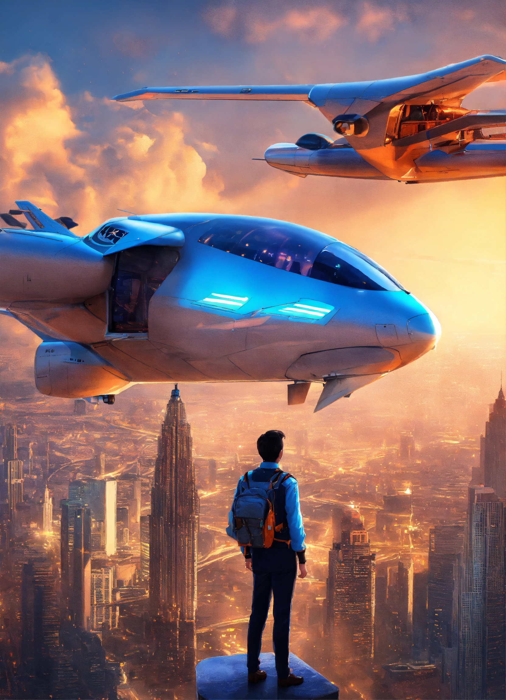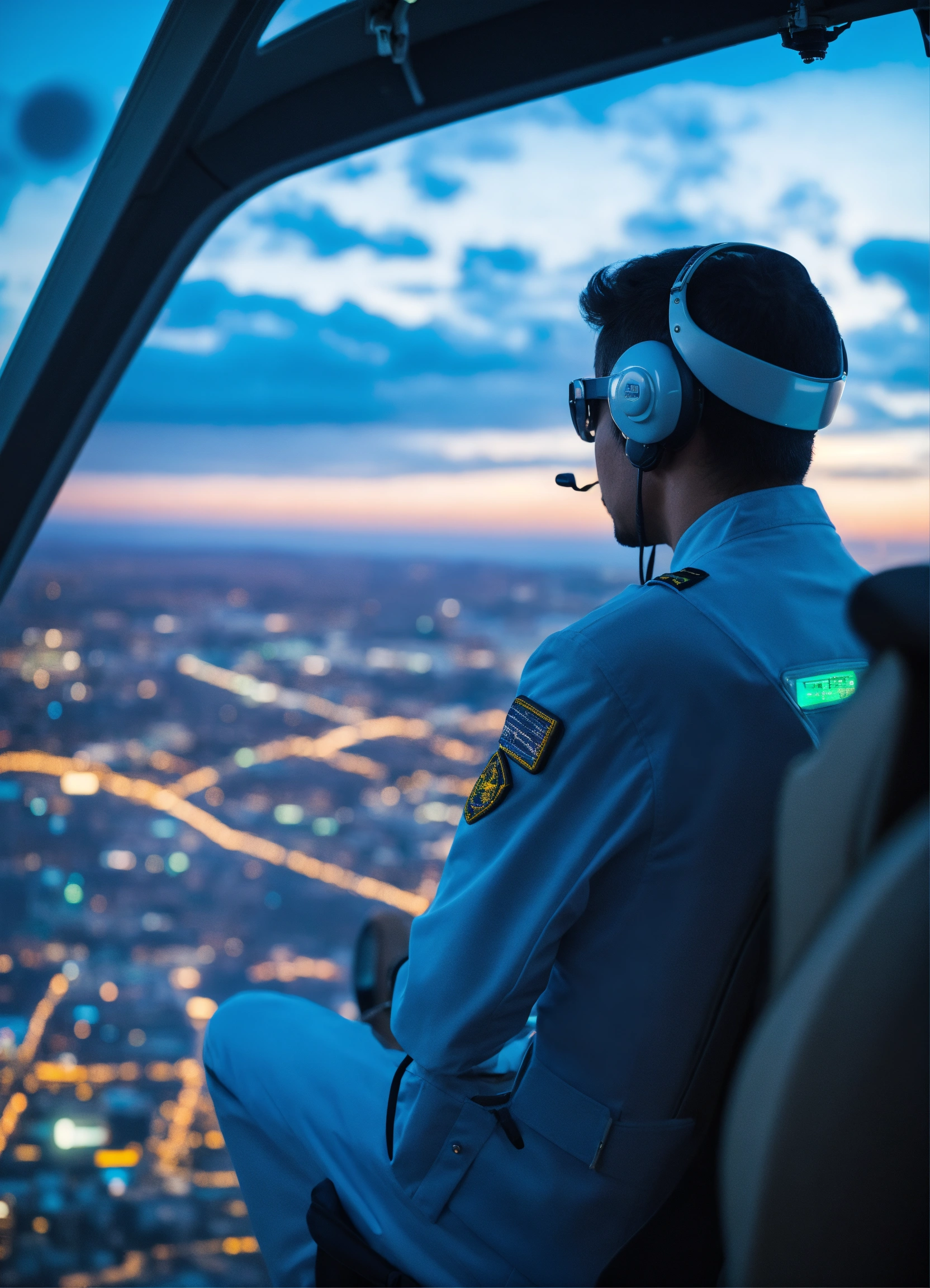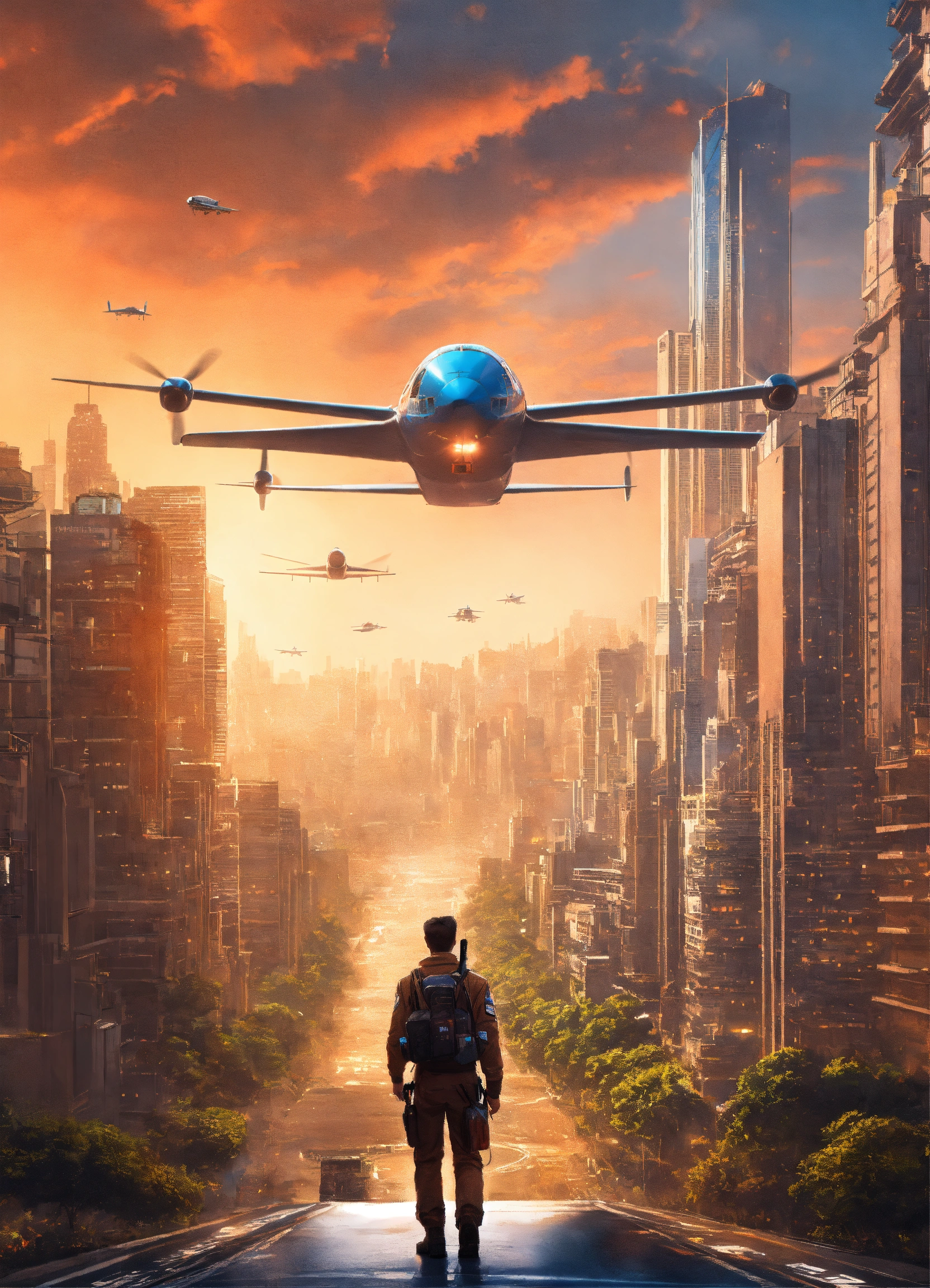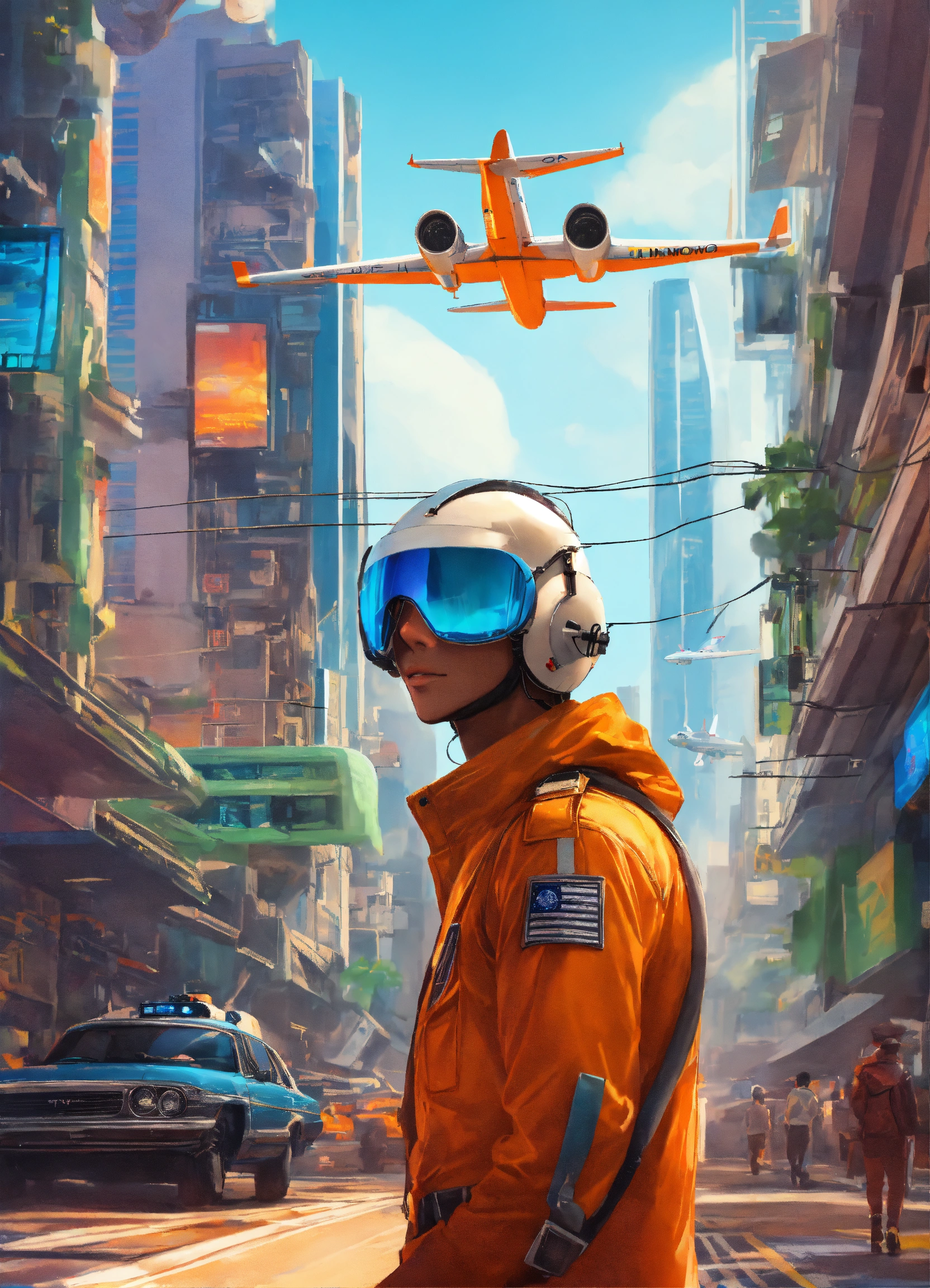 Um piloto de avião confiante em uma cidade futurista