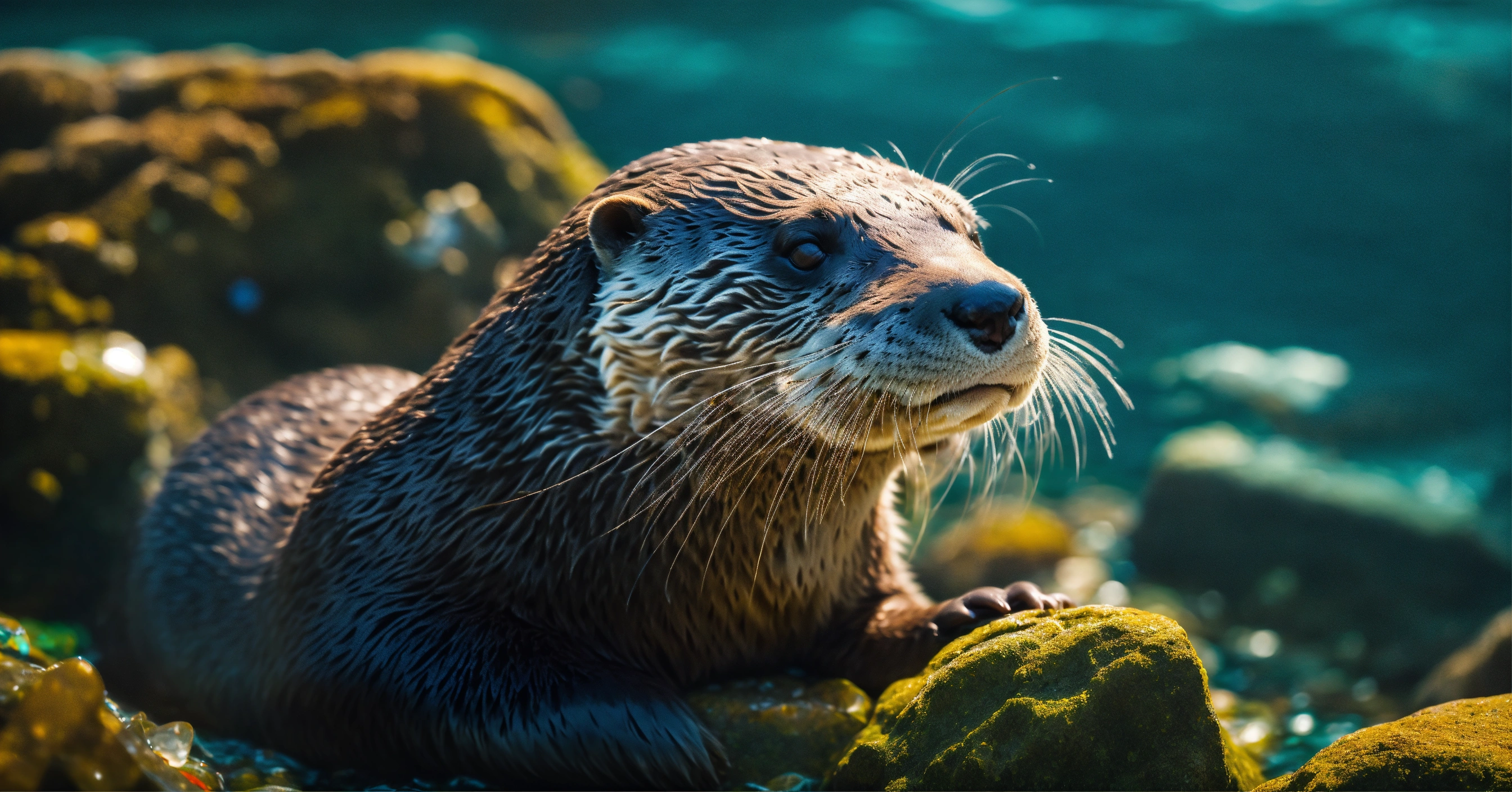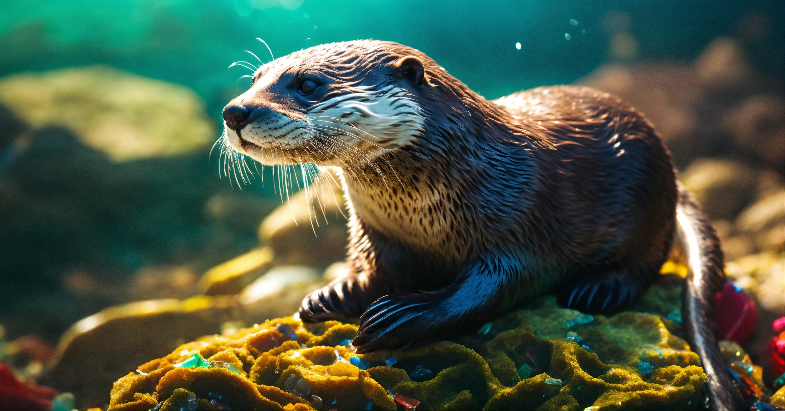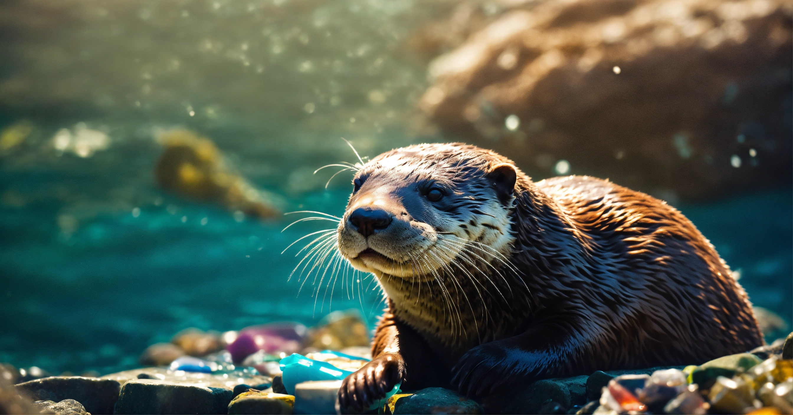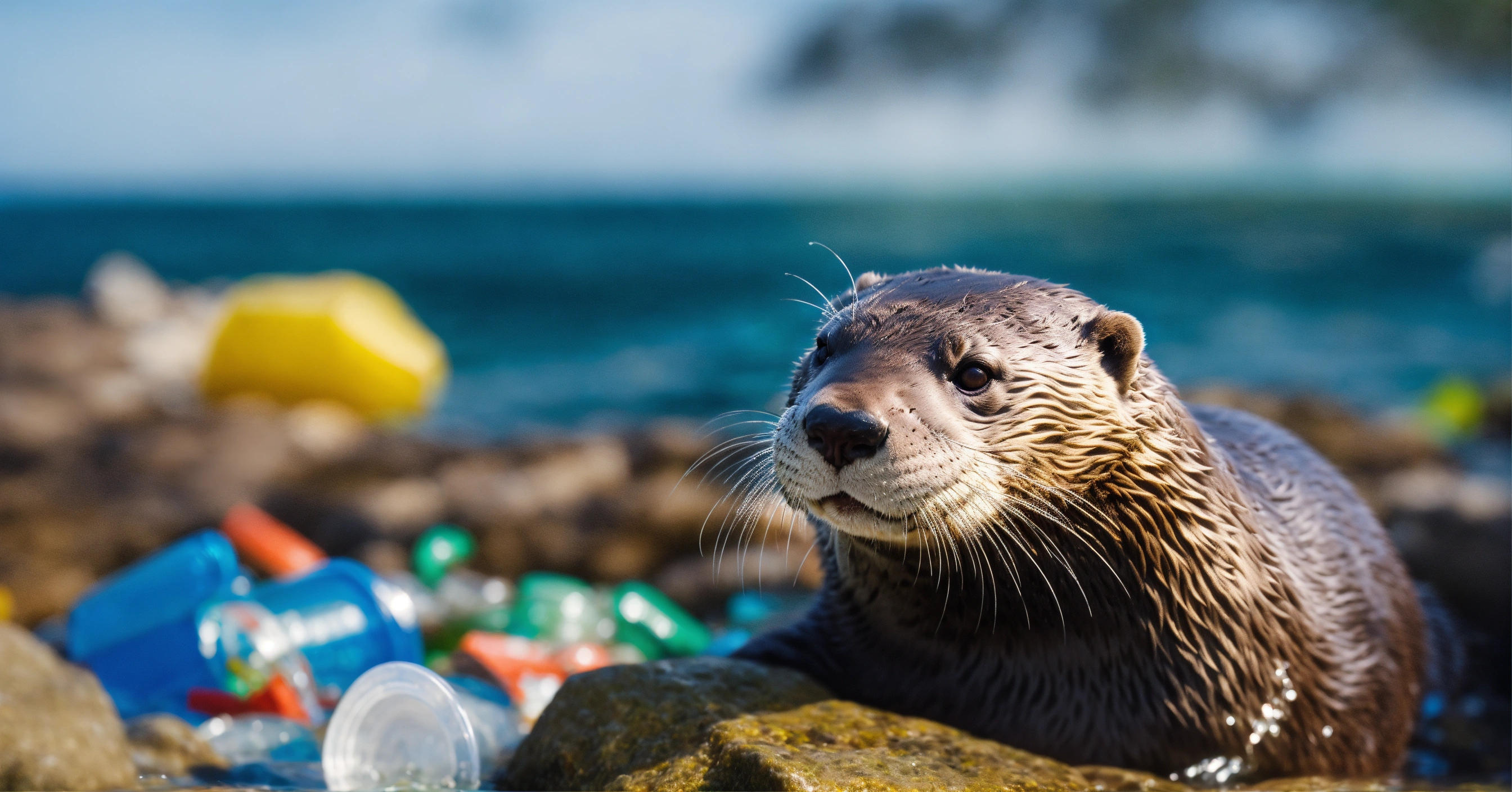 Close-up on a otter resting on a rock in a ocean with plastic waste, concept for water polution, high quality photo, cinematic shot, realistic, film grain, volumetric light, imax, photorealistic