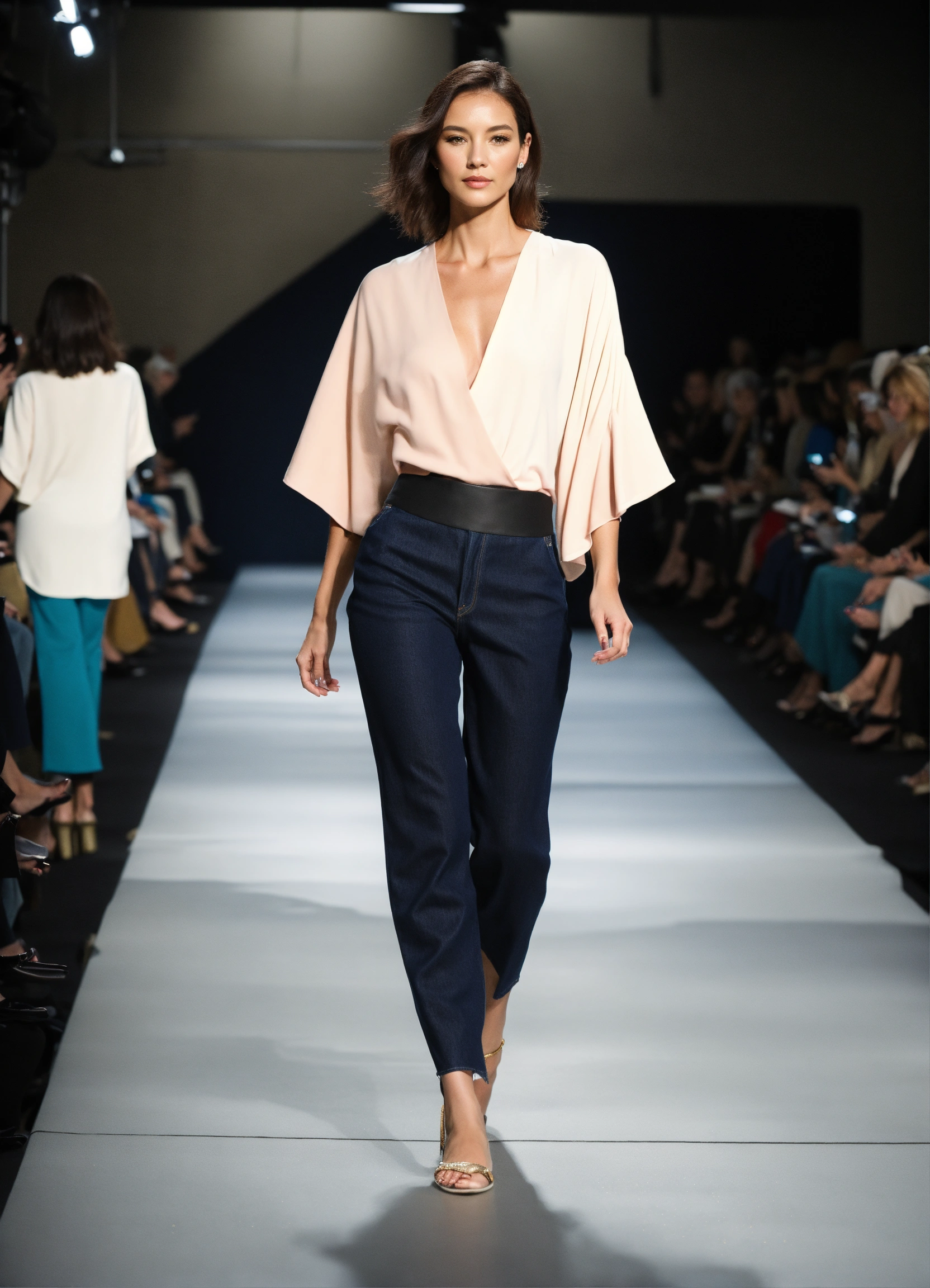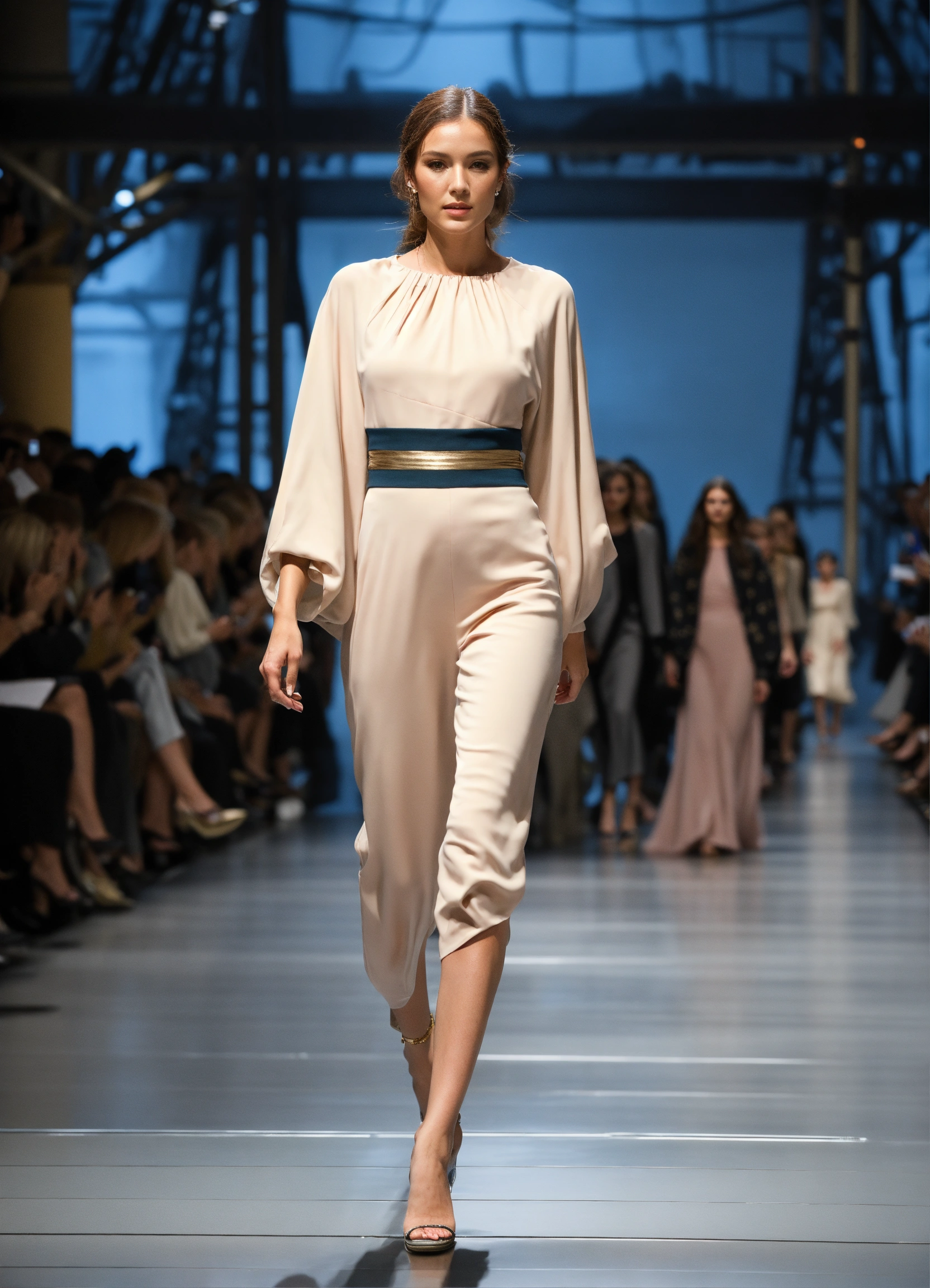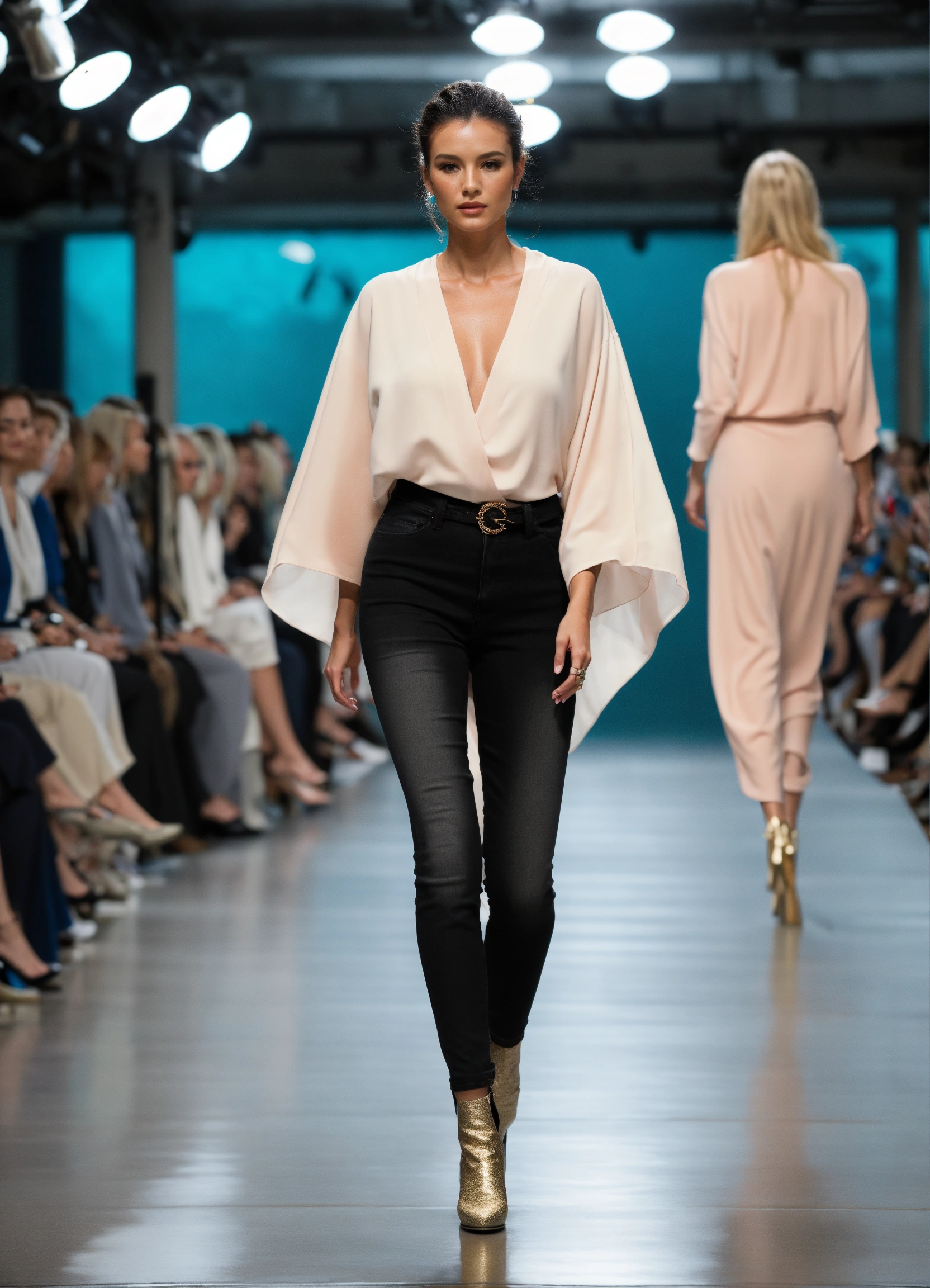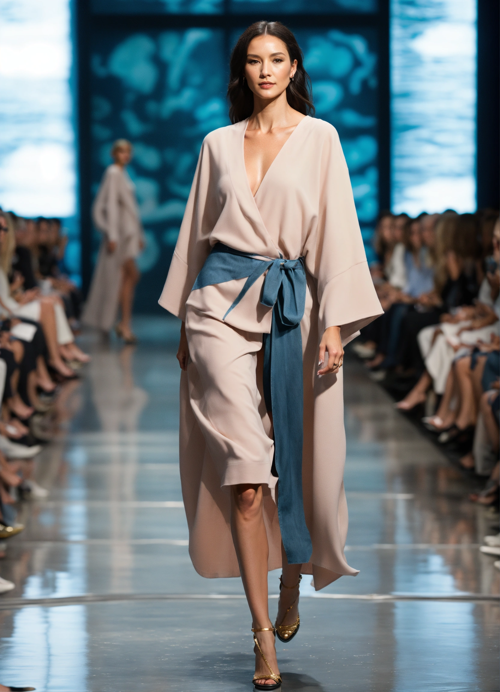 3d realistic photo of female oceanographer walking runway during marine fashion week wearing dolman sleeve donna karan oceanographers fashion in black, white, blush, grey, beige, stone, gold, denim, blue, teal walking a runway in a marine lab