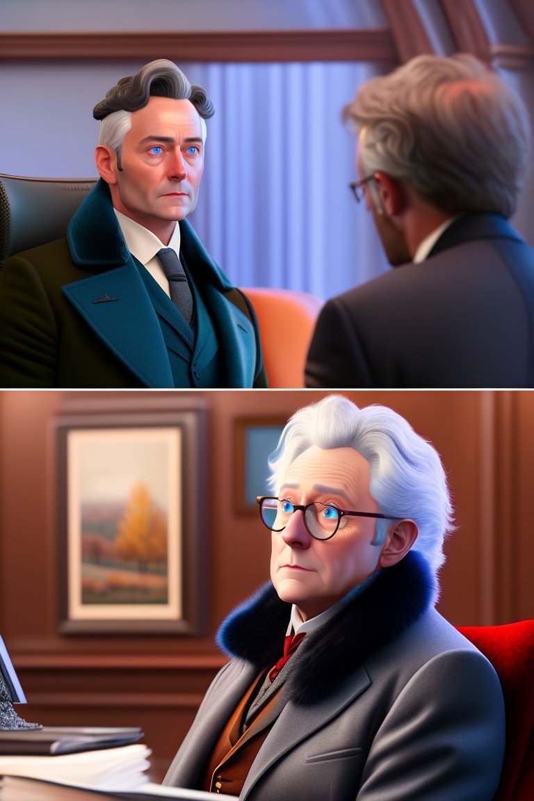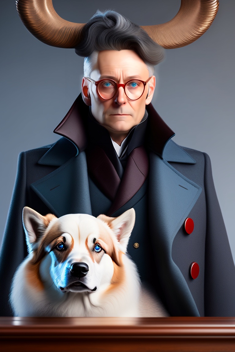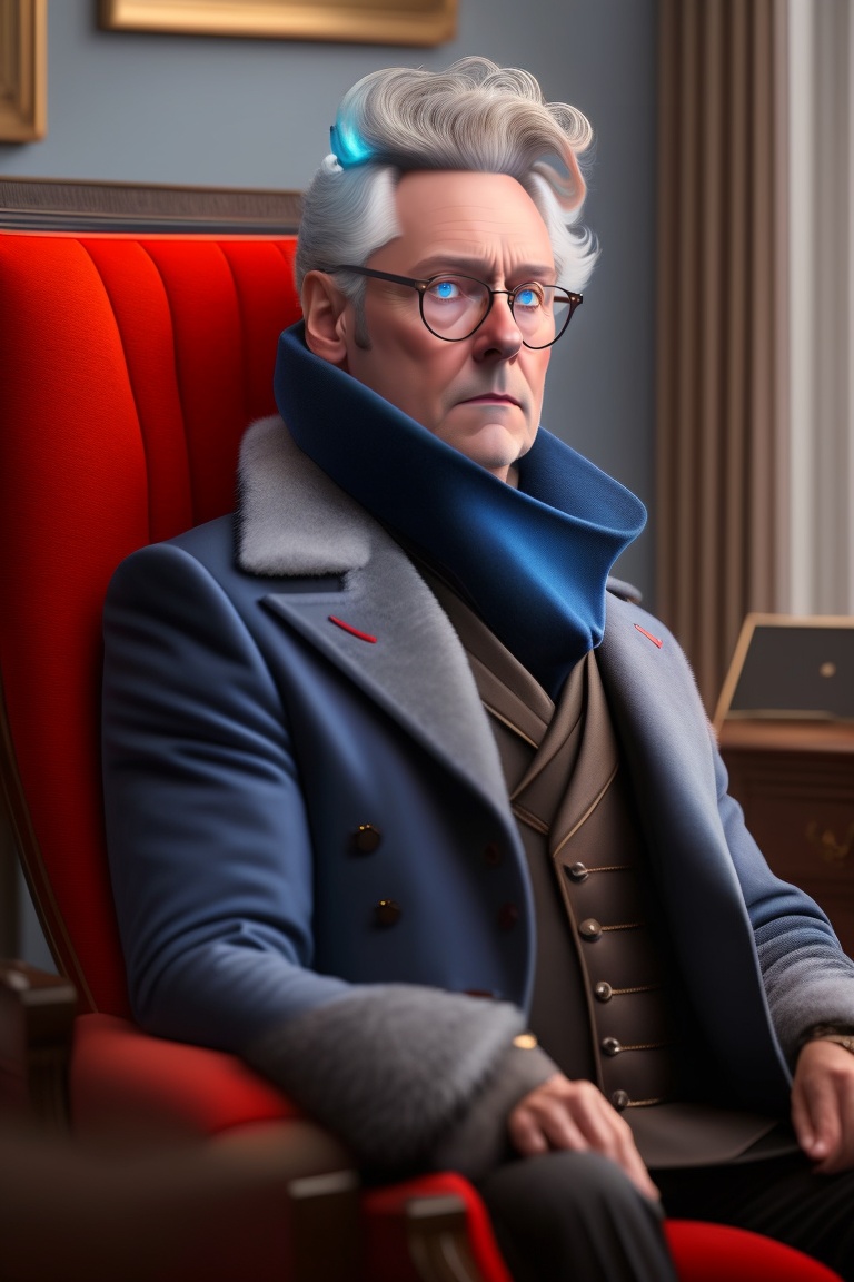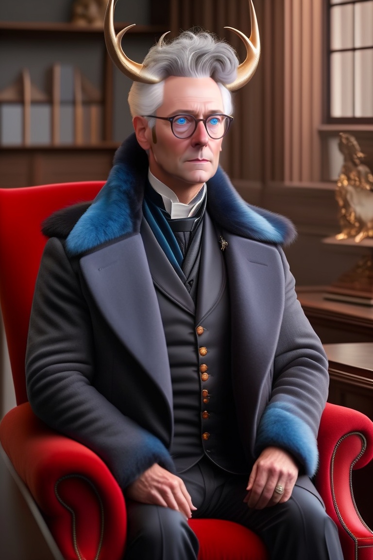 Furfur from good omens, he looks like reece shearsmith with red deer antlers, wearing a long black coat, he has grey hair and blue eyes, sitting in an office chair, he looks sad