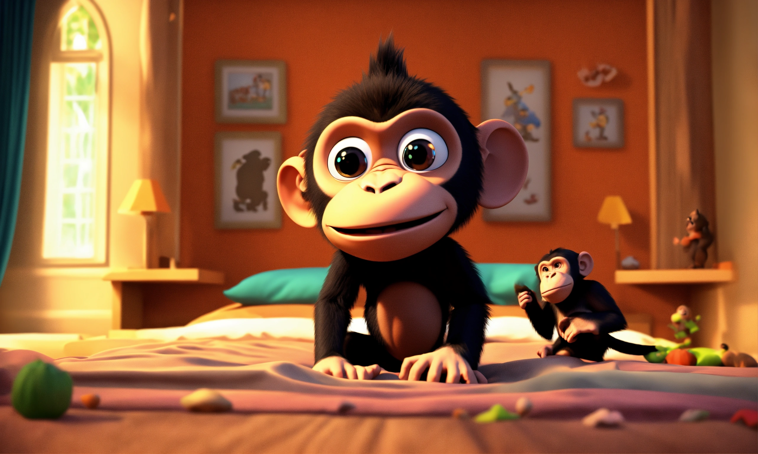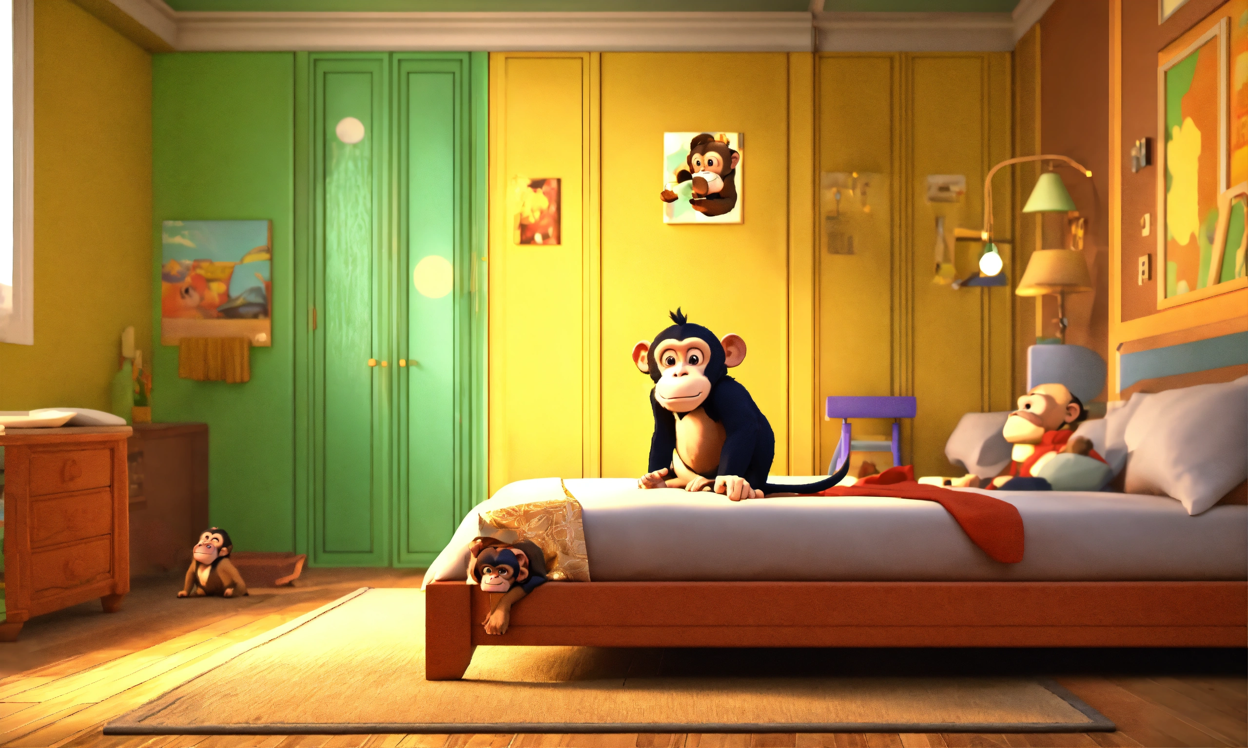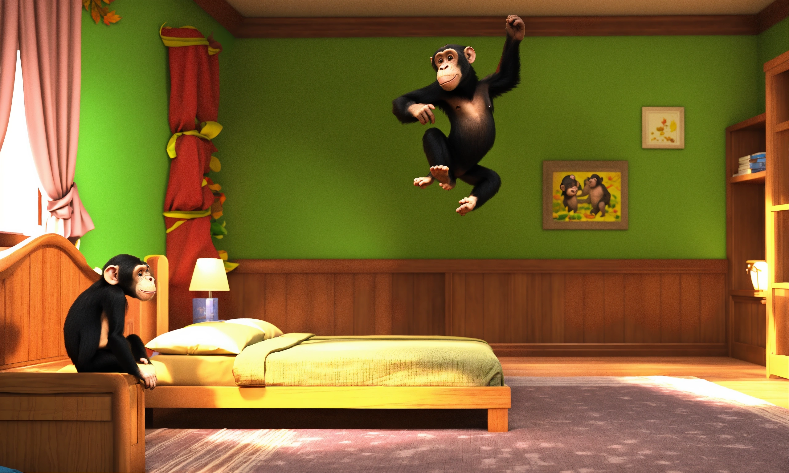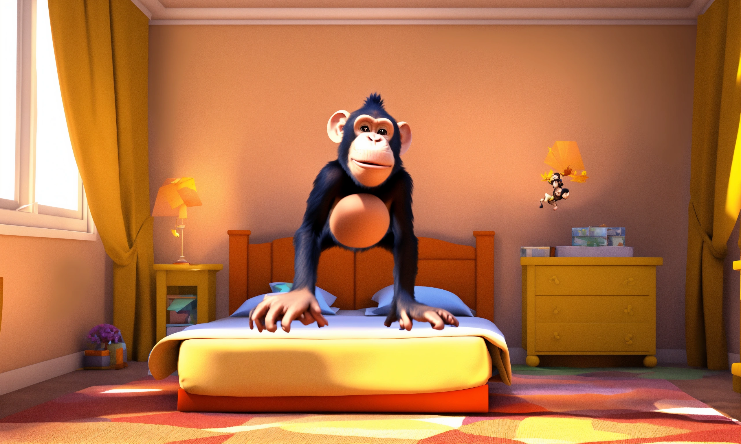 One little monkey jumping on the bed, and one chimpanzee is fall down on his head. 3d cartoon animation.
