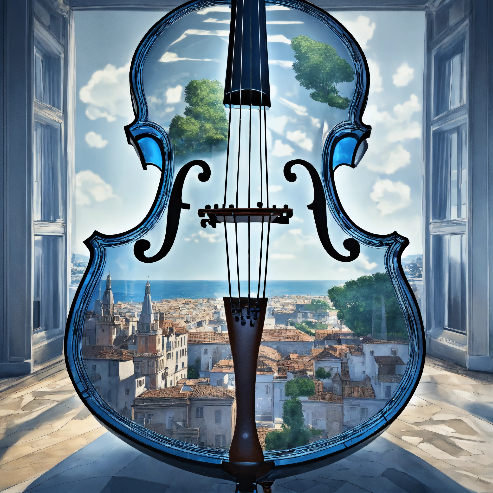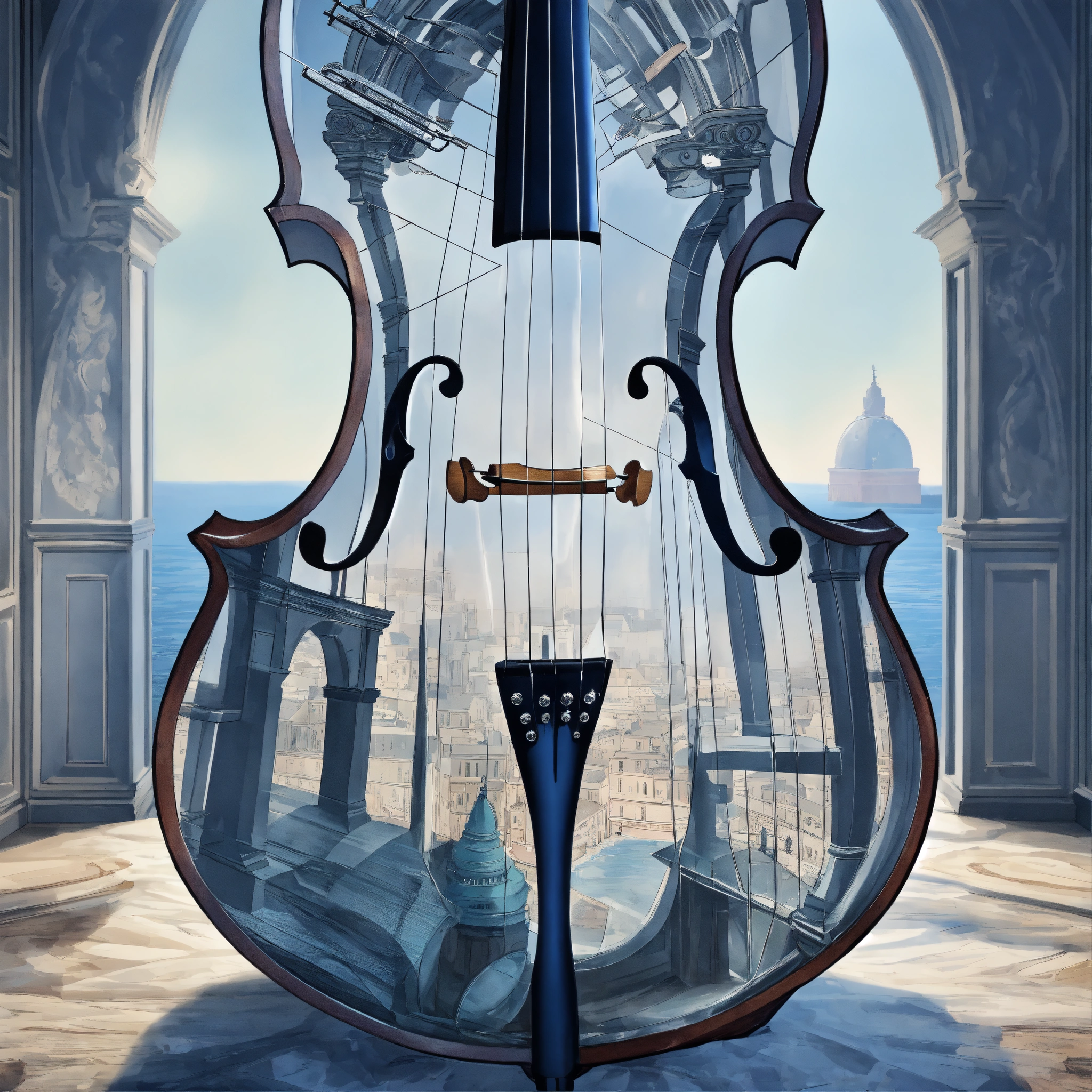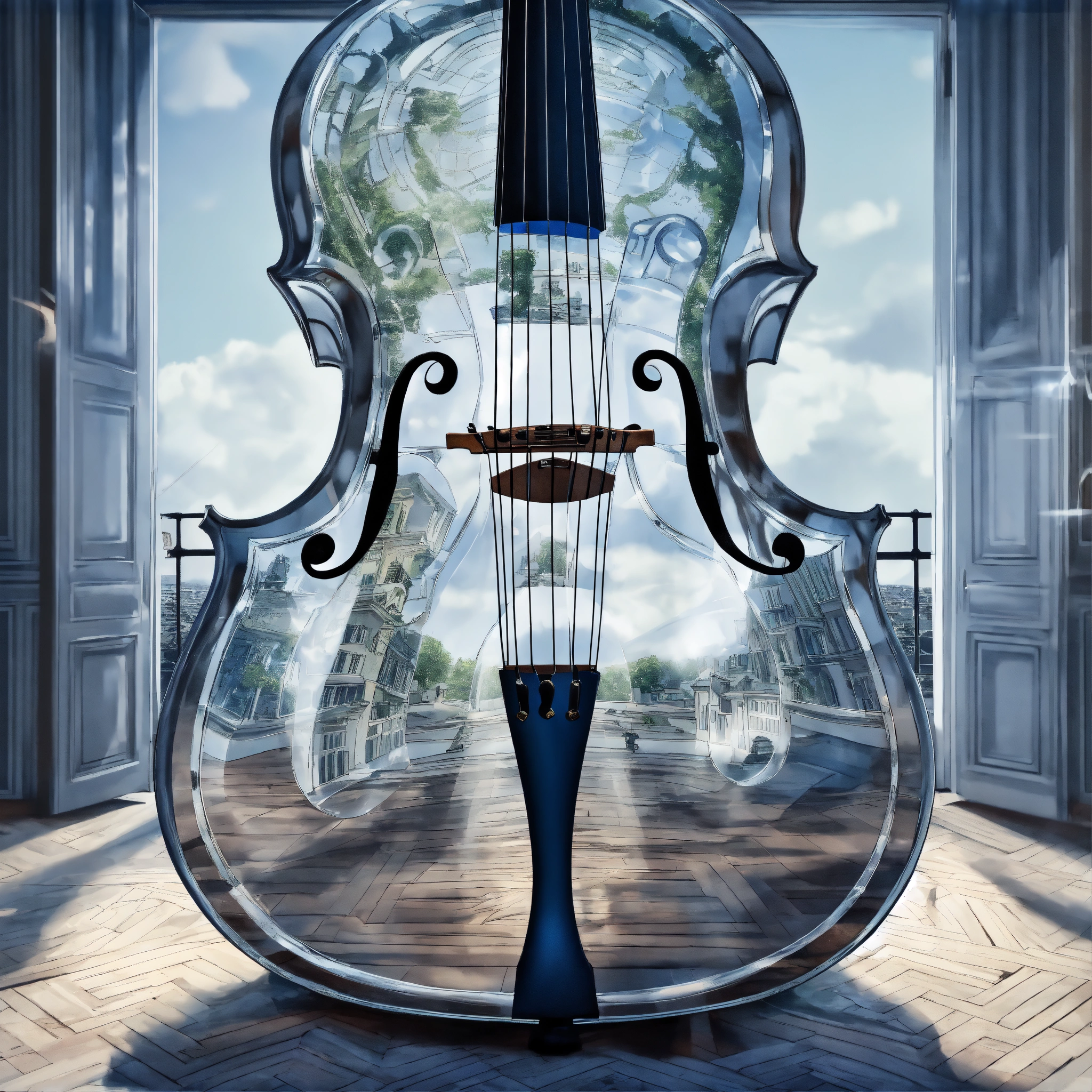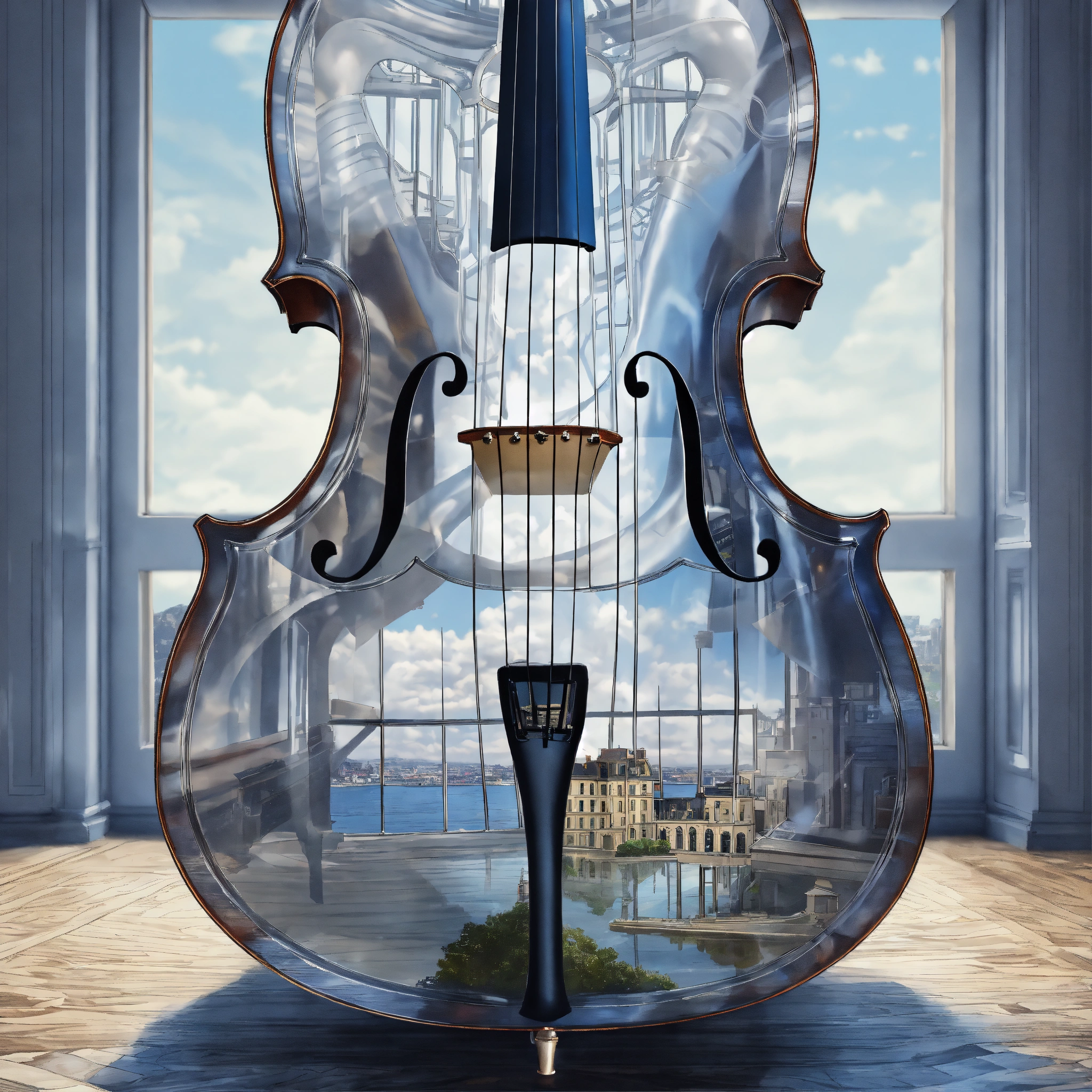 A photorealistic closeup view of inside a transparent cello, imagine someone is standing inside of a glass cello and watching the architecture of the instrument, by rene magritte, don't show the outside of the instrument, just inside, the hidden part from eyes. created by canaletto, highly detailed image, extremely high resolution, surrealistic construction inside the cello
